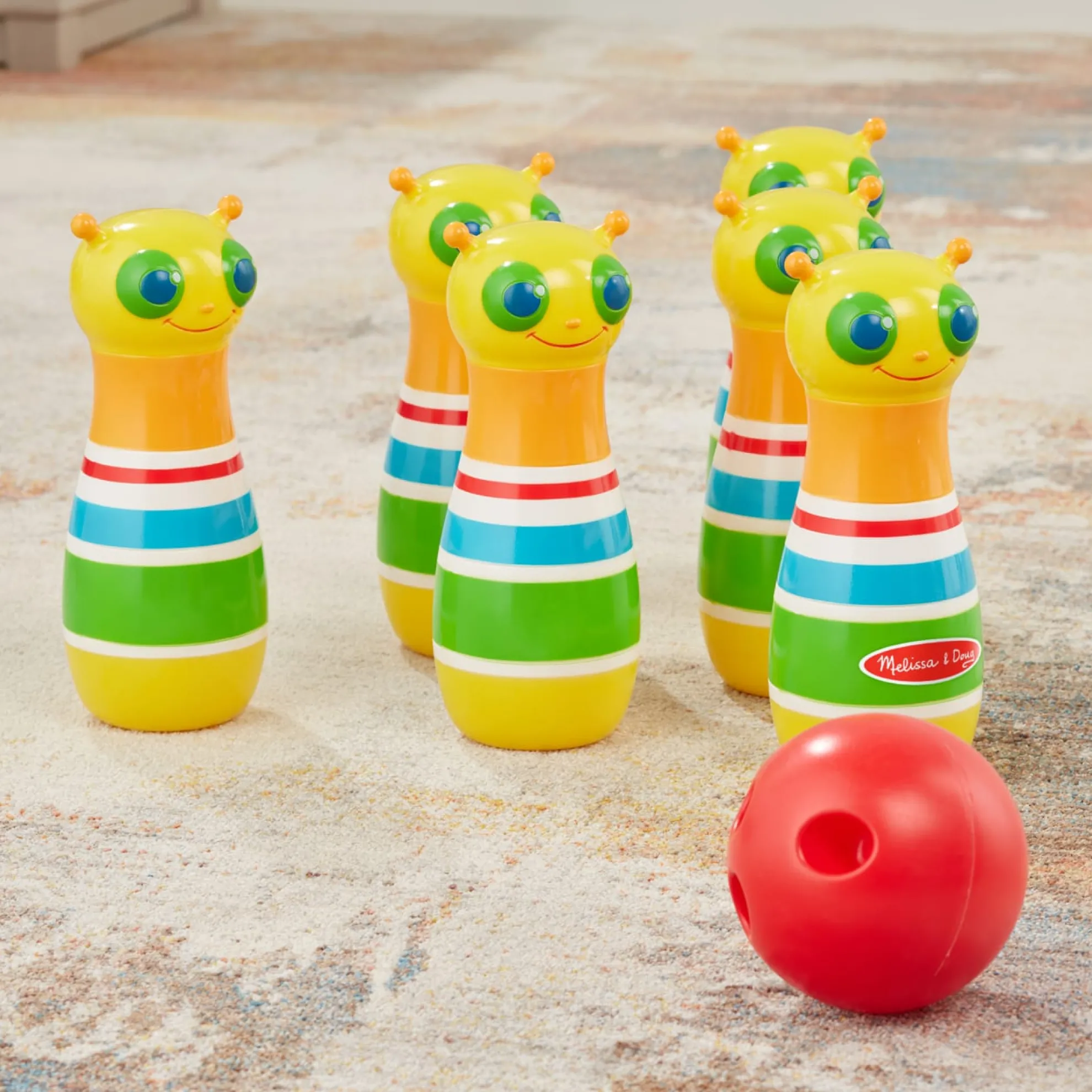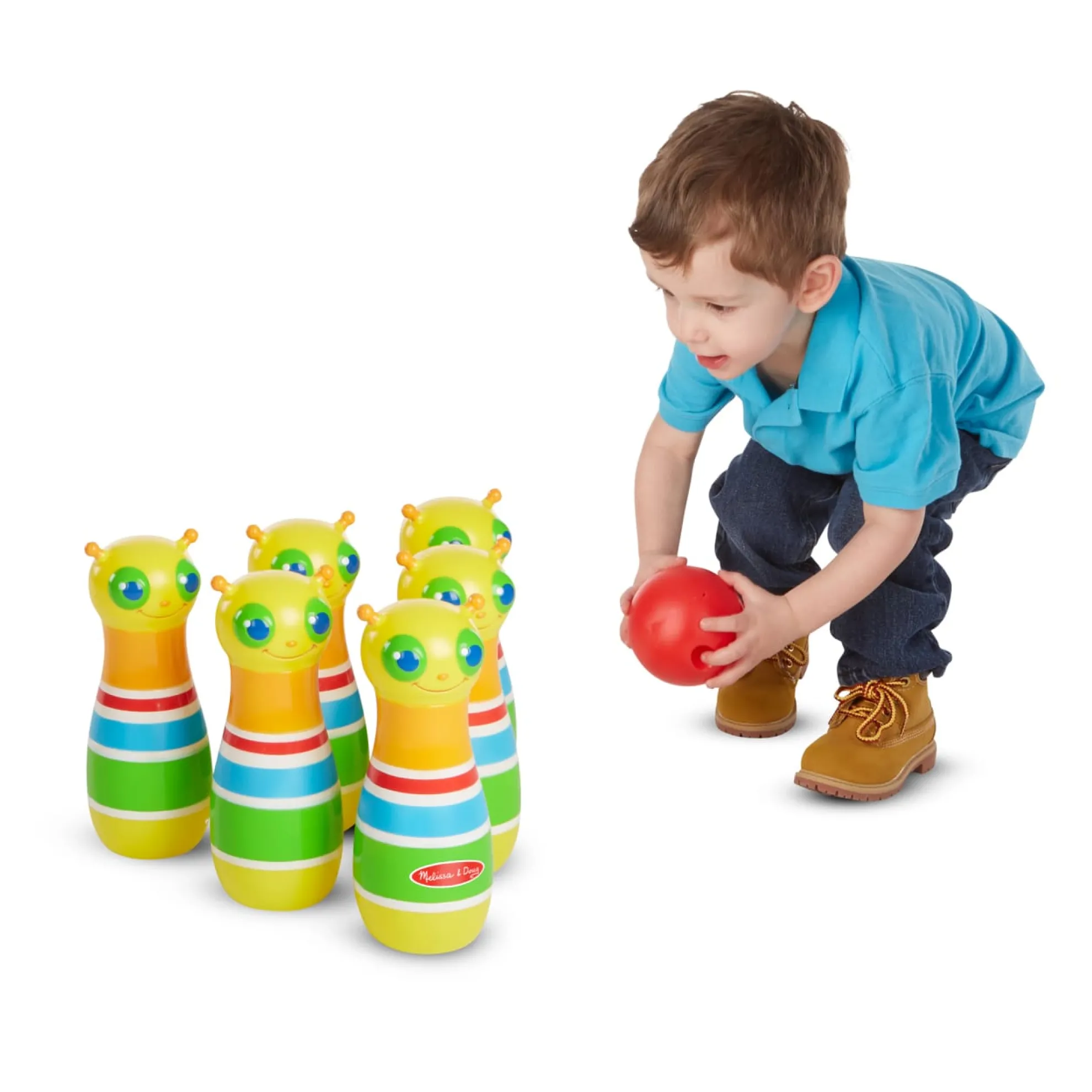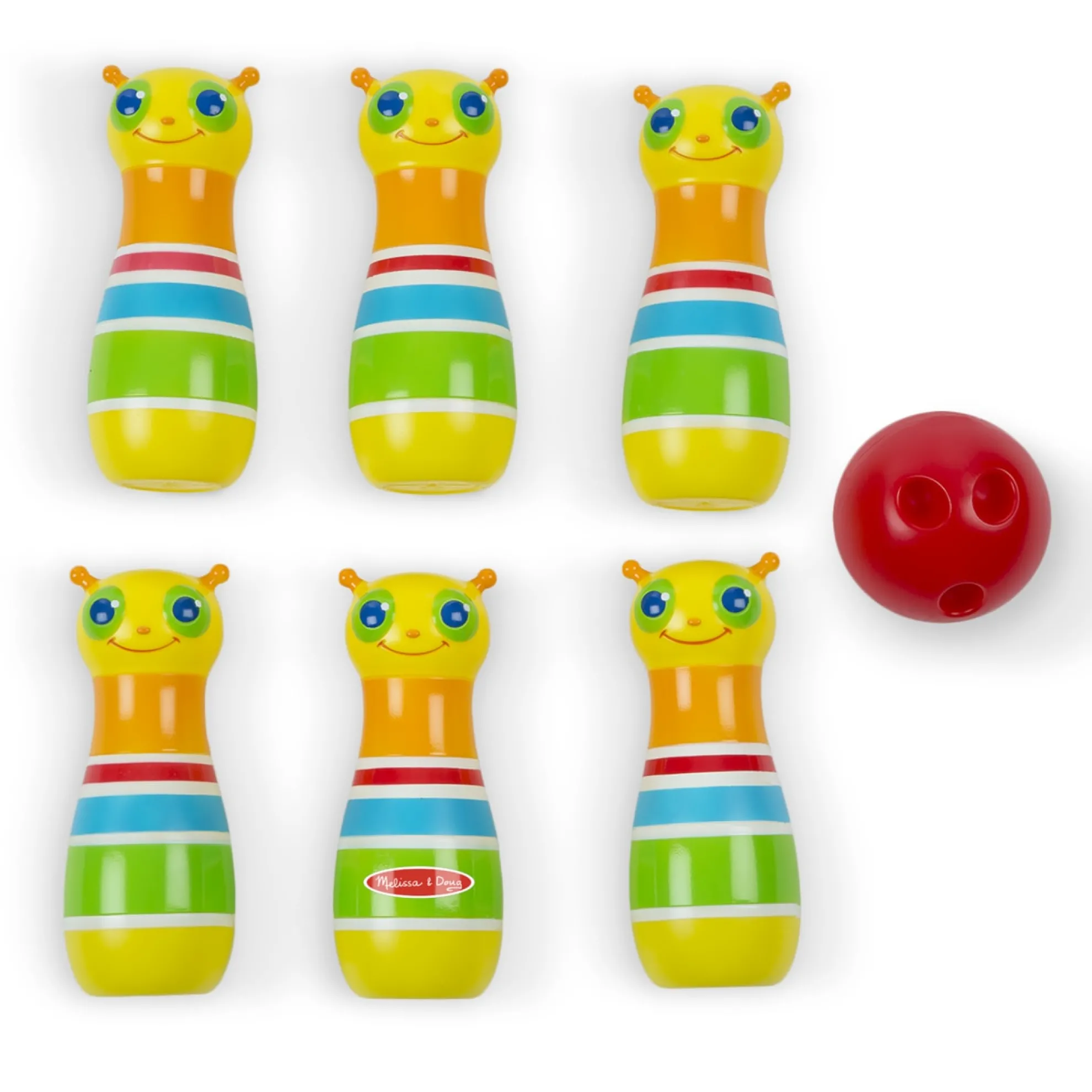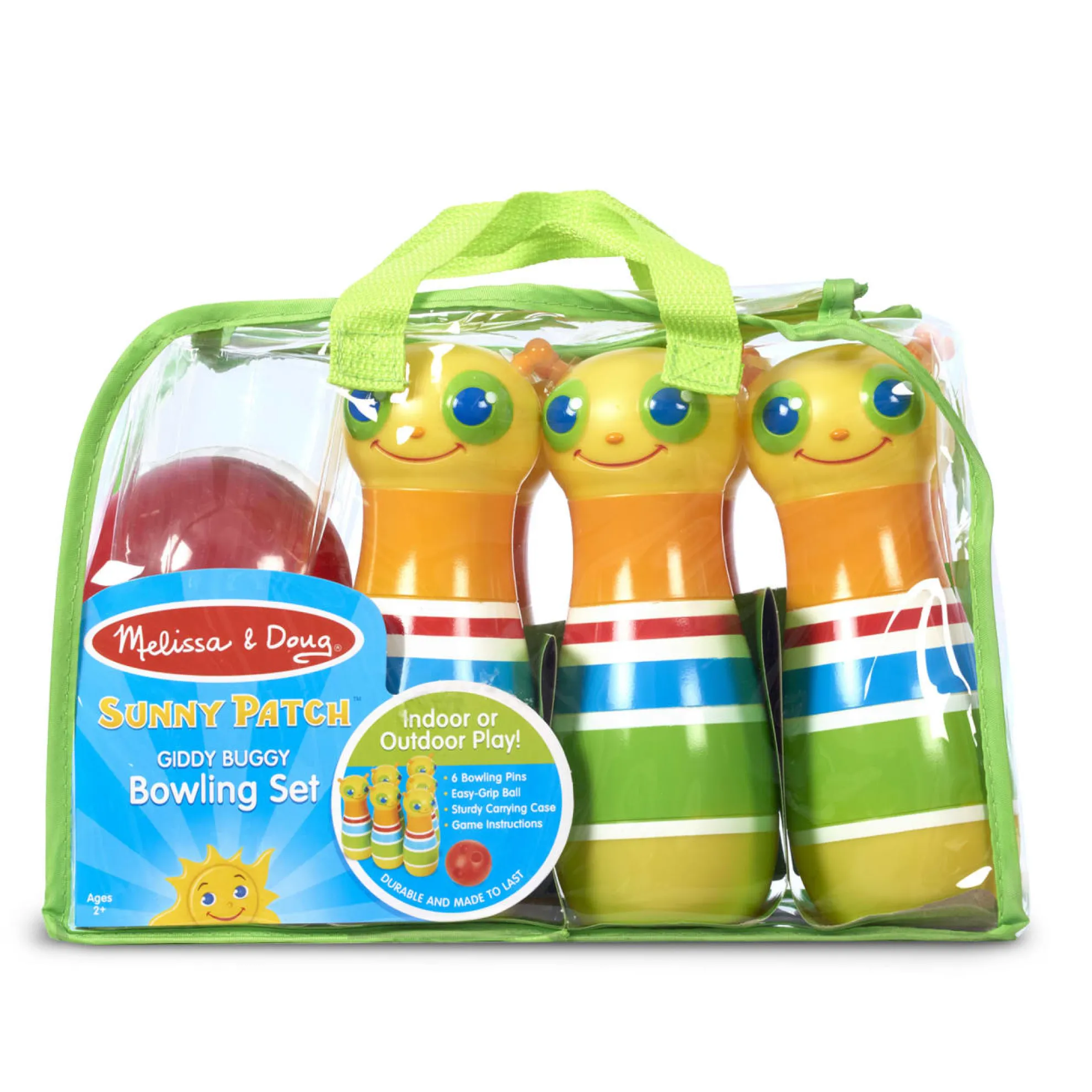 The always-happy Giddy Buggy caterpillar will bowl you over with his smiling face and this exciting kid-sized bowling set! The set includes six bowling pins, an easy grip bowling ball, game instructions, and a sturdy carrying case with handles. Little ones can have loads of fun as they set up the eight-inch bowling pins, roll the kid-sized ball, and knock ’em down! Melissa & Doug’s bowling set is part of the Sunny Patch line of products, so it’s made to be used both inside and outside. Kids can take it along on play dates, bring it to the beach or the park, or play with it indoors — it makes a great rainy day activity! Durable construction means that the pins will stand up to endless tumbles. It’s a great way to spend time with friends and family, or enjoy independent play. The game encourages hand-eye coordination and dexterity, and early counting skills. It’s a great gift for kids ages two and older for hands-on, screen-free play.