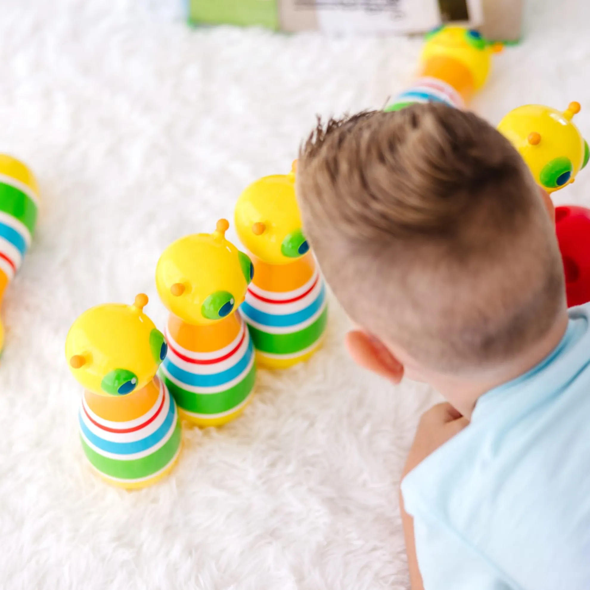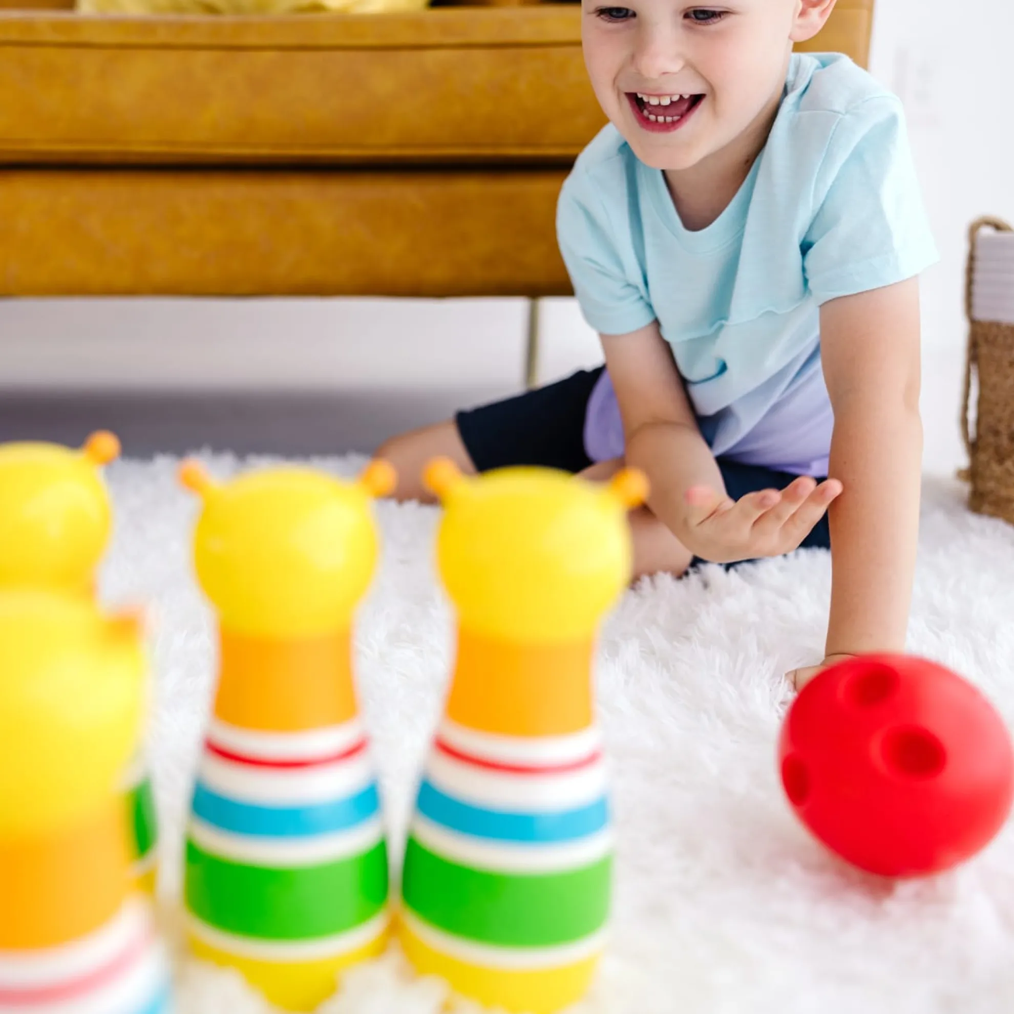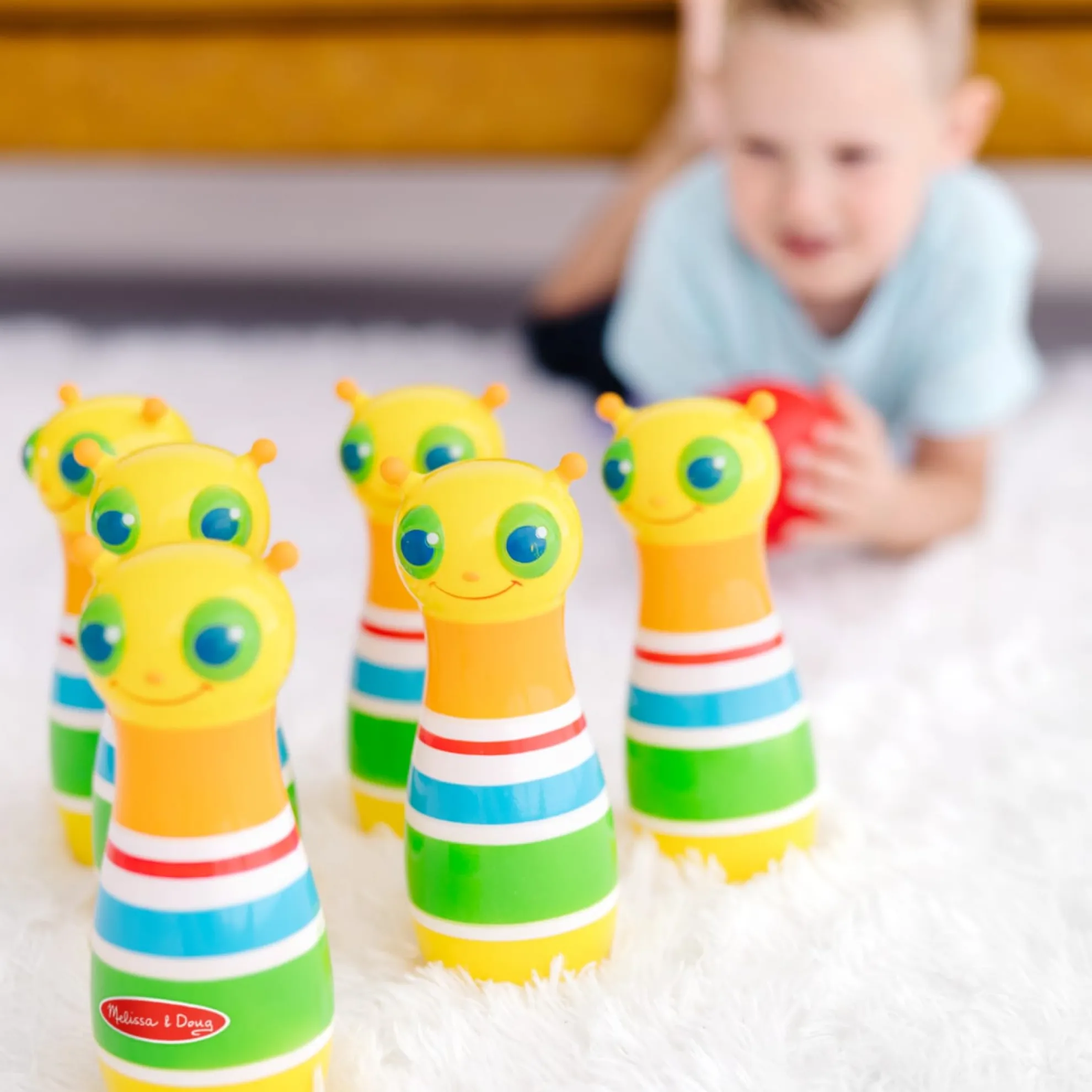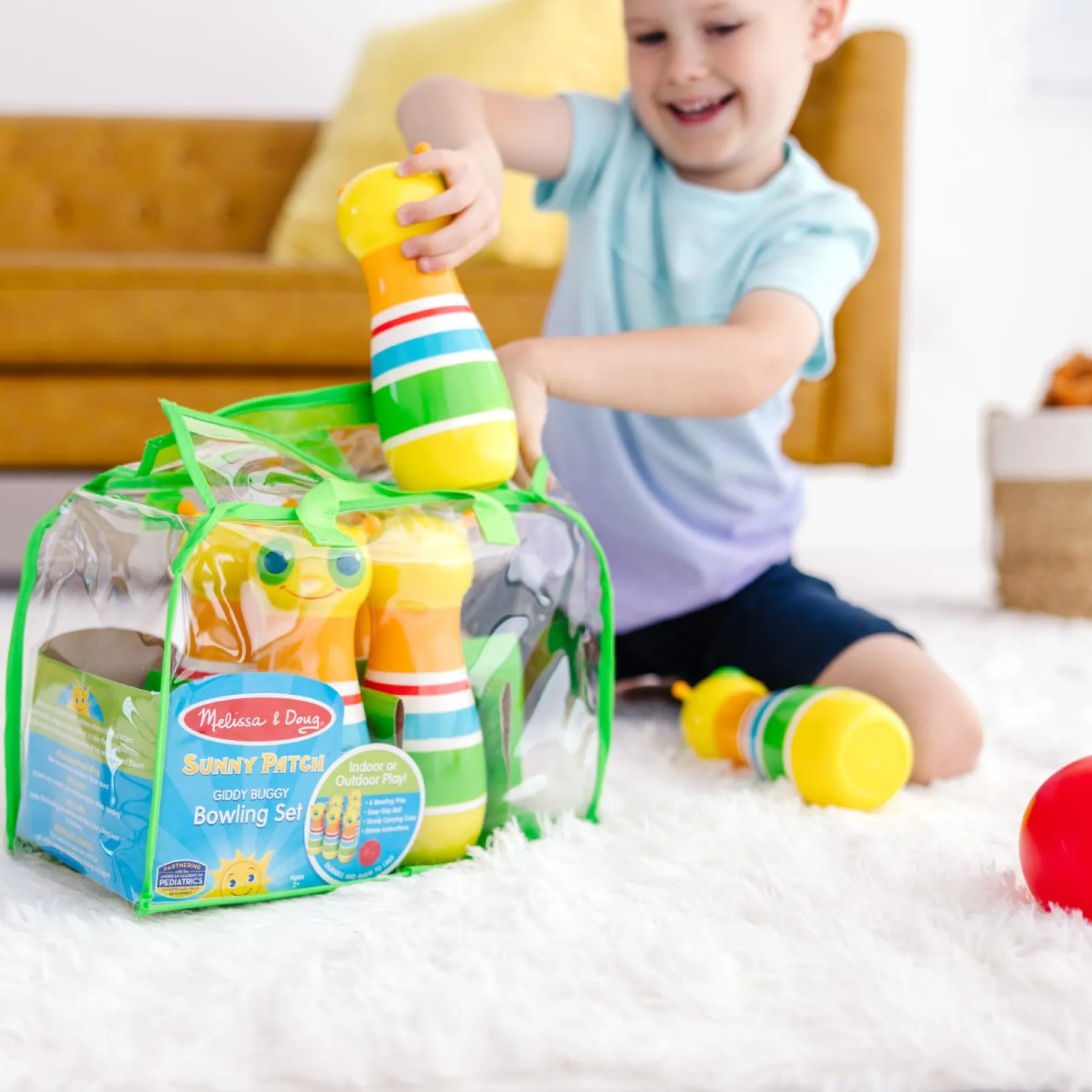 The always-happy Giddy Buggy caterpillar will bowl you over with his smiling face and this exciting kid-sized bowling set! The set includes six bowling pins, an easy grip bowling ball, game instructions, and a sturdy carrying case with handles. Little ones can have loads of fun as they set up the eight-inch bowling pins, roll the kid-sized ball, and knock ’em down! Melissa & Doug’s bowling set is part of the Sunny Patch line of products, so it’s made to be used both inside and outside. Kids can take it along on play dates, bring it to the beach or the park, or play with it indoors — it makes a great rainy day activity! Durable construction means that the pins will stand up to endless tumbles. It’s a great way to spend time with friends and family, or enjoy independent play. The game encourages hand-eye coordination and dexterity, and early counting skills. It’s a great gift for kids ages two and older for hands-on, screen-free play.