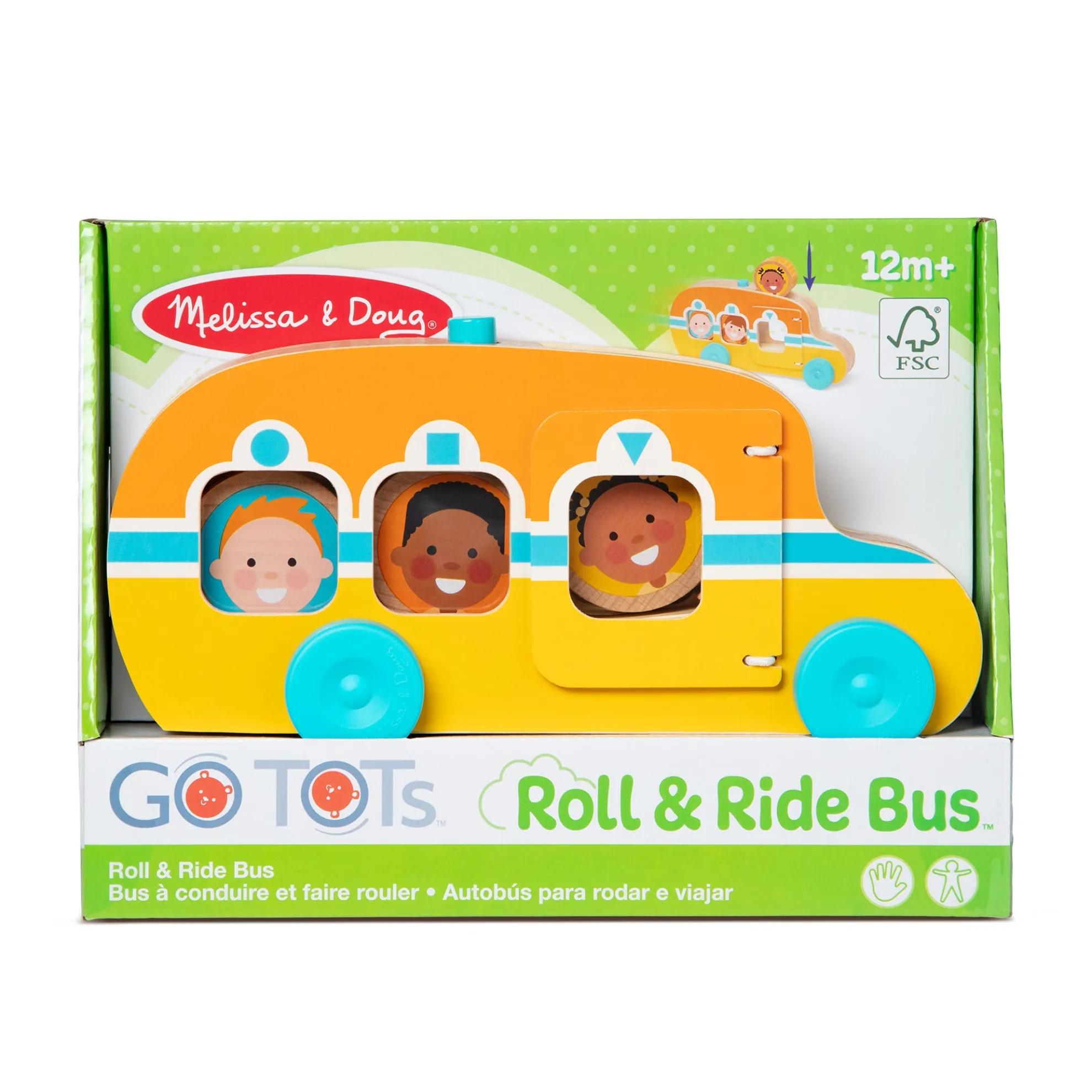 - Roll, stack, and grasp 3 double-sided wooden GO Tots friends and make them spin and bounce in the colorful wooden bus; press the release button and GO Tots roll out the back