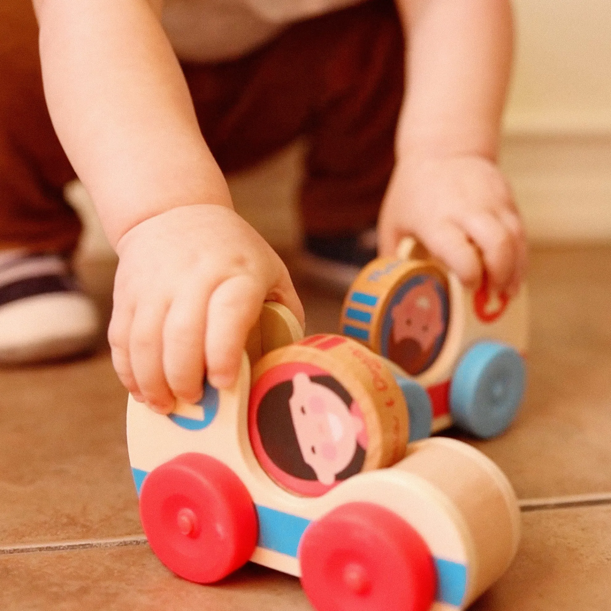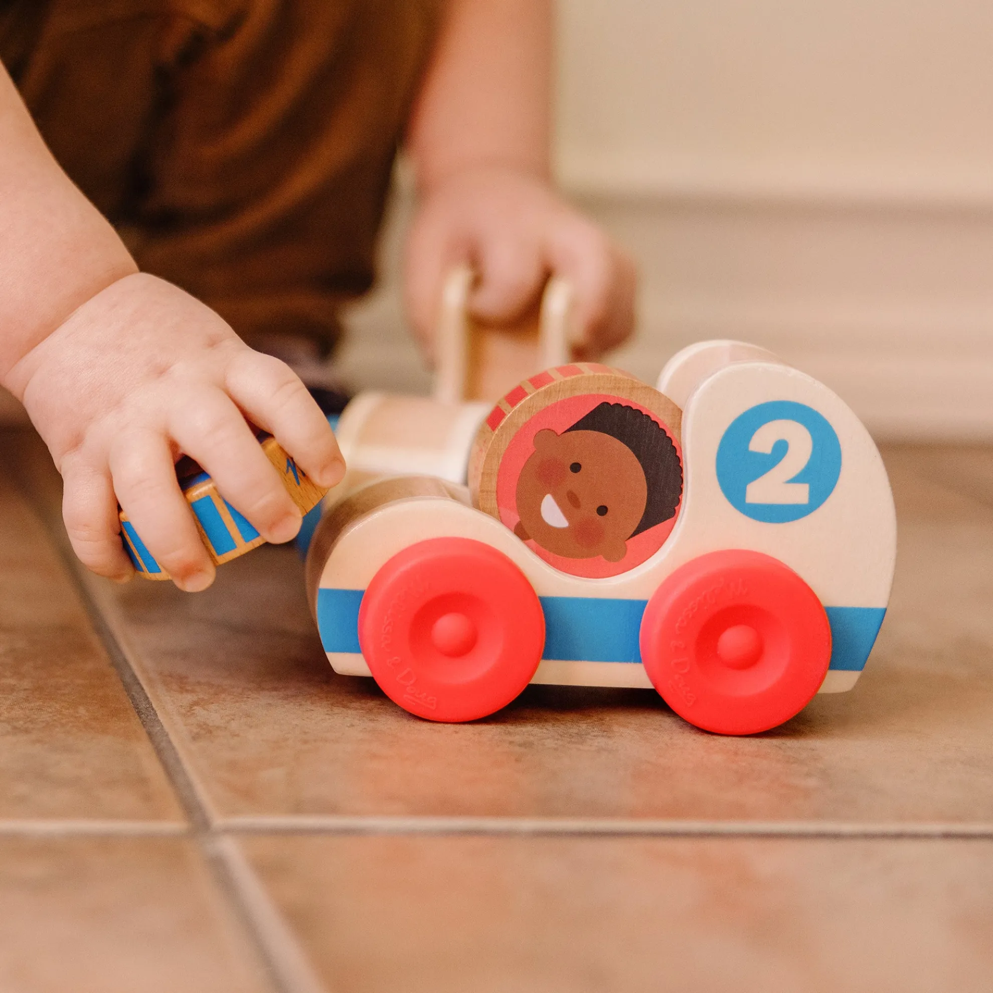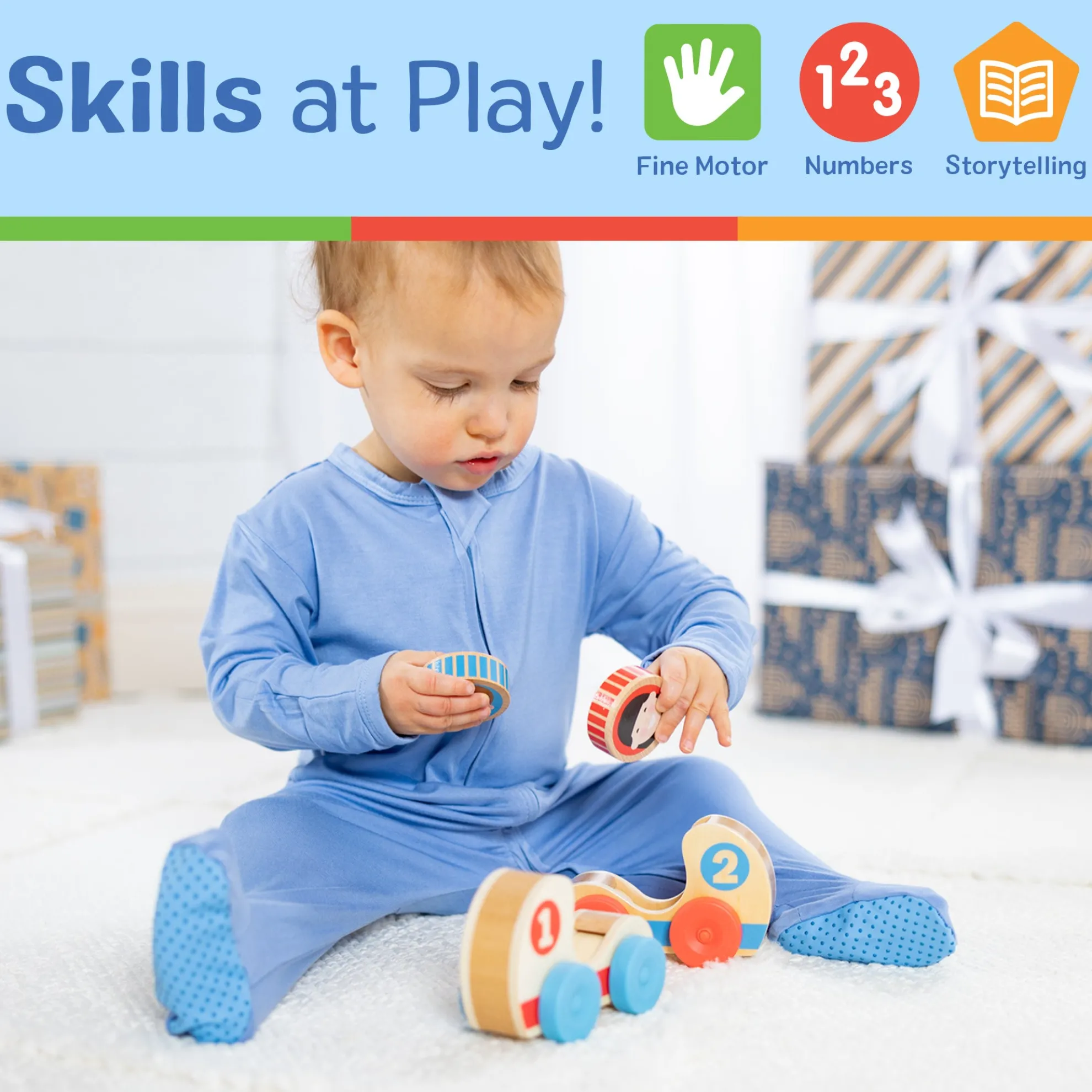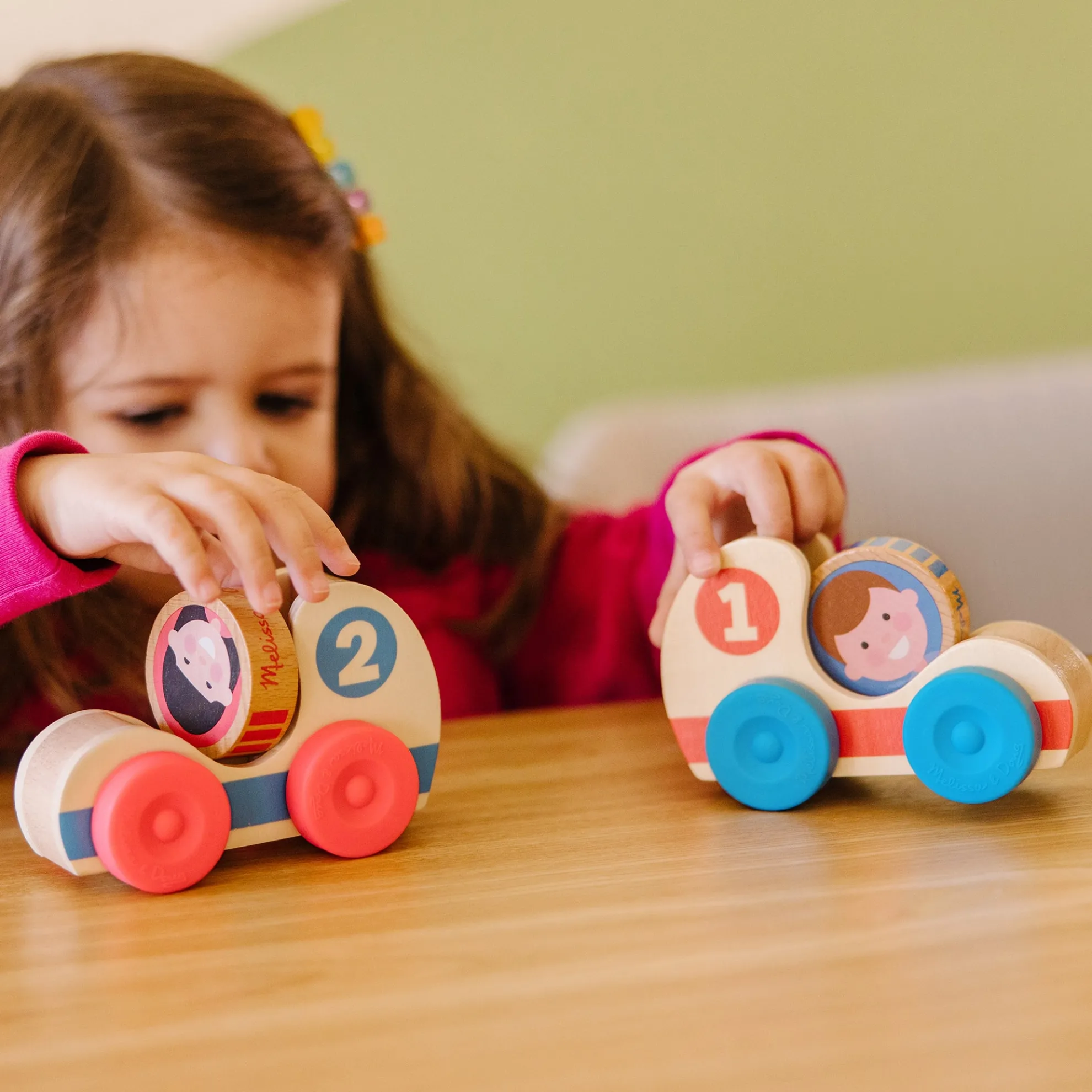 - Roll, stack, and grasp 2 double-sided wooden GO Tots friends and make them spin in 2 numbered wooden race cars