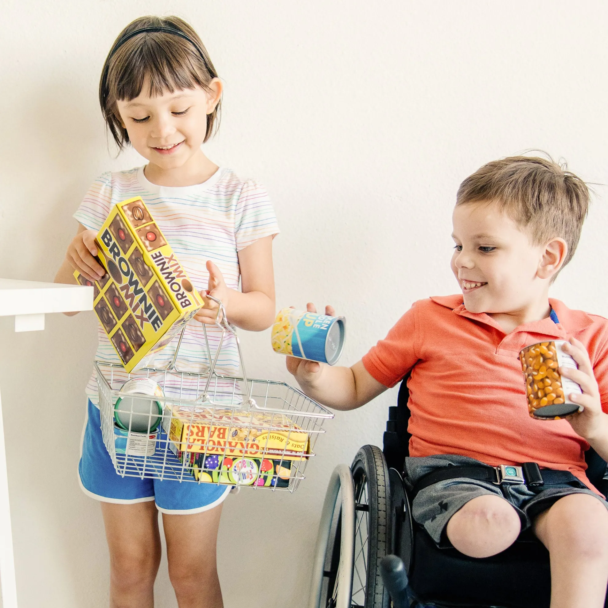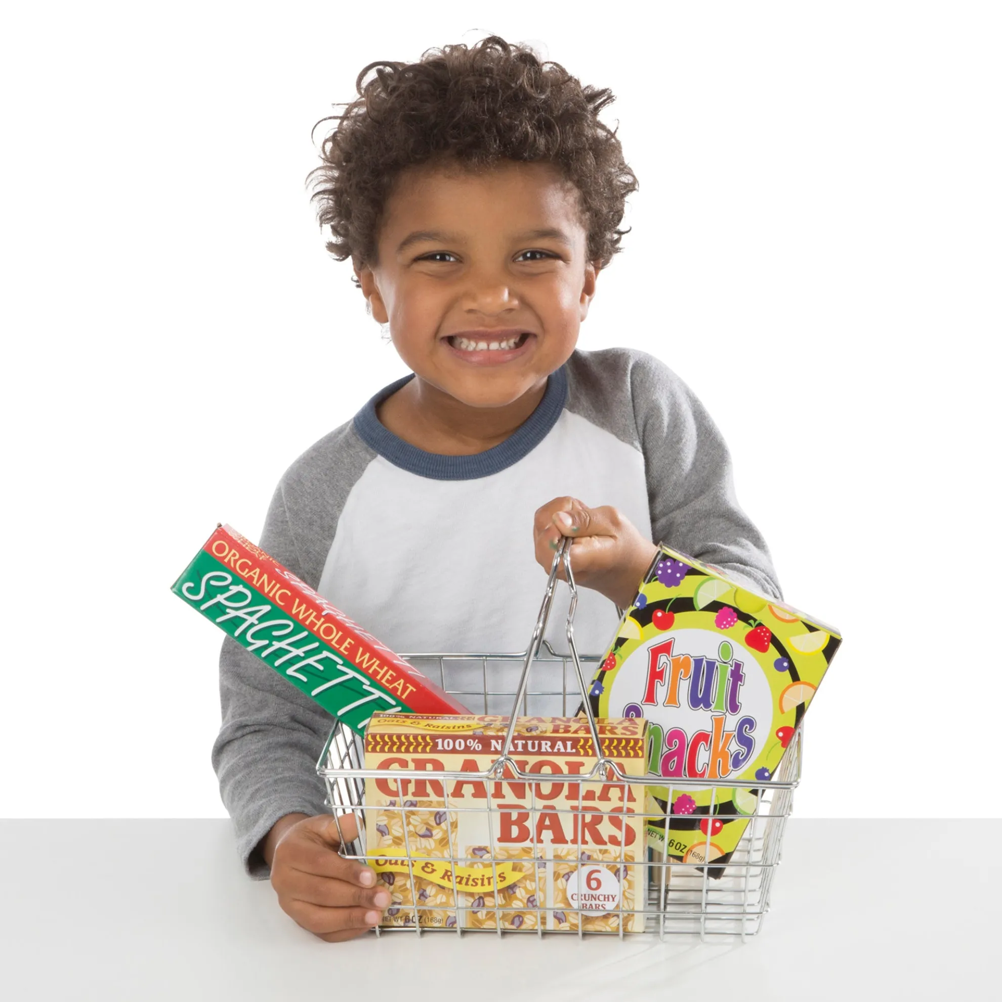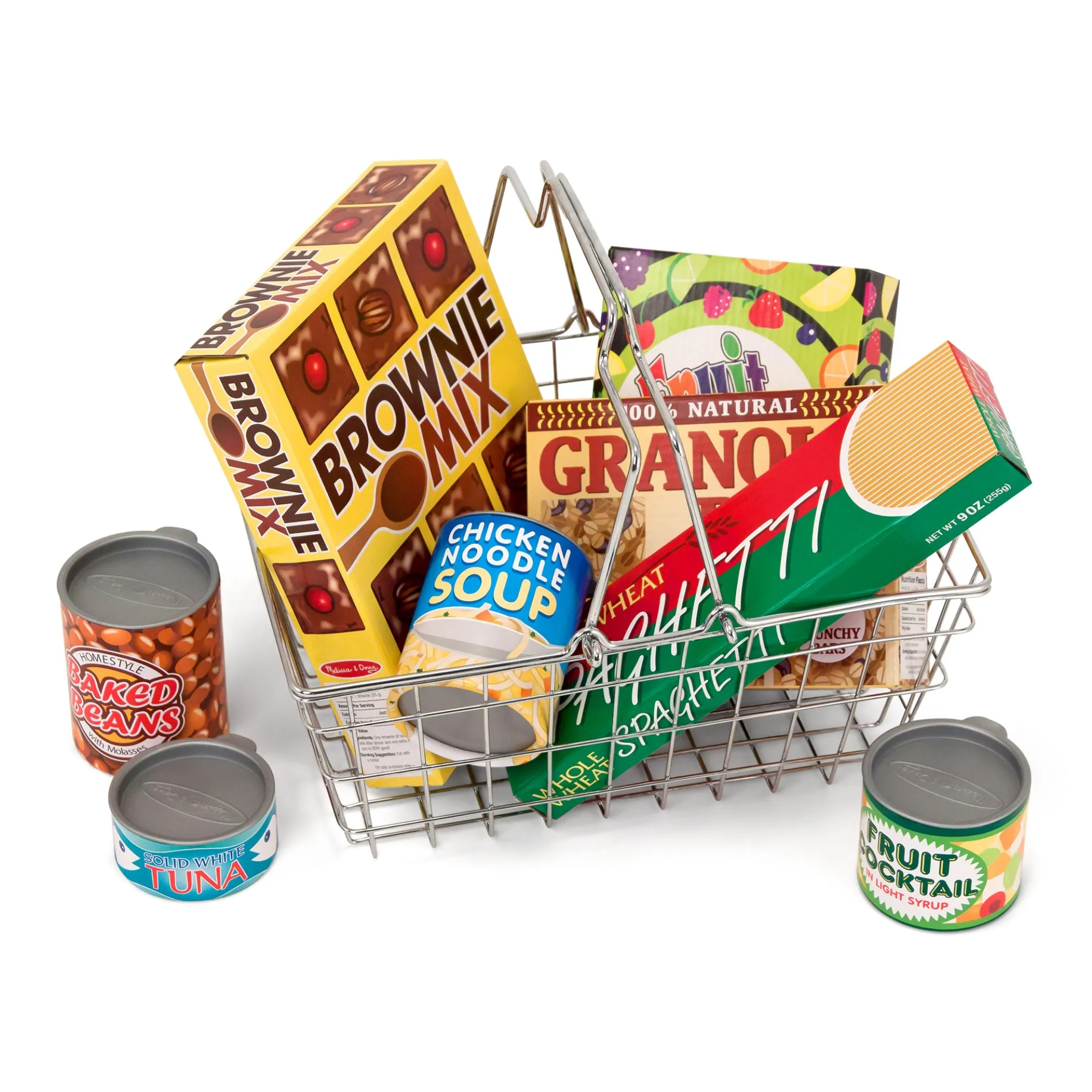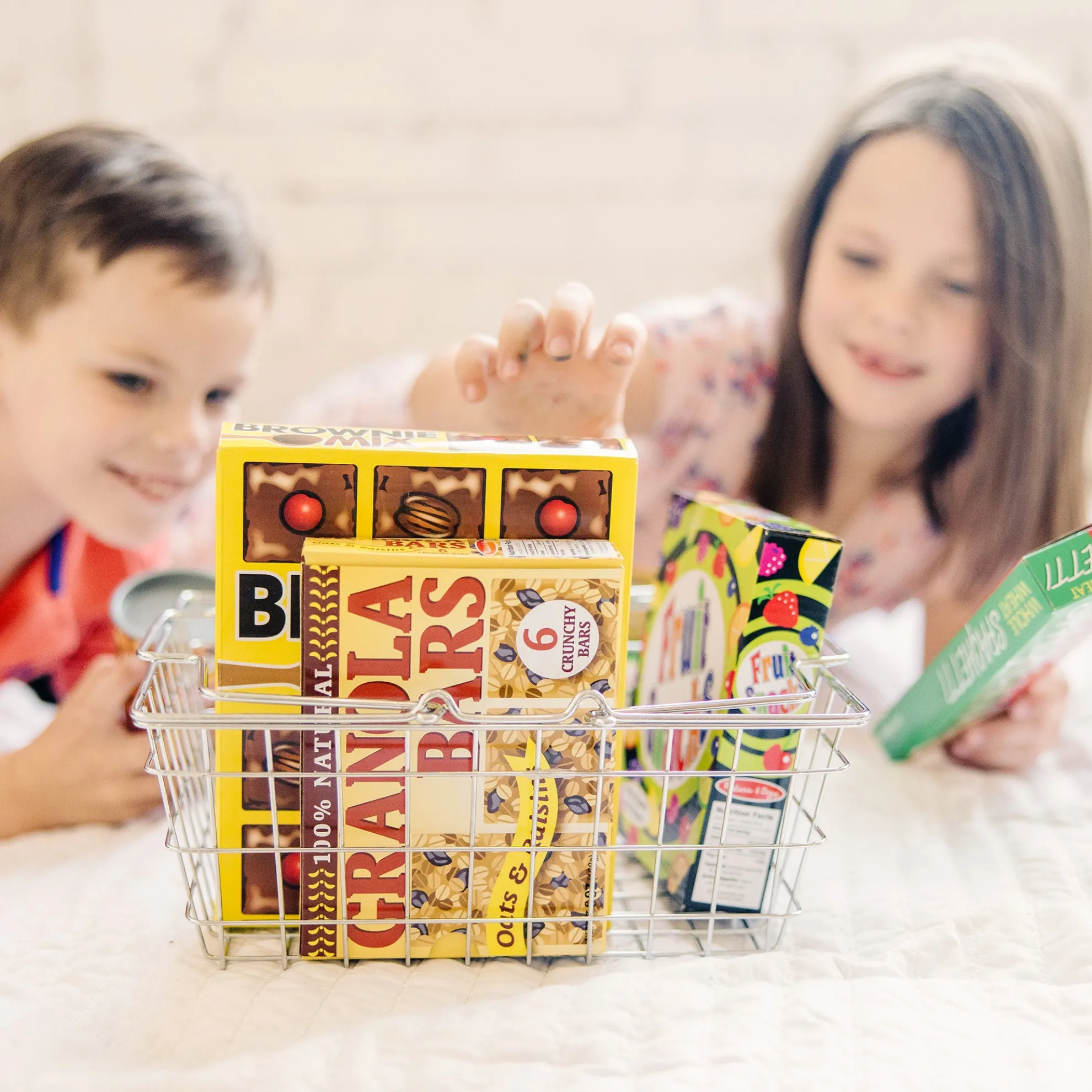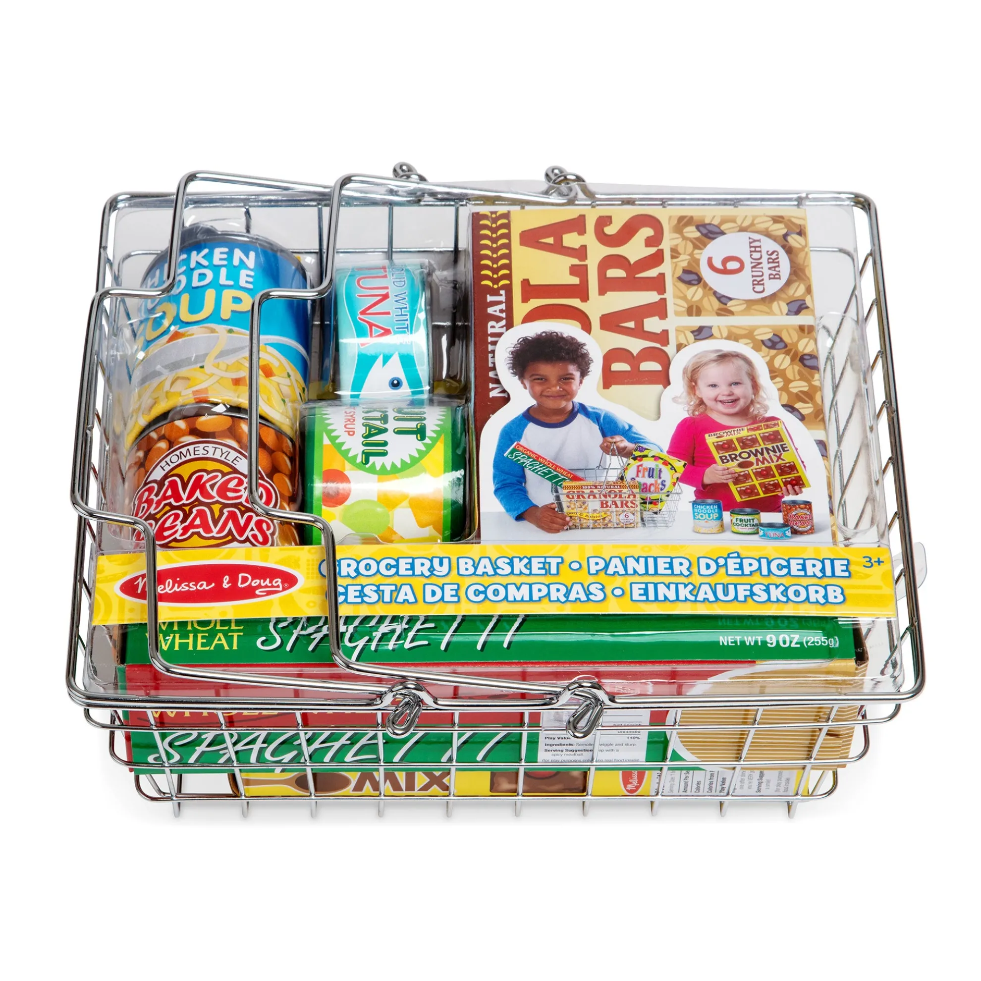 If make-believe fun is on your shopping list, check out this all-in-one kitchen and grocery play set! This realistic wire grocery basket toy is just the right size for pretend play. It comes stocked with play food boxes and play food cans with pop-off lids–in all, eight sturdy, colorfully labeled packages to stock, load and “cook.” The wire basket is carefully designed to be comfortable to carry, easy to store and wonderfully durable. The sturdy handles fold flat for easy folding or stacking, then lift up to carry around the “shop.”