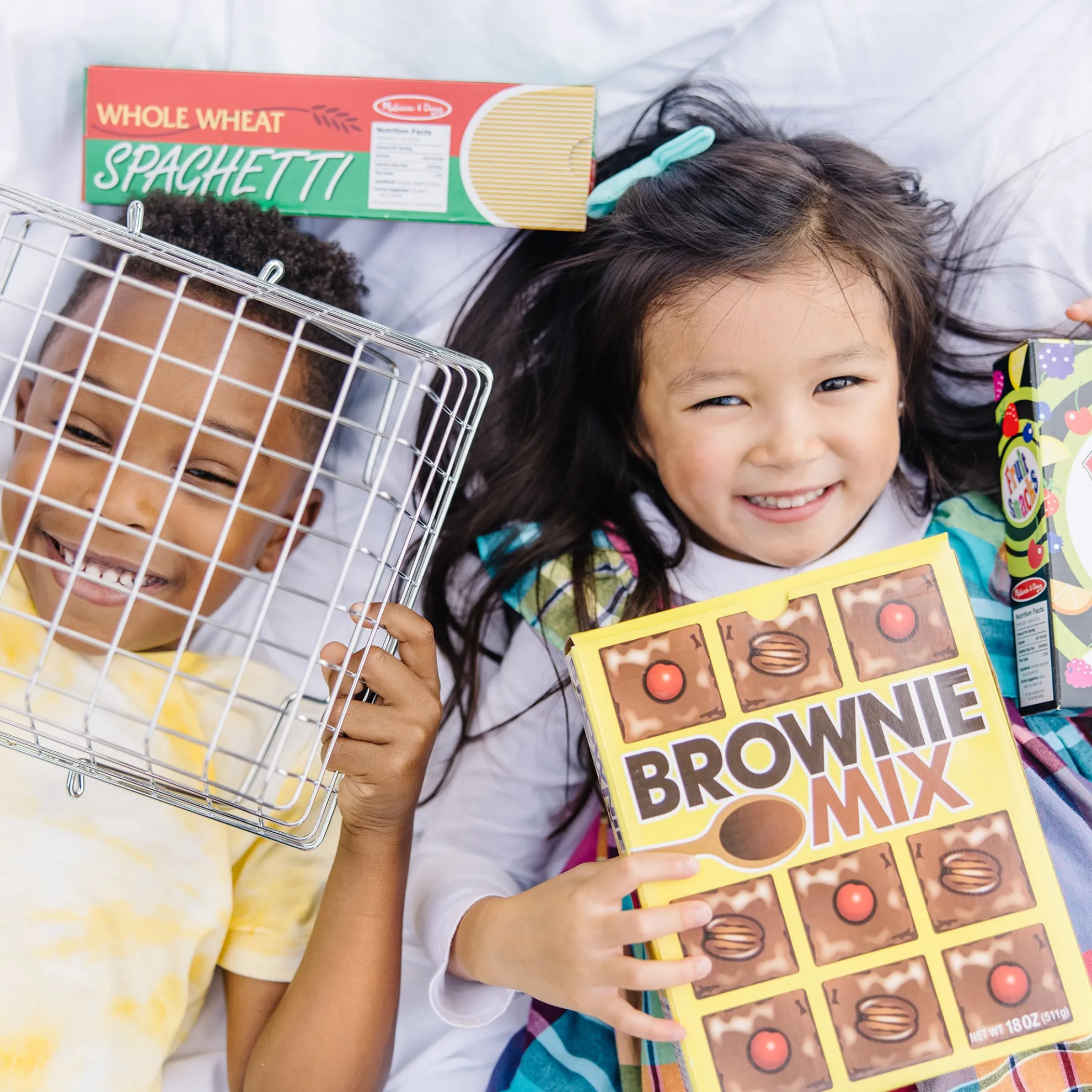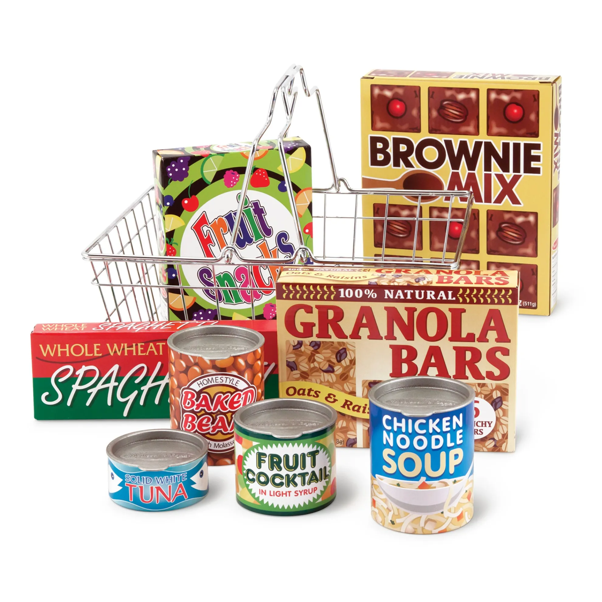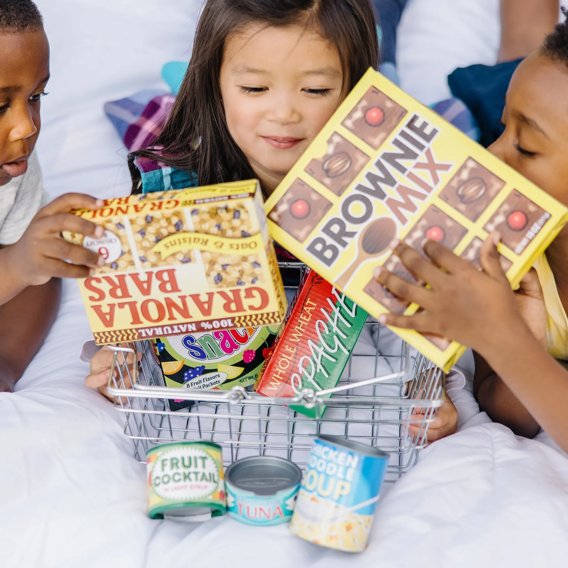- Includes 8 play food packages with colorful labels: tuna, fruit cocktail, chicken noodle soup, baked beans, spaghetti, brownie mix, fruit snacks and granola bars