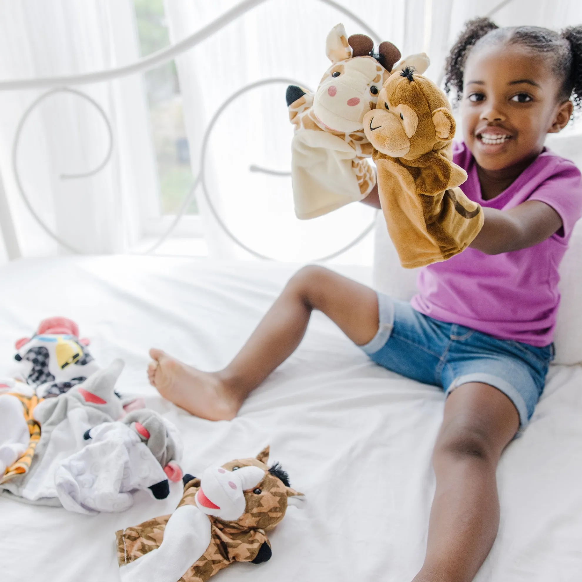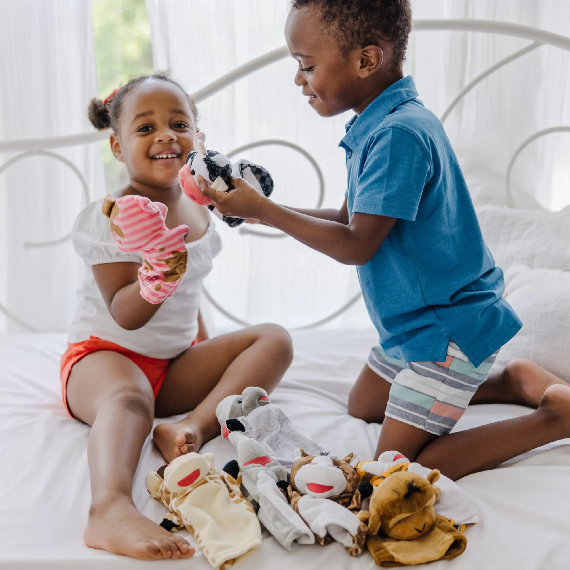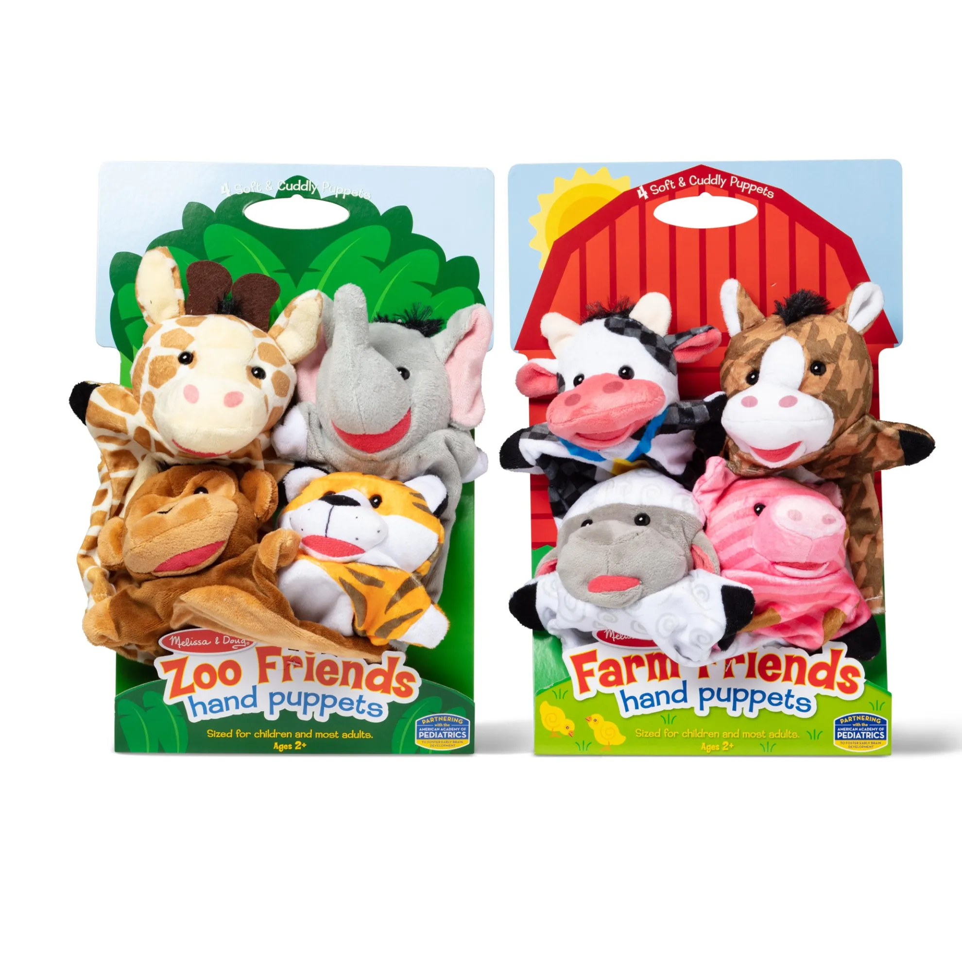Two four-piece hand-puppet sets featuring friendly animals make it easy for children and caregivers to role-play together! Each set includes four simple glove puppets in coordinated themes (Farm Friends and Zoo Friends). Hand puppets are great for developing motor skills, hand-eye coordination, communication skills, self-confidence, parent-child bonding, and so much more! Made with brightly patterned, washable fabrics and built to last, these soft and sweet hand puppets are sure to be go-to toys for years to come. Farm Friends includes a sheep, cow, pig, and horse; Zoo Friends includes a tiger, monkey, elephant, and giraffe.