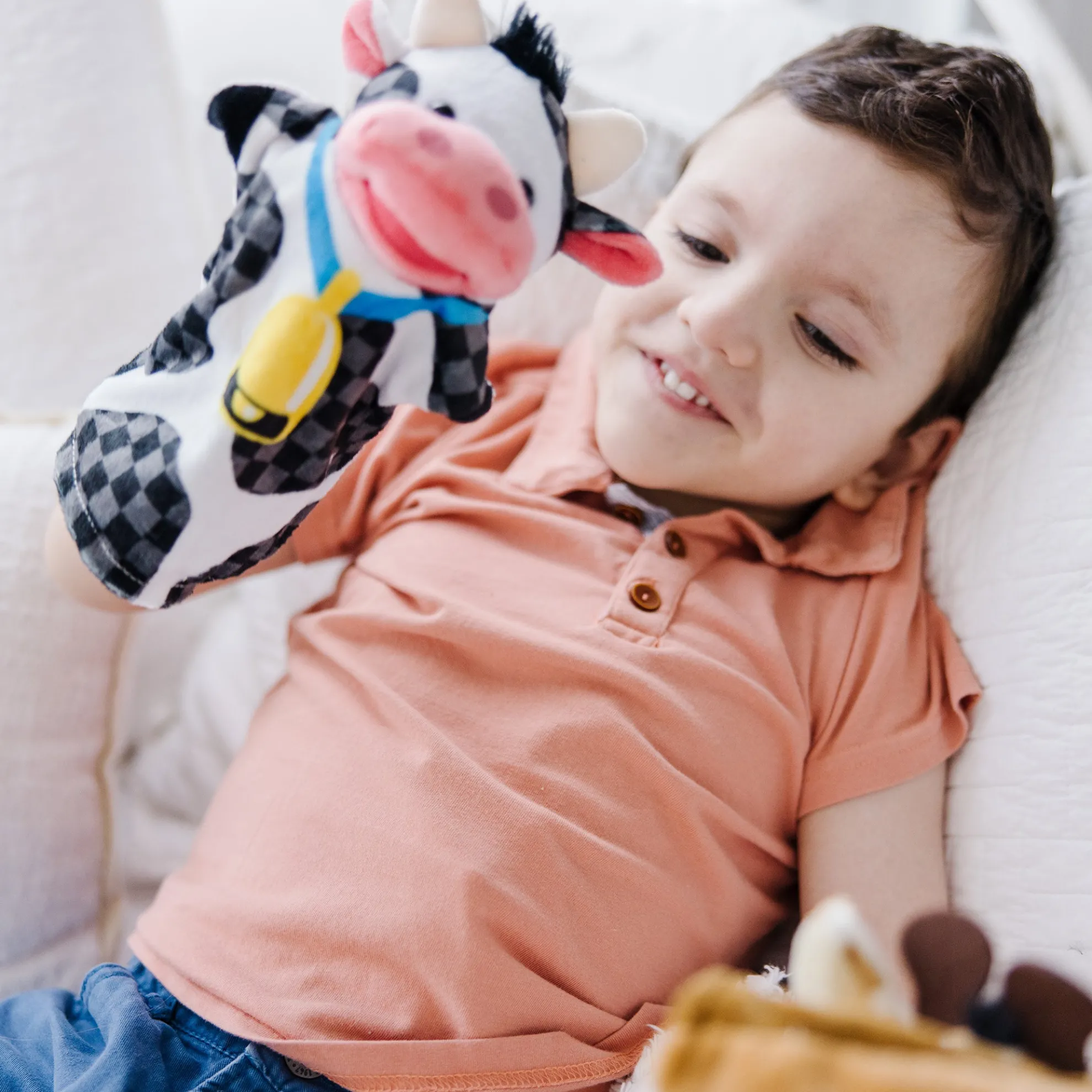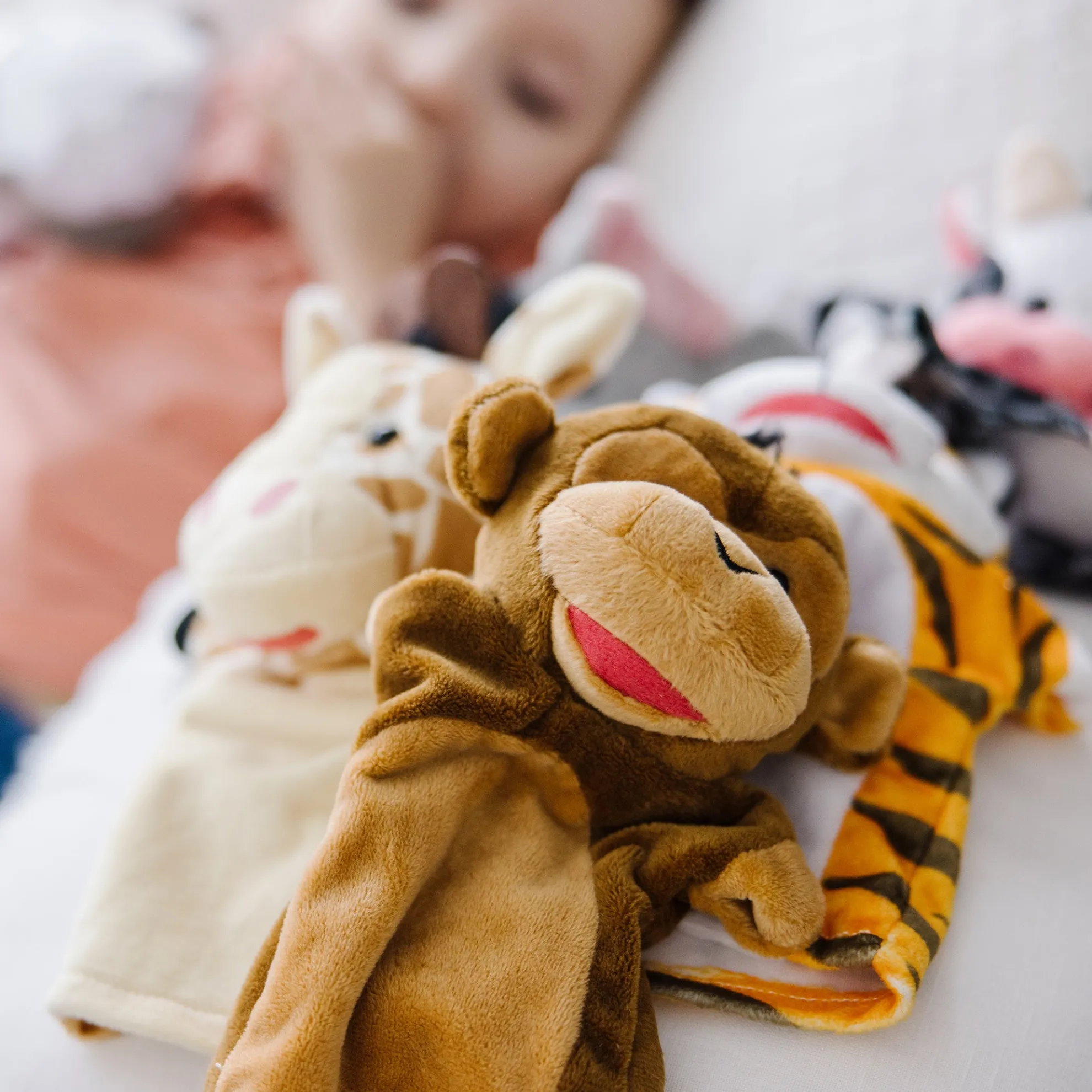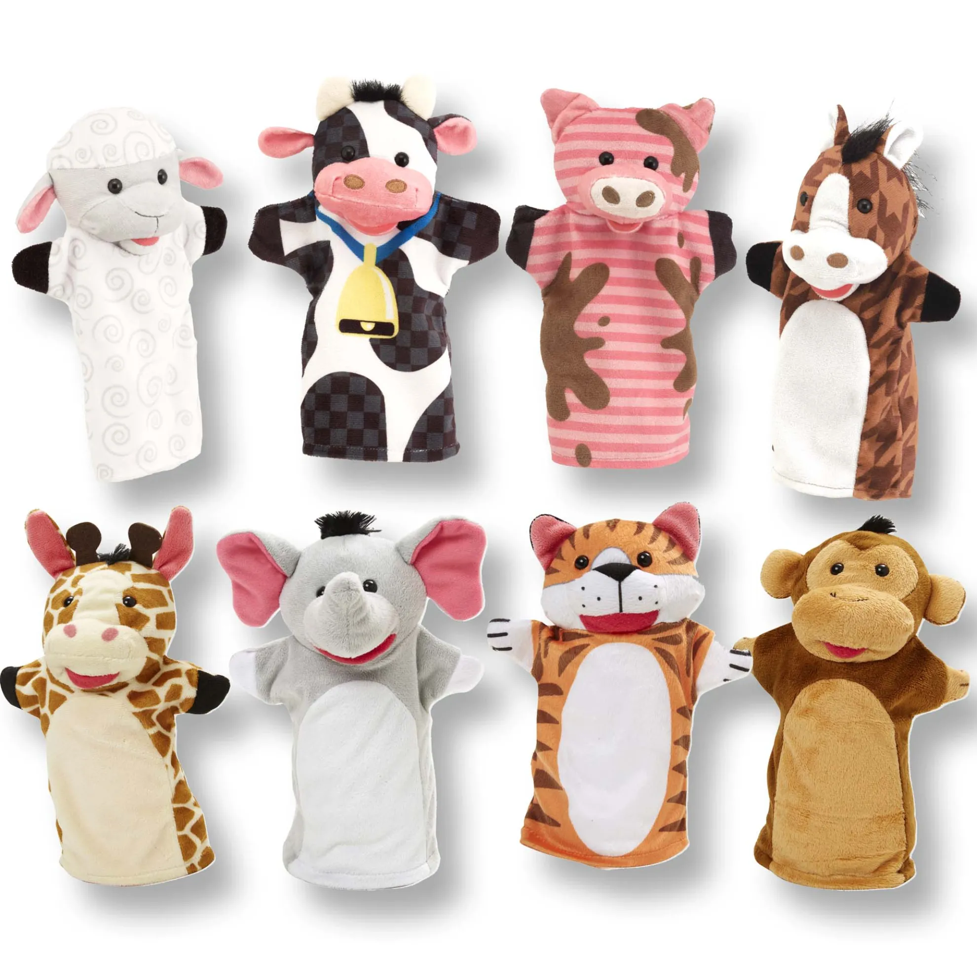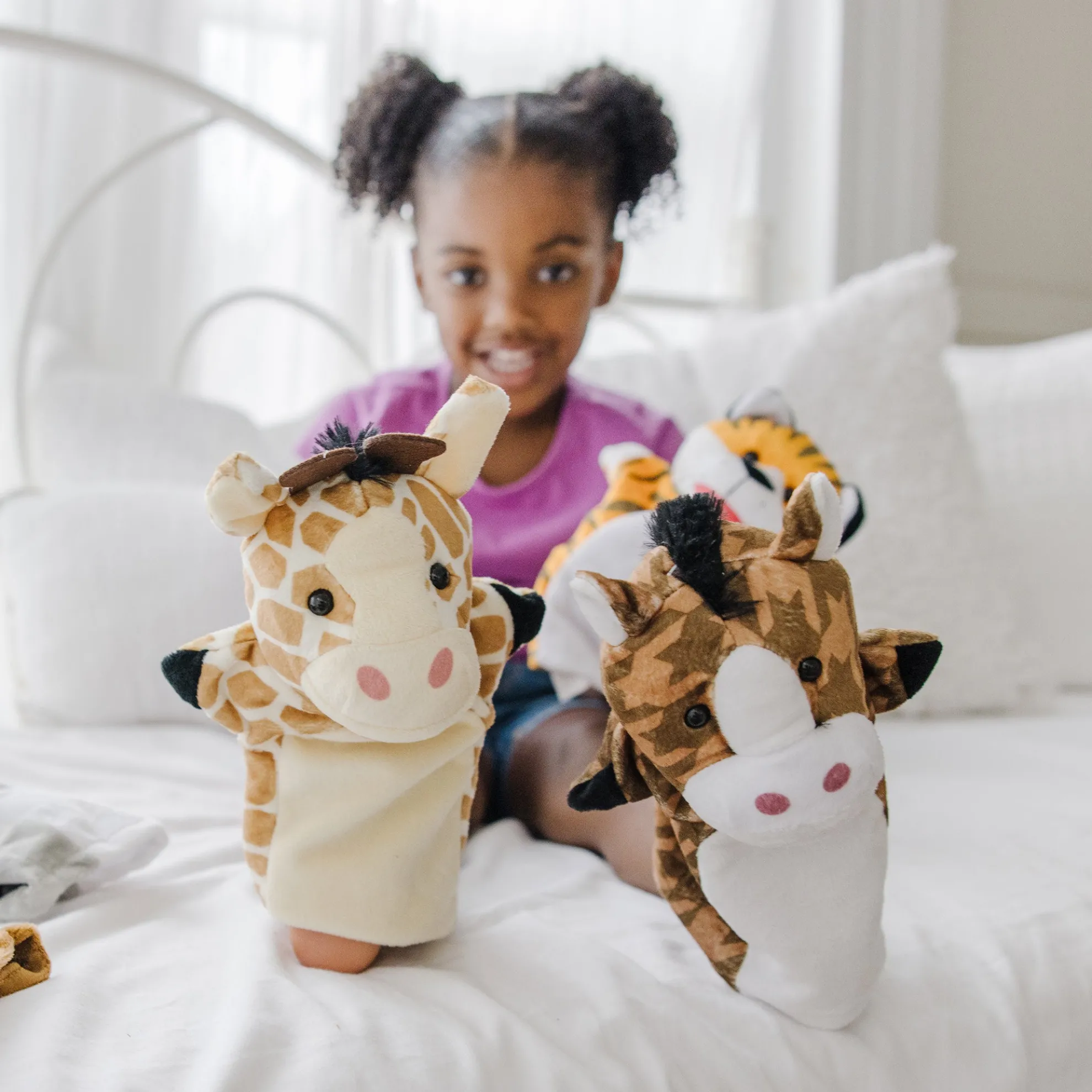 Two four-piece hand-puppet sets featuring friendly animals make it easy for children and caregivers to role-play together! Each set includes four simple glove puppets in coordinated themes (Farm Friends and Zoo Friends). Hand puppets are great for developing motor skills, hand-eye coordination, communication skills, self-confidence, parent-child bonding, and so much more! Made with brightly patterned, washable fabrics and built to last, these soft and sweet hand puppets are sure to be go-to toys for years to come. Farm Friends includes a sheep, cow, pig, and horse; Zoo Friends includes a tiger, monkey, elephant, and giraffe.