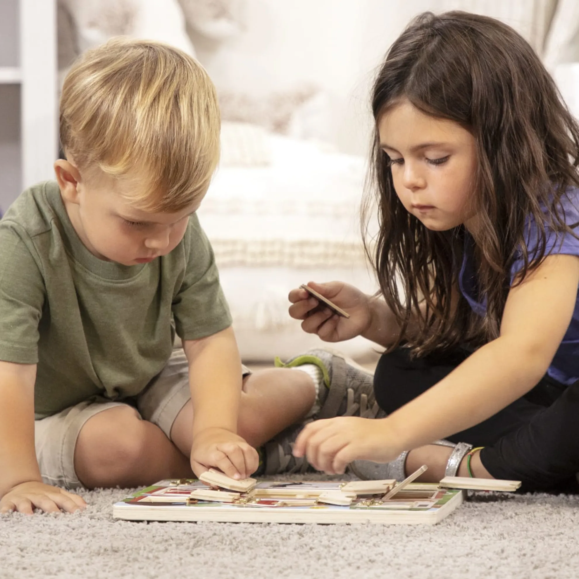 - Magnetic puzzle board with hinged doors for open-and-close fun