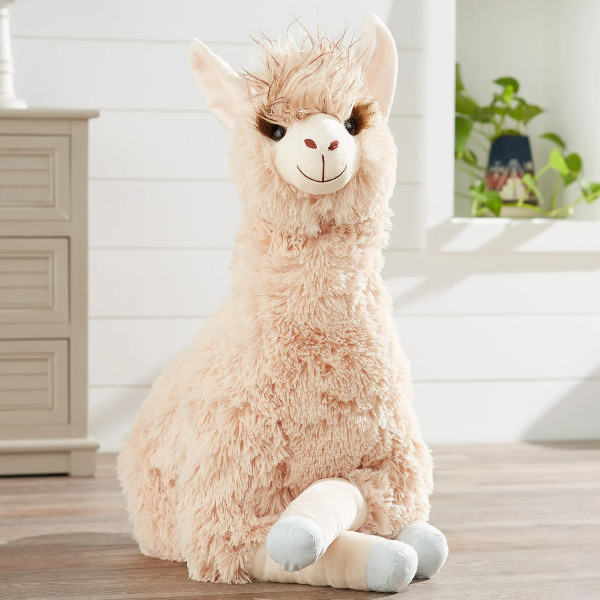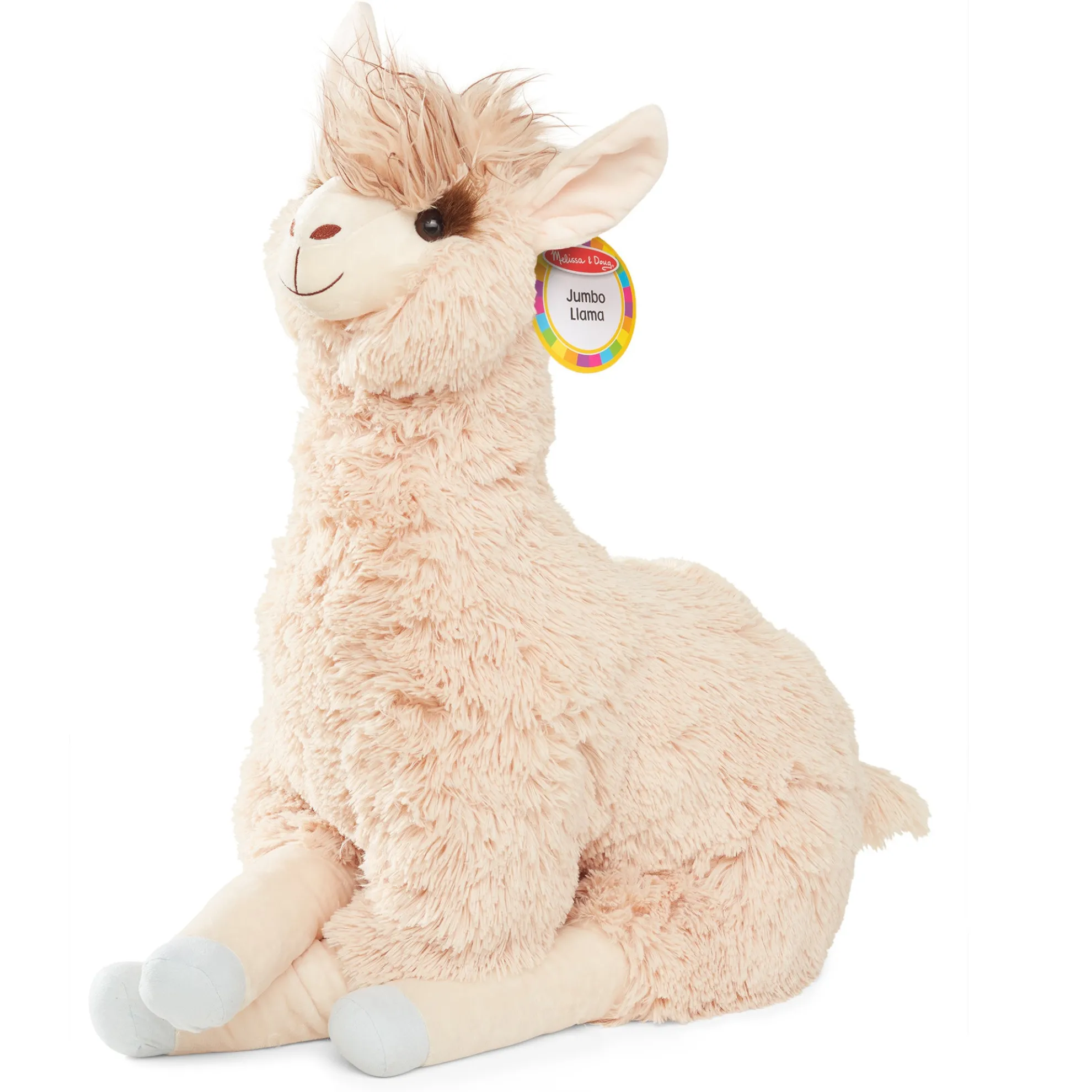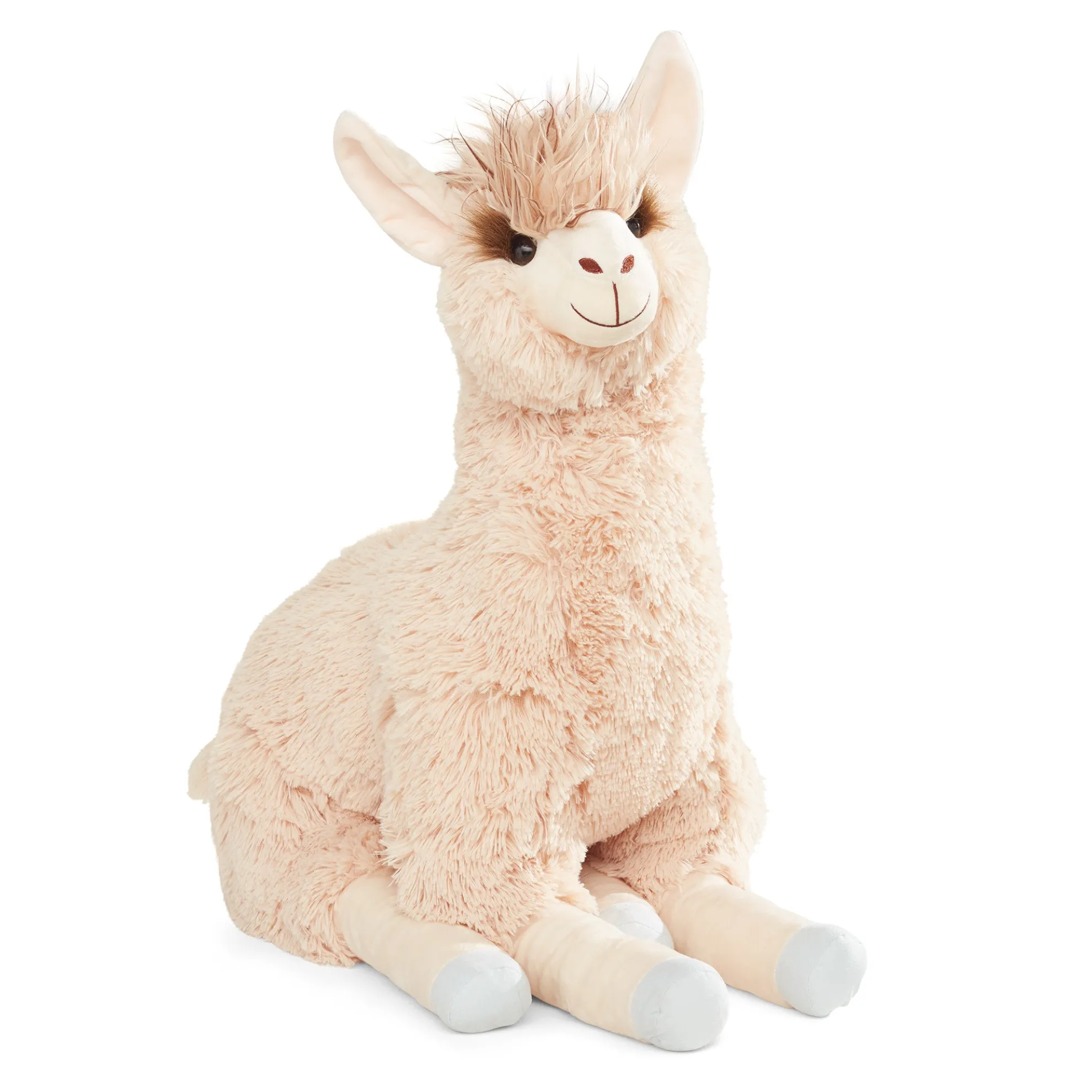 The fluffy, floppy Jumbo Llama offers a lifetime of llama love! Long, extra-soft fur and squishy fill make this llama perfect for petting and hugging. Durably made from top-quality materials, it will last through years of cuddles. The silky beige-colored llama sits up proudly with legs outstretched—it’s approximately 26 inches from its belly to the top of its tufted-topped head, and about 42 inches from nose to the end of its outstretched back legs. With perky pink ears, long, silky eyelashes, a fluffy mop on top, and a sweet expression, this llama is ideal for kids’ rooms, from nurseries to college dorms!