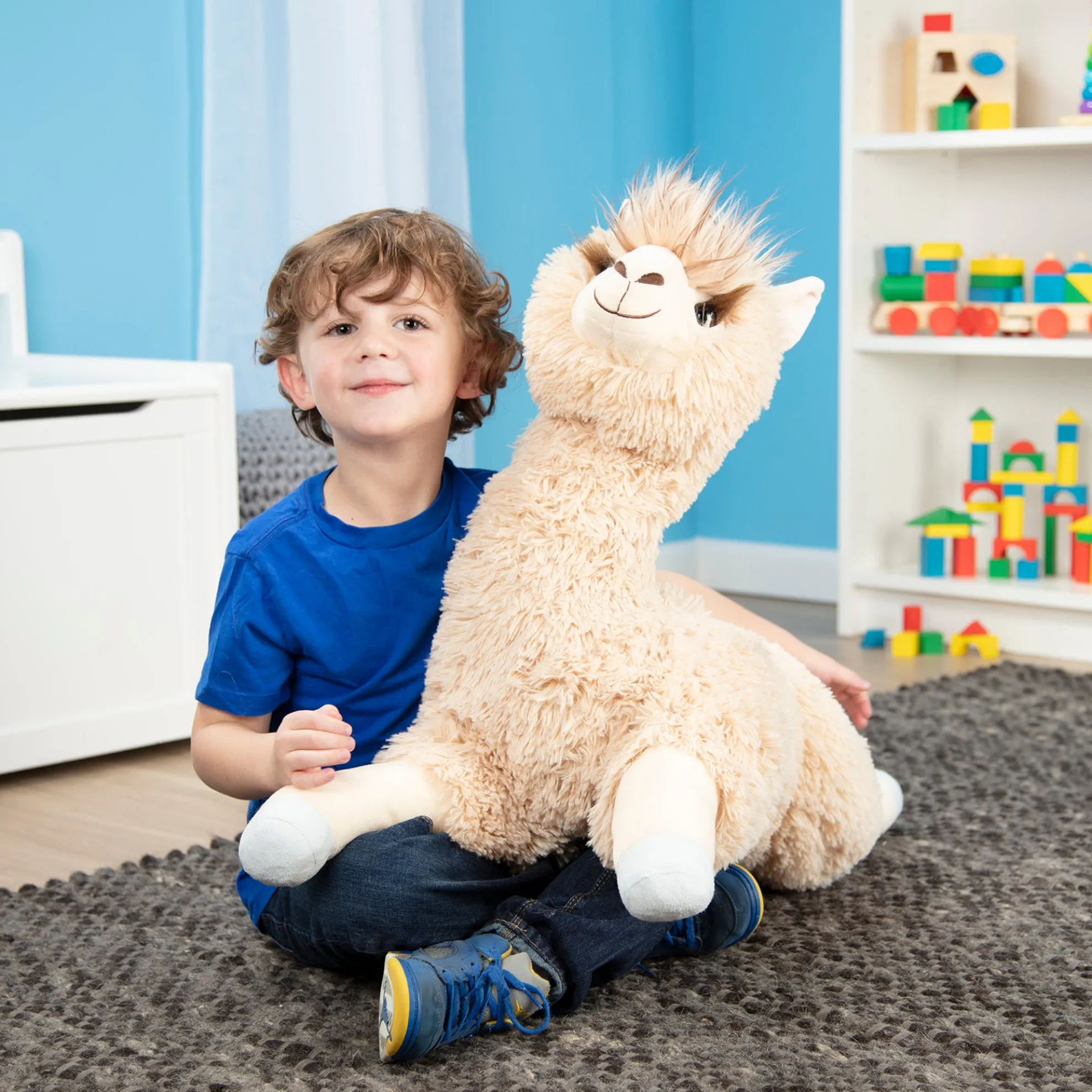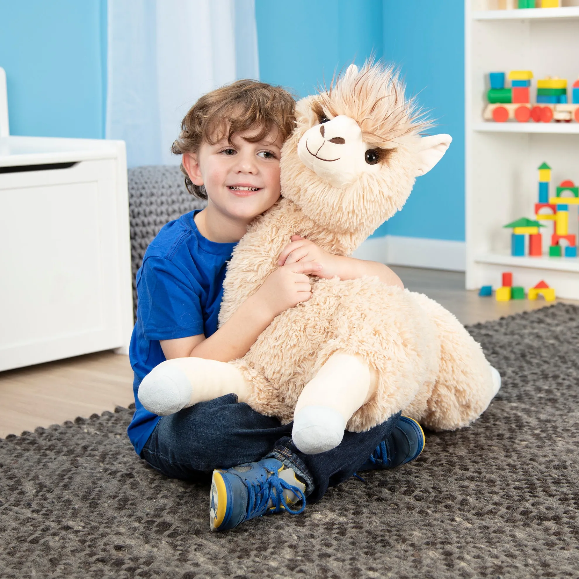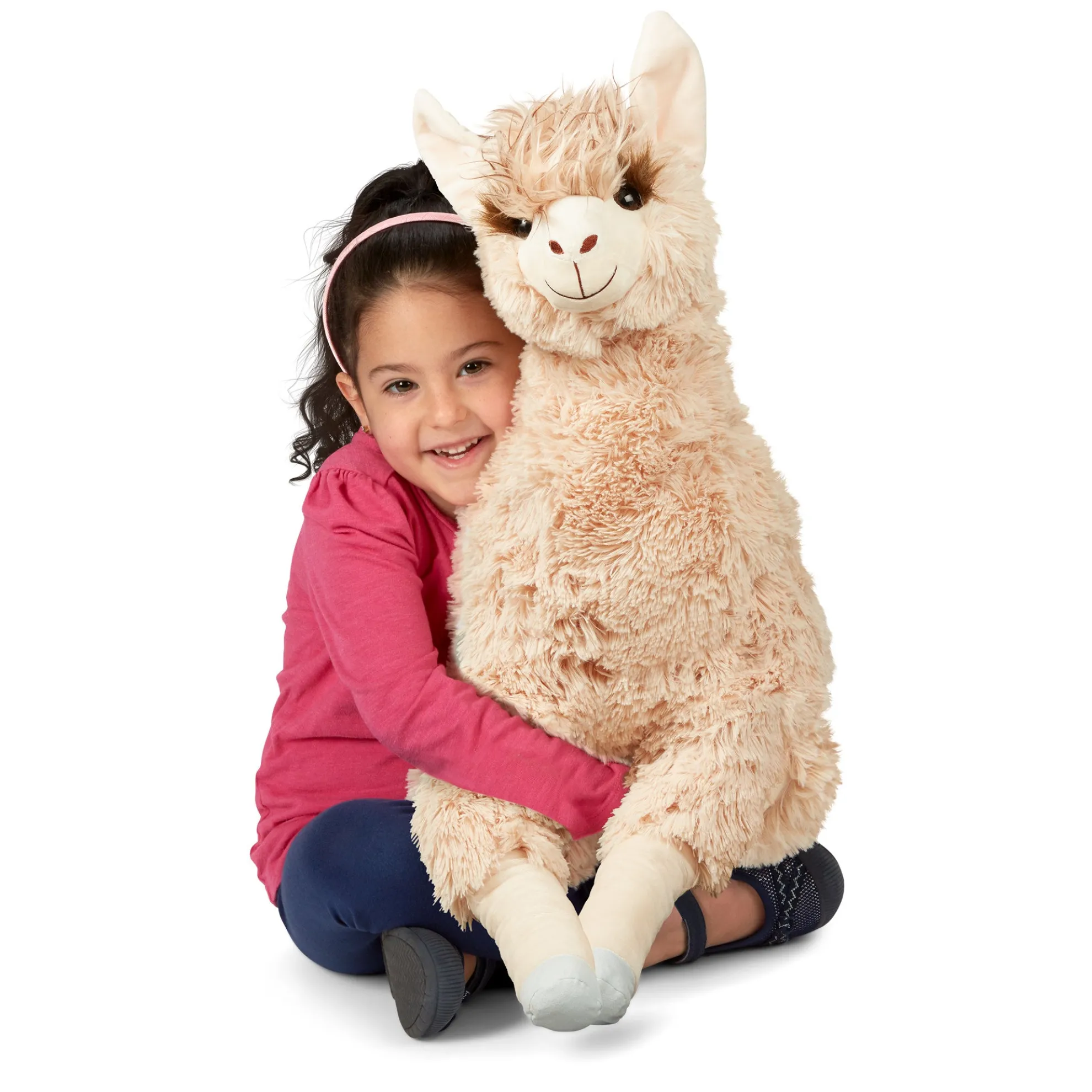 The fluffy, floppy Jumbo Llama offers a lifetime of llama love! Long, extra-soft fur and squishy fill make this llama perfect for petting and hugging. Durably made from top-quality materials, it will last through years of cuddles. The silky beige-colored llama sits up proudly with legs outstretched—it’s approximately 26 inches from its belly to the top of its tufted-topped head, and about 42 inches from nose to the end of its outstretched back legs. With perky pink ears, long, silky eyelashes, a fluffy mop on top, and a sweet expression, this llama is ideal for kids’ rooms, from nurseries to college dorms!