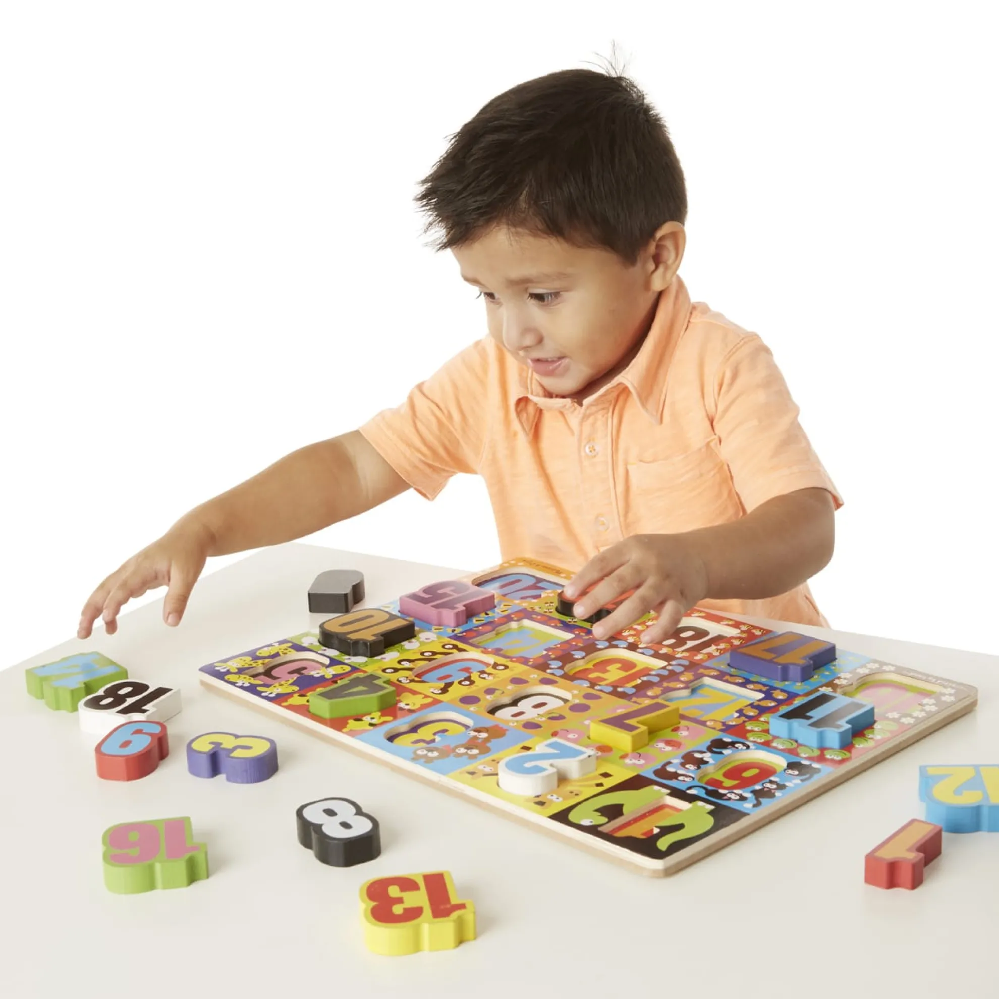 Counting fun begins with this extra thick wooden puzzle that includes 20 easy-grasp, chunky pieces (1-20). A full-color, matching number appears under each piece, and counting pictures equal to each numbered piece are shown on the puzzle board. Number pieces stand up. Encourages hand-eye, fine motor and early math skills.