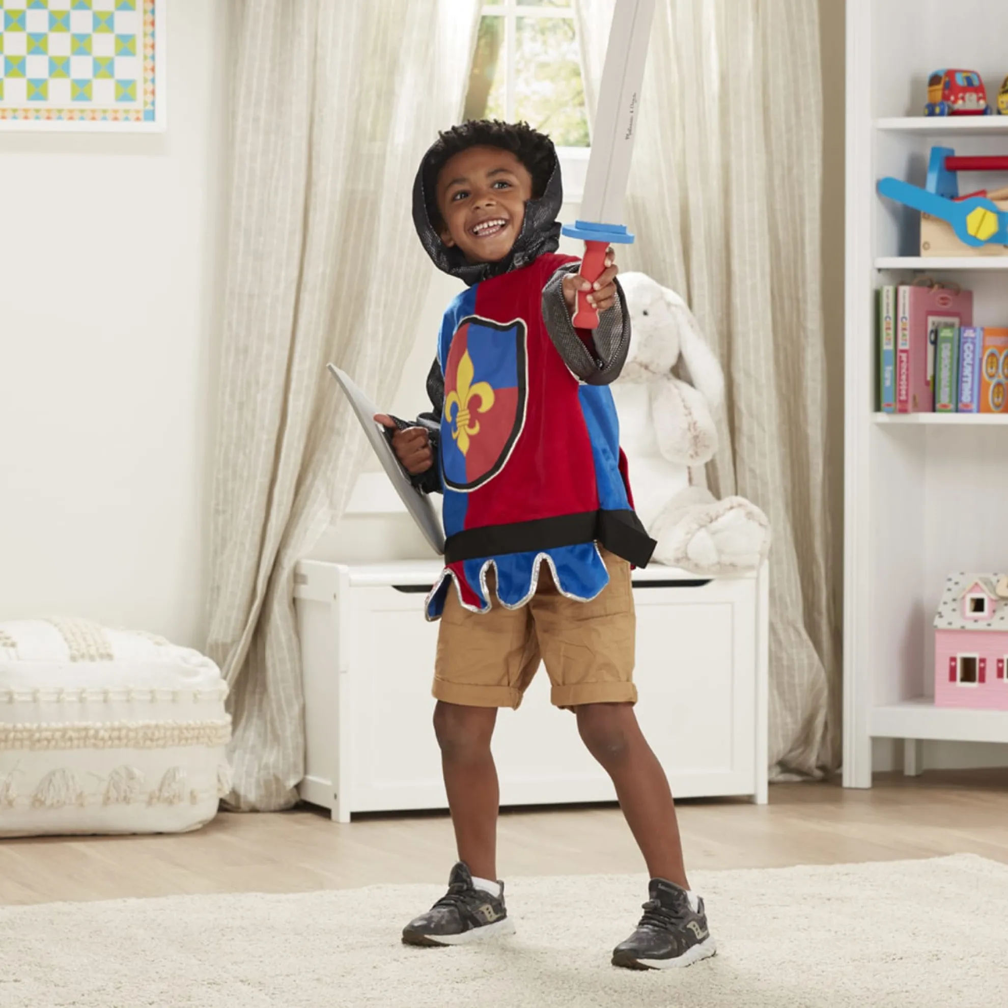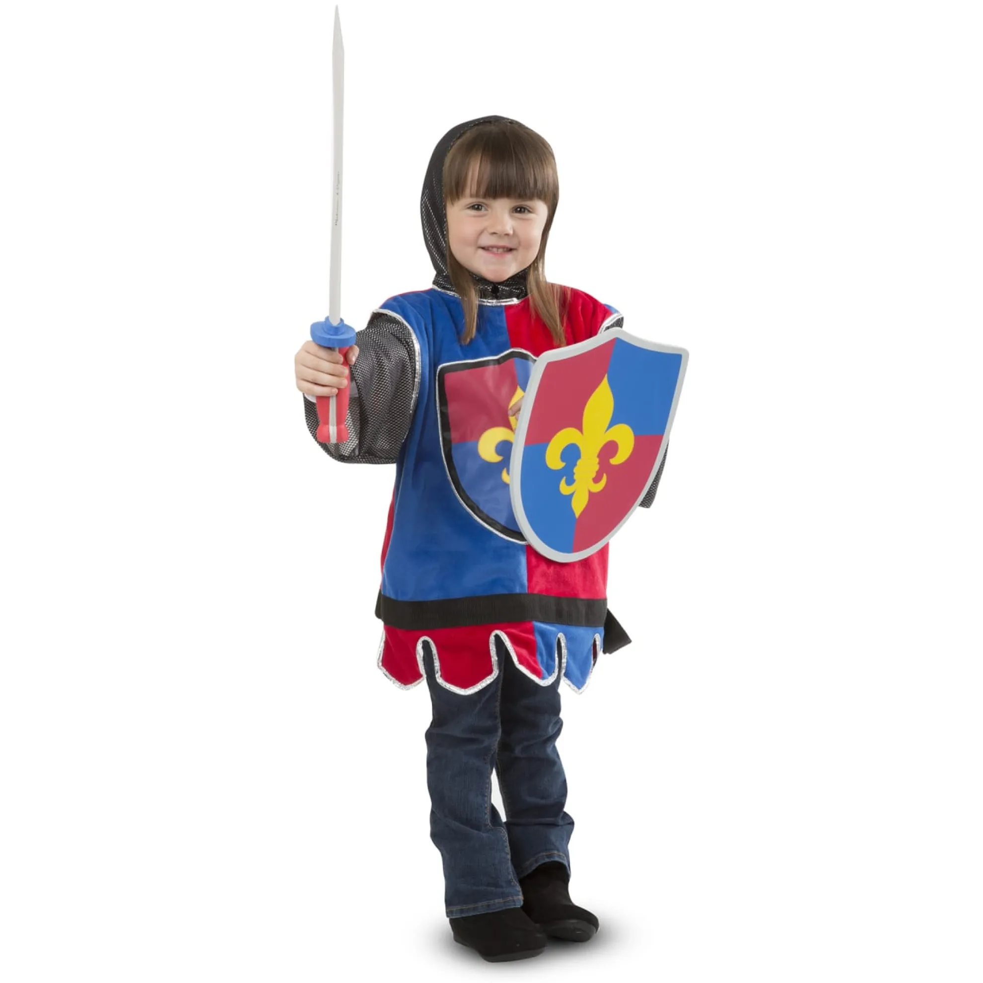 Young noble ones can imagine all kinds of heroic adventures with this Melissa & Doug Knight role play costume. The outfit includes an embroidered felt tunic with felt closures for a comfortable fit, a “chain link” fabric hood and sleeves, and a durable soft sword and shield — perfect for slaying those dragons. The role play outfit is sized to fit boys and girls ages three to six. The high-quality fabrics and solid construction ensure durability so your kids can wear it over and over again. The tunic can be machine washed, and it comes with accessories that can easily be wiped clean. With authentic medieval details, these role-play accessories encourage lots of exciting pretend play for noble young ones! The costume set helps promote narrative thinking and creative expression, along with independent and cooperative play. It makes a great gift for kids ages three to six for hands-on, screen-free play.