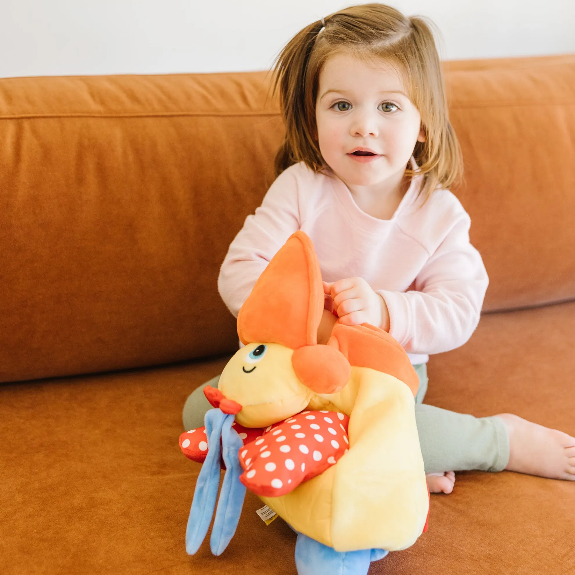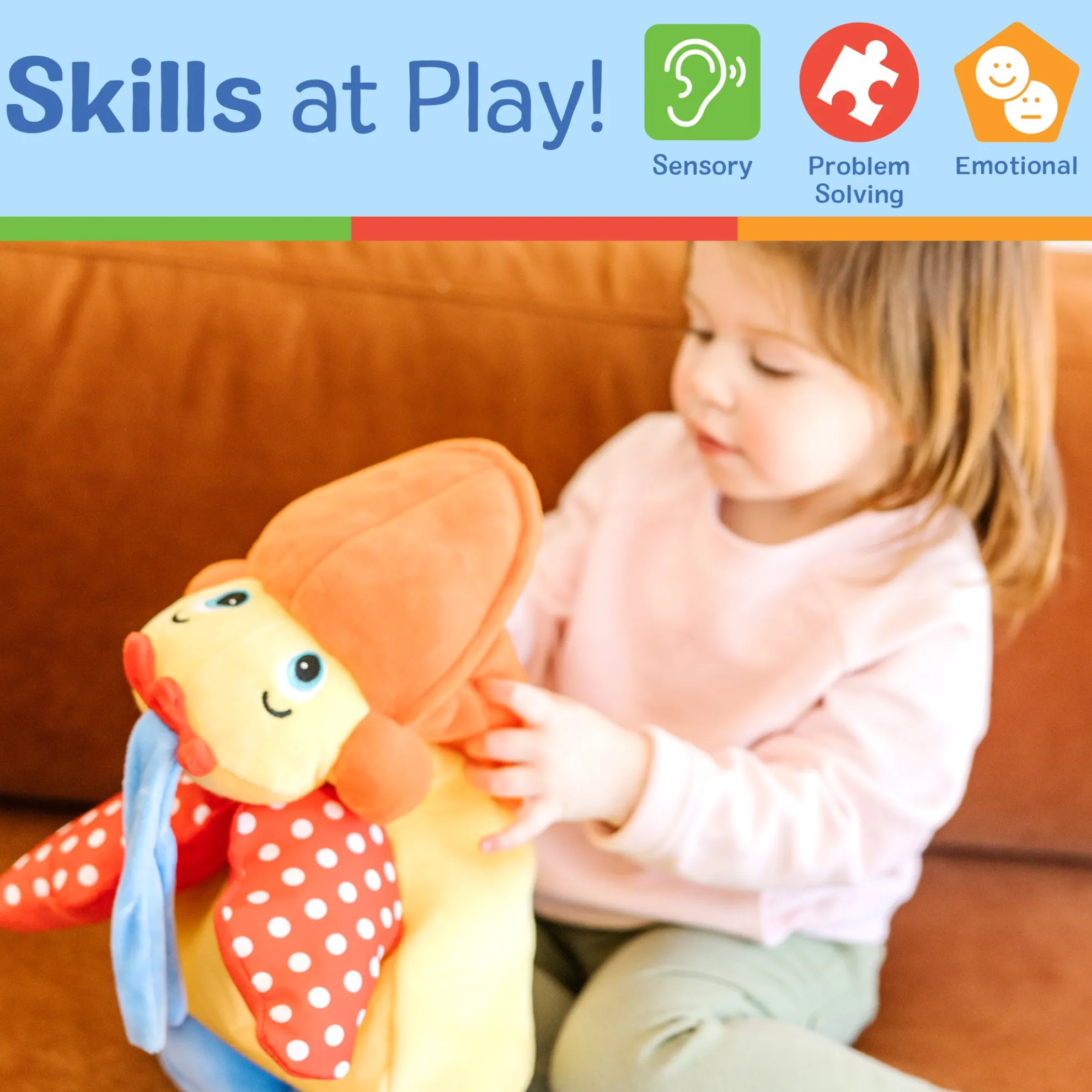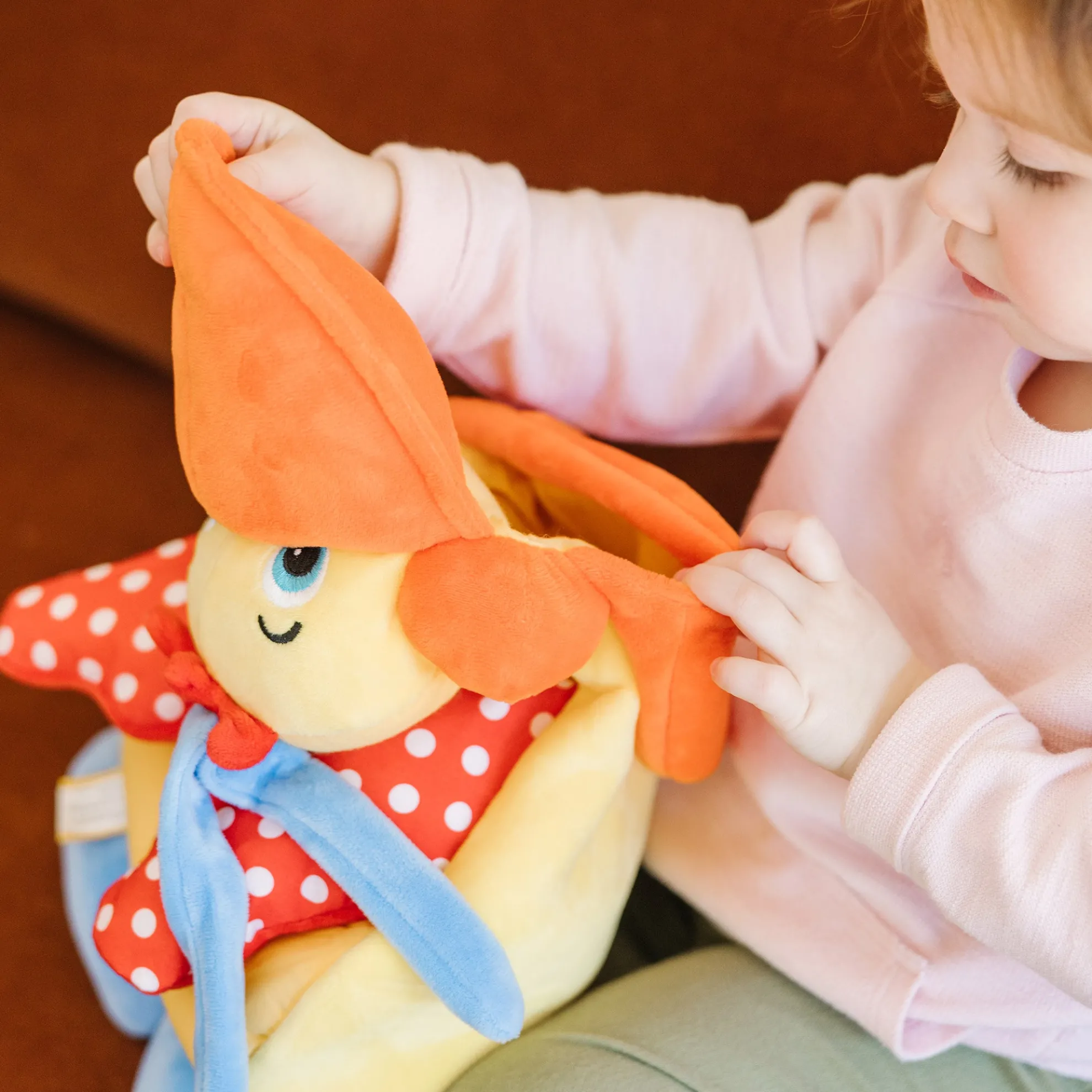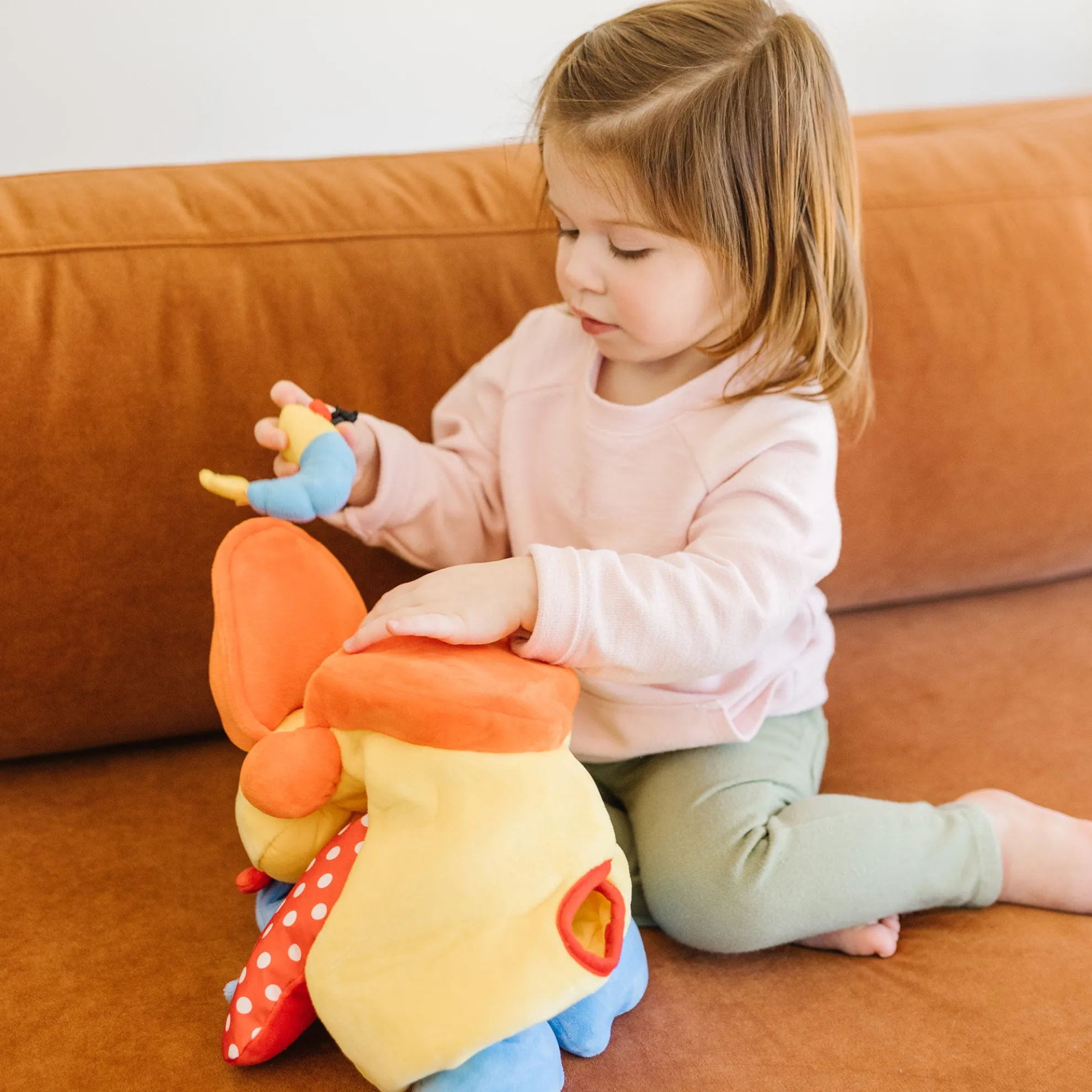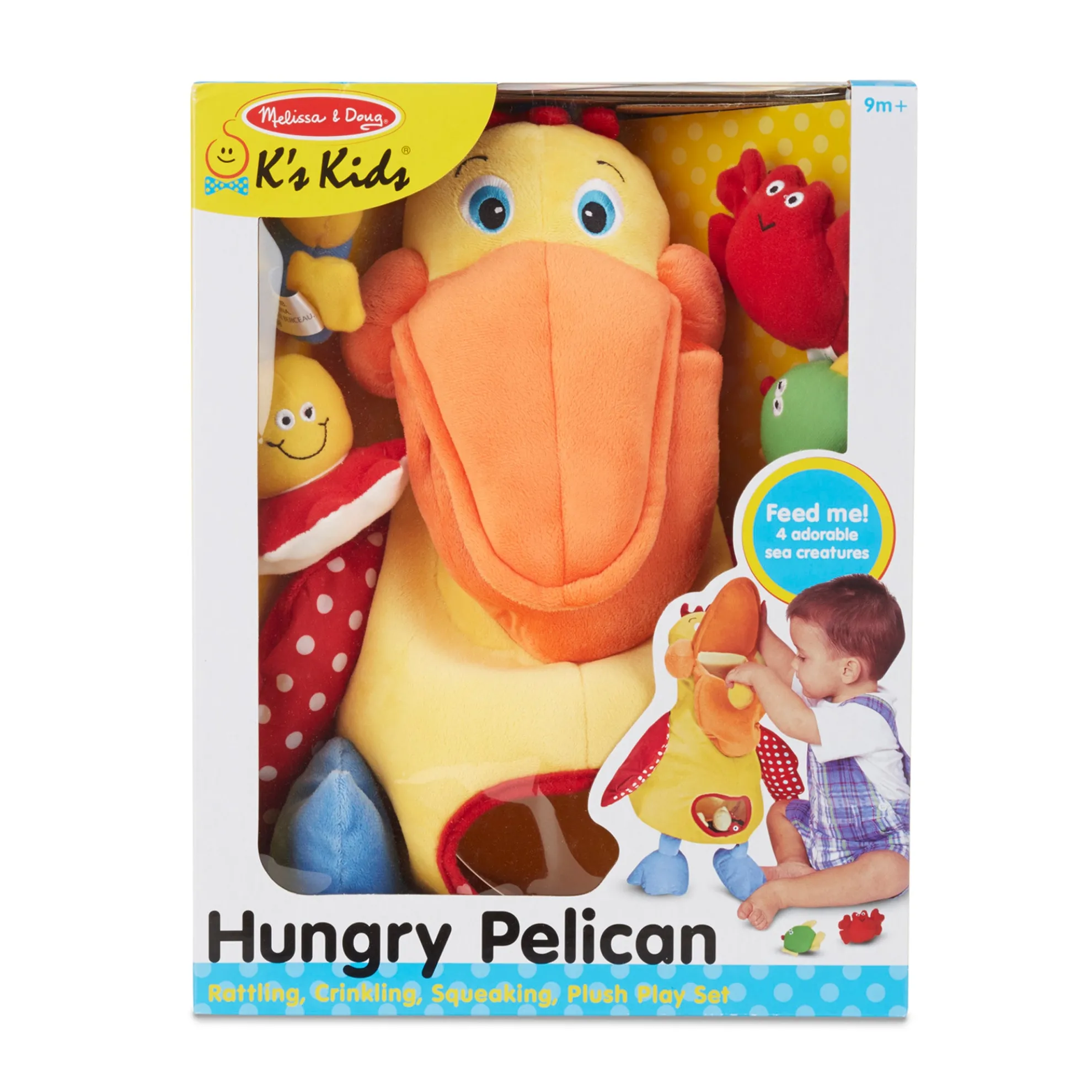 This cuddly plush pelican has an empty belly . . . and a big appetite for fun! Young children can open the pelican’s big bill (which squeaks when squeezed!) to drop four mini plush animals into his open mouth. Then the crinkly shrimp, squeaking octopus, and rattling fish and crab drop right into the bird’s big belly! A peek-in, reach-in window on the pelican’s front lets kids spot them easily and pull them out to try it all again. The repetitive activity is great for babies and toddlers working on motor skills and other early developmental skills. And thanks to an incredible array of fun-to-explore features–from chubby, squeak-able cheeks to crinkly wings to floppy, rattling feet–it never gets old!
