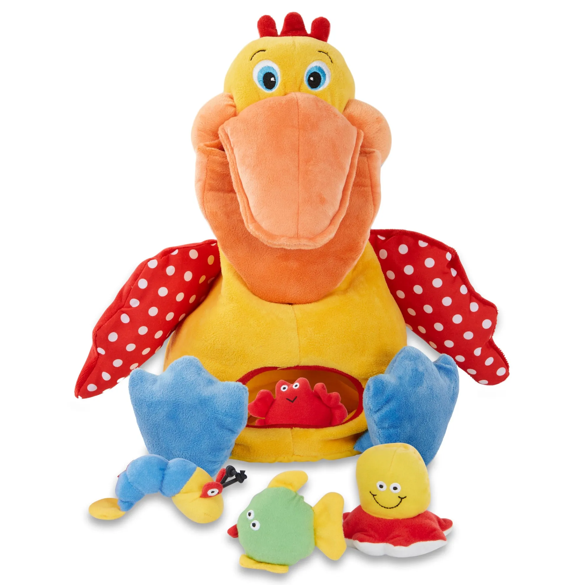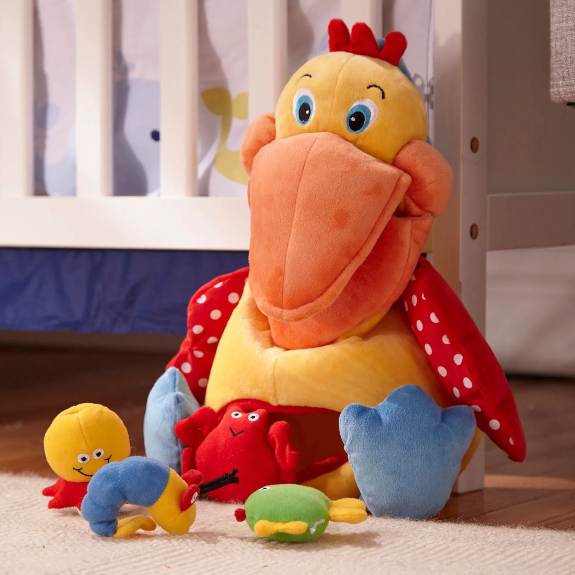 - Cuddly plush pelican toy to feed with plush sea creatures again and again