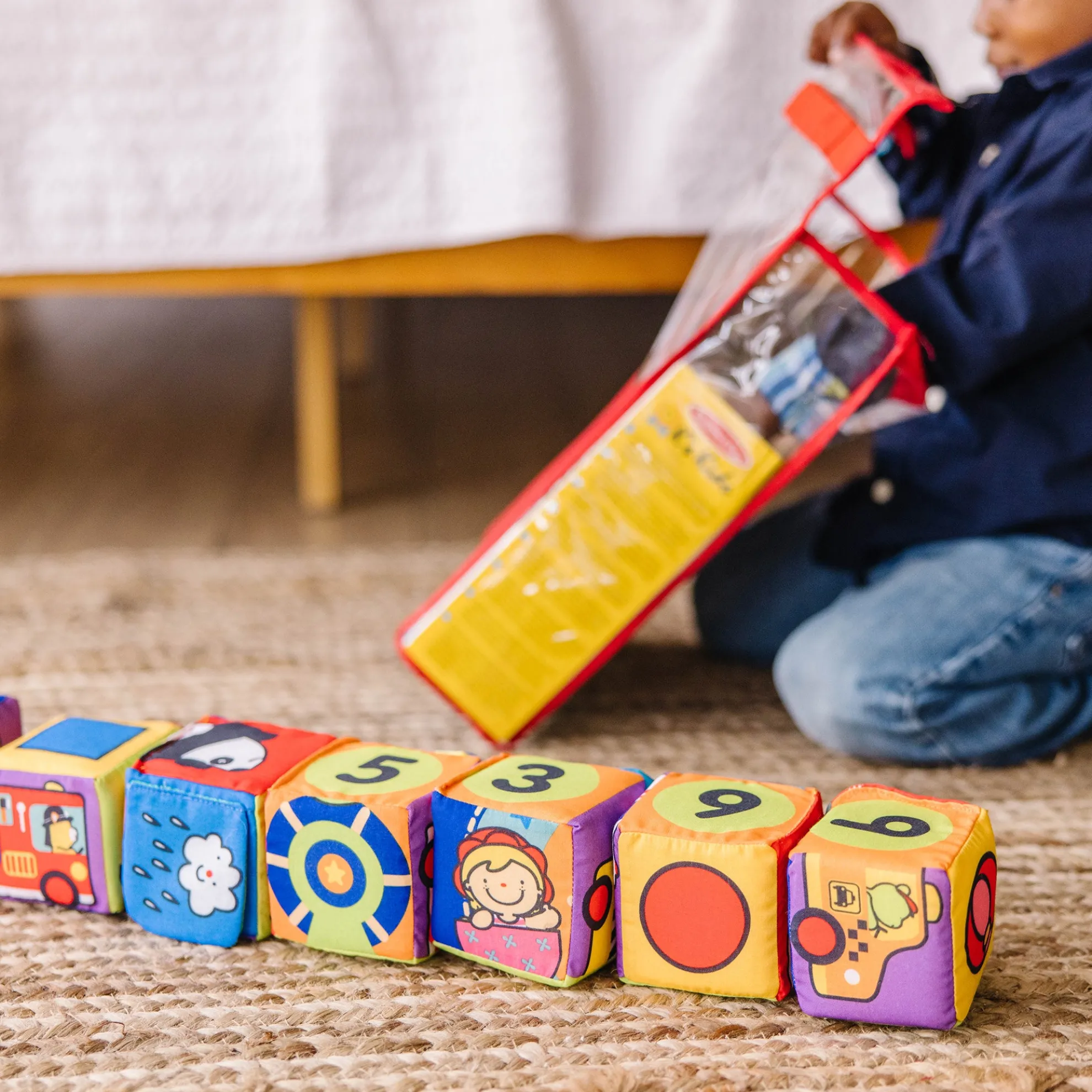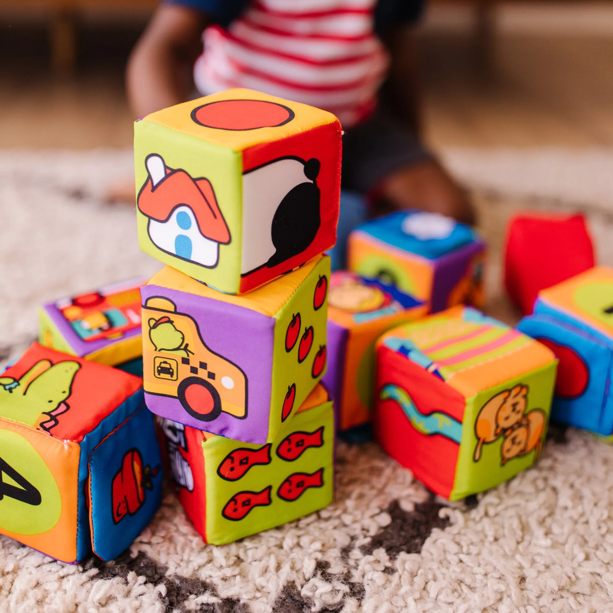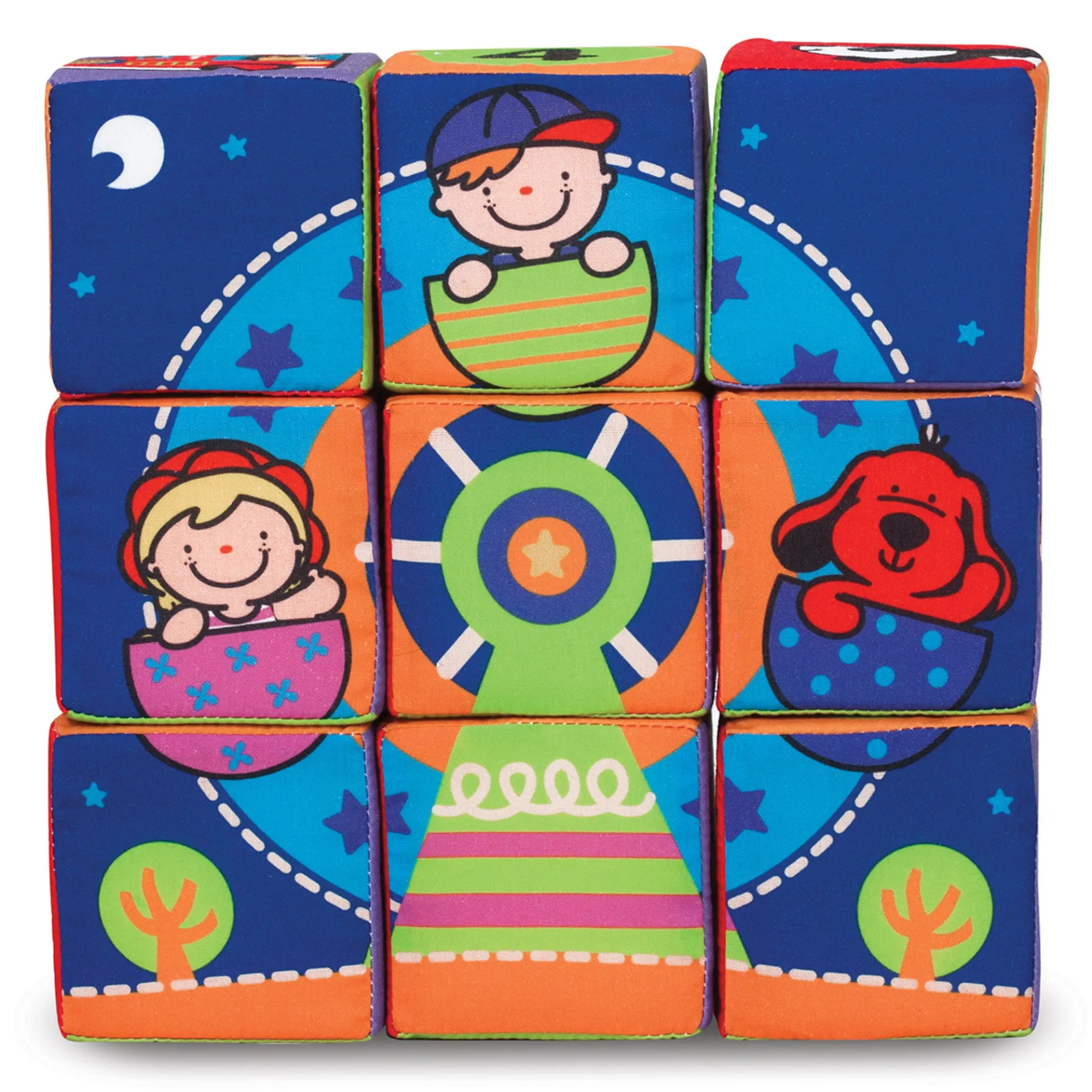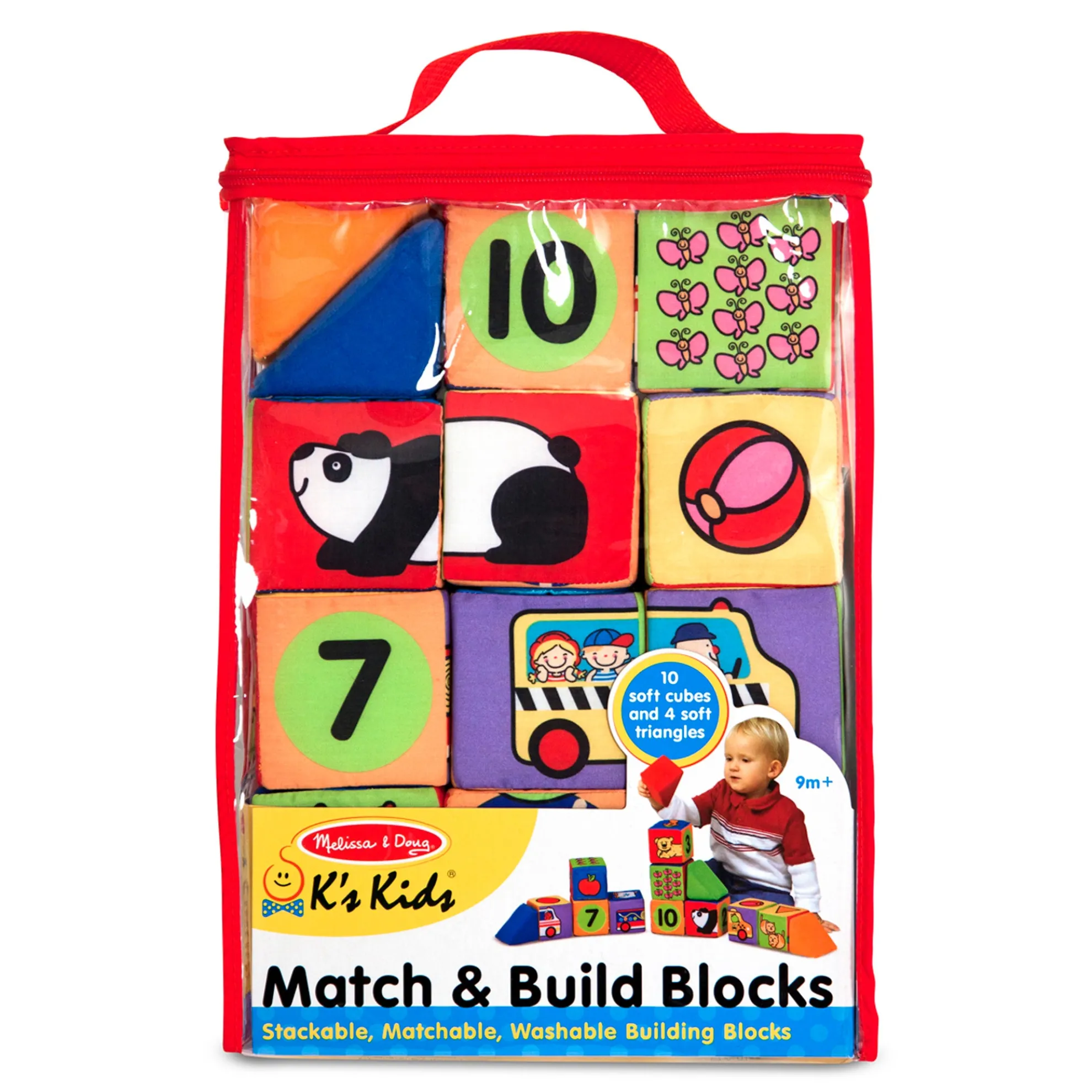 Build them up and knock them down–14 soft blocks combine in endless creative combinations . . . and topple with a gentle bounce that makes them safest for little ones. Match & Build Blocks can build much more than towers, too: This colorful soft-block set helps develop motor skills, logical connections, creativity, and more, so it grows along with a child, helping build key developmental skills along the way. Kid-friendly artwork on the coordinating cubes encourages matching activities (numerals with quantities, animal heads and tails, and everyday shapes), puzzling (complete the picture of a Ferris wheel!), and even sequential thinking and storytelling with before-and-after flaps on three of the blocks. With unlimited open-ended opportunities for learning and play, kids can also create their own sorting games and creative combinations–and of course, the 14 soft blocks make a terrific tower, castle, boat, or rocket ship! Melissa & Doug K’s Kids toys nurture early childhood development in three key skill areas: physical, cognitive, and social. With interactive designs and multisensory features, K’s Kids promotes constructive play and effortless learning, keeping interest high and new skills flourishing throughout the baby and toddler years!