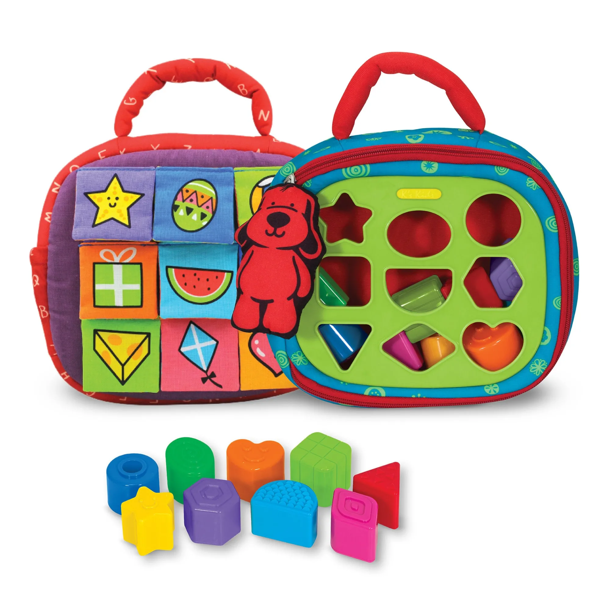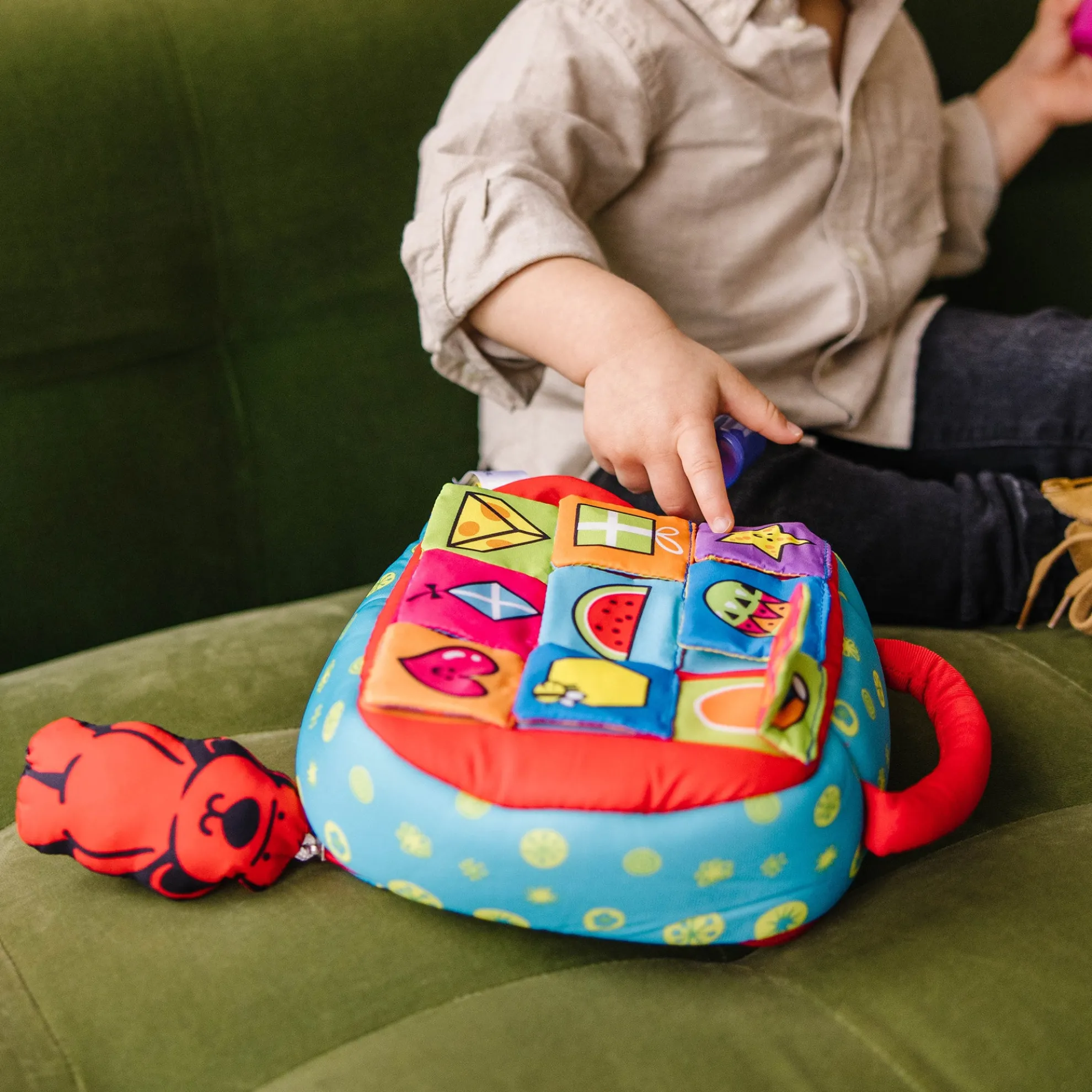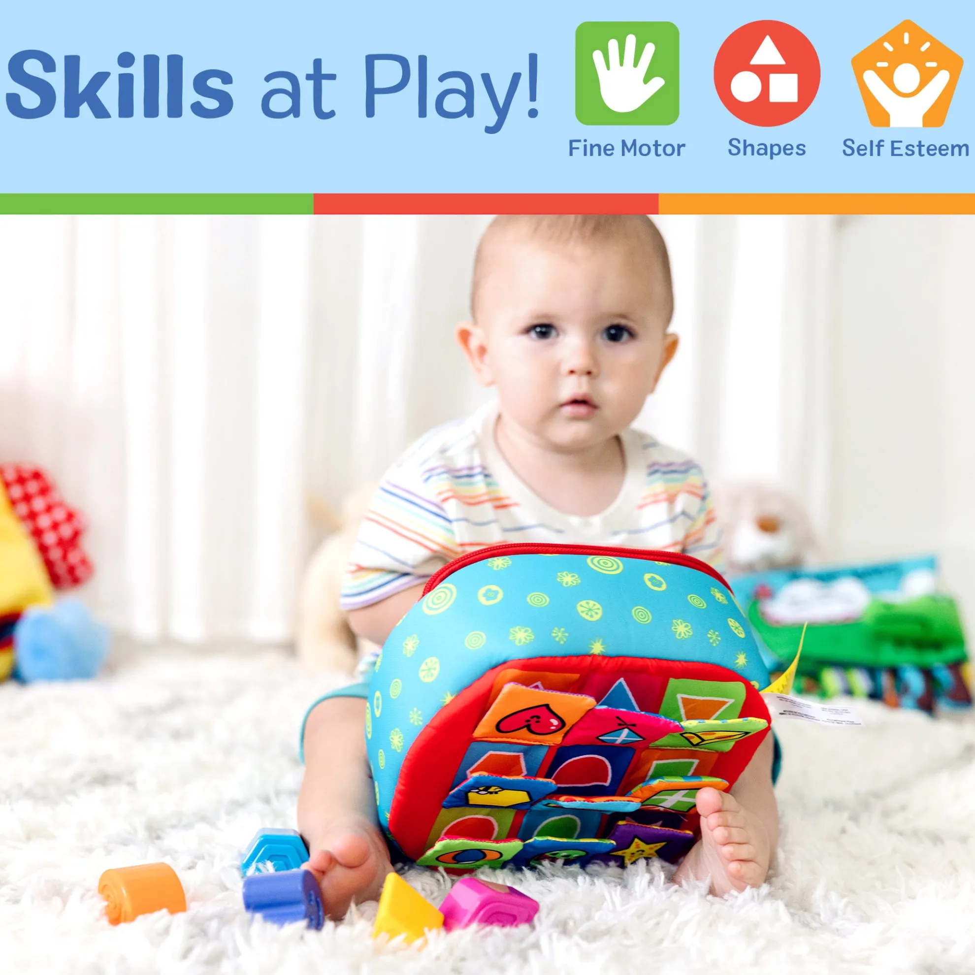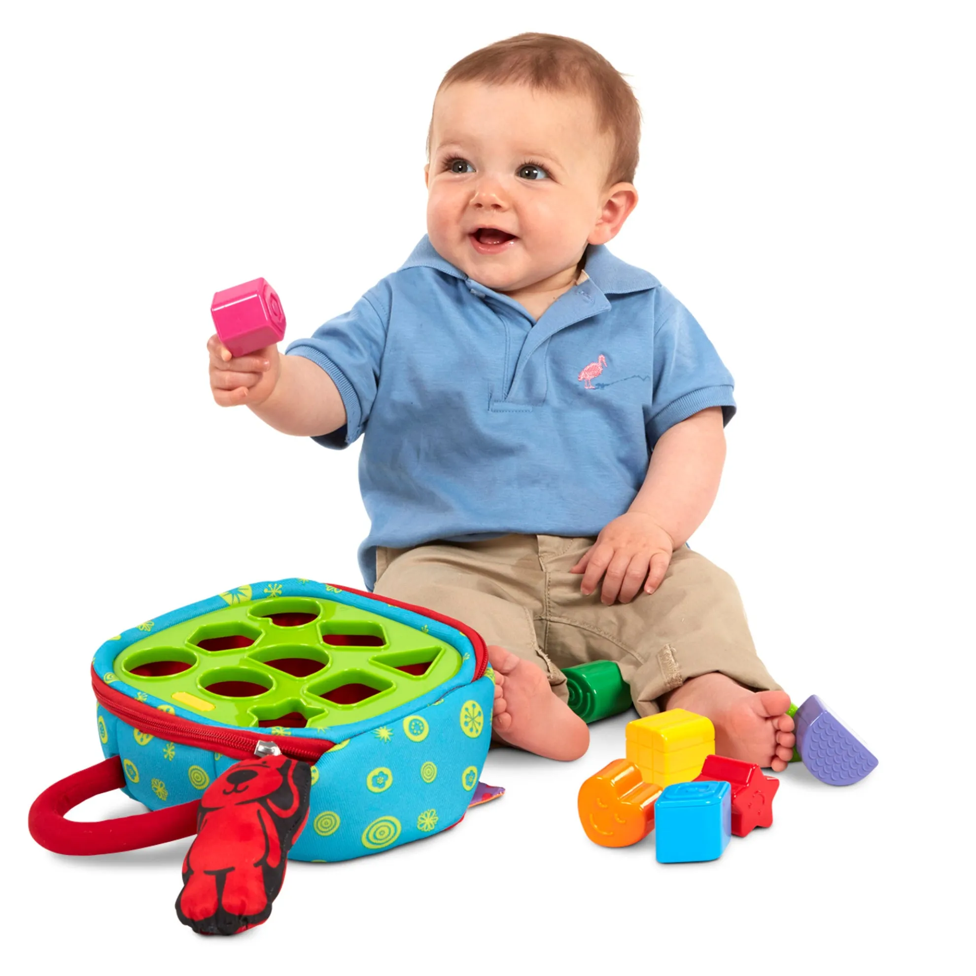More than a shape sorter–this is an on-the-go activity center! Using nine plastic shapes and the padded carrying case, children can lift crinkly flaps, identify the pictures, match the shapes, and drop the textured blocks through the sorter . . . then pull the plush dog around the edge to unzip the case and start it all again! The baby- and toddler-friendly games and learning activities are great for enjoying together or for independent play, and are sure to keep little ones giggling while they learn. The easy-to-grasp padded handle makes it easy to carry the whole set from place to place–even for crawlers, scooters, and emerging walkers.