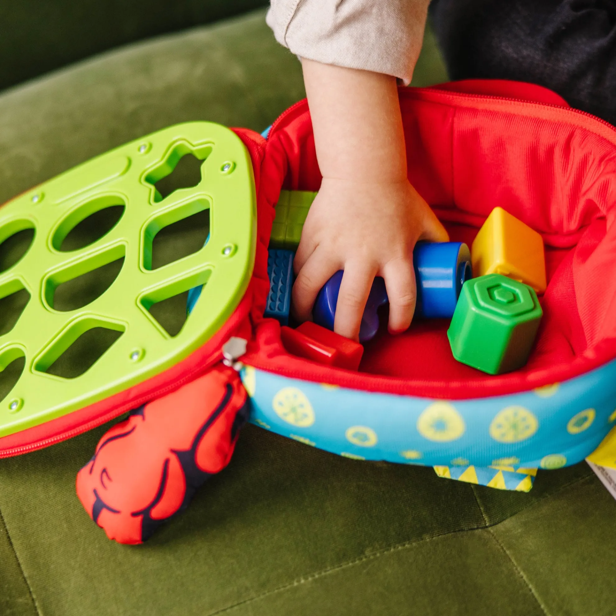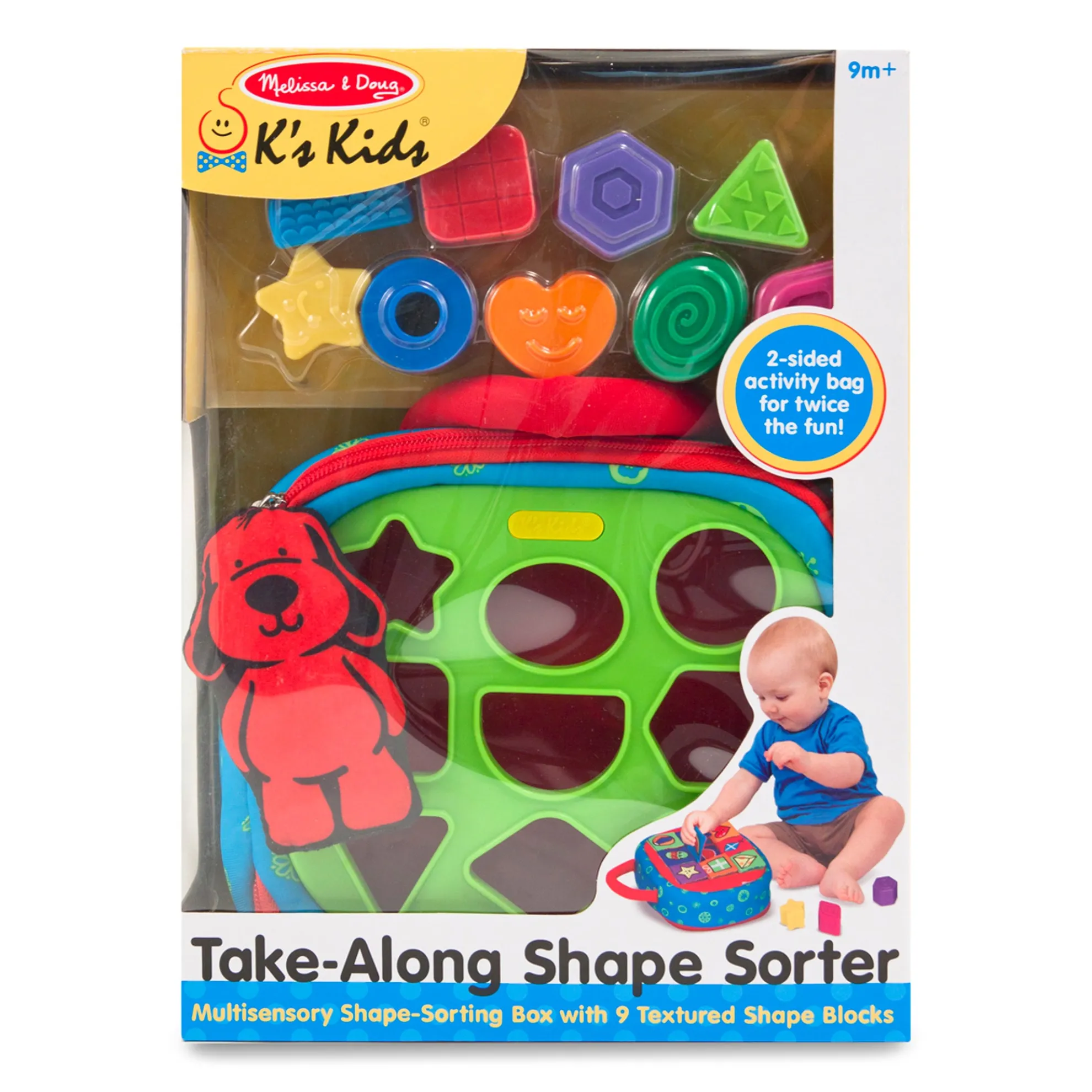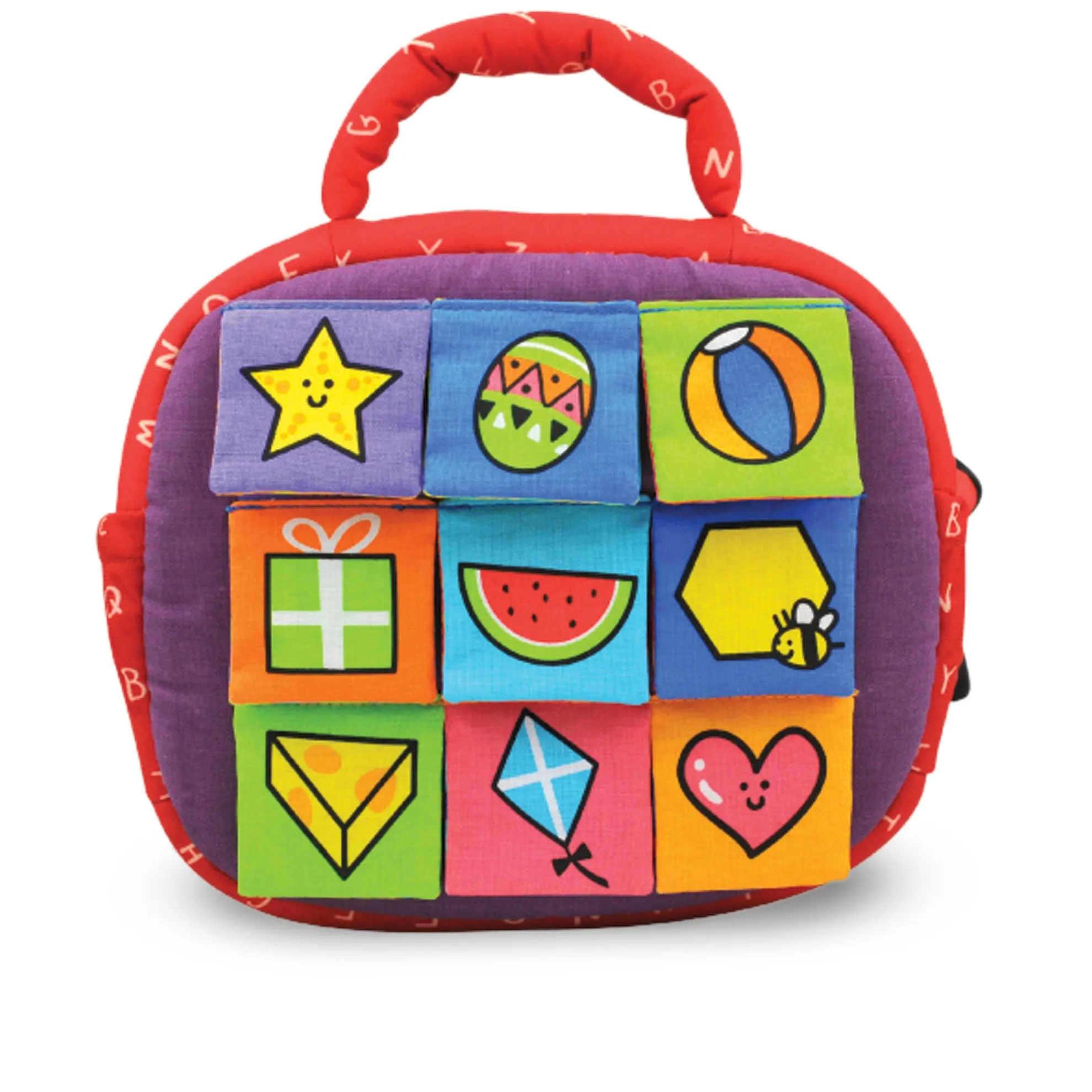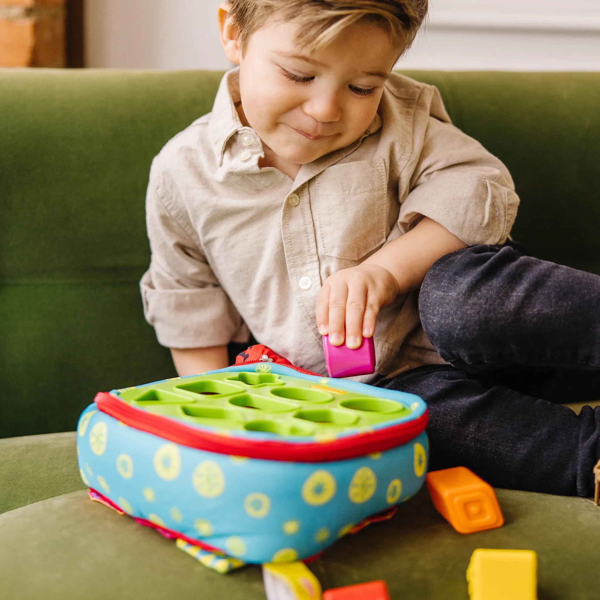 More than a shape sorter–this is an on-the-go activity center! Using nine plastic shapes and the padded carrying case, children can lift crinkly flaps, identify the pictures, match the shapes, and drop the textured blocks through the sorter . . . then pull the plush dog around the edge to unzip the case and start it all again! The baby- and toddler-friendly games and learning activities are great for enjoying together or for independent play, and are sure to keep little ones giggling while they learn. The easy-to-grasp padded handle makes it easy to carry the whole set from place to place–even for crawlers, scooters, and emerging walkers.
