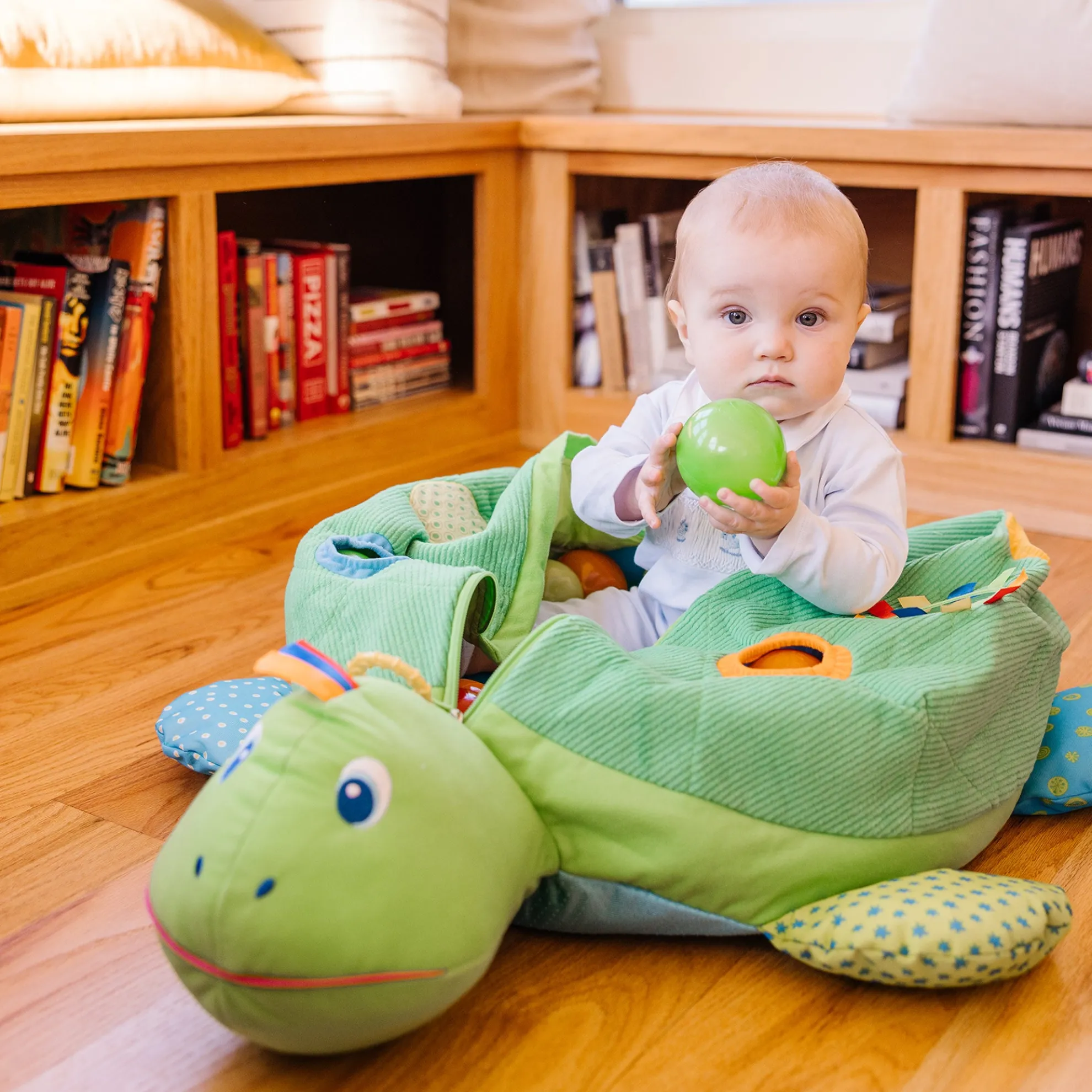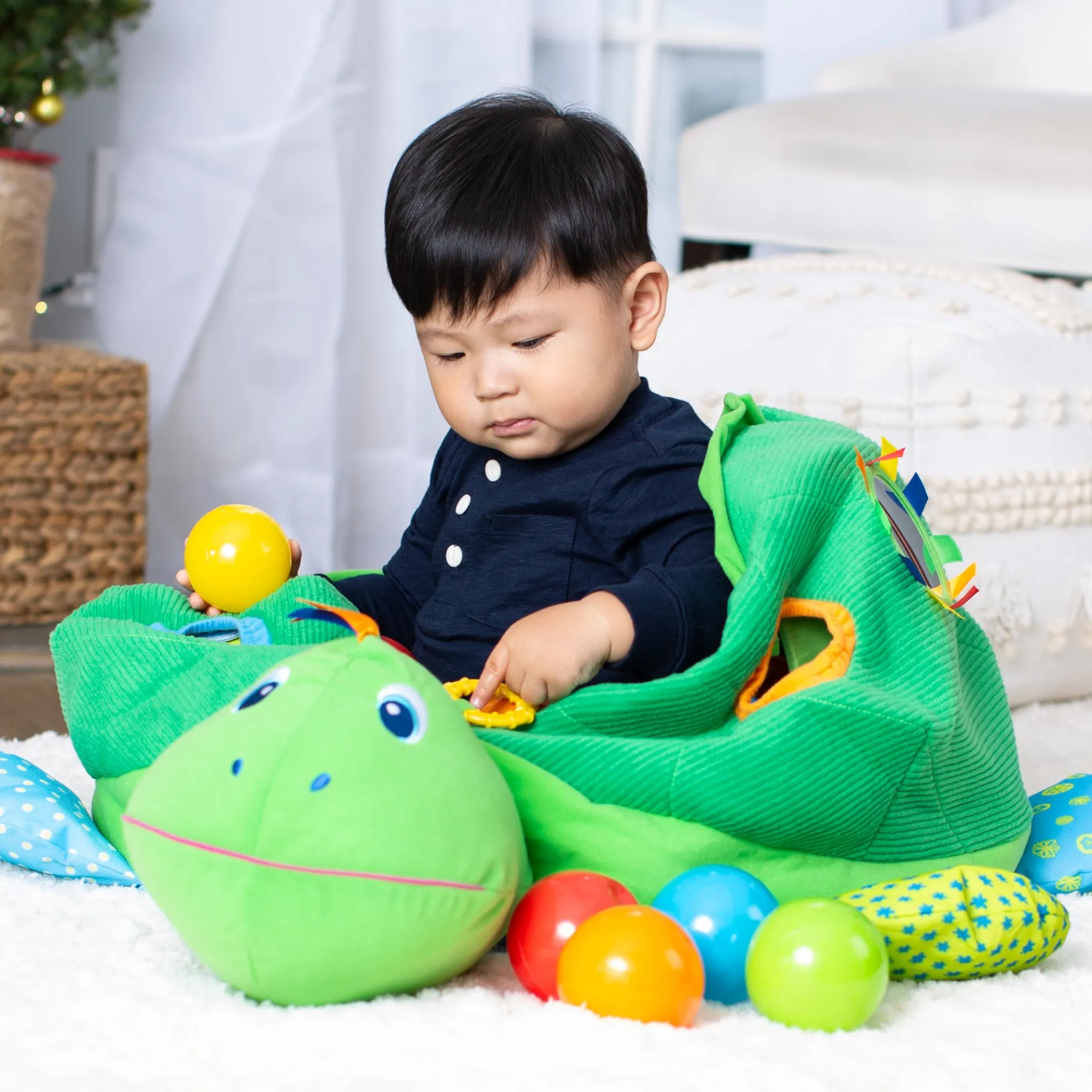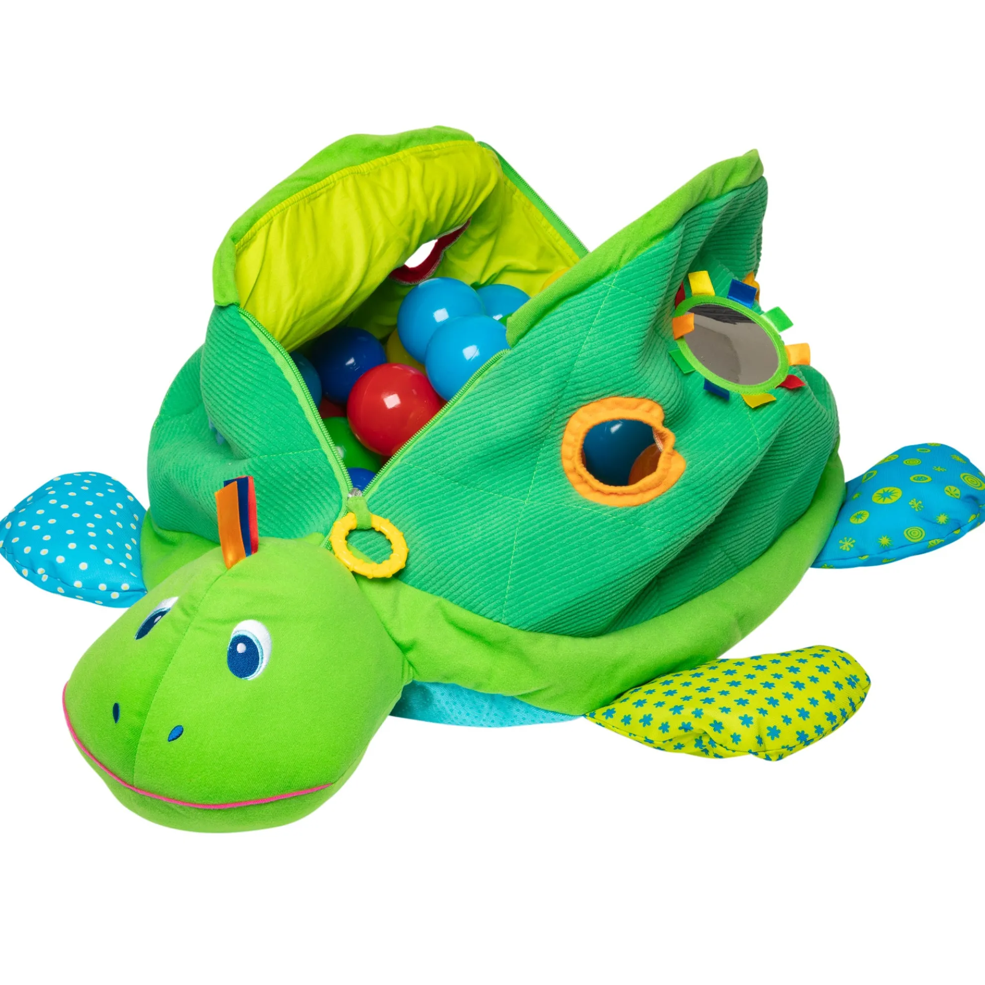 Kids will have a ball with this crinkling, jingling, multi-textured toy! The giant, friendly turtle comes filled with 60 squeezable multi-colored balls that are easy to grasp, toss, and roll. Zipper and self-stick tabs open so baby can sit inside, and close to store balls and to make a fun pillow. Features include holes to push and pull balls through, a non-slip bottom, crinkling feet, squeaking button, textured ring, mirror, silky fabric tags, and attached soft ball rattle.