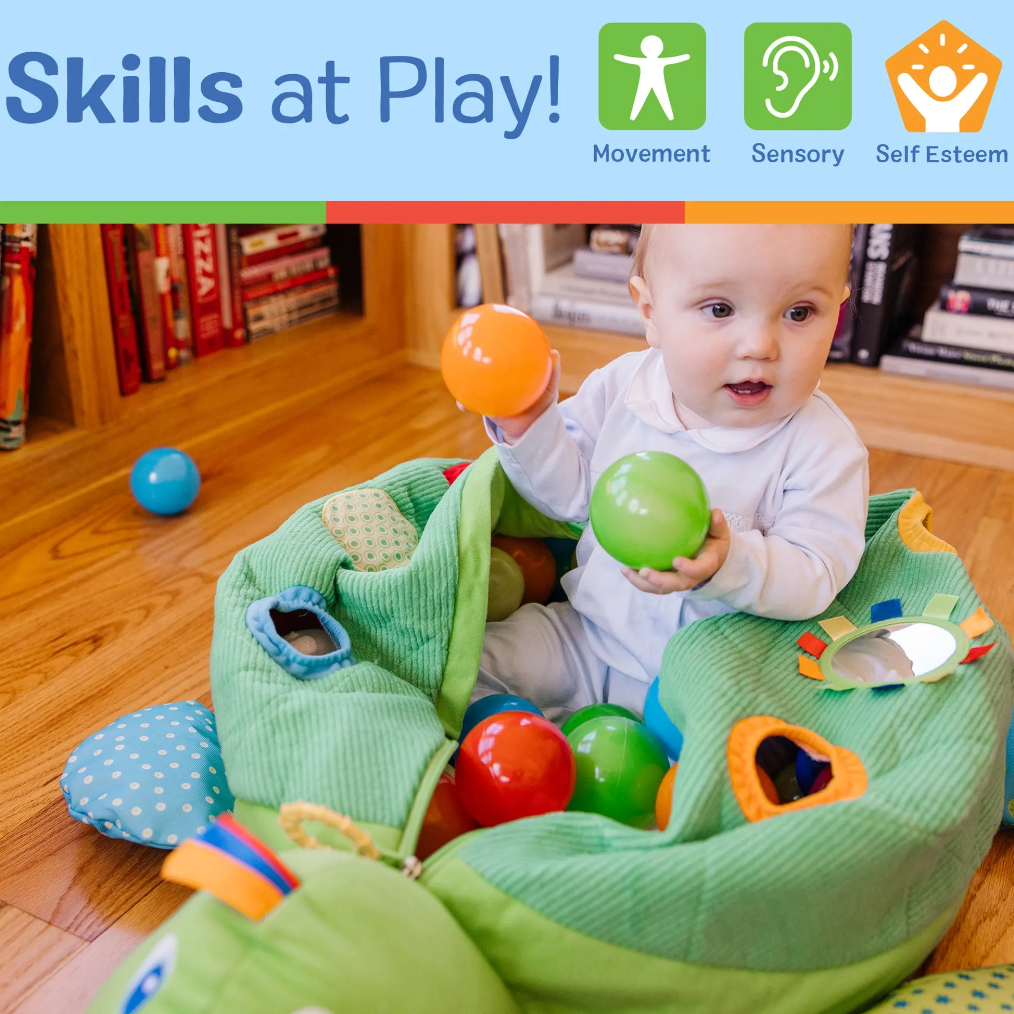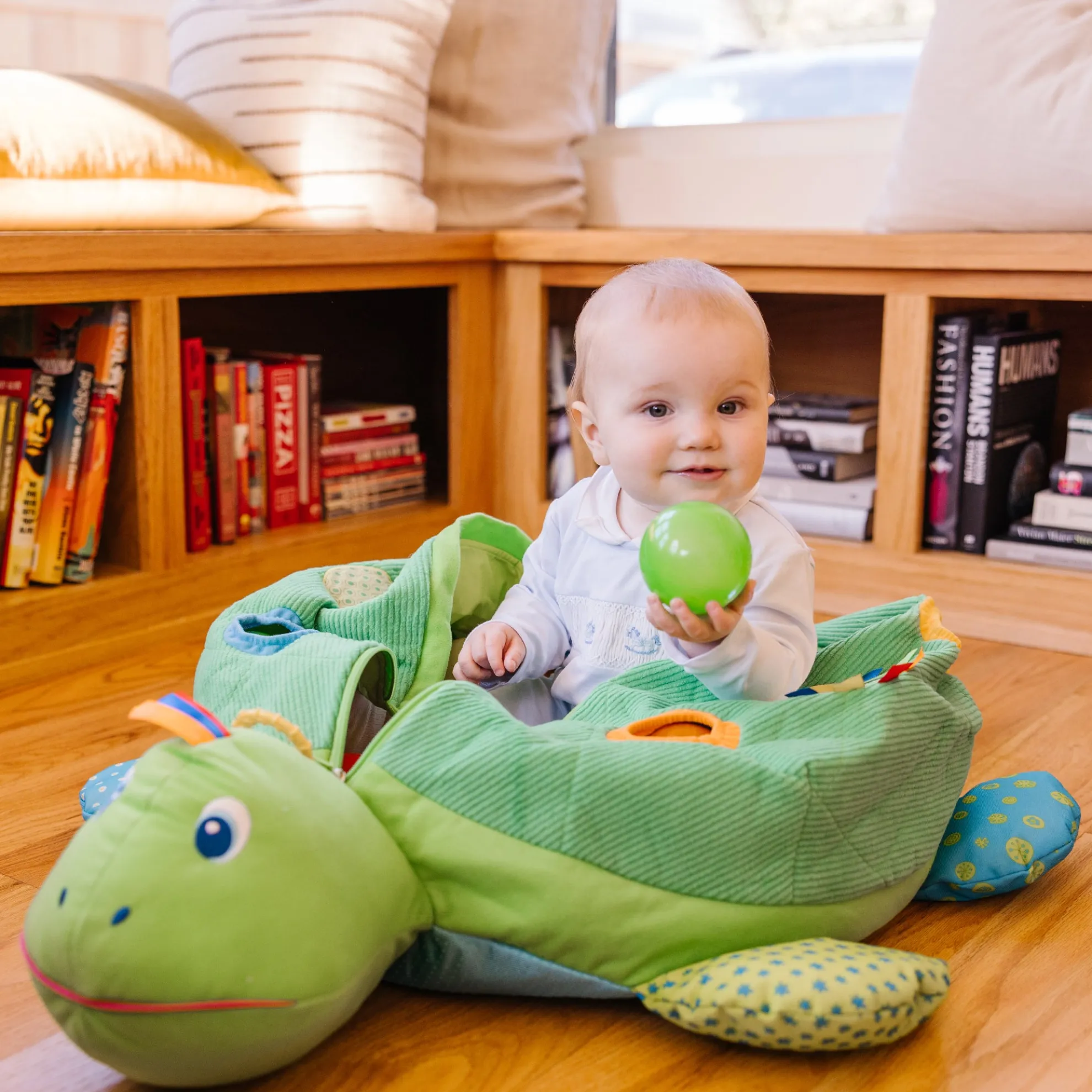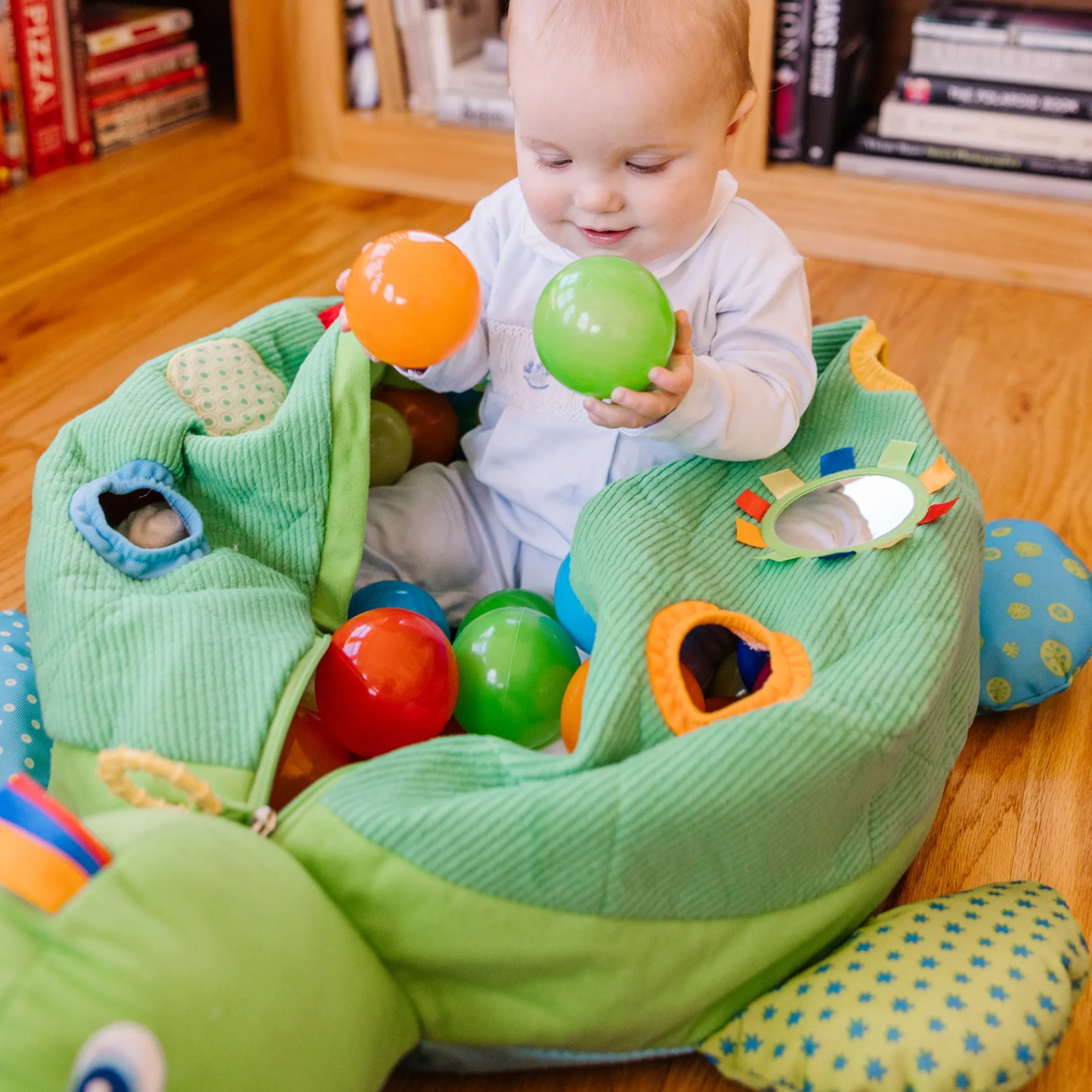 Kids will have a ball with this crinkling, jingling, multi-textured toy! The giant, friendly turtle comes filled with 60 squeezable multi-colored balls that are easy to grasp, toss, and roll. Zipper and self-stick tabs open so baby can sit inside, and close to store balls and to make a fun pillow. Features include holes to push and pull balls through, a non-slip bottom, crinkling feet, squeaking button, textured ring, mirror, silky fabric tags, and attached soft ball rattle.