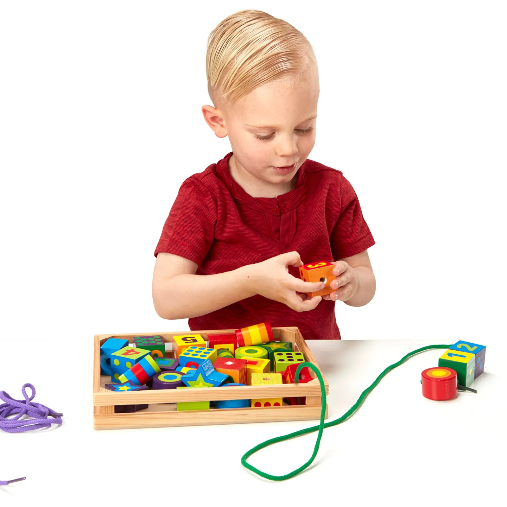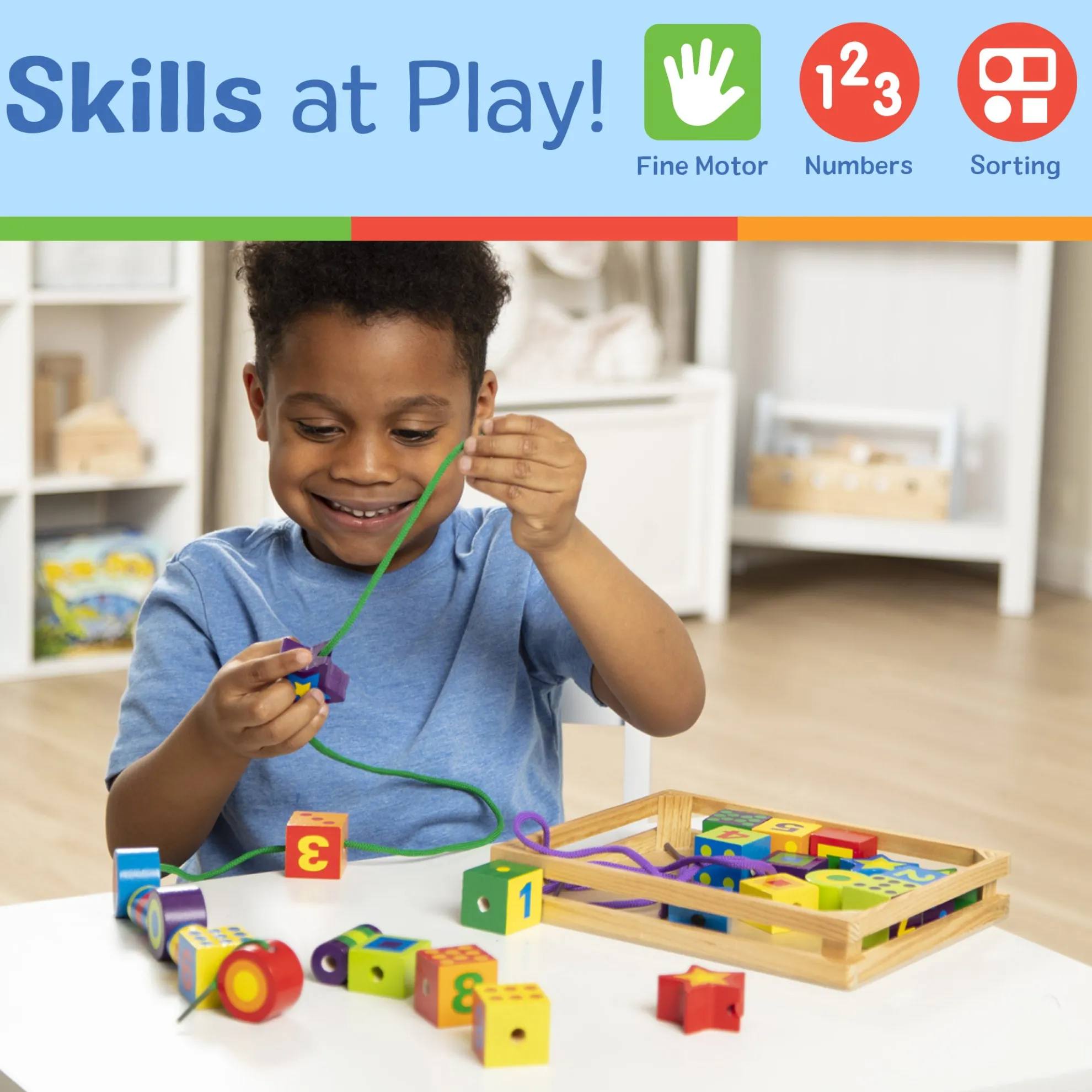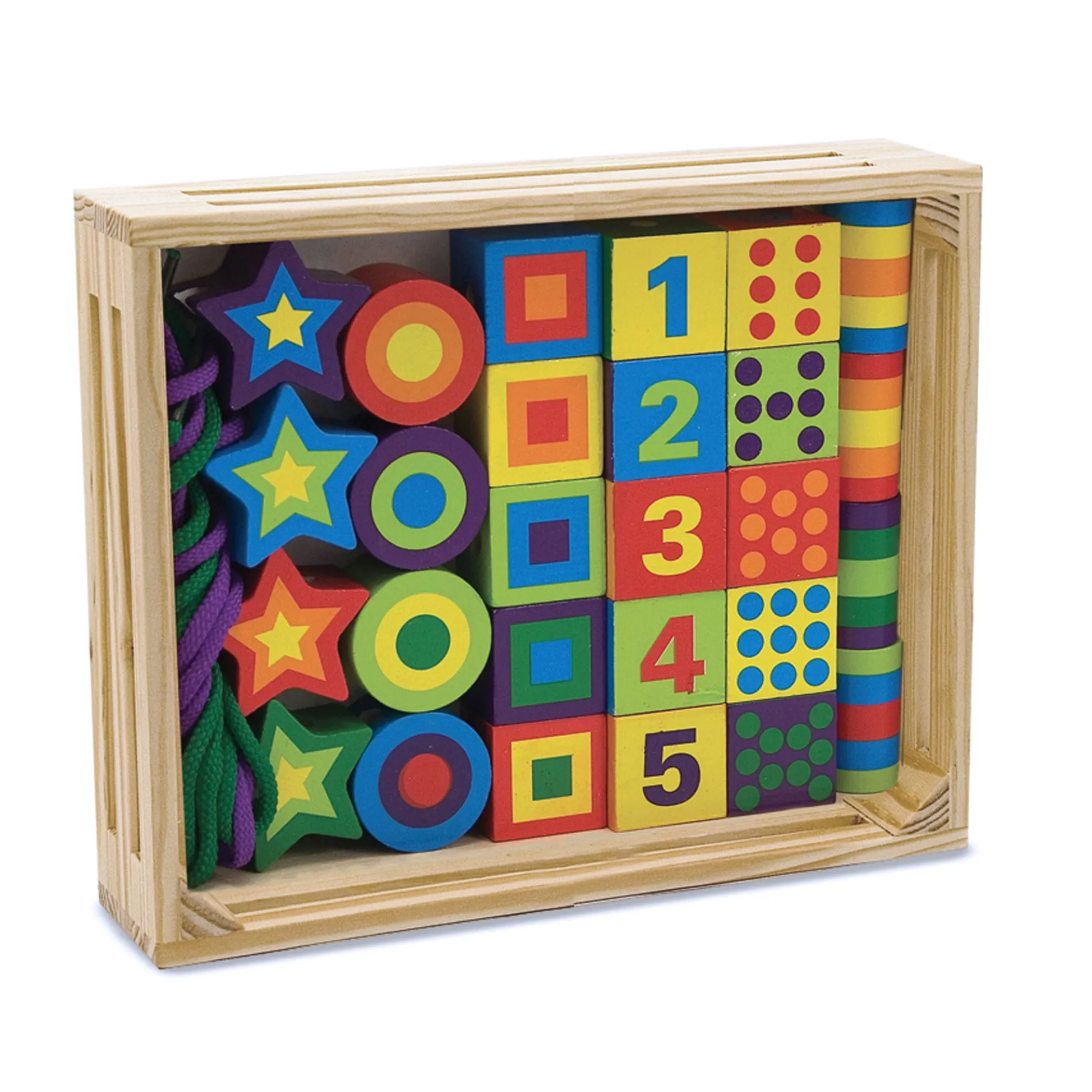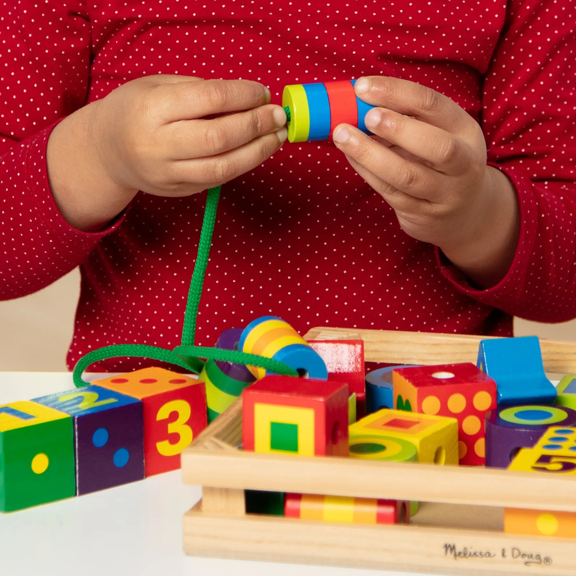 You can count on the Melissa & Doug Lacing Beads set to make a bold statement! The dramatic beads feature a variety of shapes, bold colors, and two extra-long laces, making stringing beads extra special. The shapes are designed for little hands to grasp, and the laces are thin enough to allow the beads to slide easily. Twenty-seven hand-painted wooden beads feature the numbers one to ten as numerals, and as countable dots to add counting fun to this lacing activity. It lets kids practice counting, shape recognition, hand-eye coordination, fine-motor skills, and creative expression. The set allows adults and children to explore multiple playing activities together. Parents or grown-up kids can ask the child to sort the beads by color, identify each color for the child, and repeat the activity until the child can identify all the colors independently. Parents can also encourage beginning counting skills by asking the child to count the number of beads of each color with them and repeat the activity until the child has mastered counting one group of beads. The set is an exceptional gift for kids ages three and older for hands-on, screen-free play.