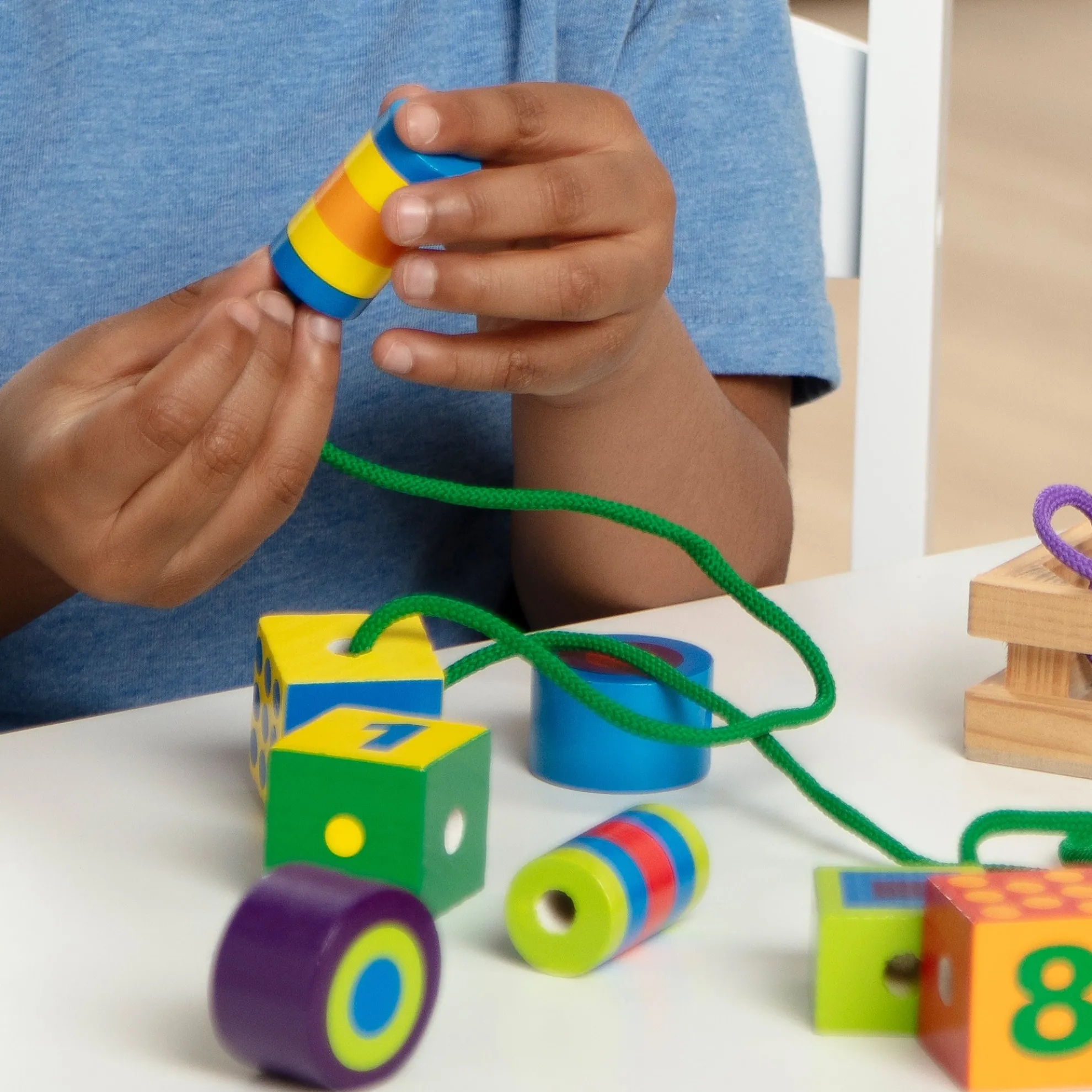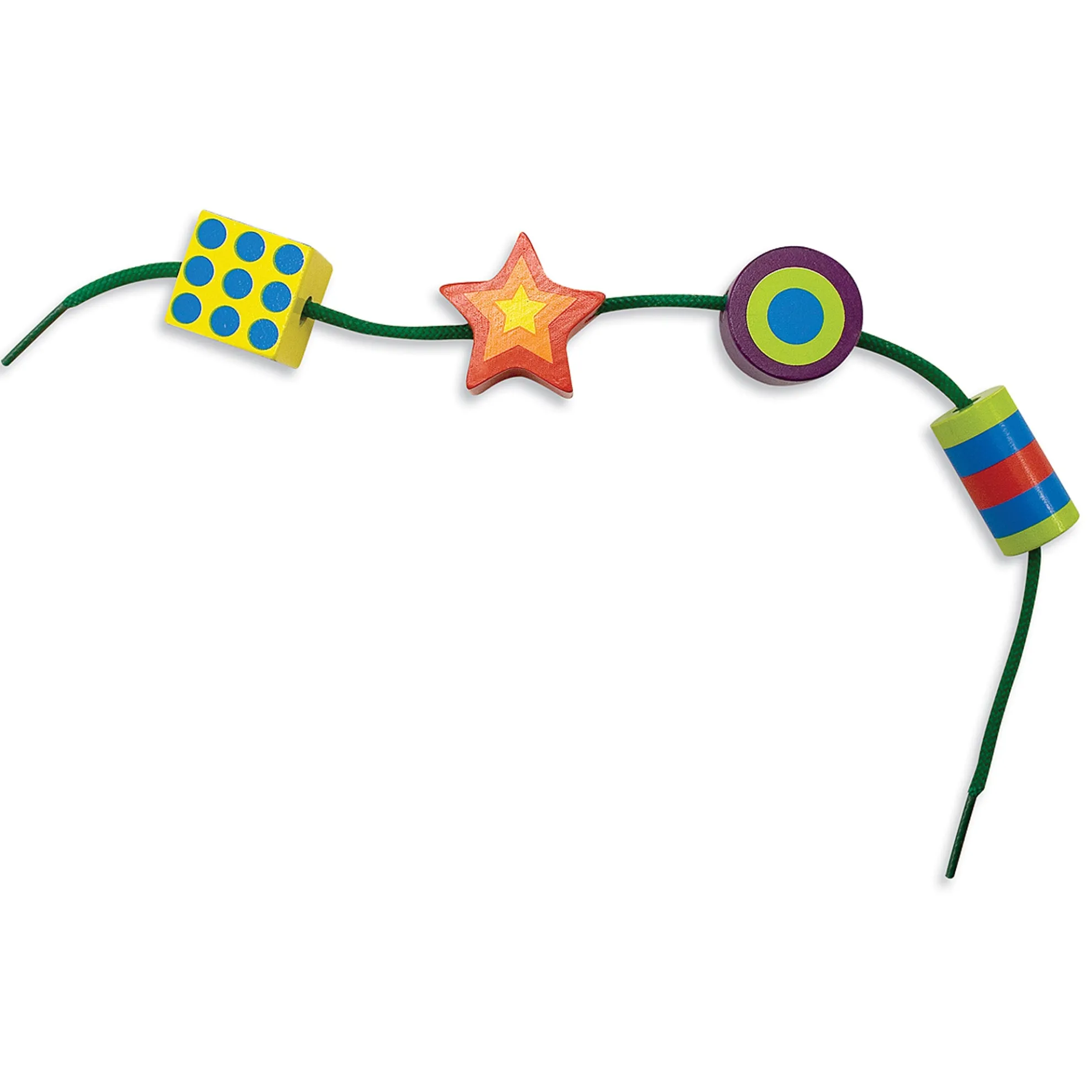 - Wooden beads in familiar shapes for skill-building lacing activity