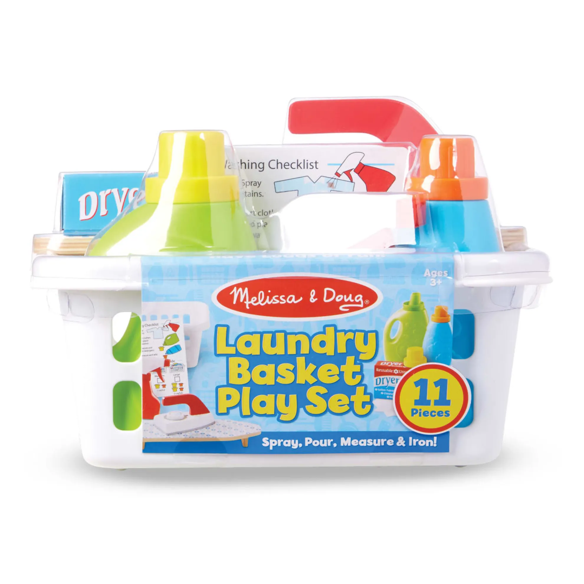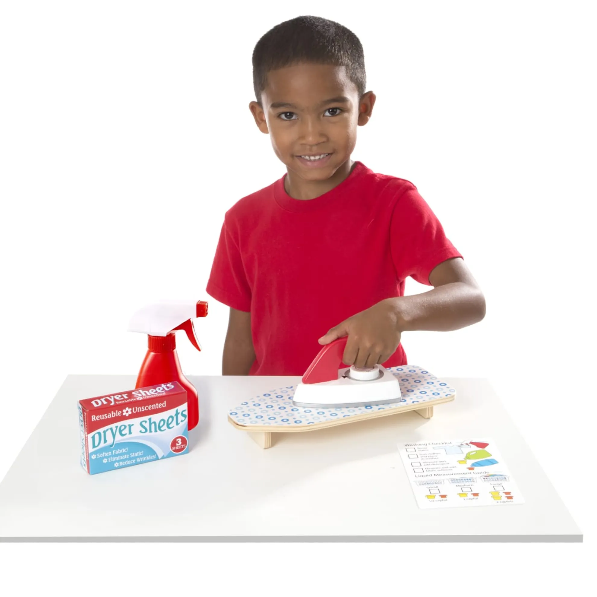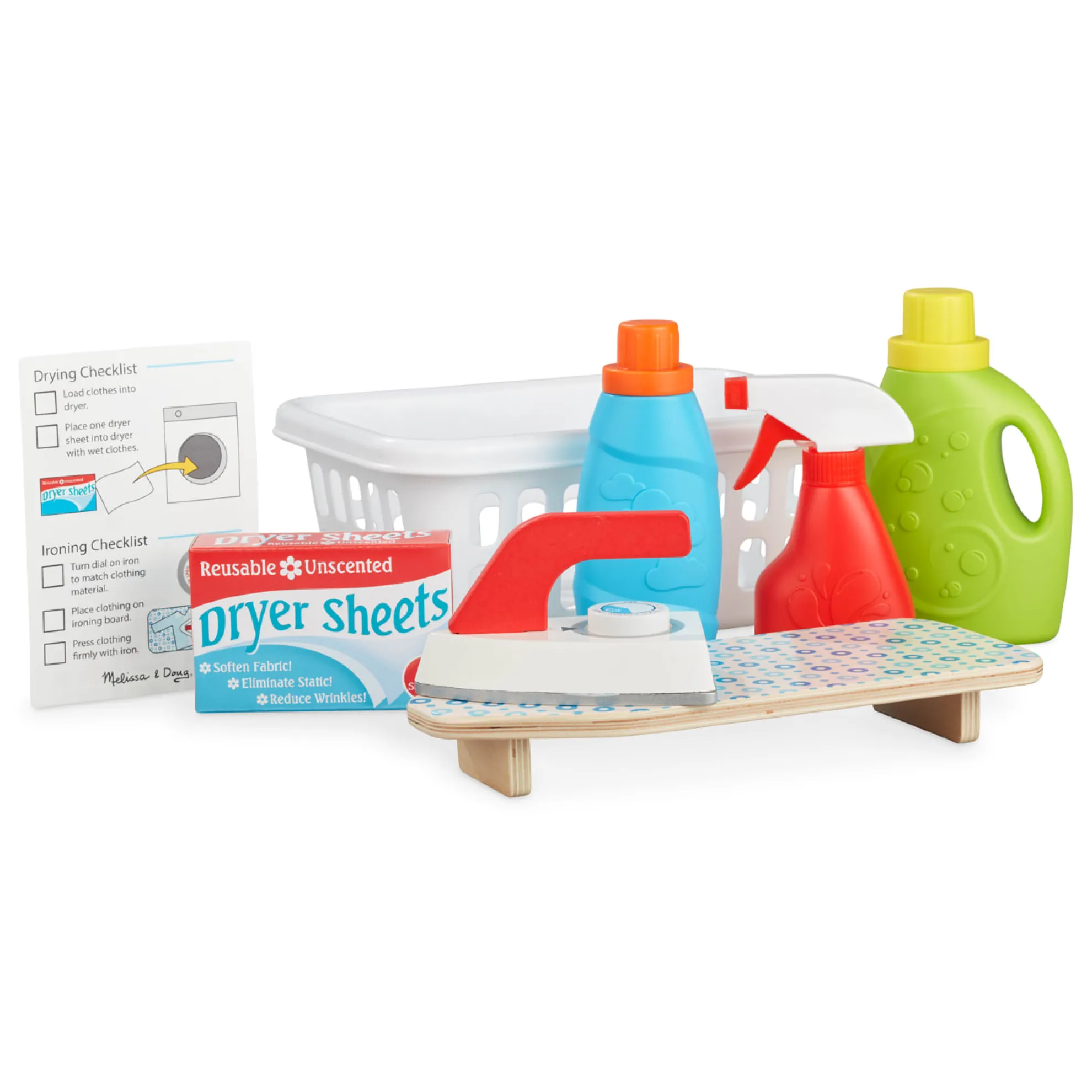 Kids will have loads of fun playing house with this these realistic laundry accessories! The 14-piece set includes a sturdy take-along basket to hold all the supplies and a reusable activity card to check off chores. Kids three and older will love spraying, measuring, and pressing with a stain remover spray bottle that can be filled with water, detergent and fabric softener bottles with removable lids, a box of three pretend dryer sheets, and a wooden iron and ironing board. Laundry day has never been such fun!