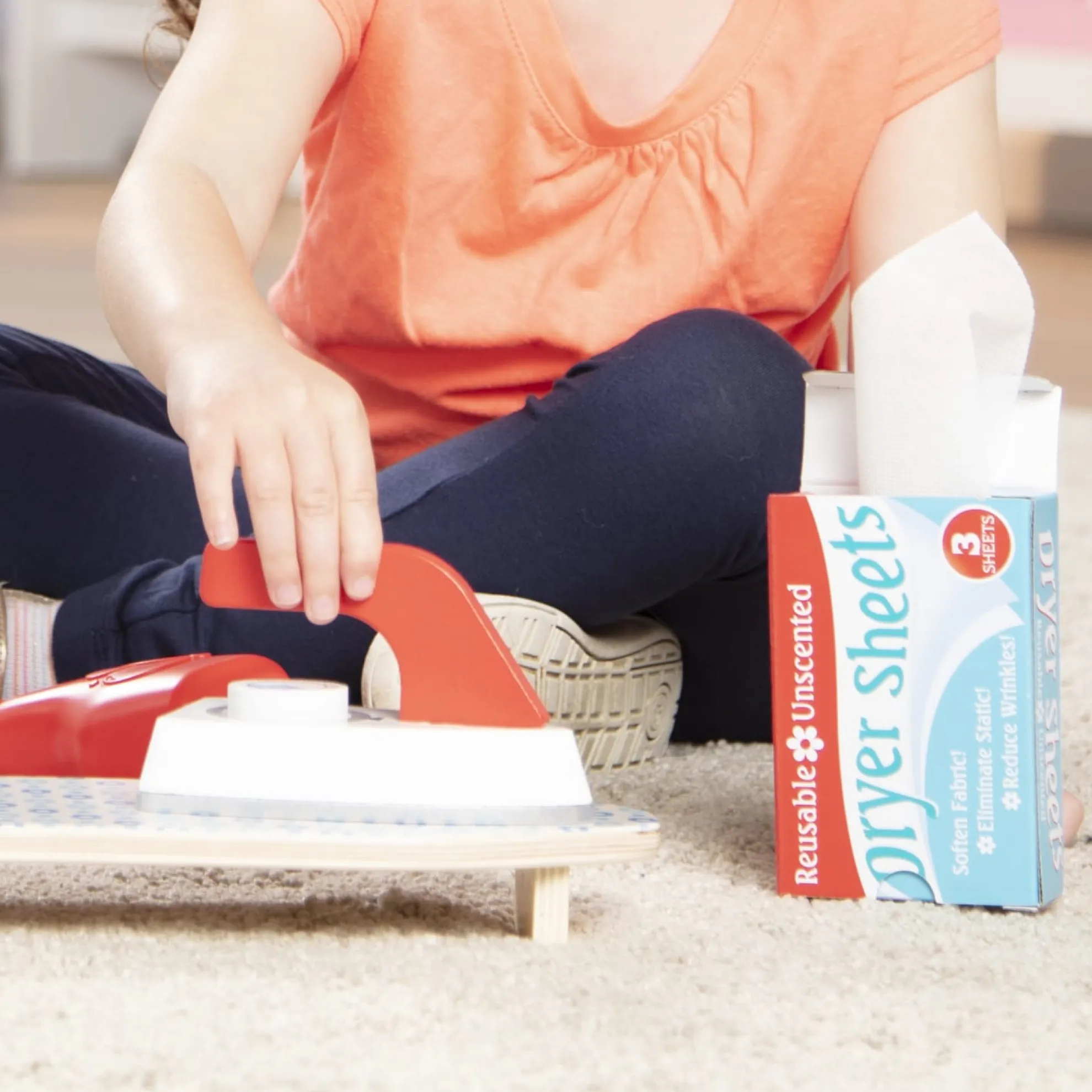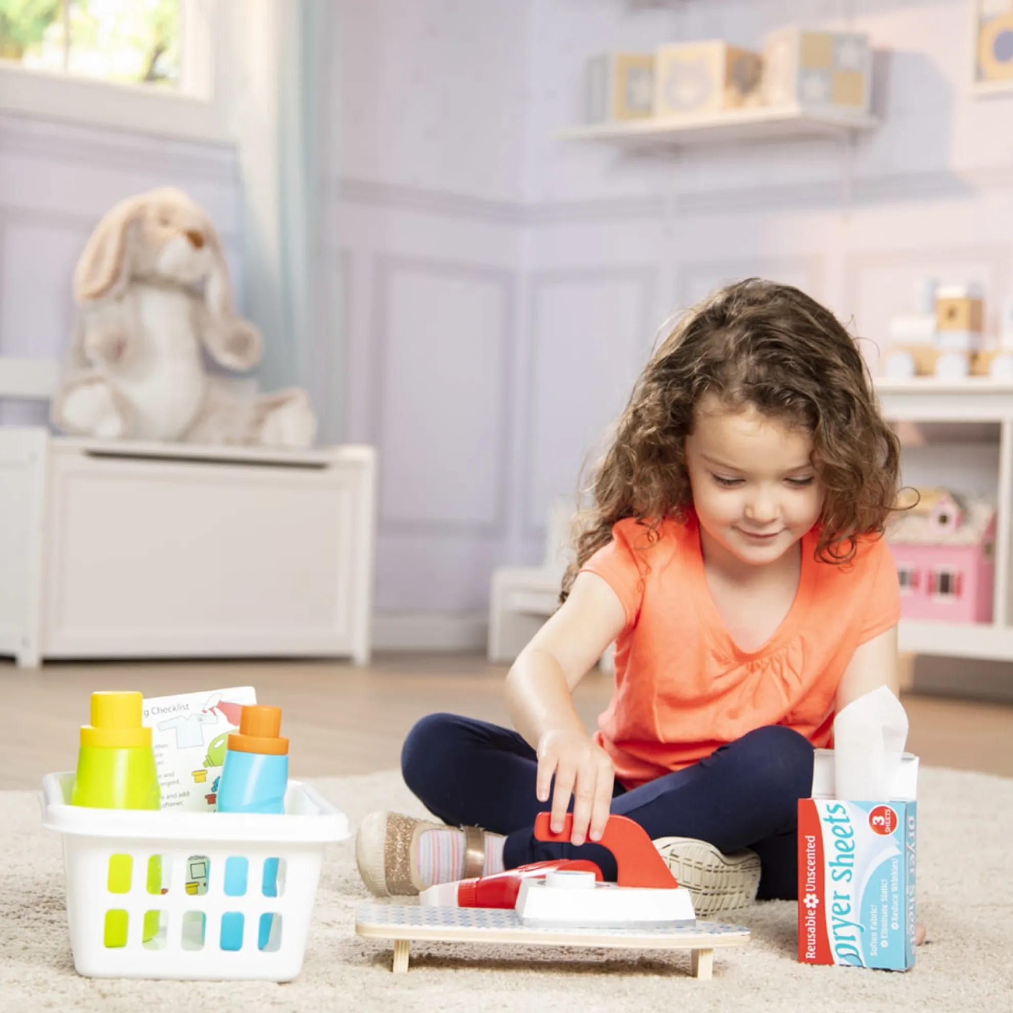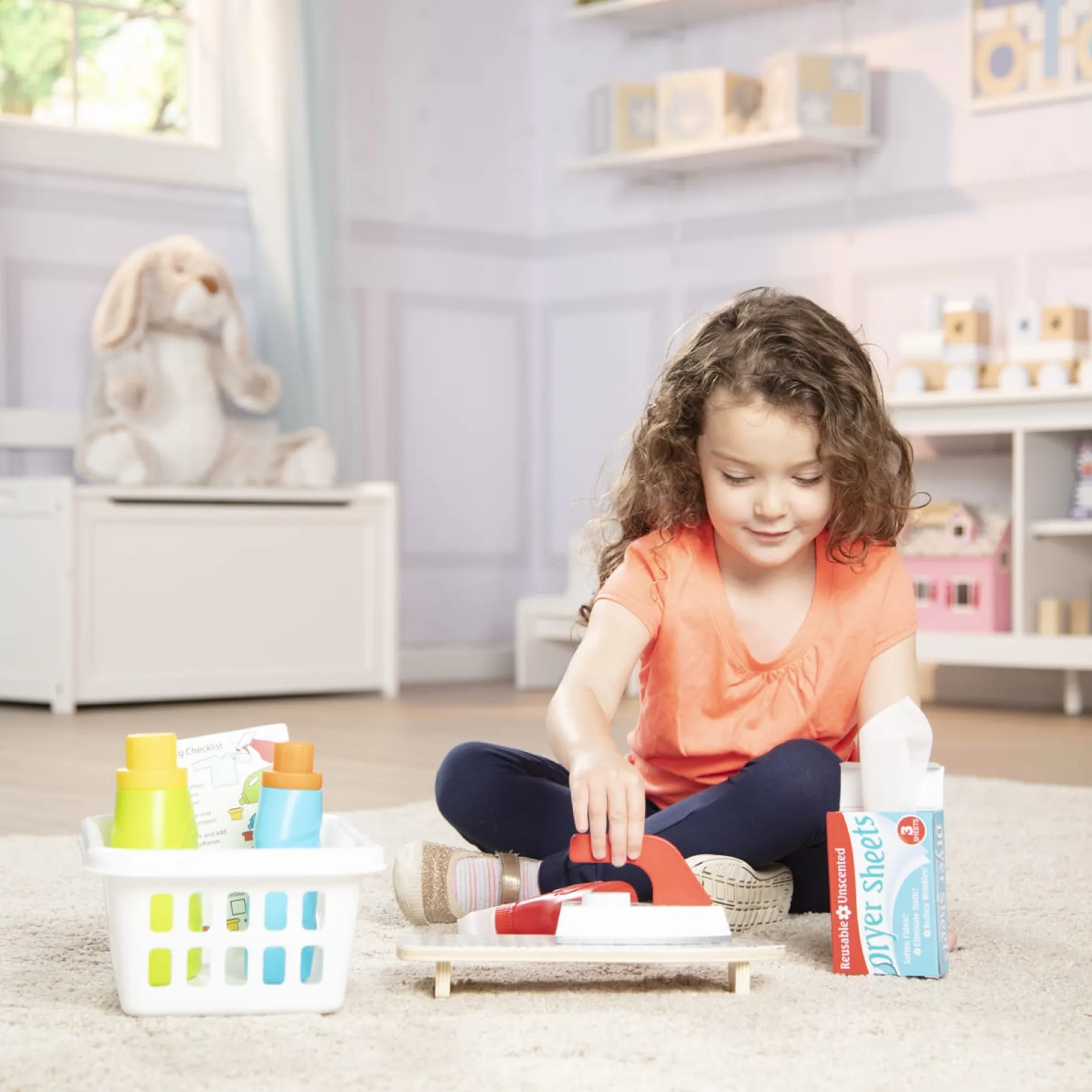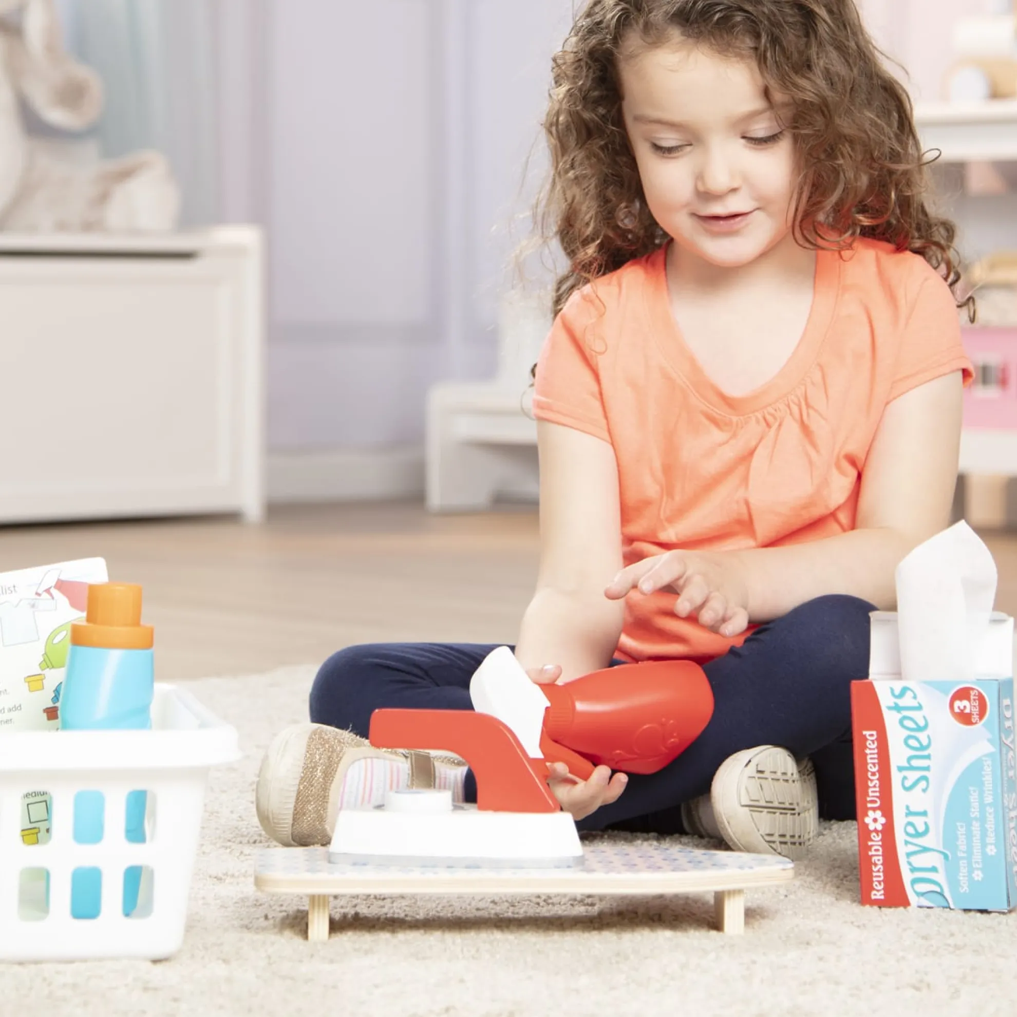 Kids will have loads of fun playing house with this these realistic laundry accessories! The 14-piece set includes a sturdy take-along basket to hold all the supplies and a reusable activity card to check off chores. Kids three and older will love spraying, measuring, and pressing with a stain remover spray bottle that can be filled with water, detergent and fabric softener bottles with removable lids, a box of three pretend dryer sheets, and a wooden iron and ironing board. Laundry day has never been such fun!