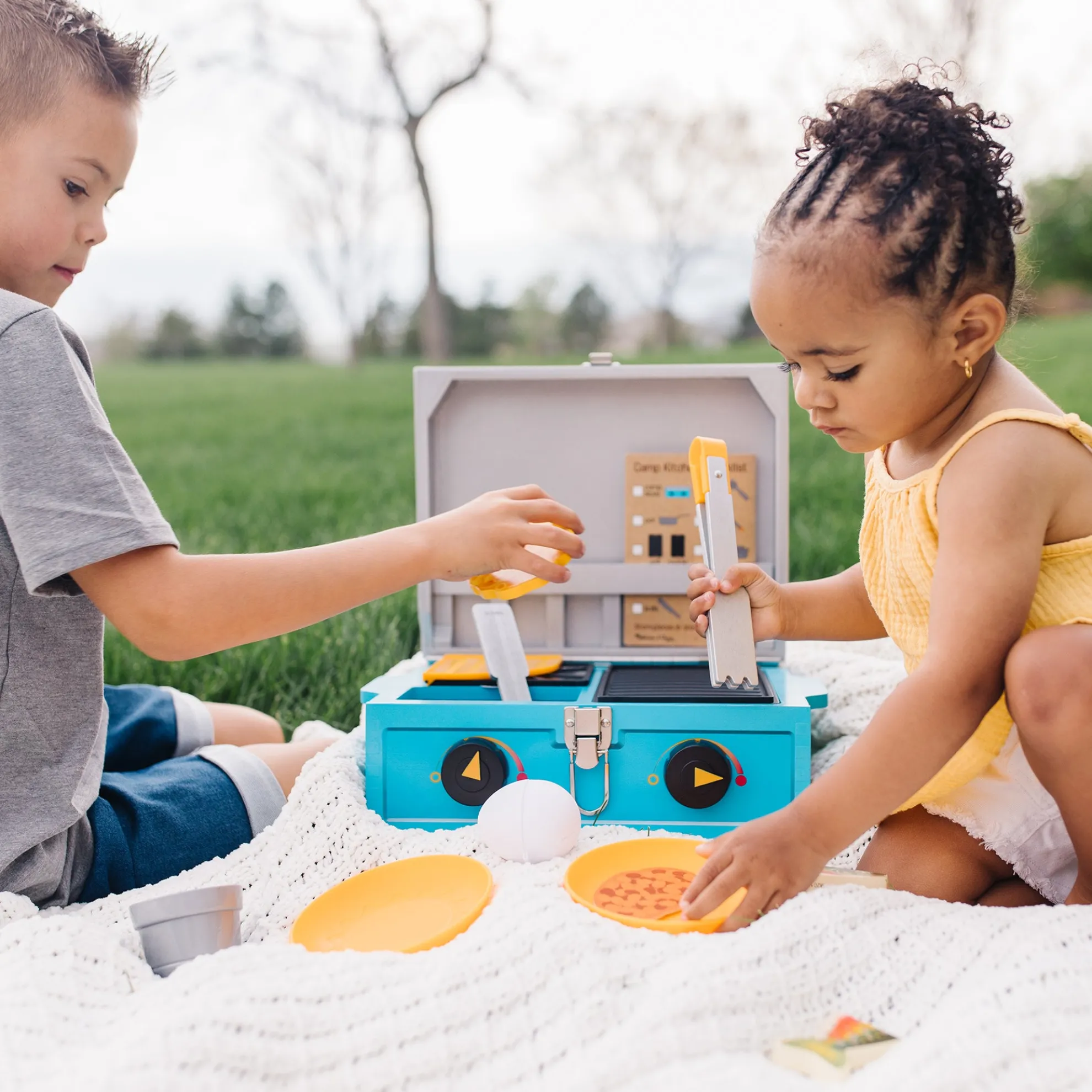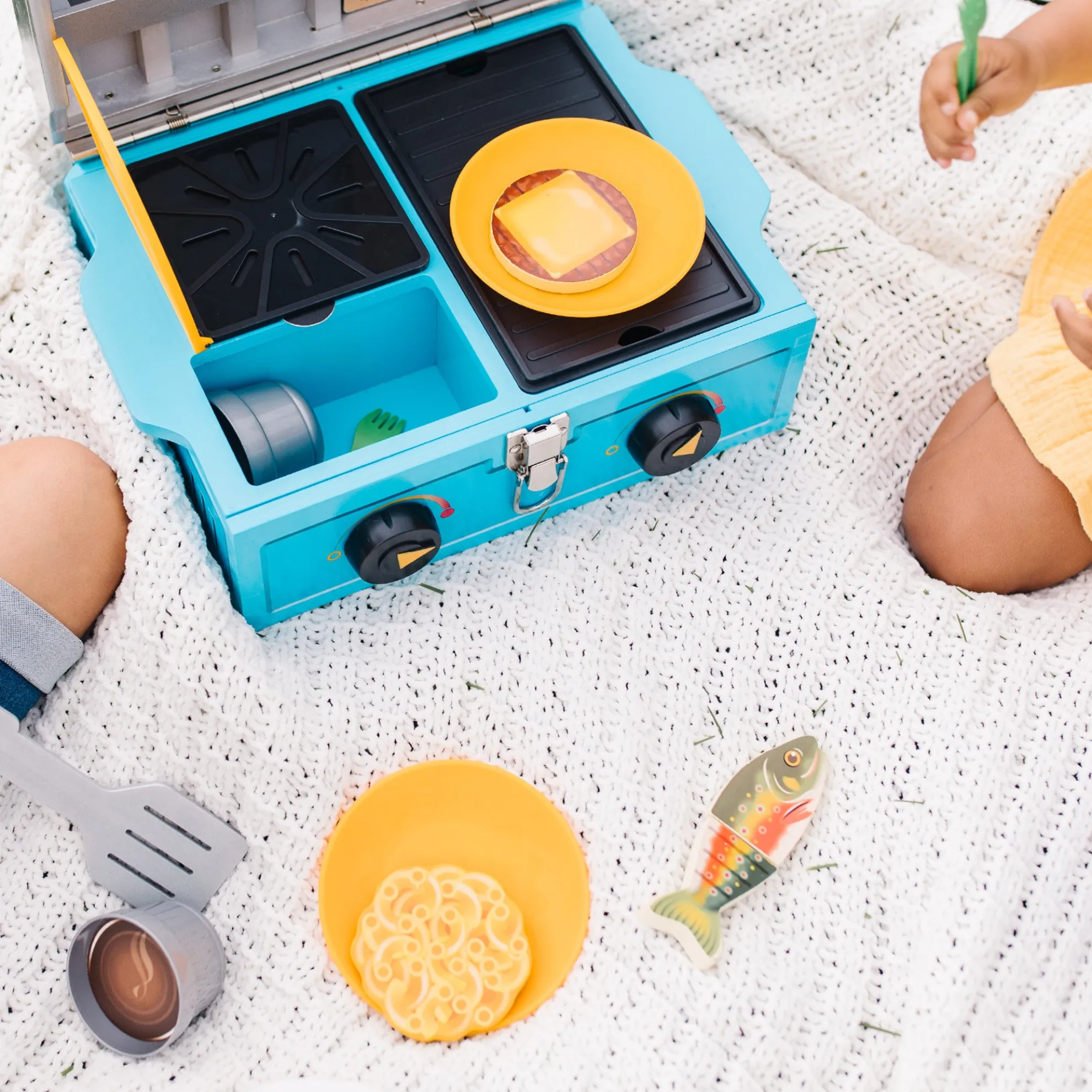 Explore the experience of outdoor camp cooking with the 24-piece Melissa & Doug Let’s Explore™ Camp Stove Play Set! The wooden play stove has knobs that turn, an adjustable “burner,” and a double-sided grill and griddle. Wooden utensils, felt and wooden play food, two durable plates and sporks, cups, kettle, collectible medallion, and a reusable activity book all store the stove for quick and easy cleanup! Let’s Explore™ encourages kids three and older to connect with the natural world through imaginative play! Discover the joy of outdoor adventures that instill curiosity and confidence while inspiring kids to say, “Let’s Explore™”! This product is certified by the Forest Stewardship Council. FSC certification ensures that products come from responsibly managed forests that provide environmental, social, and economic benefits, and that forests are protected for future generations. Please note that FSC certification applies to new inventory only (FSC C156584)