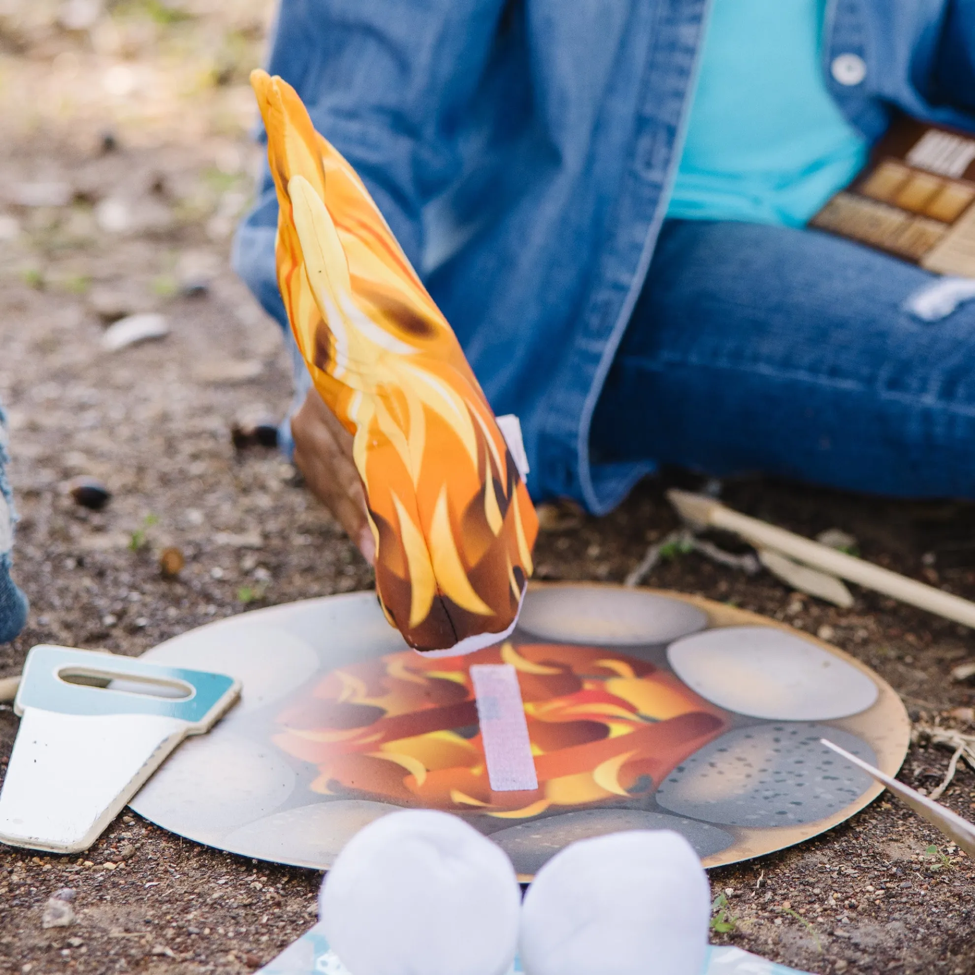 - Includes crackling flames, 4-piece log, wooden saw, reversible fire pit mat, 2 toasting sticks, activity booklet, collectible medallion, mesh storage bag
