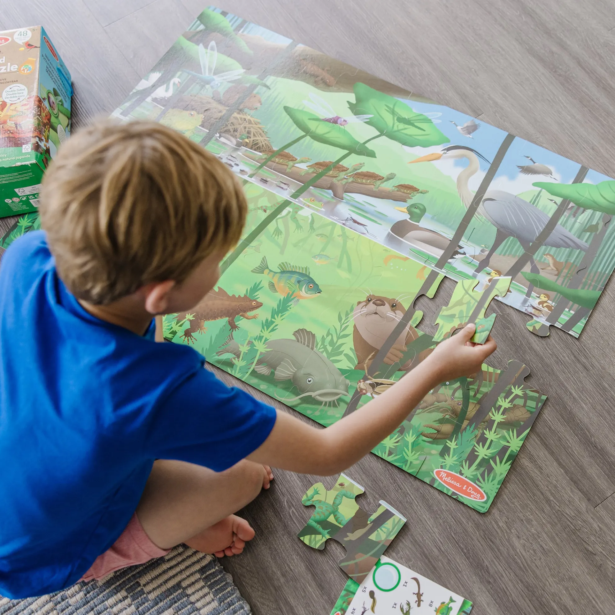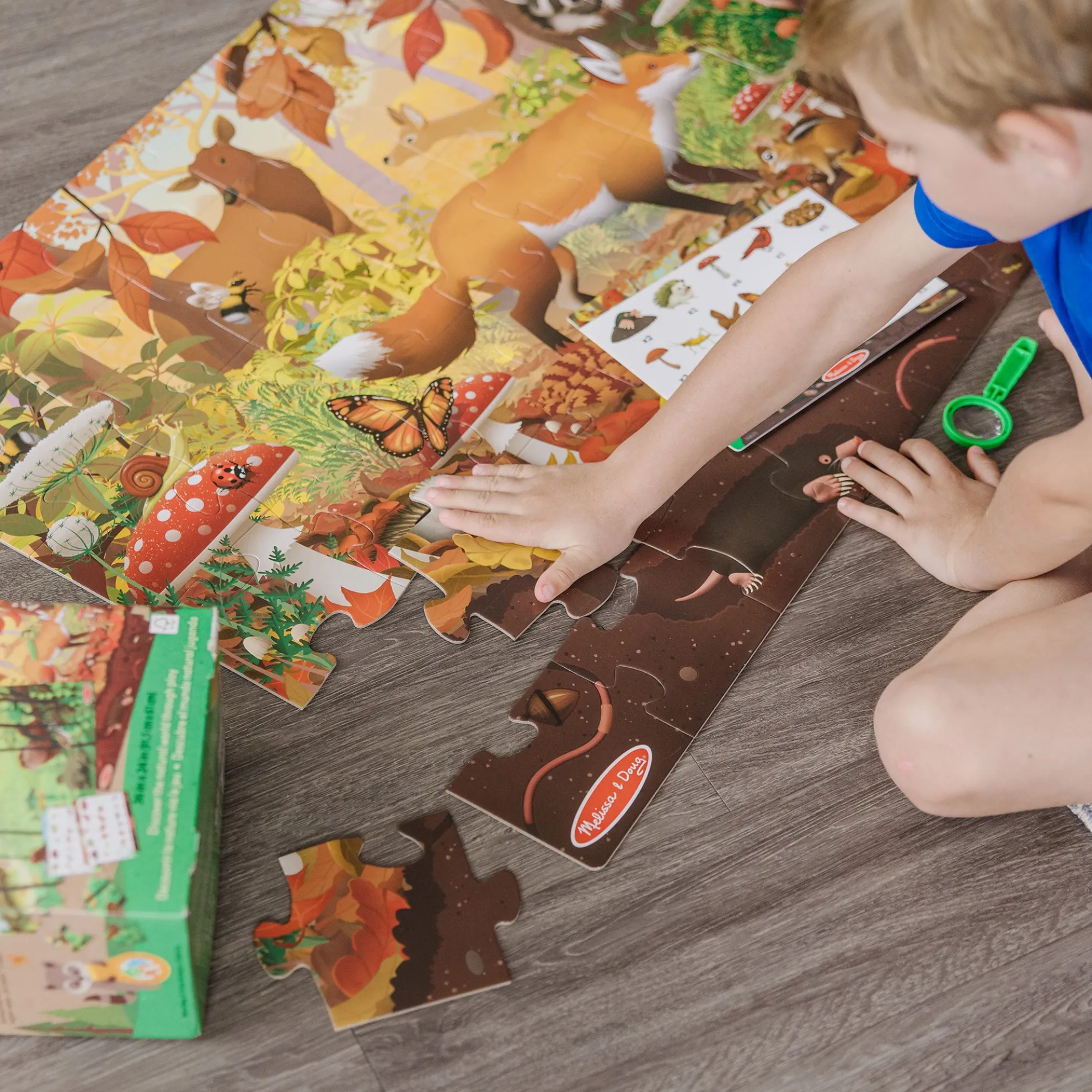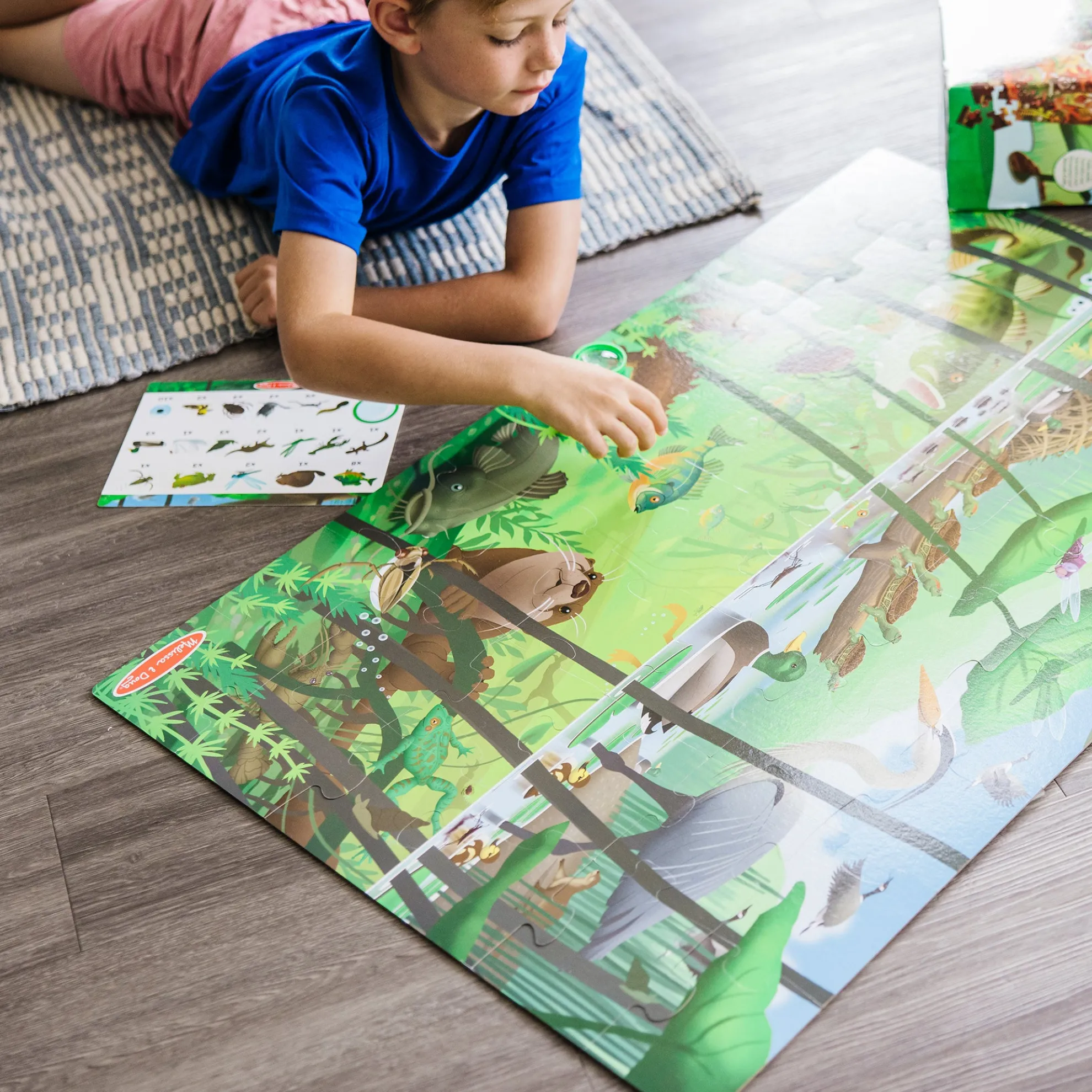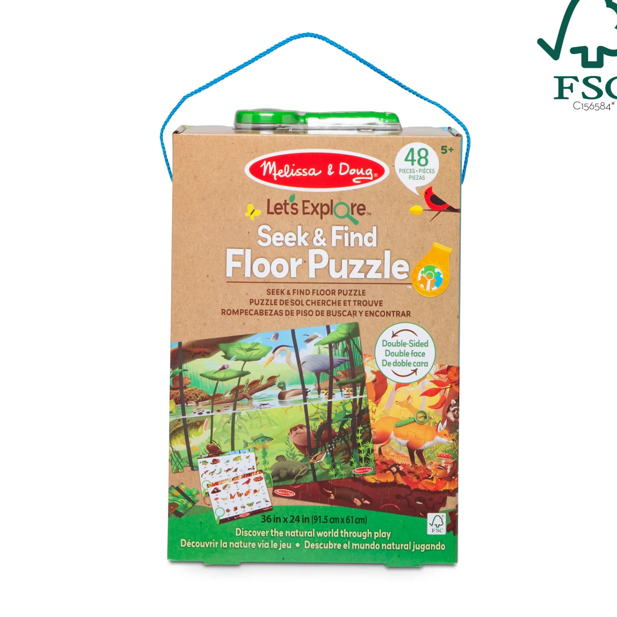 - 48-piece double-sided seek-and-find floor puzzle with two different natural habitats to piece together and explore