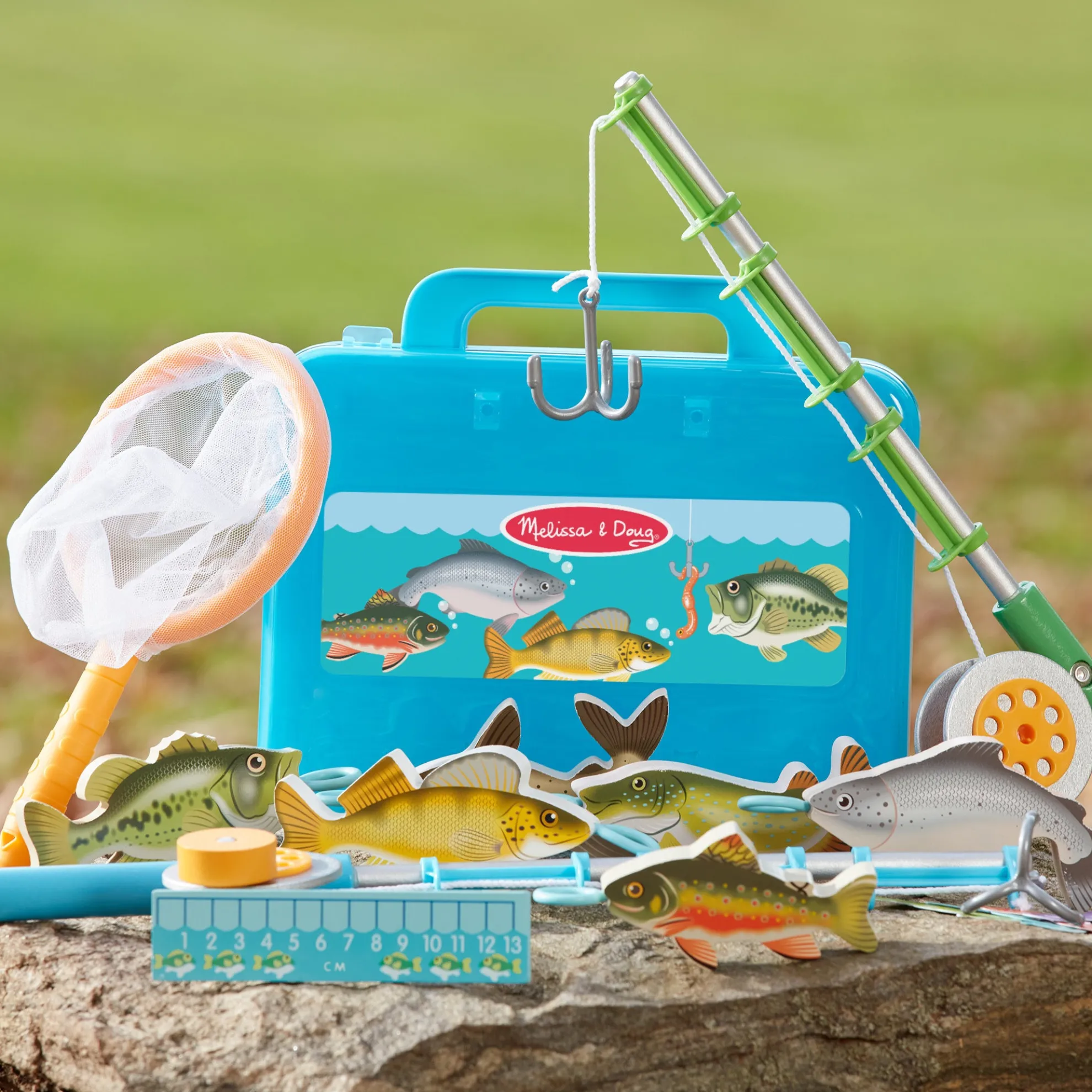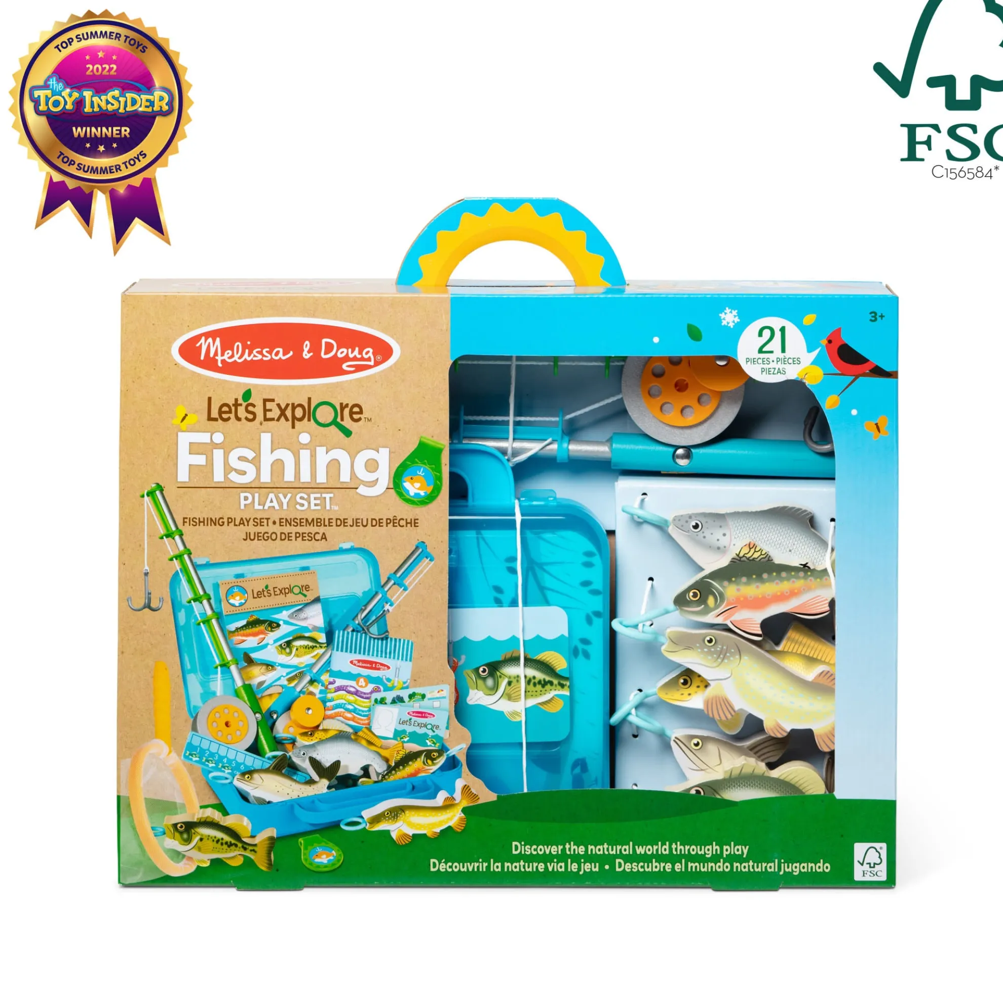 Explore the outdoor experience of fishing with the 21-piece Melissa & Doug Let’s Explore™ Fishing Play Set! Grab the two wooden fishing rods, bait the hooks with pretend worms, then hook and scoop up the six wooden fish! A reversible play mat lets young anglers choose a winter or summer experience. The illustrated fishing guide helps identify fish types, explains fishing basics, and includes fun games. Everything stores in the tackle box for quick and easy cleanup. Let’s Explore™ encourages kids three and older to connect with the natural world through imaginative play! Discover the joy of outdoor adventures that instill curiosity and confidence while inspiring kids to say, “Let’s Explore™”! This product is certified by the Forest Stewardship Council. FSC certification ensures that products come from responsibly managed forests that provide environmental, social, and economic benefits, and that forests are protected for future generations. Please note that FSC certification applies to new inventory only (FSC C156584)