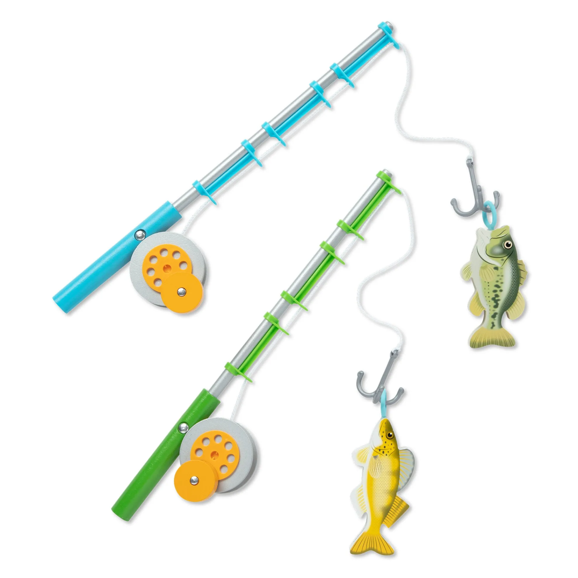 - Includes 2 wooden rods with reels and child-safe hooks, 6 double-sided wooden fish with built-in loops to hook, 4 play worms in pouch, net