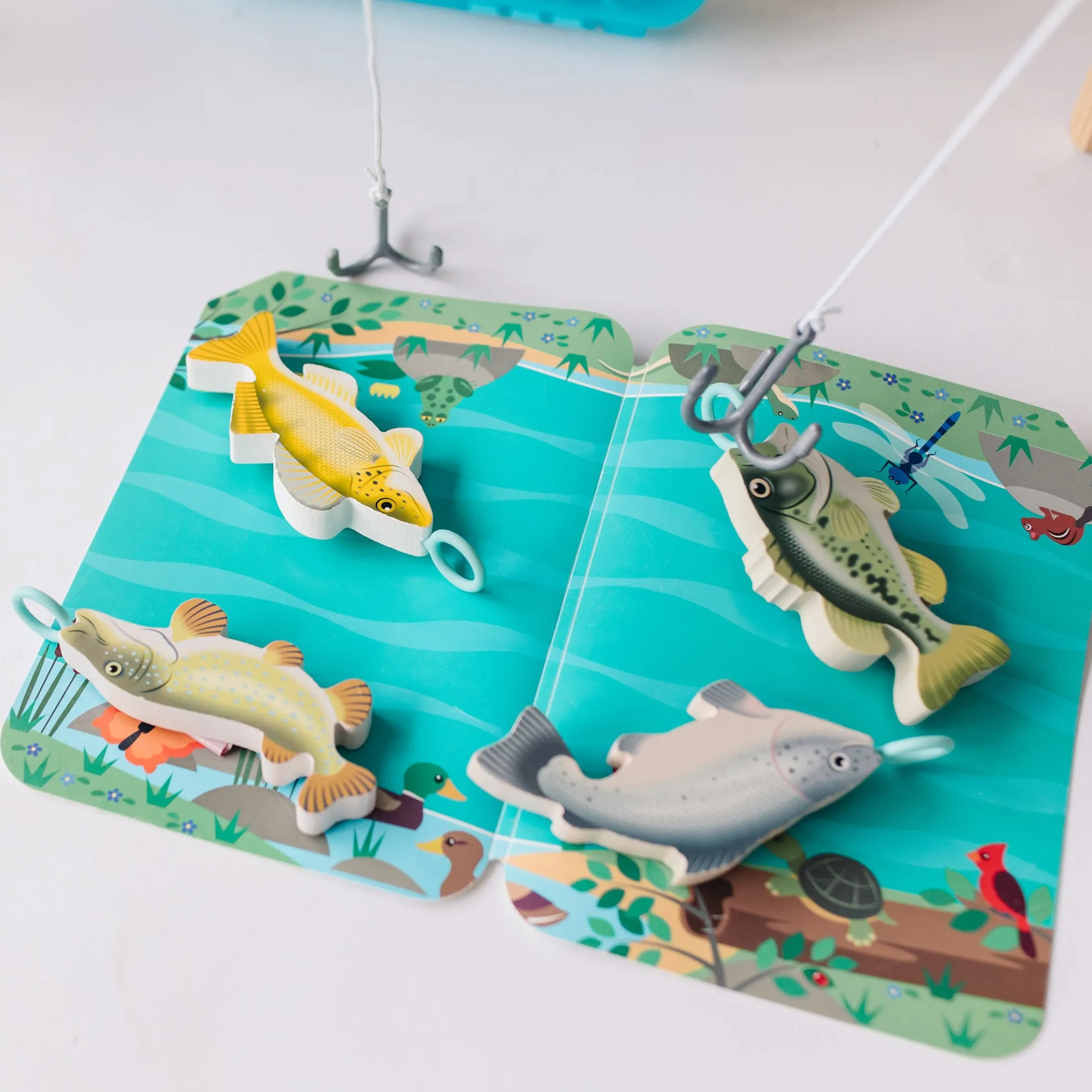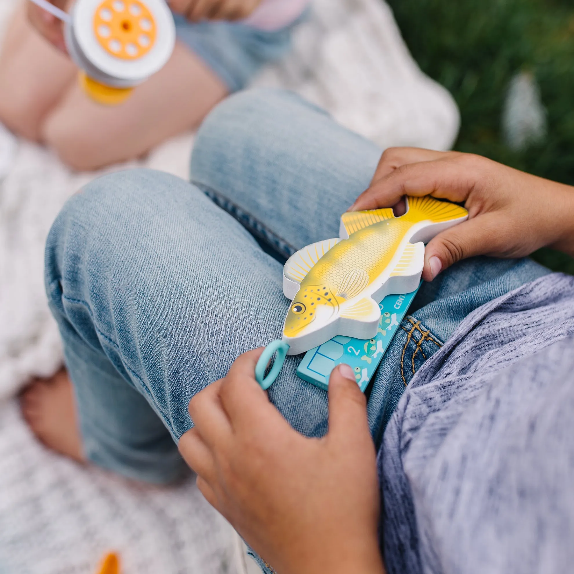 - 21-piece pretend play fishing play set with rods, bait, wooden fish, tackle box, and activity cards
