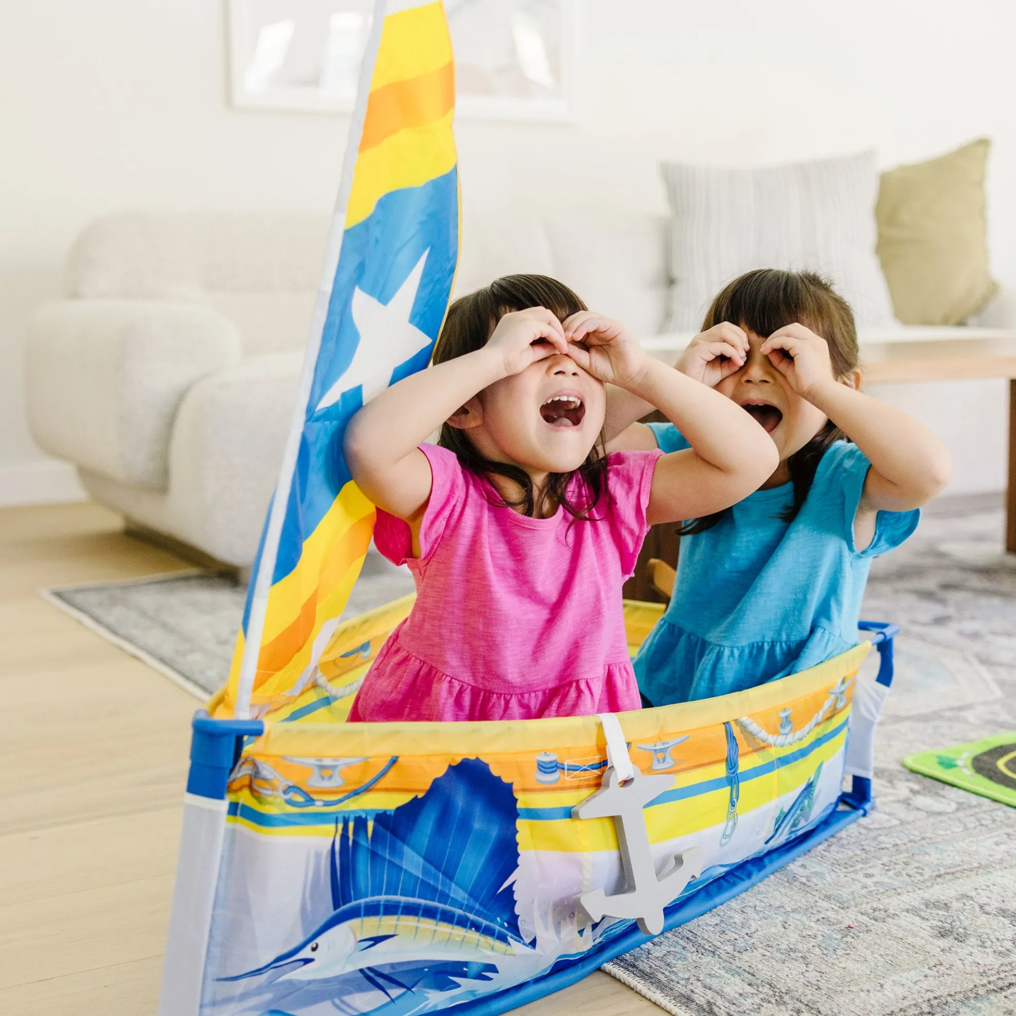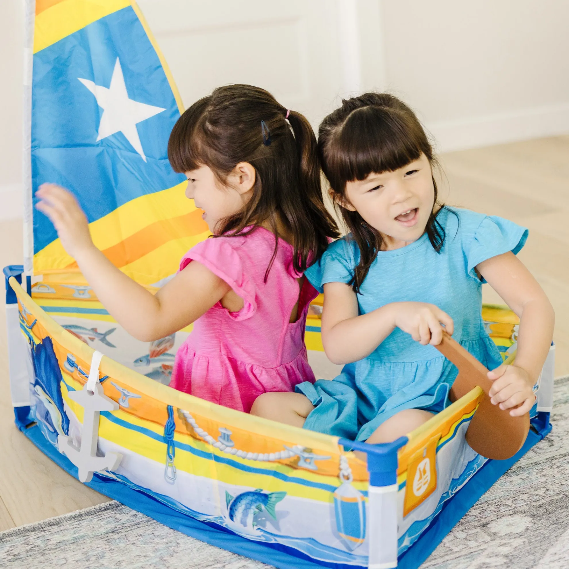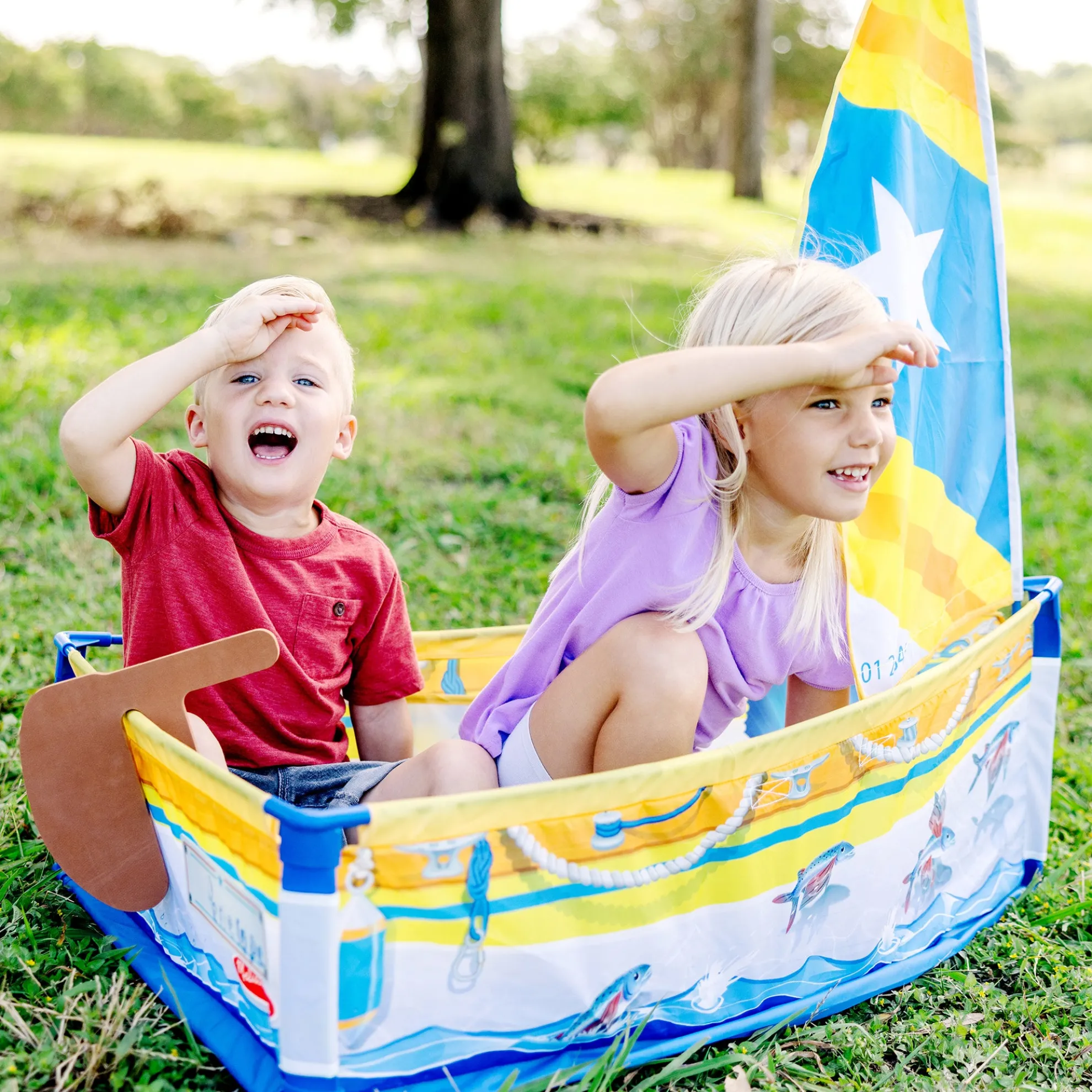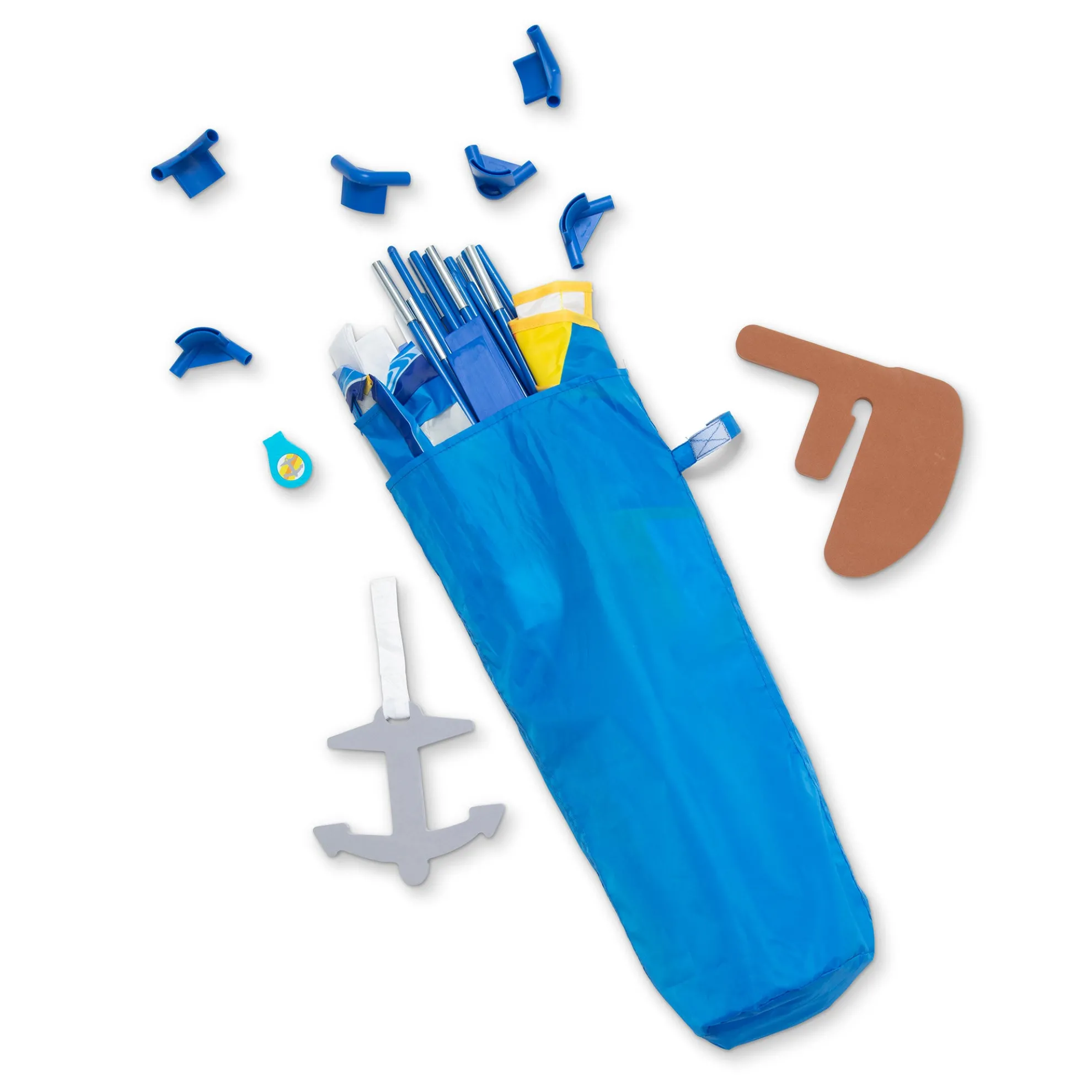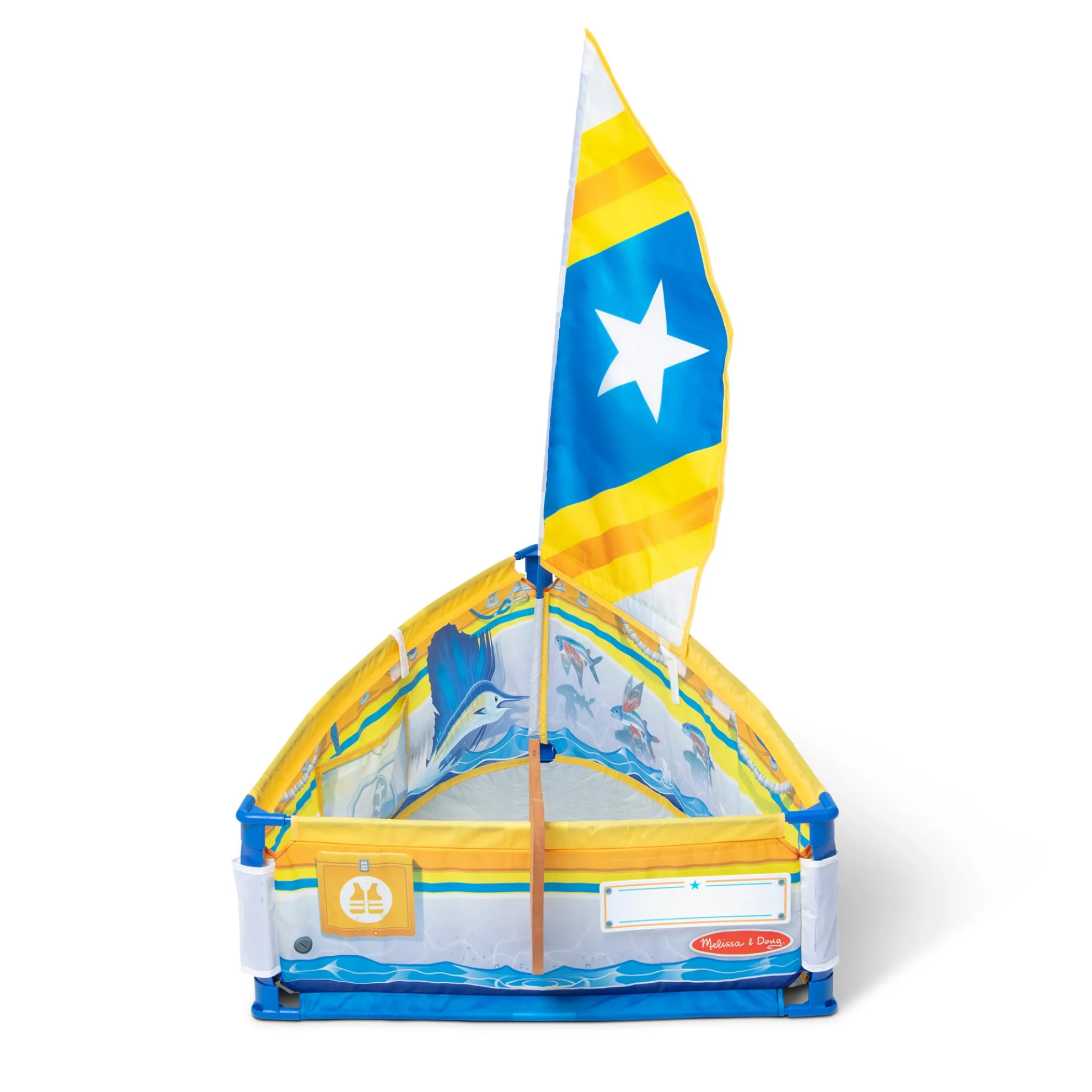 - Explore pretend play boating adventures with this sturdy tent-fabric sailboat play set