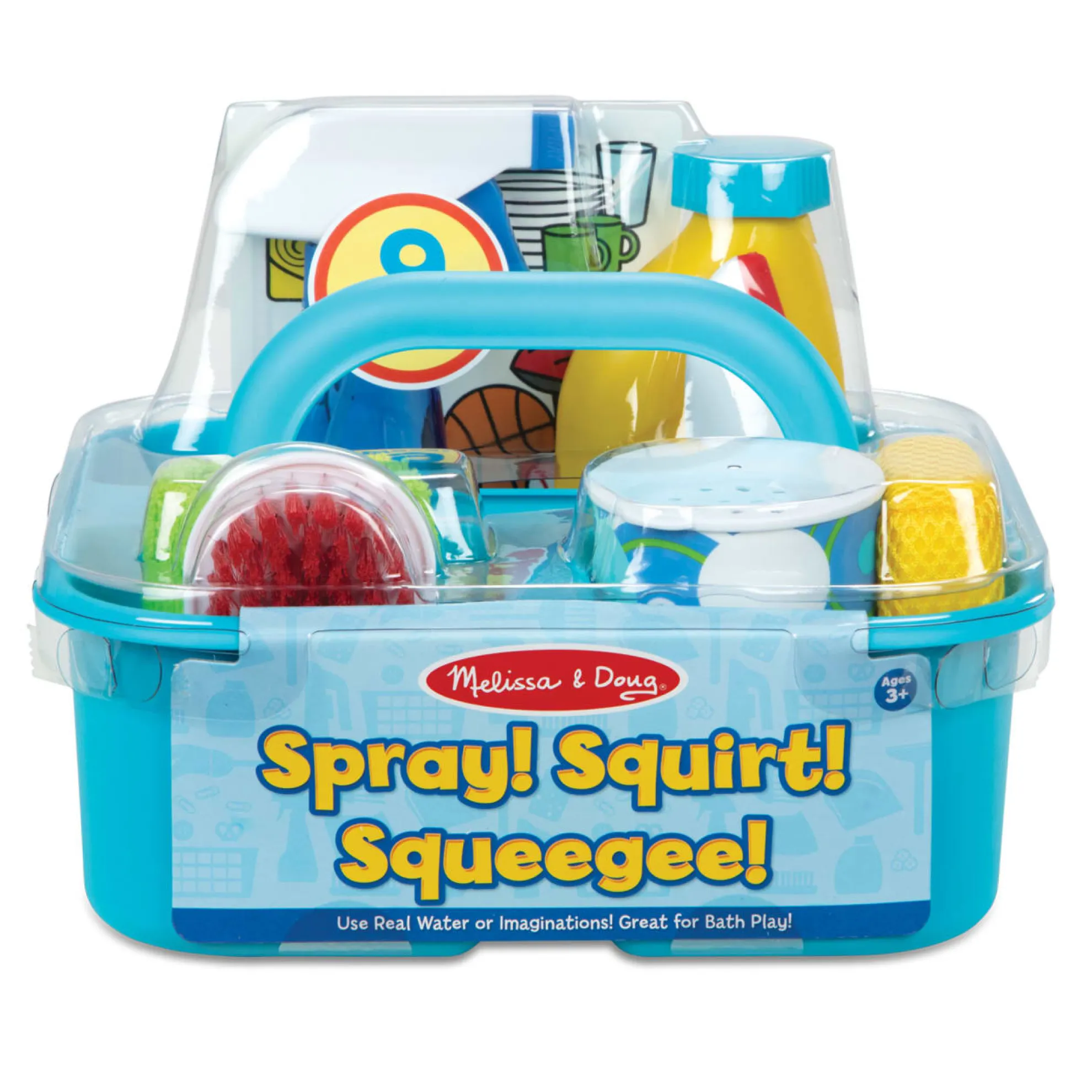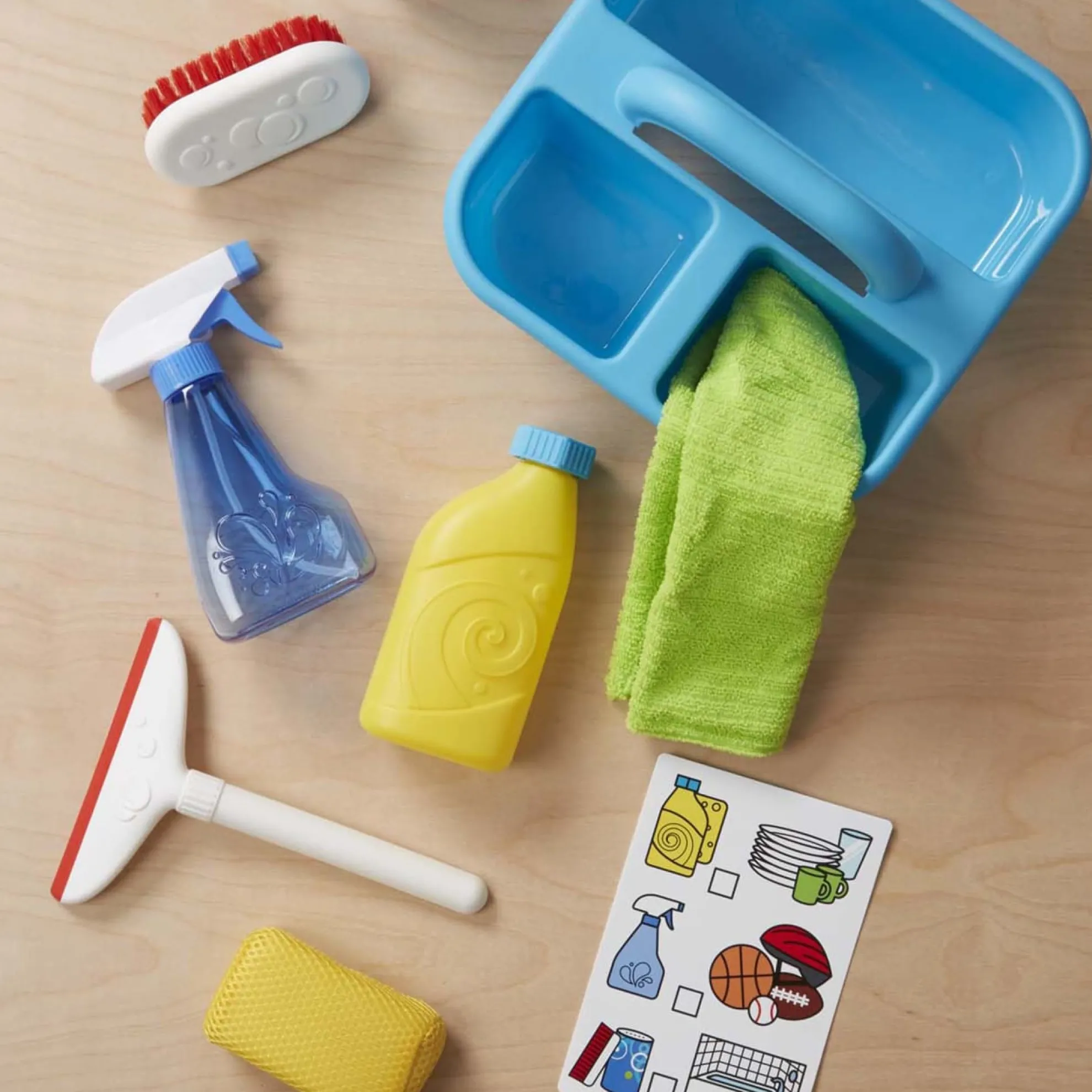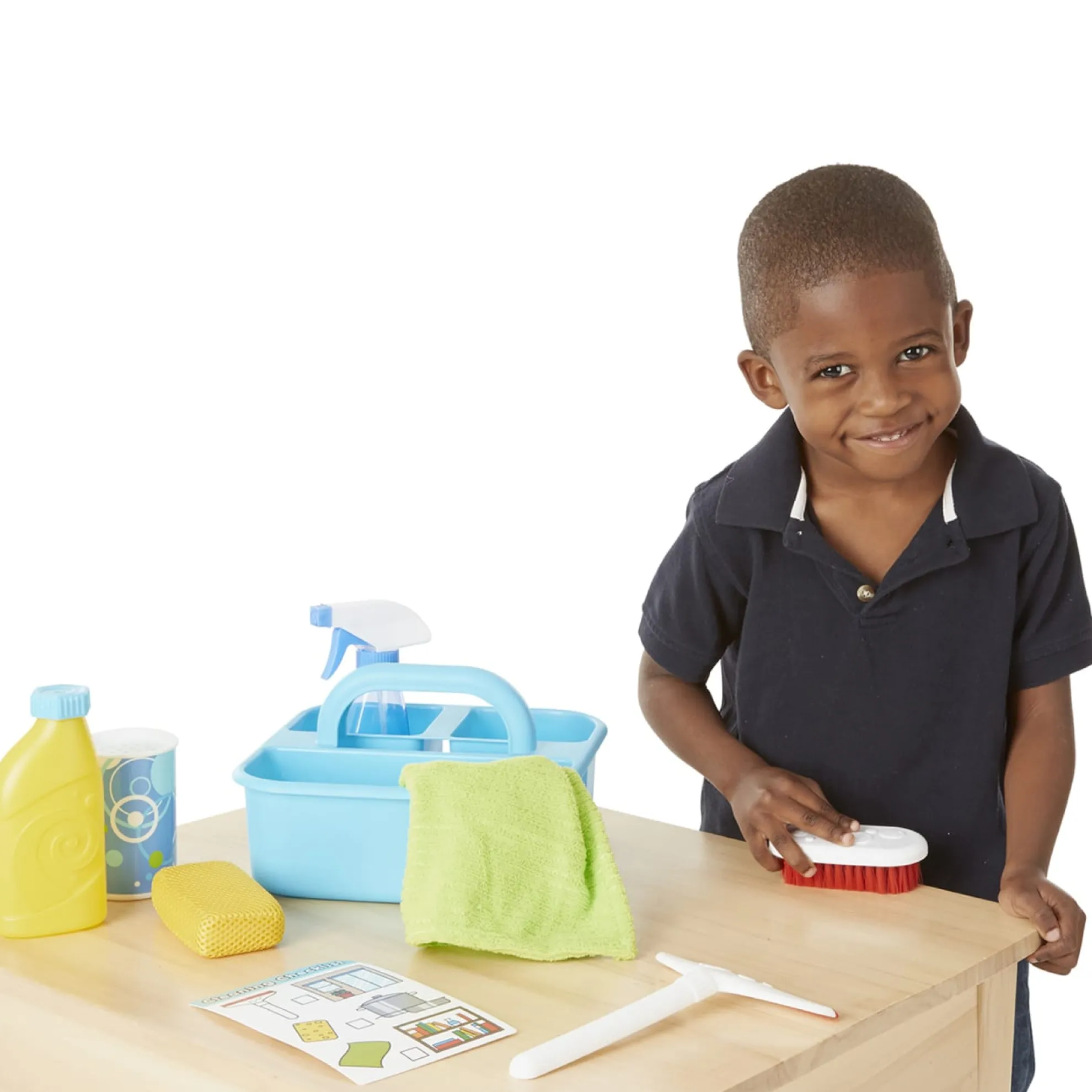 Part of playing house is keeping things sparkling clean! This pretend play cleaning set lets kids spray, squirt, squeegee, scour, and scrub using either real water or their imaginations. The spray bottle, scouring powder can, and soap bottle can be filled with water, making it perfect as a bath toy. The nine-piece set also includes supplies to keep things shining like a soft cloth, a scrub brush, a sponge, and a rubber-tipped squeegee! There’s even a reusable checklist that helps kids learn what items work best to clean different household objects and areas. All of the supplies store neatly in the durable caddy with a built-in handle for easy toting. Promotes fine and gross motor skills and encourages imaginative play. Not for use with real cleaning materials.