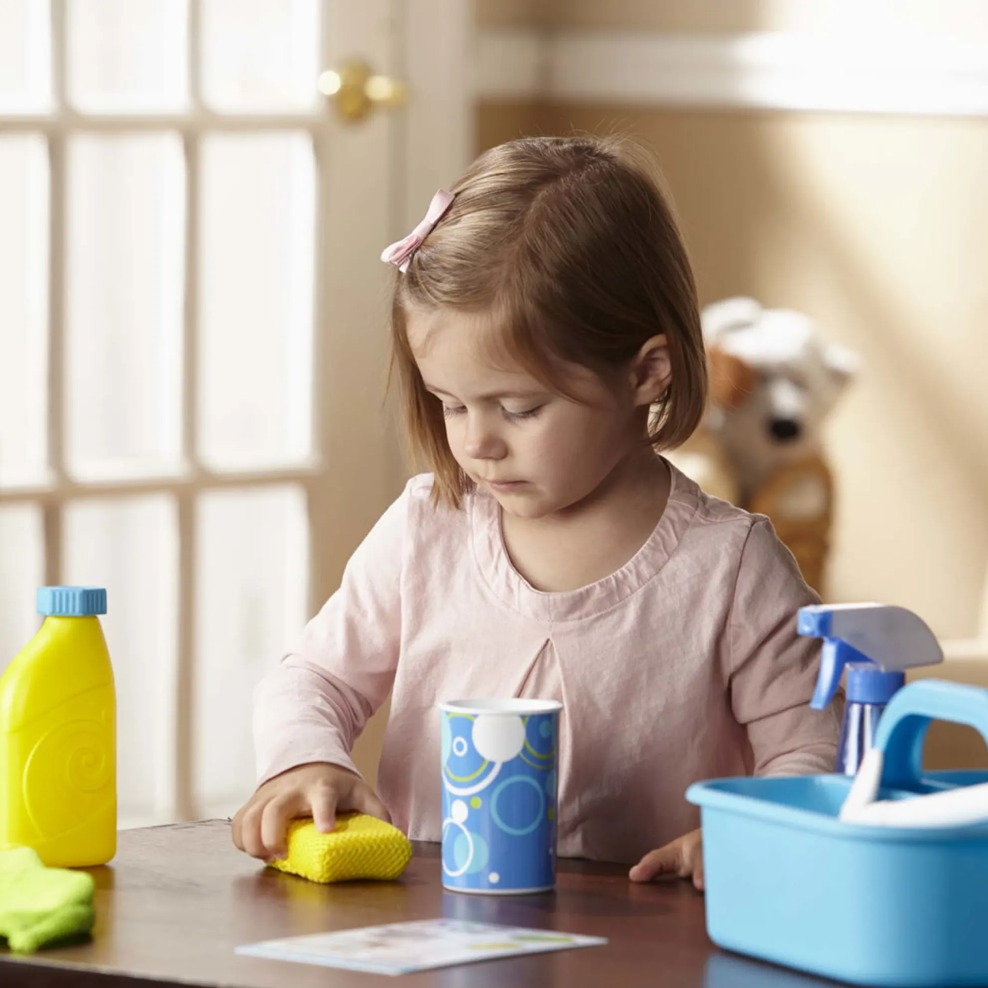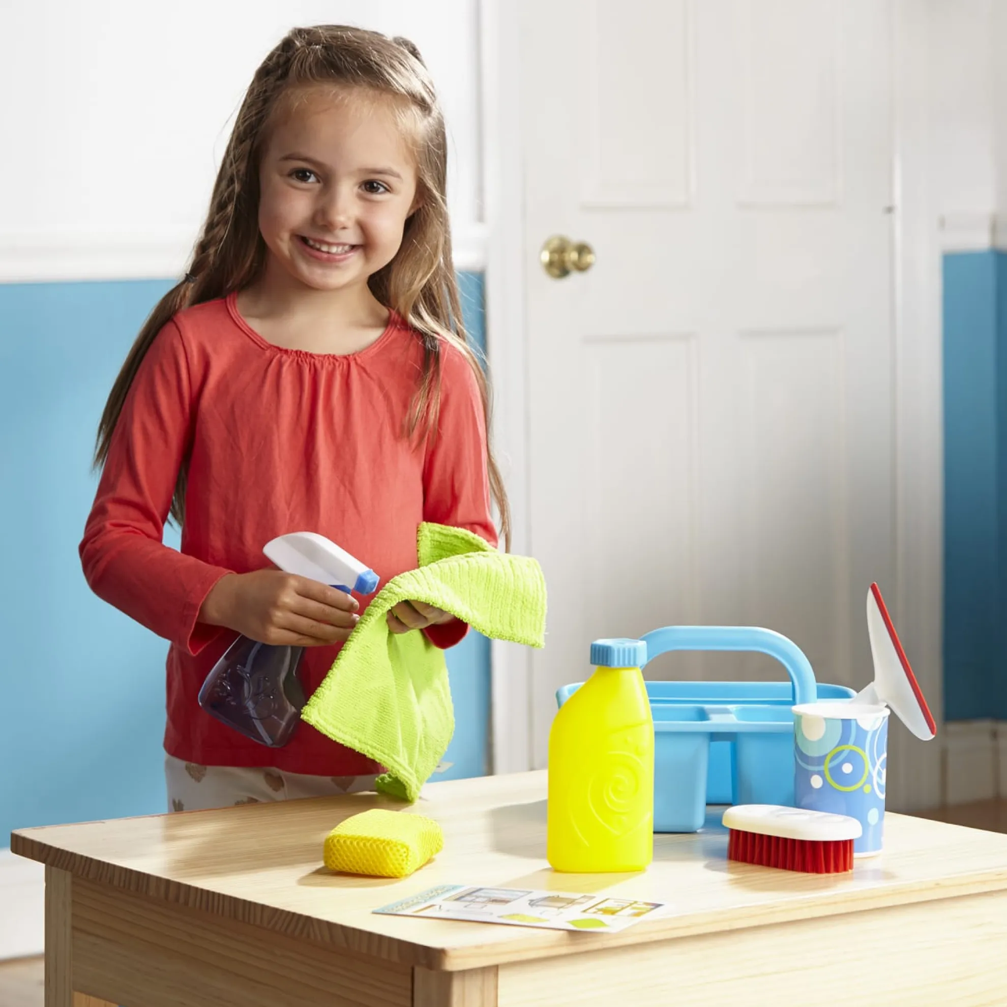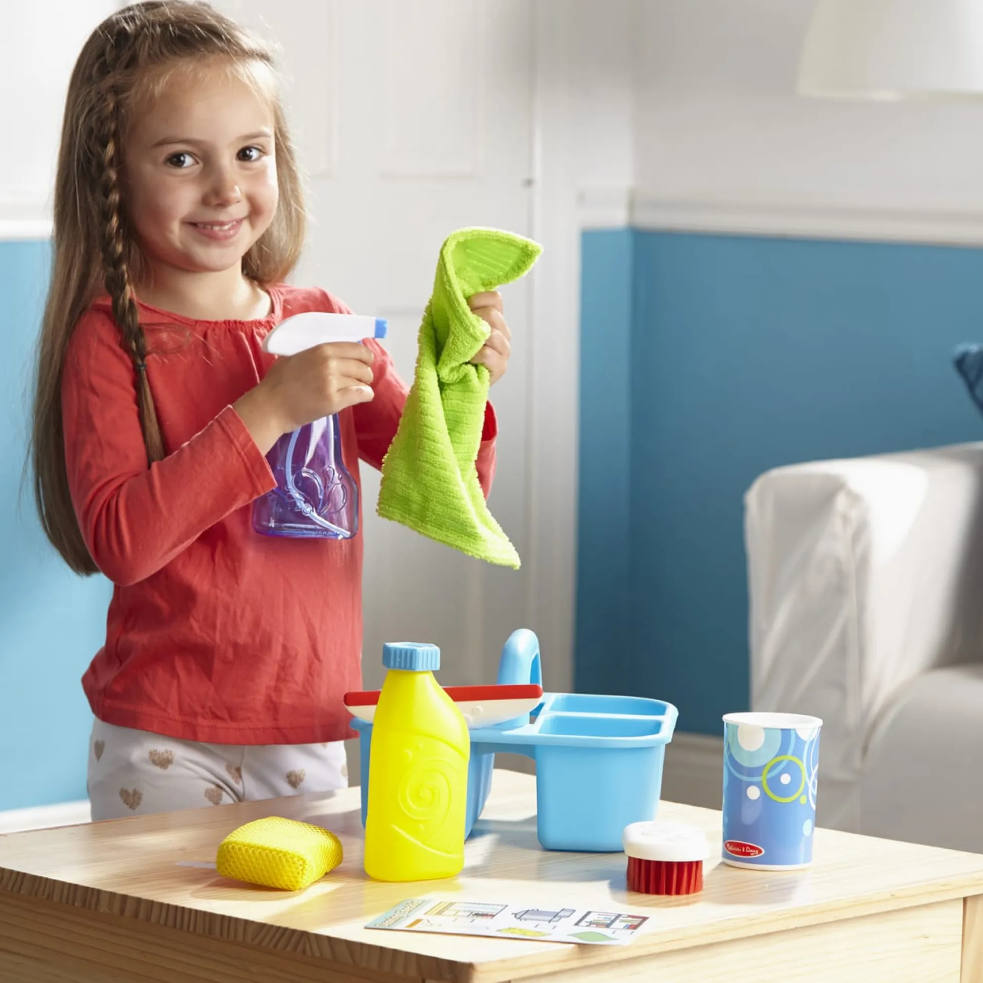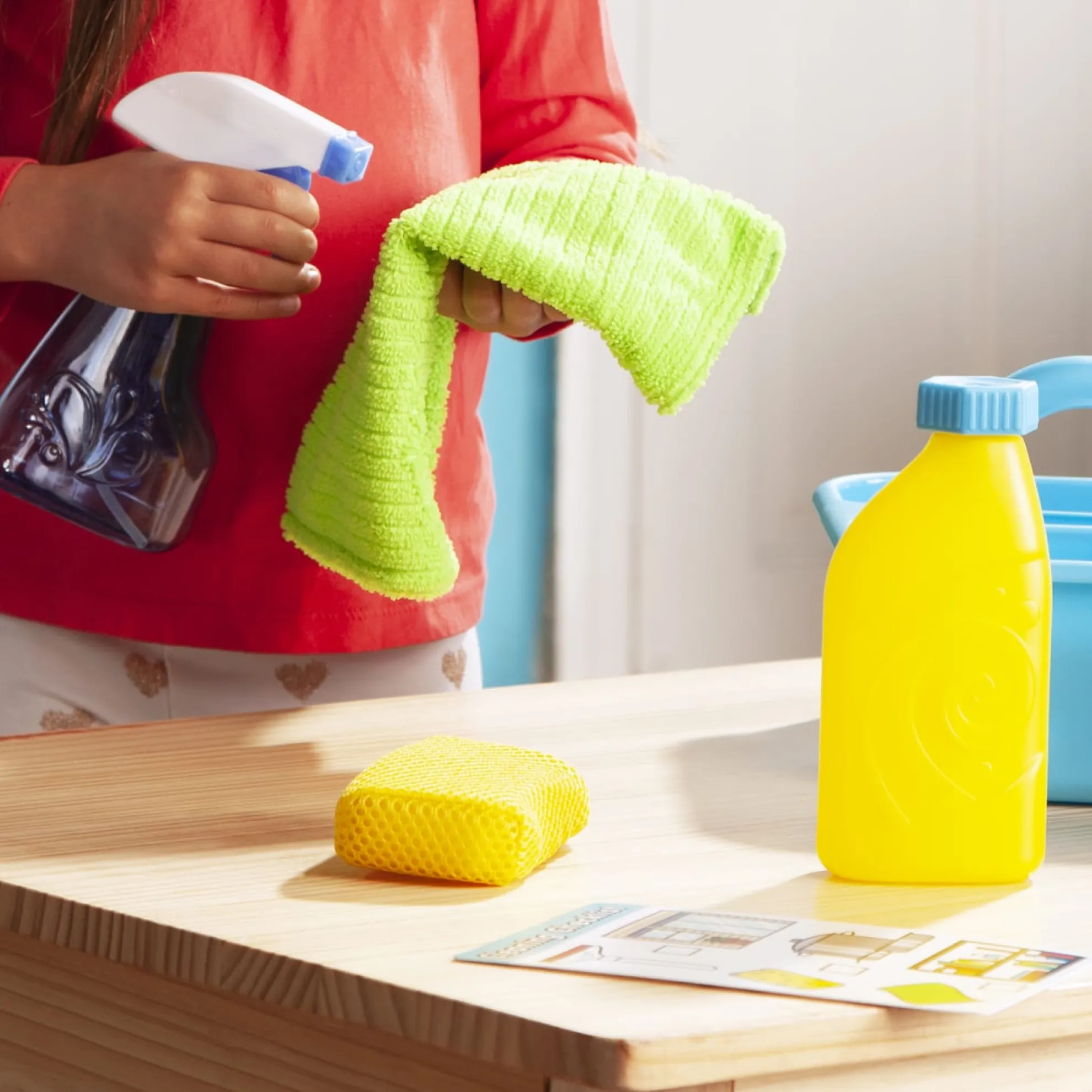 Part of playing house is keeping things sparkling clean! This pretend play cleaning set lets kids spray, squirt, squeegee, scour, and scrub using either real water or their imaginations. The spray bottle, scouring powder can, and soap bottle can be filled with water, making it perfect as a bath toy. The nine-piece set also includes supplies to keep things shining like a soft cloth, a scrub brush, a sponge, and a rubber-tipped squeegee! There’s even a reusable checklist that helps kids learn what items work best to clean different household objects and areas. All of the supplies store neatly in the durable caddy with a built-in handle for easy toting. Promotes fine and gross motor skills and encourages imaginative play. Not for use with real cleaning materials.