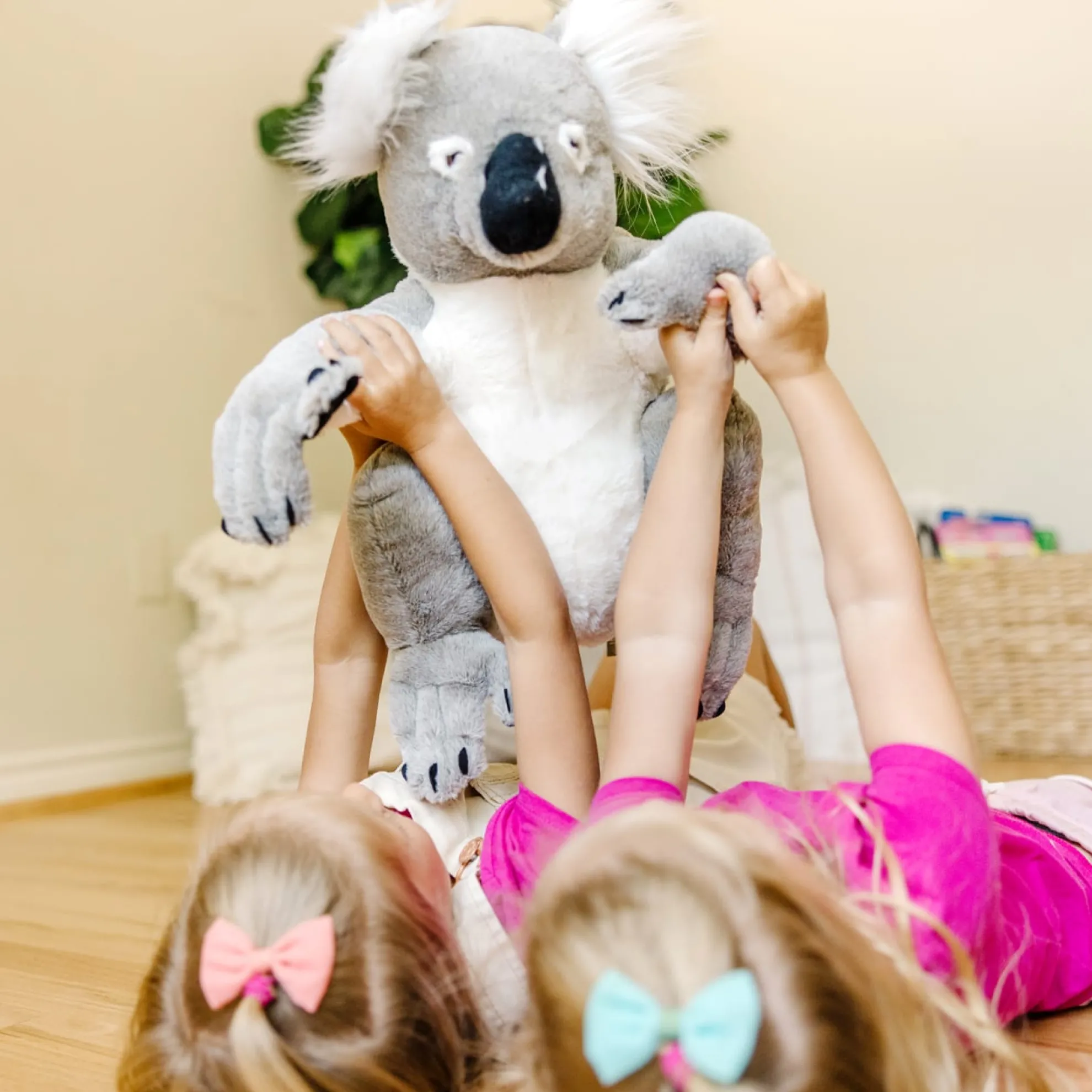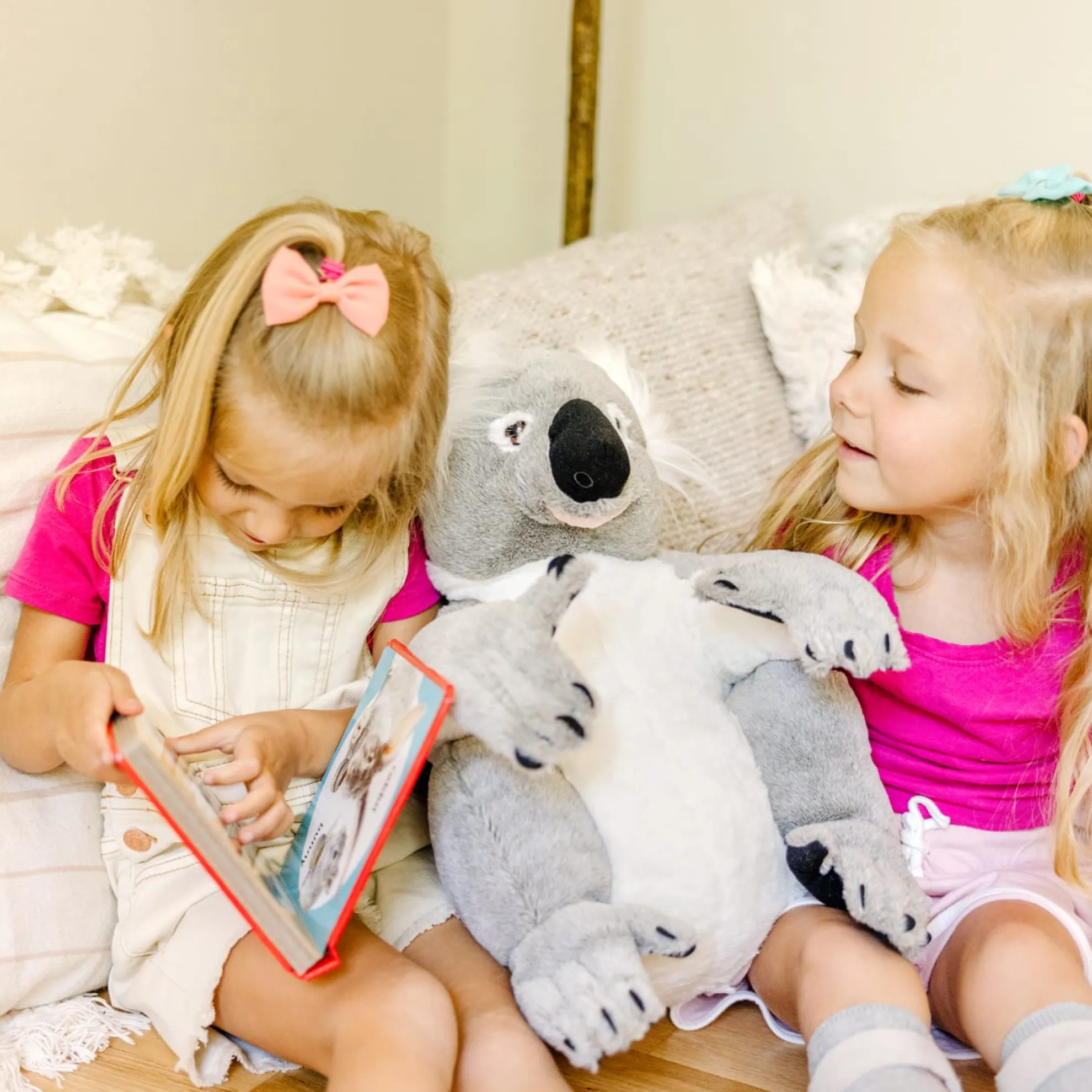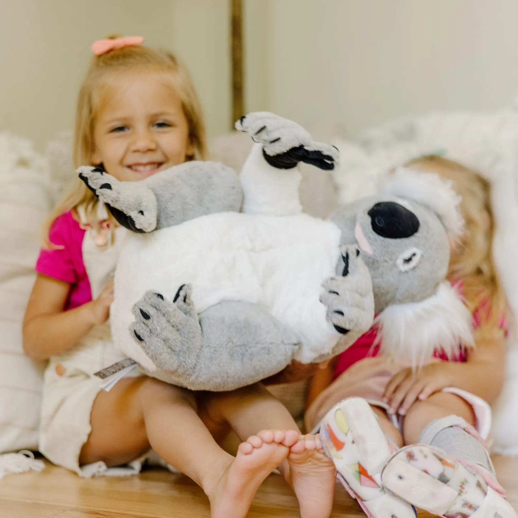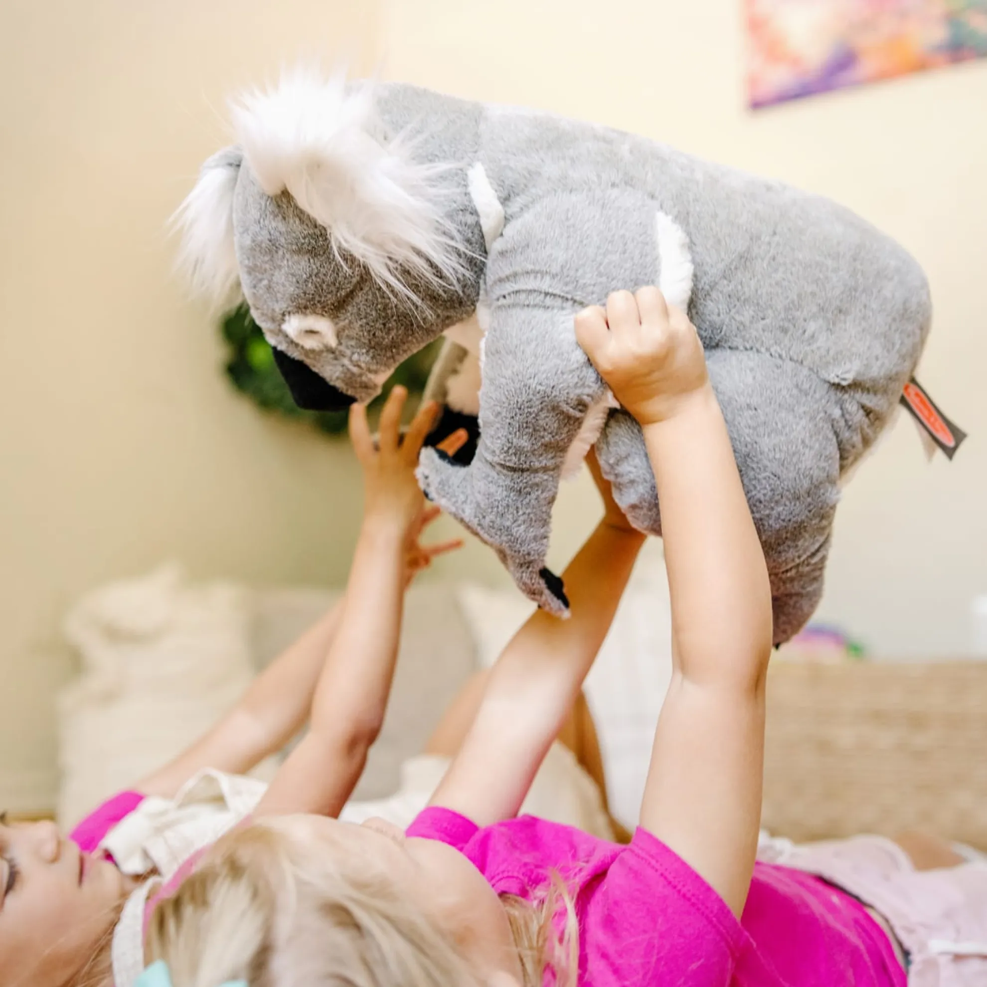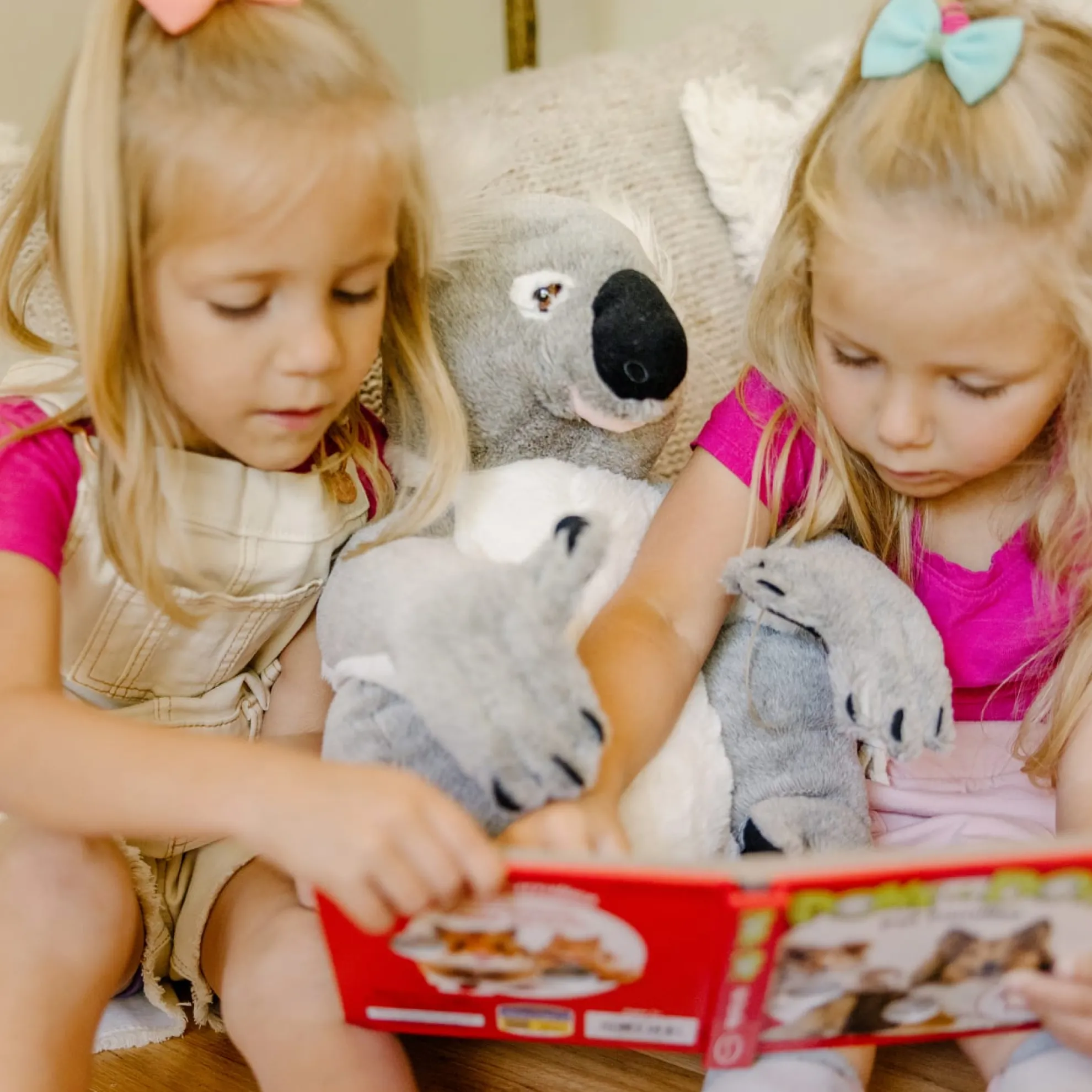 G’day, koala lovers! This adorable gray and white plush koala is ready to snuggle on a child’s lap and become a lifelong friend. Its fur is so soft and pet-able, kids will never want to put it down! Realistic details include big shaggy ears, deep brown eyes, a squishy nose, pink tongue, sweet expression, and fingers and toes with soft, sewn-in “claws.” The koala sits about 14 inches high.