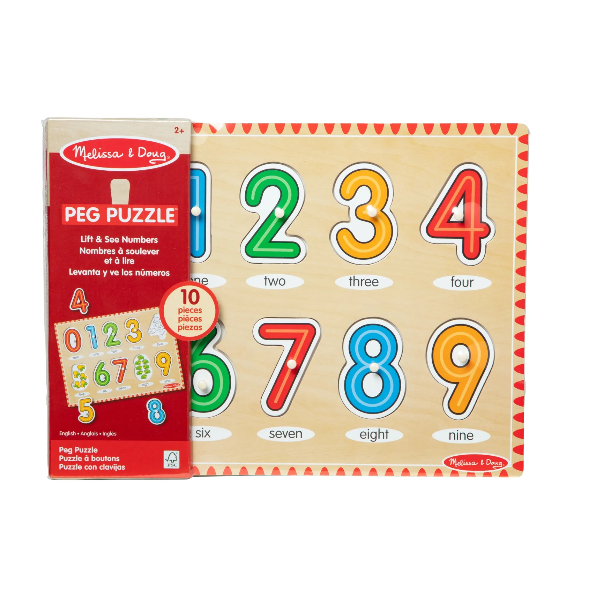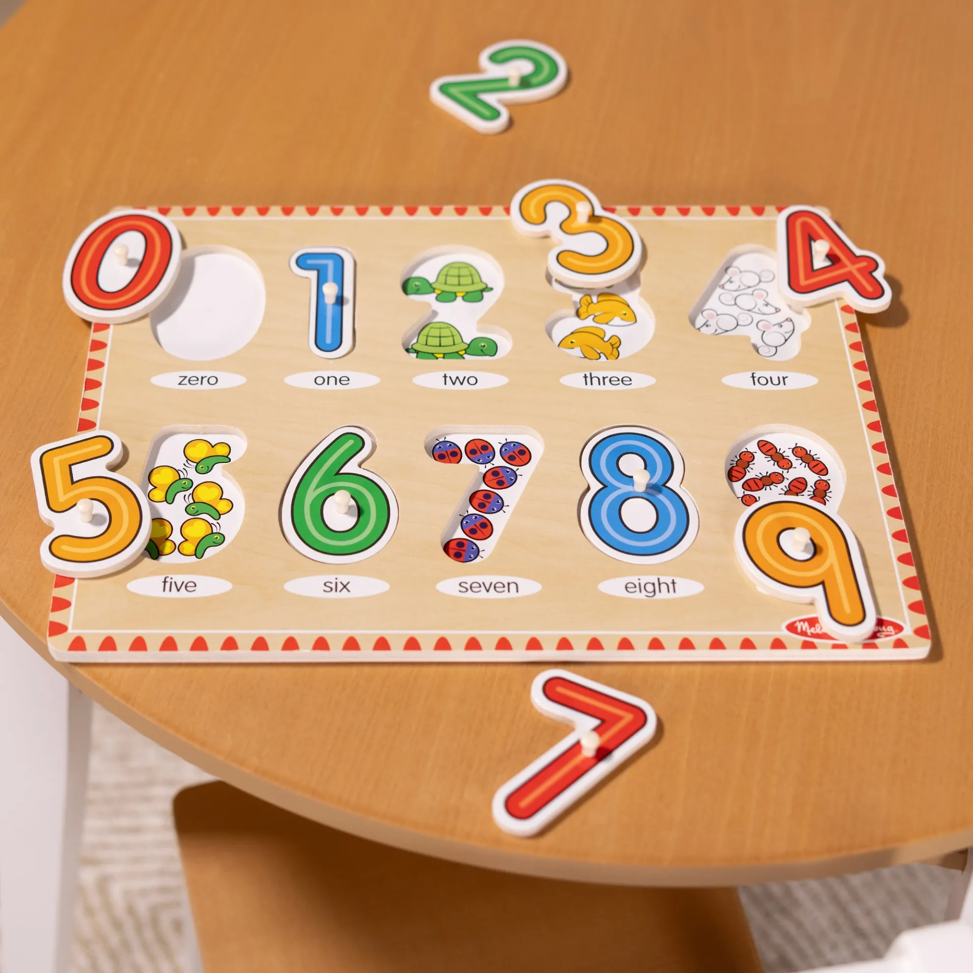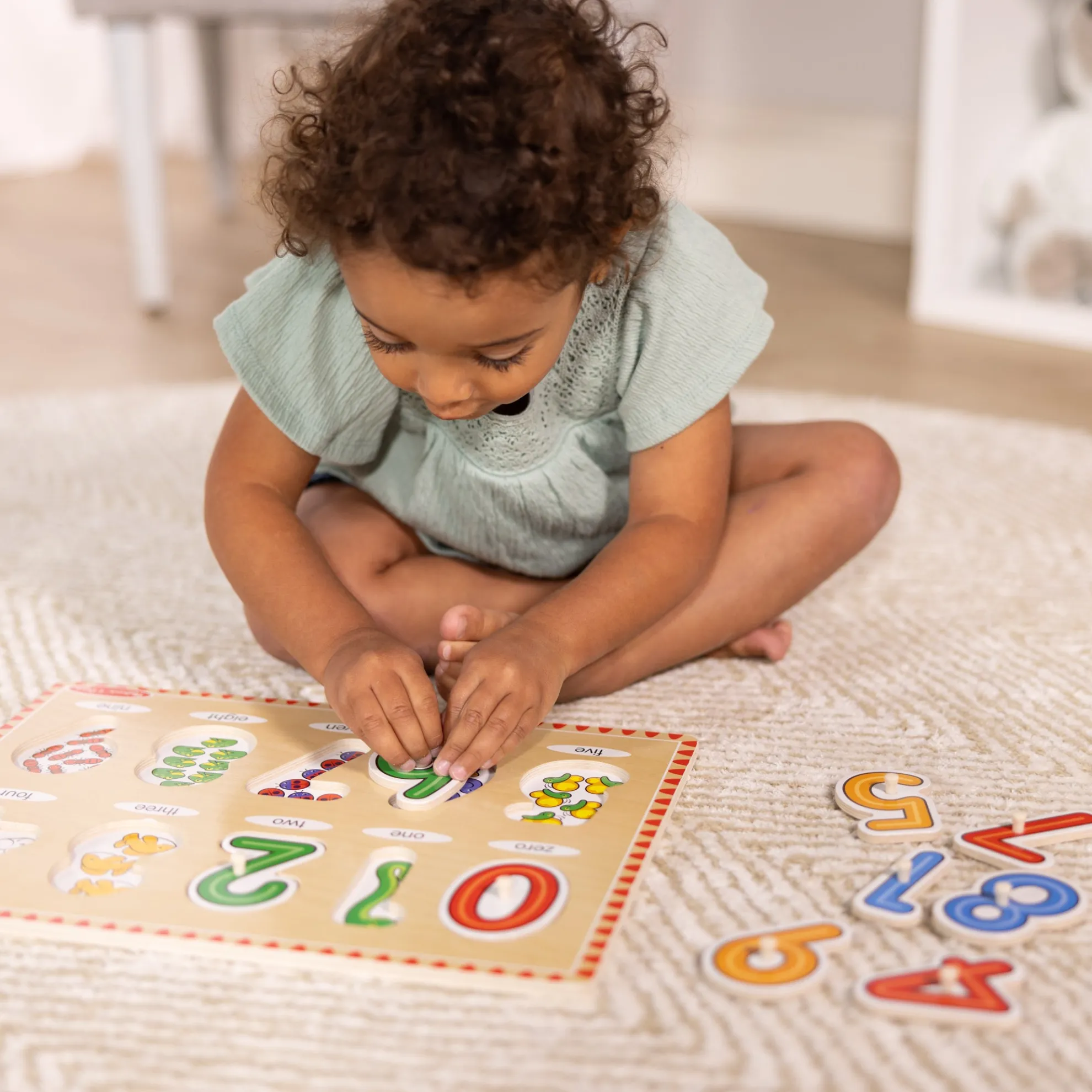 Number concepts, zero through nine, are illustrated in this 10-piece peg puzzle. A colorful picture under each piece shows the same number of items as the numeral on top of the piece, helping promote number recognition and counting skills! Encourages hand-eye, fine motor and visual perception skills. This product is certified by the Forest Stewardship Council. FSC certification ensures that products come from responsibly managed forests that provide environmental, social, and economic benefits, and that forests are protected for future generations. Please note that FSC certification applies to new inventory only (FSC C156584)