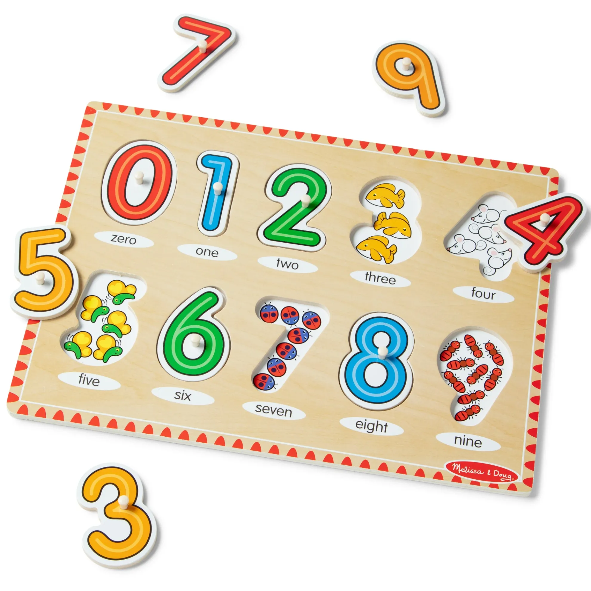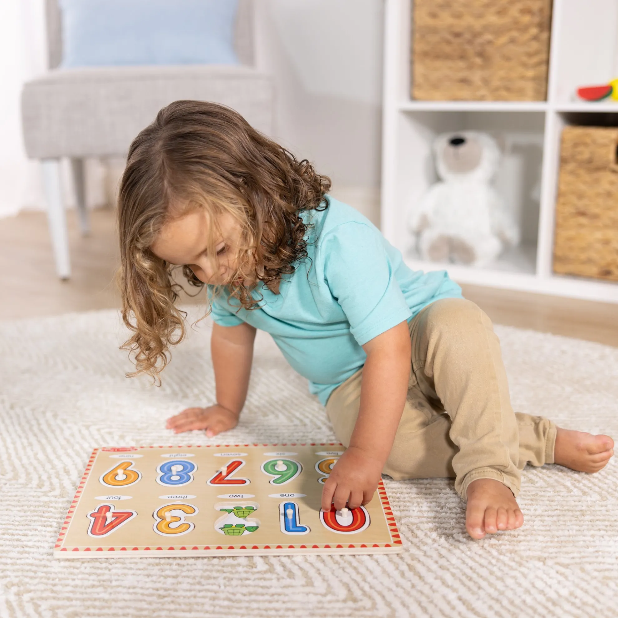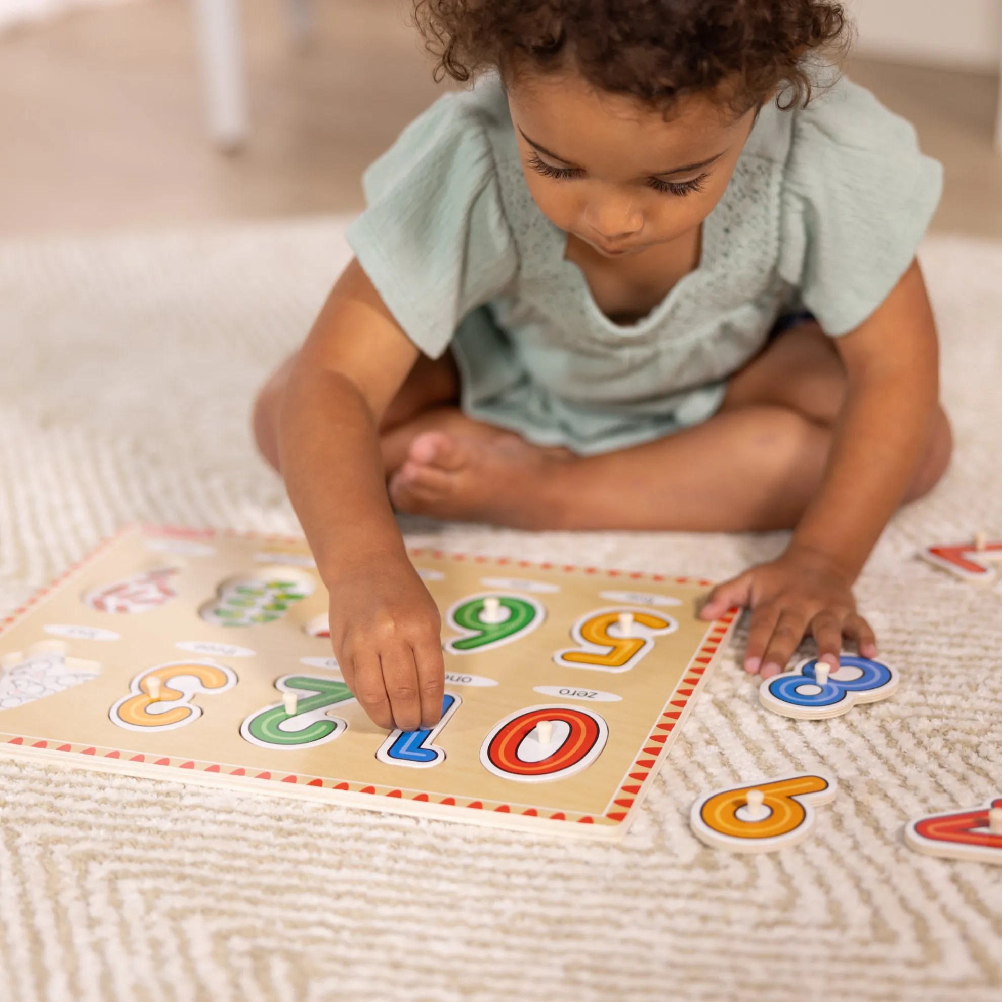Number concepts, zero through nine, are illustrated in this 10-piece peg puzzle. A colorful picture under each piece shows the same number of items as the numeral on top of the piece, helping promote number recognition and counting skills! Encourages hand-eye, fine motor and visual perception skills. This product is certified by the Forest Stewardship Council. FSC certification ensures that products come from responsibly managed forests that provide environmental, social, and economic benefits, and that forests are protected for future generations. Please note that FSC certification applies to new inventory only (FSC C156584)