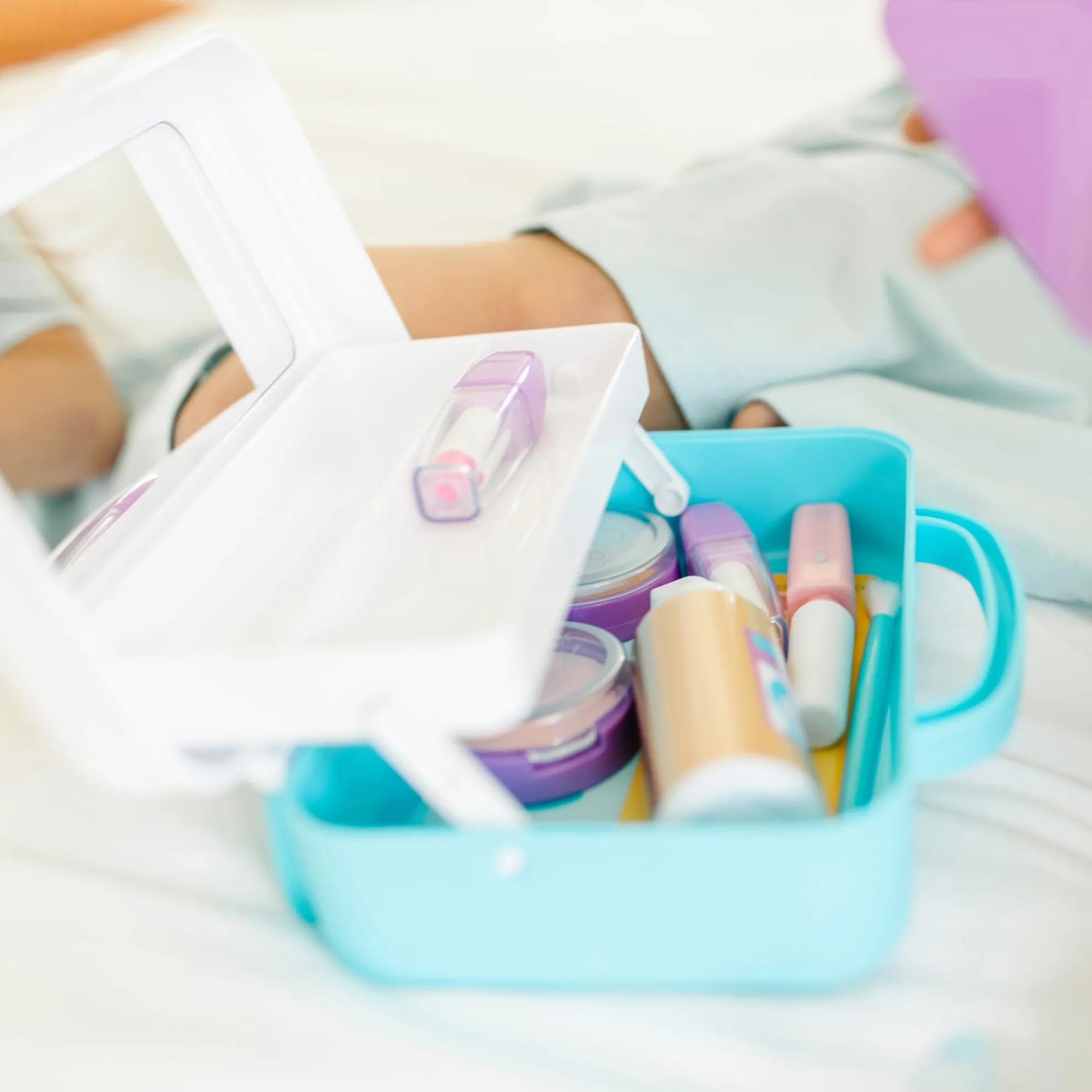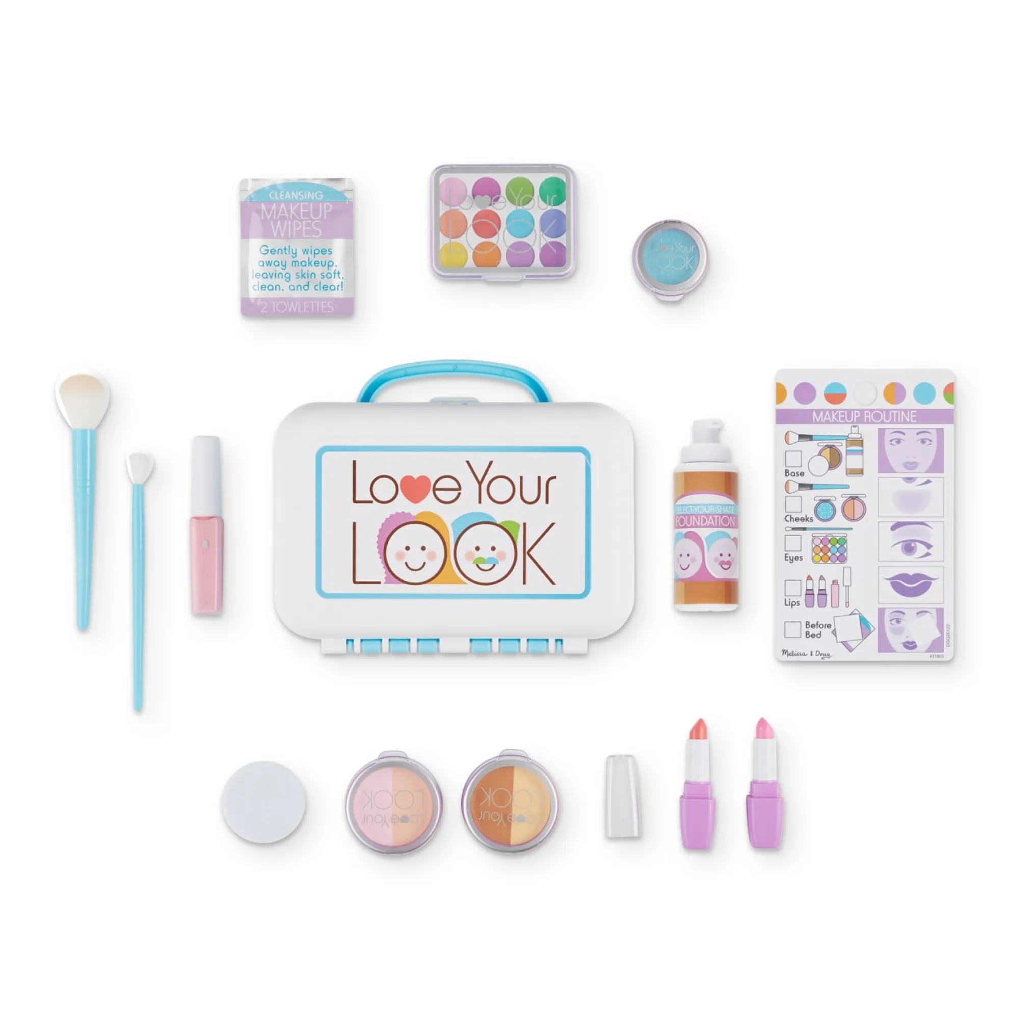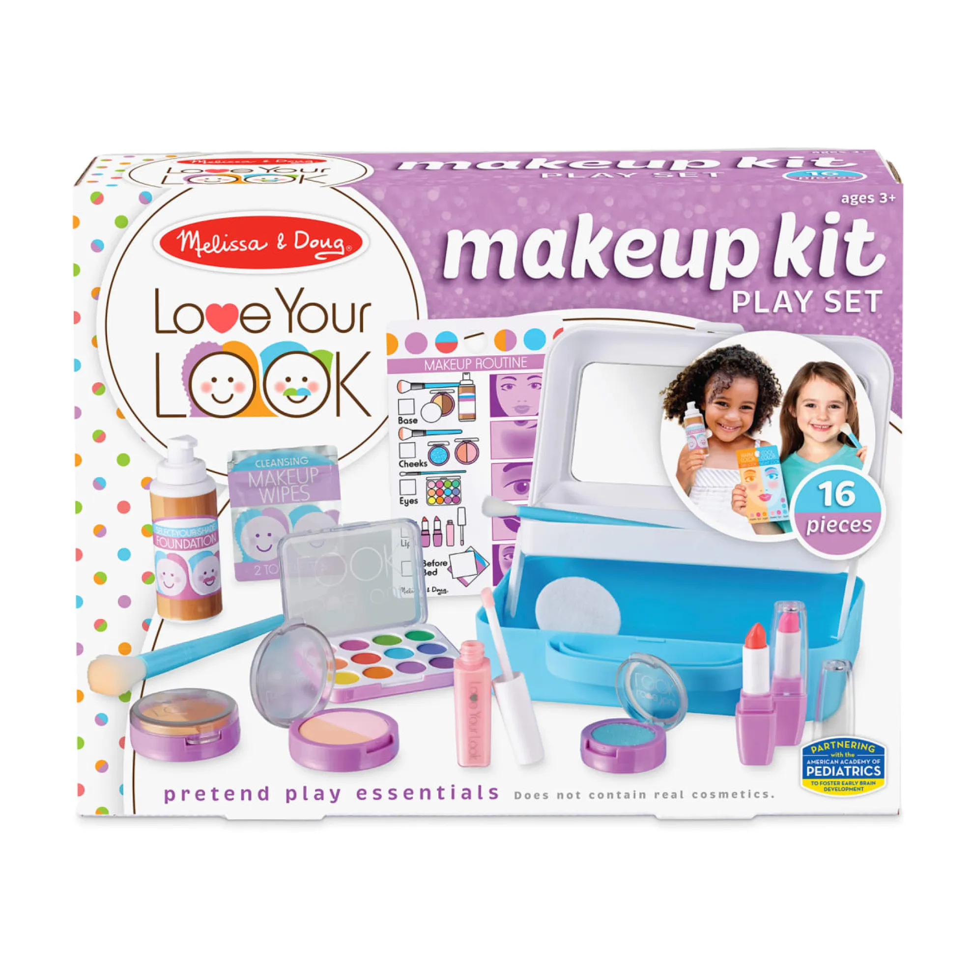 Perfect for mess-free imaginative play, THIS SET DOES NOT CONTAIN REAL COSMETICS. The 16-piece play set gives kids everything they need to play makeup artist and to practice daily skin care and makeup routines! Application brushes and play accessories for eyes, lips, and face, including an empty foundation pump bottle, compacts for pretend blush, powder, and glitter, pretend gloss and lipsticks, and a play eye shadow palette, let kids imagine different looks. Accessories look real but are toys–items do not contain cosmetics and no color is transferred, giving countless hours of mess-free imaginative play! Everything, including 2 cloth makeup wipes in a resealable pouch and a reusable activity card, stores in a portable, durable makeup kit with built-in mirror! Role playing real-life experiences with Love Your Look play sets is a great way for kids three and older to build confidence, empathy, and self-esteem.