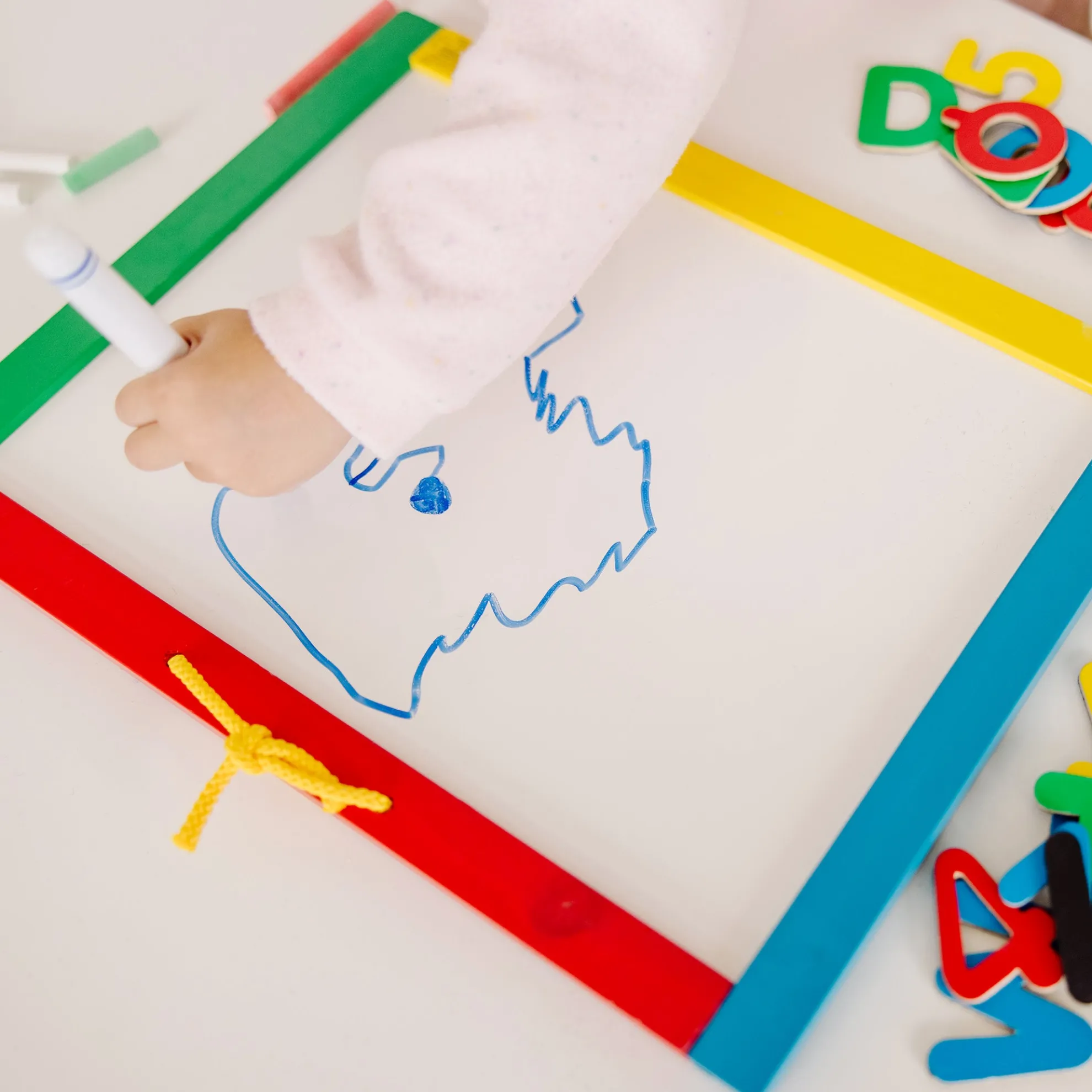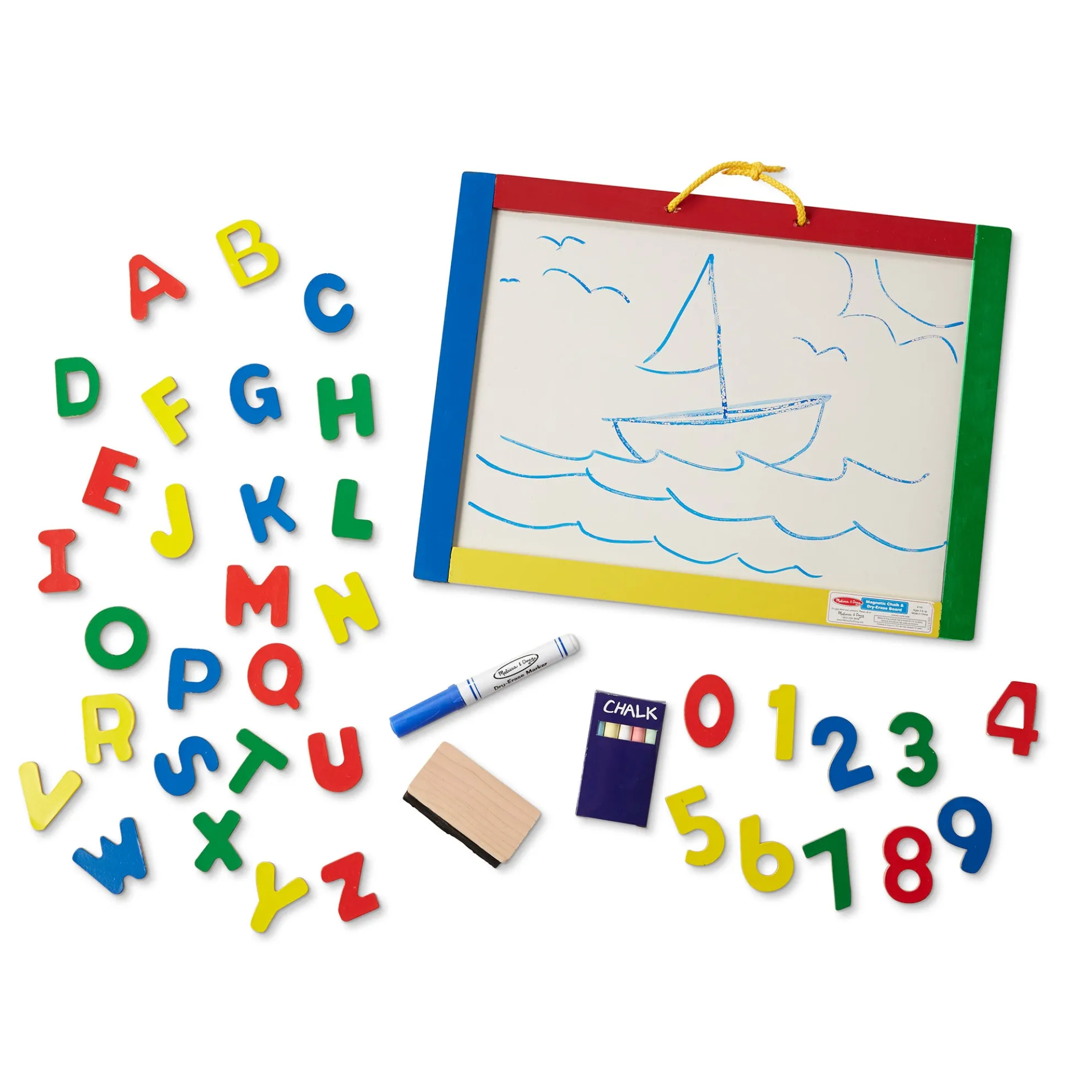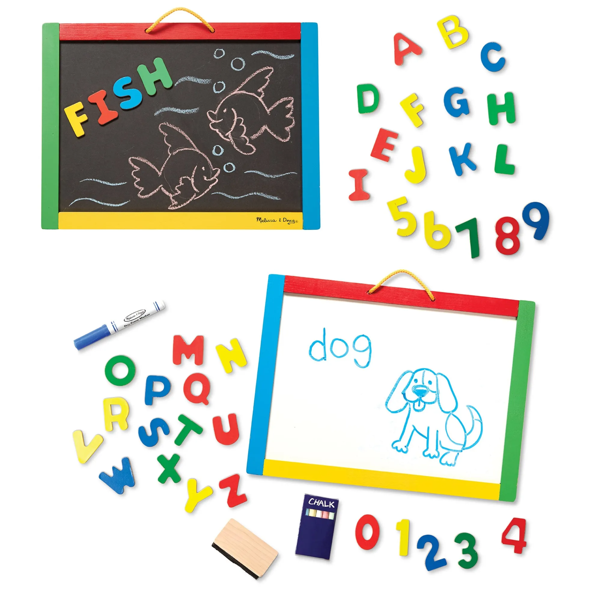 Your child can have twice as much fun with this double-sided activity board! The Melissa & Doug Magnetic Chalk & Dry-Erase Board features a magnetic chalkboard on one side, and a dry-erase board on the other. It comes with three sticks of colored chalk, a dry-erase marker, eraser, and 36 bold magnetic uppercase letters and numbers. Little artists can express themselves in so many ways as they draw, spell, count, and engage in pretend play. The Classic Toy also provides opportunities for kids to practice letter, number, and color recognition, and fine motor skills. It’s a great toy to share with friends and other family members. The 16-inch x 12-inch board is constructed of high-quality durable wood, and has a handle making it easy for little ones to carry or hang up for display. The activity board makes a great gift for kids ages three and older for hands-on, screen-free play.