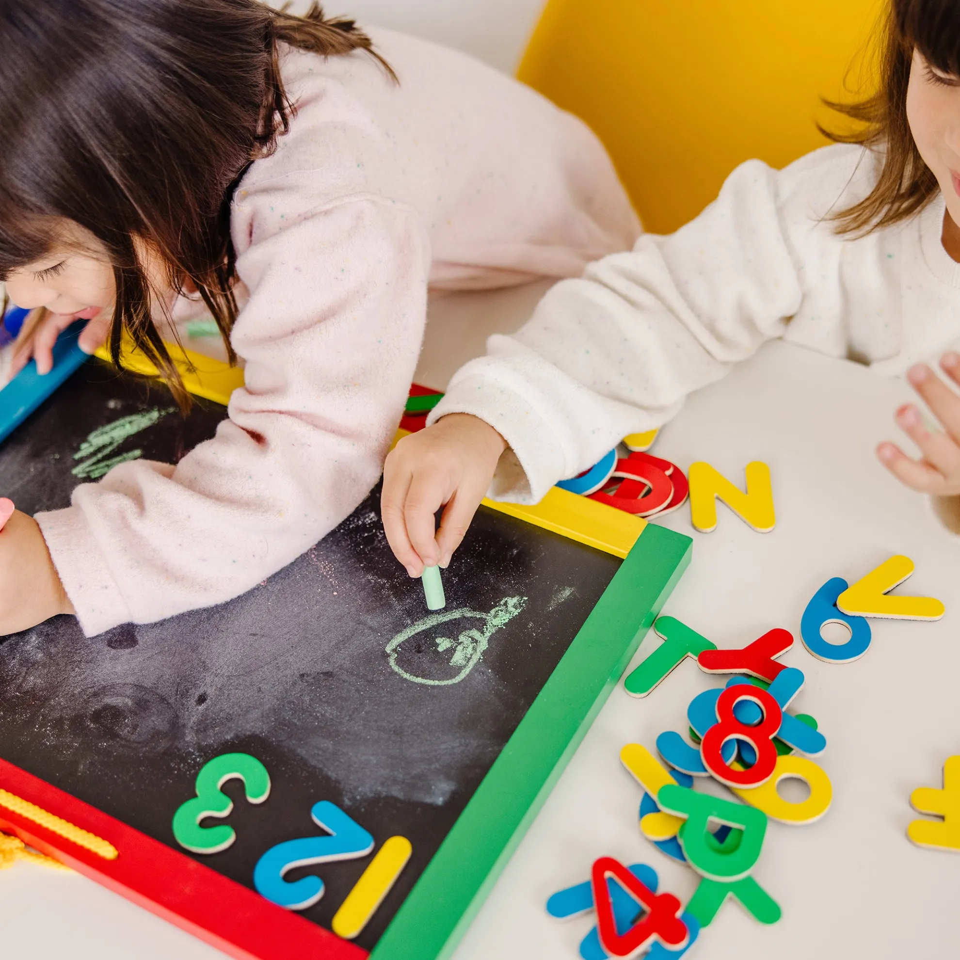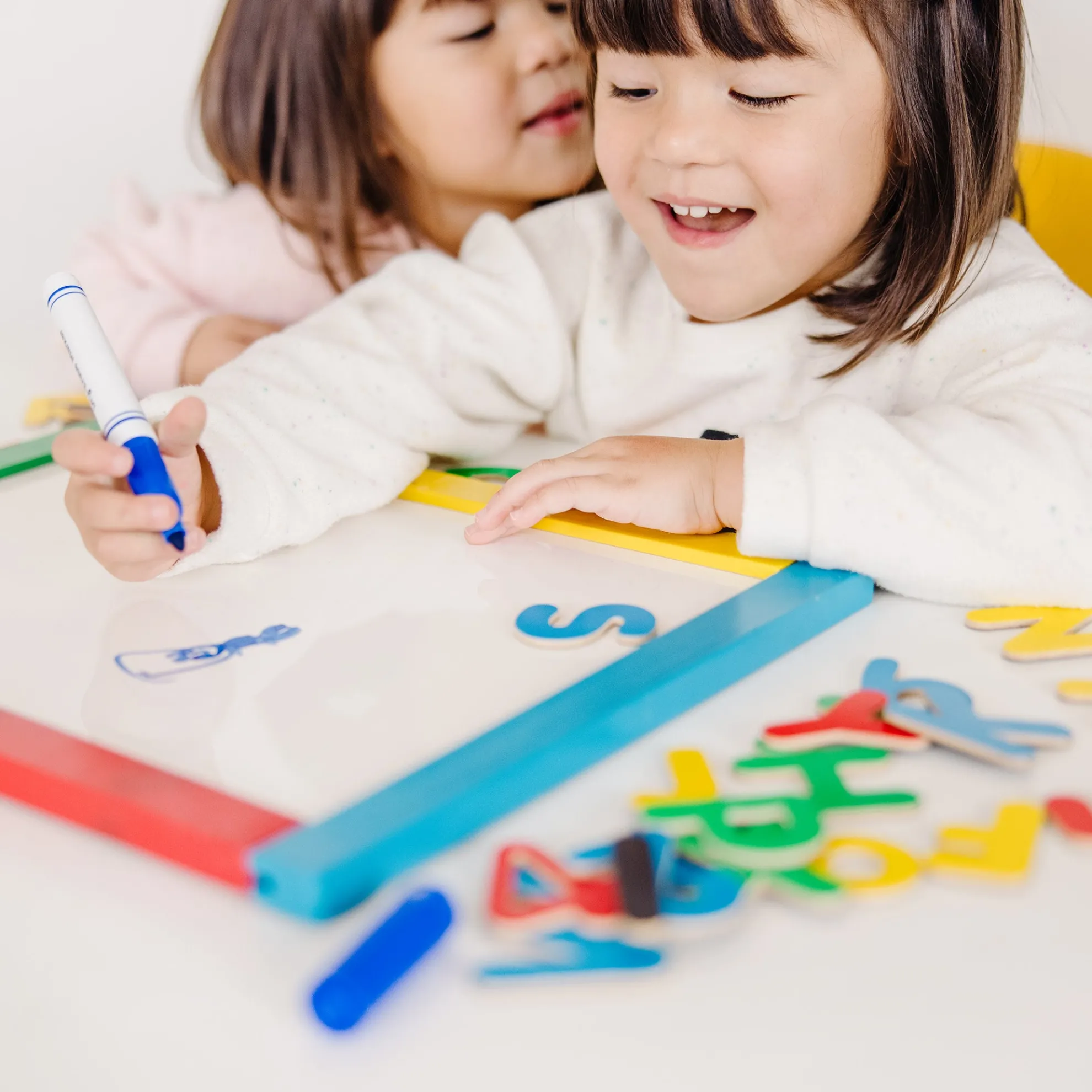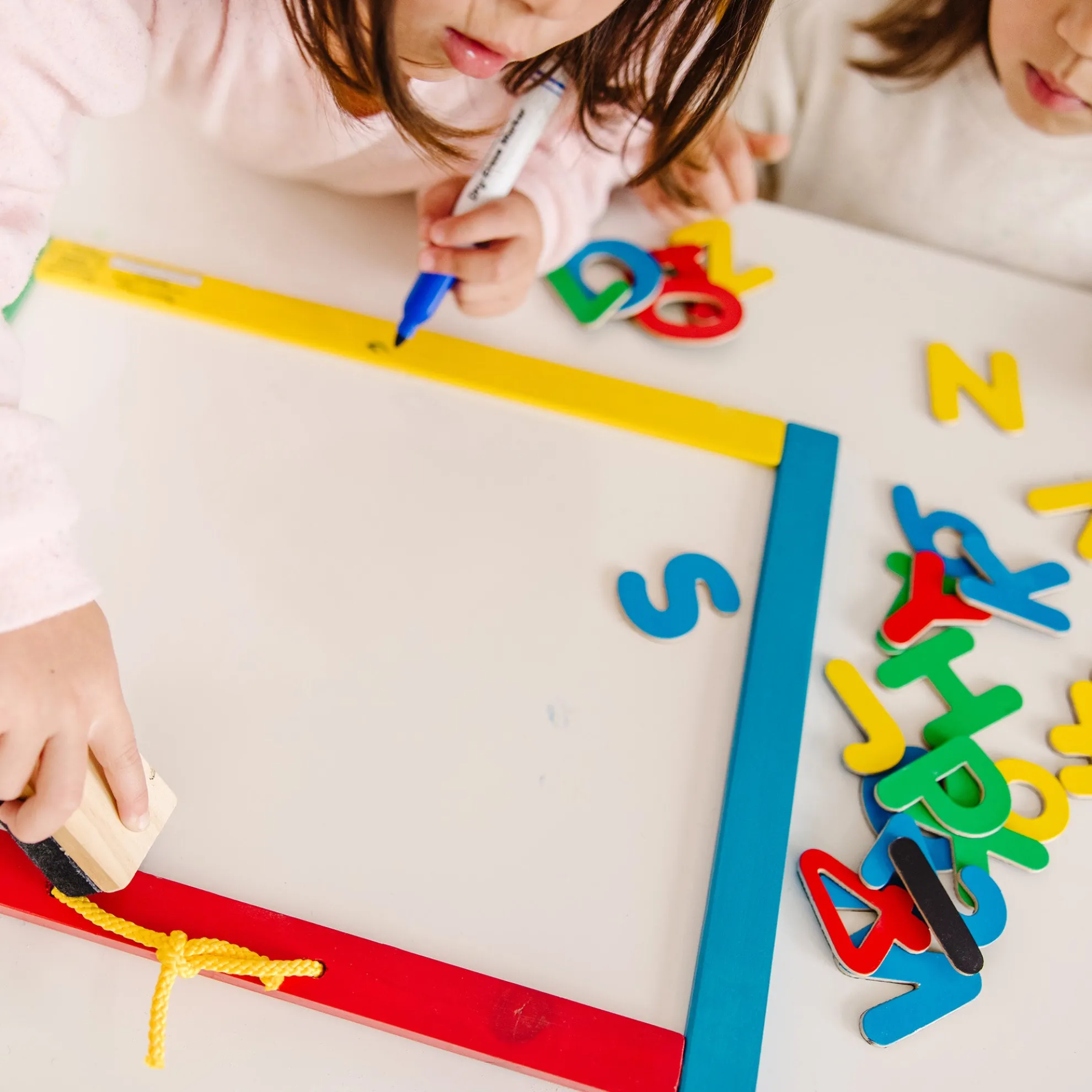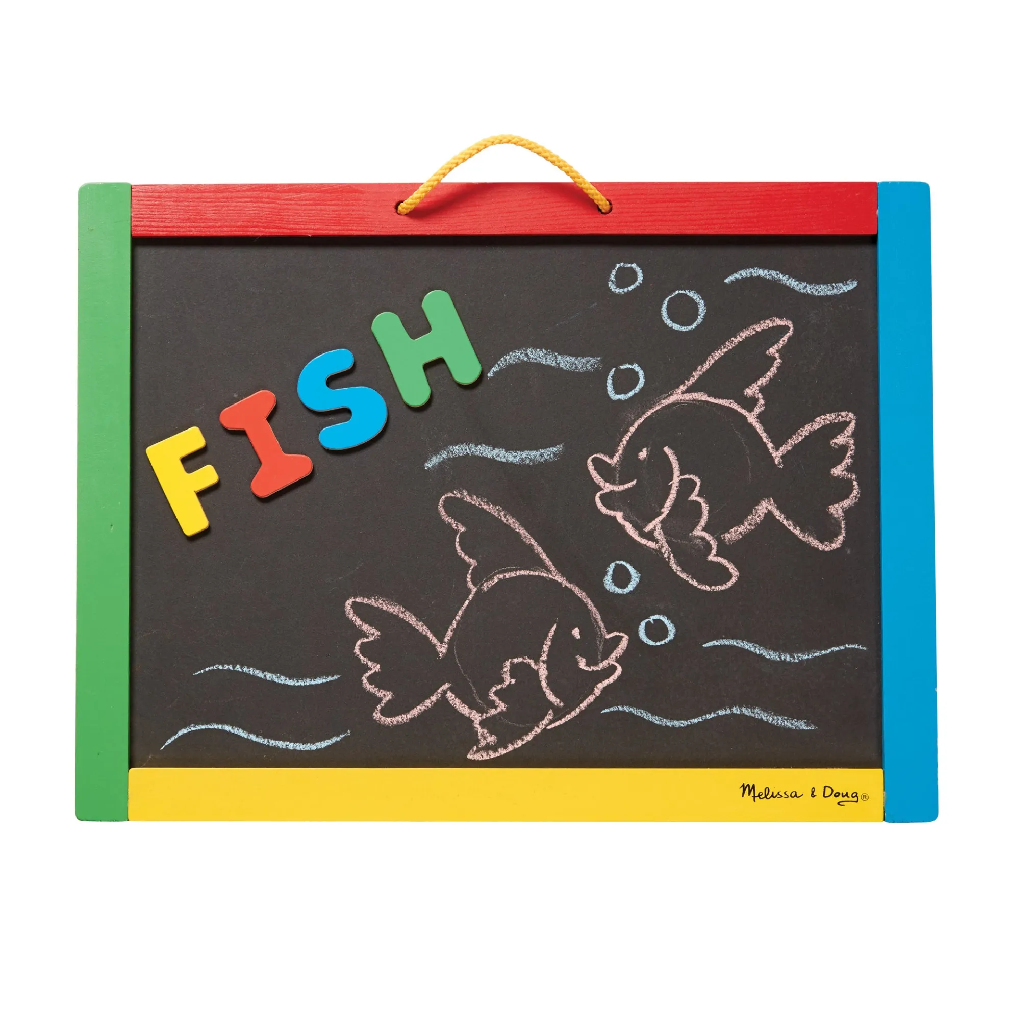 Your child can have twice as much fun with this double-sided activity board! The Melissa & Doug Magnetic Chalk & Dry-Erase Board features a magnetic chalkboard on one side, and a dry-erase board on the other. It comes with three sticks of colored chalk, a dry-erase marker, eraser, and 36 bold magnetic uppercase letters and numbers. Little artists can express themselves in so many ways as they draw, spell, count, and engage in pretend play. The Classic Toy also provides opportunities for kids to practice letter, number, and color recognition, and fine motor skills. It’s a great toy to share with friends and other family members. The 16-inch x 12-inch board is constructed of high-quality durable wood, and has a handle making it easy for little ones to carry or hang up for display. The activity board makes a great gift for kids ages three and older for hands-on, screen-free play.