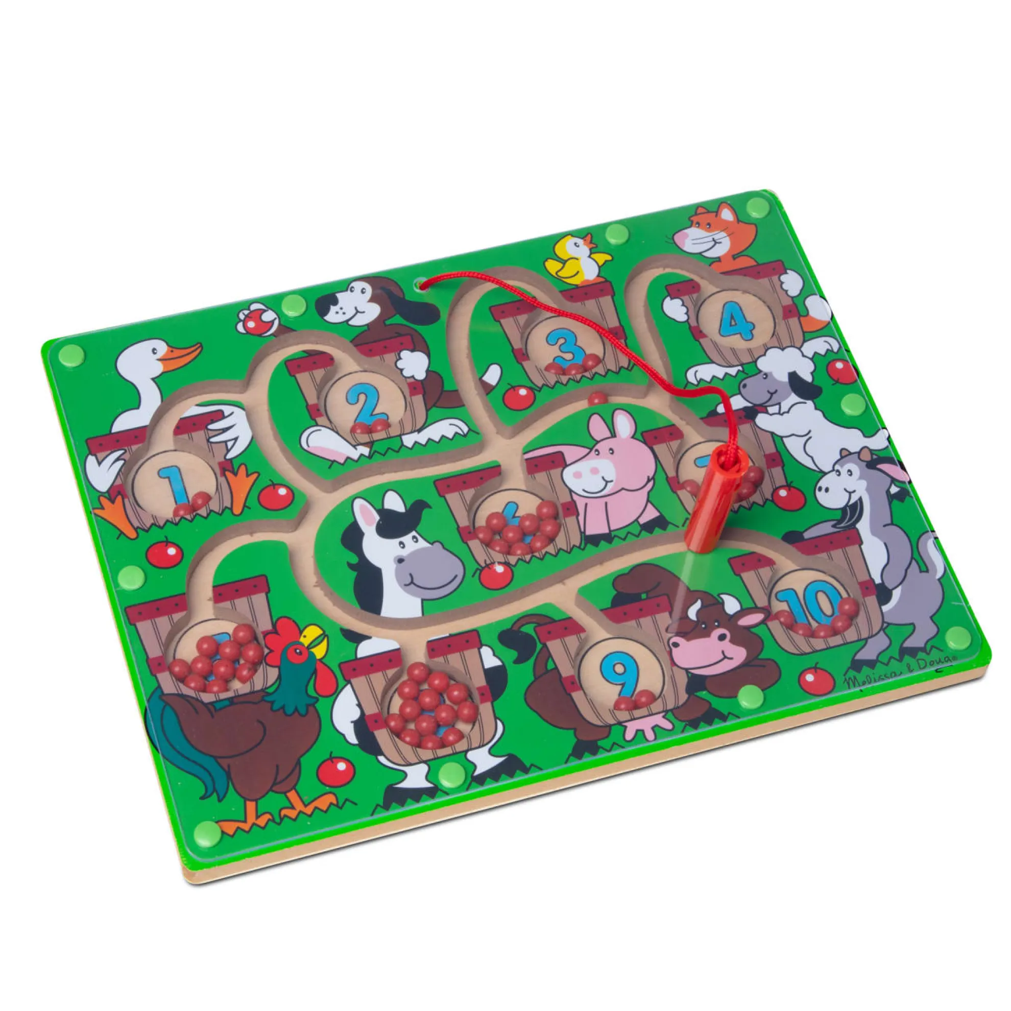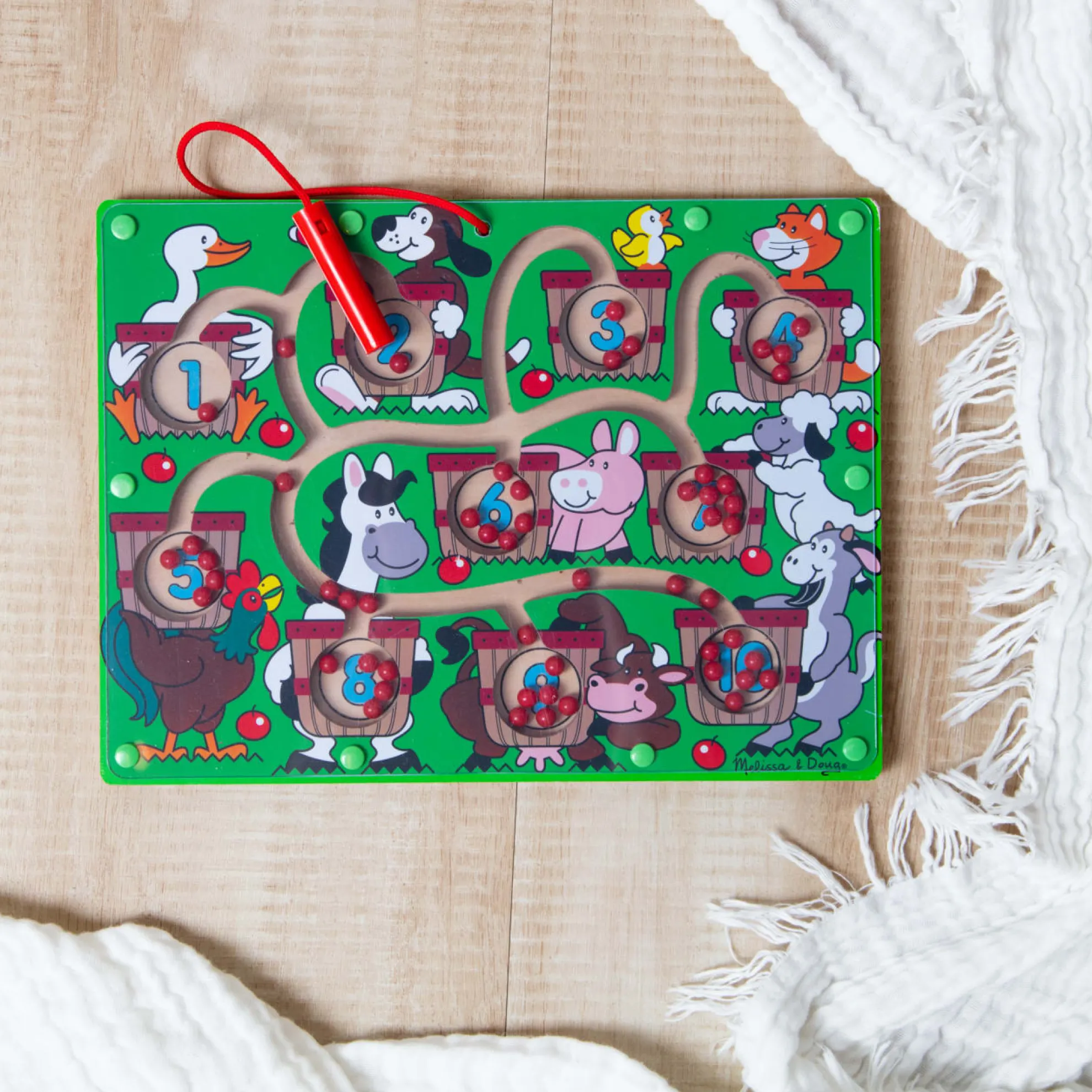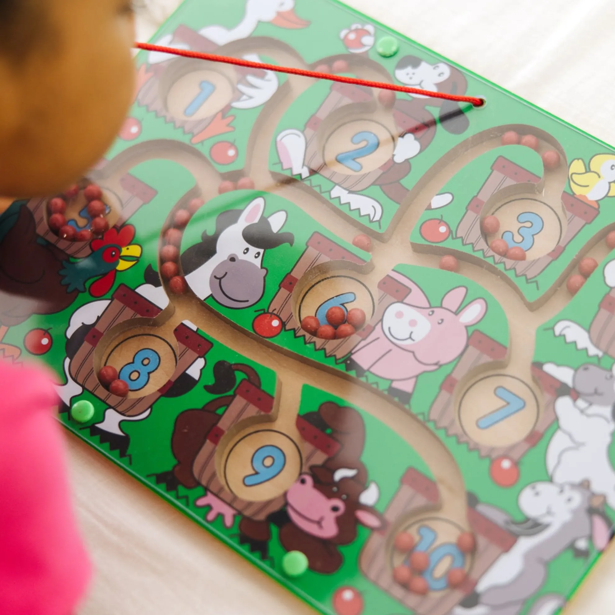 One for the goose and ten for the goat…in the Magnetic Wand Number Maze, the animals are counting on you! Fill each basket with the correct number of red “apples” by sliding the attached magnetic wand over the acrylic cover. Then move the apples to different areas of the maze game to add, subtract, and make child’s play out of math! The magnetic wand is attached so it won’t get lost; all other pieces are enclosed inside the maze, beneath the sturdy cover. Great for travel!