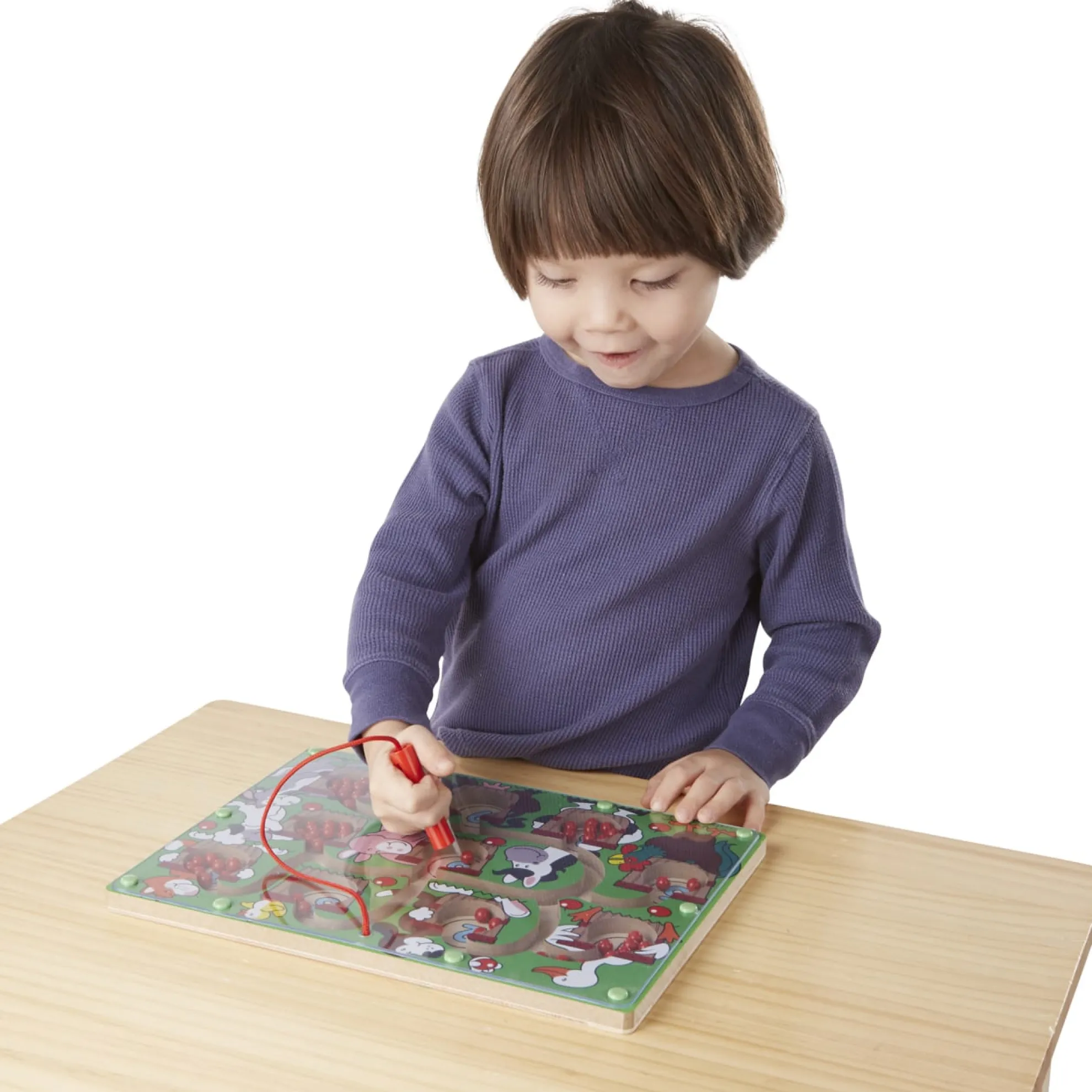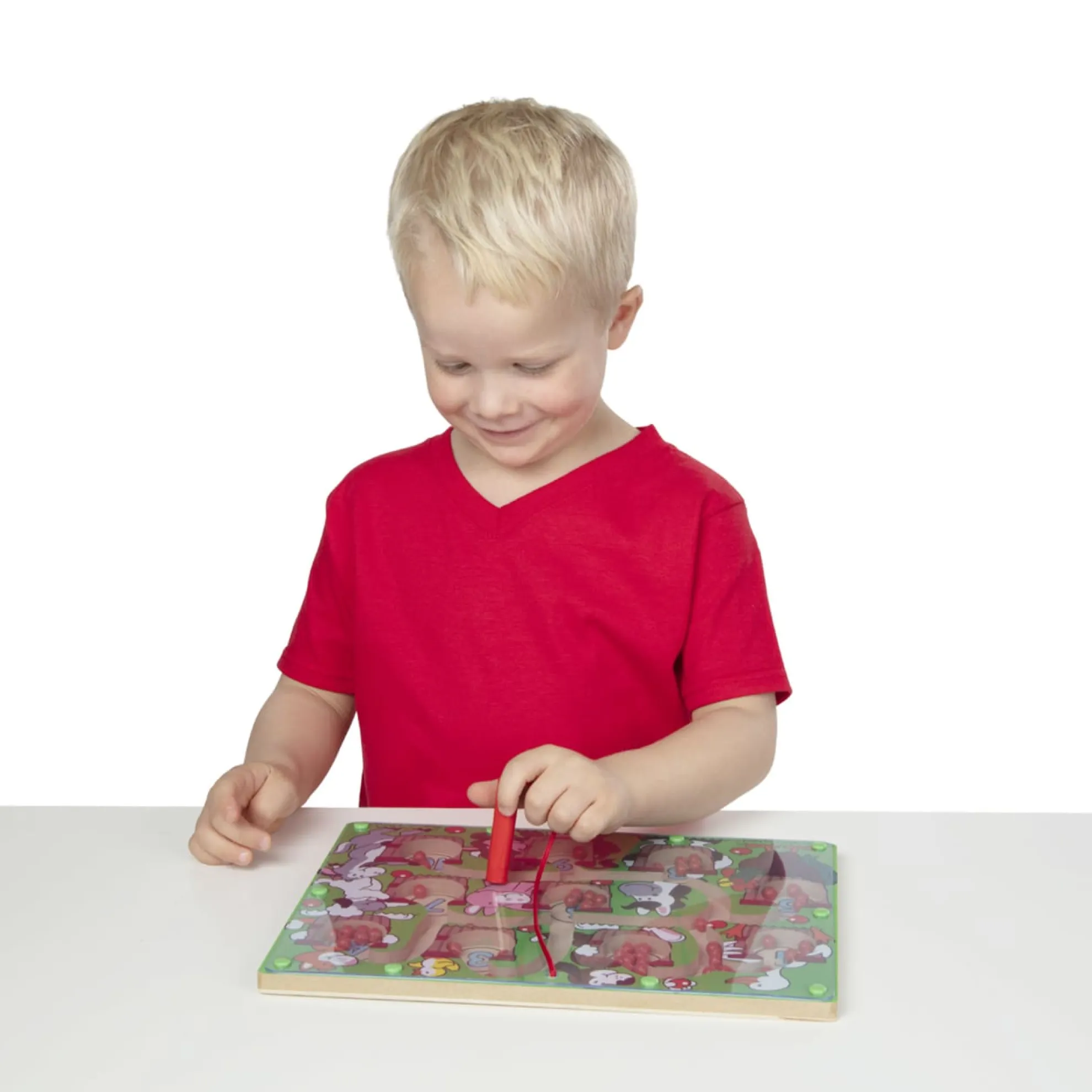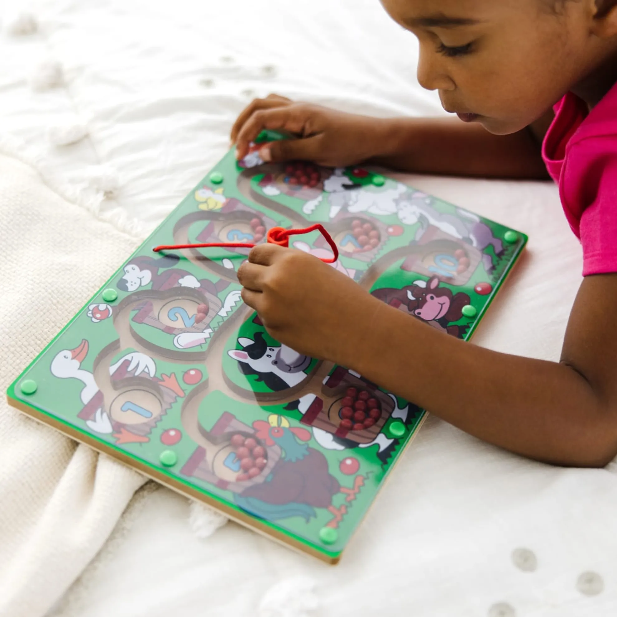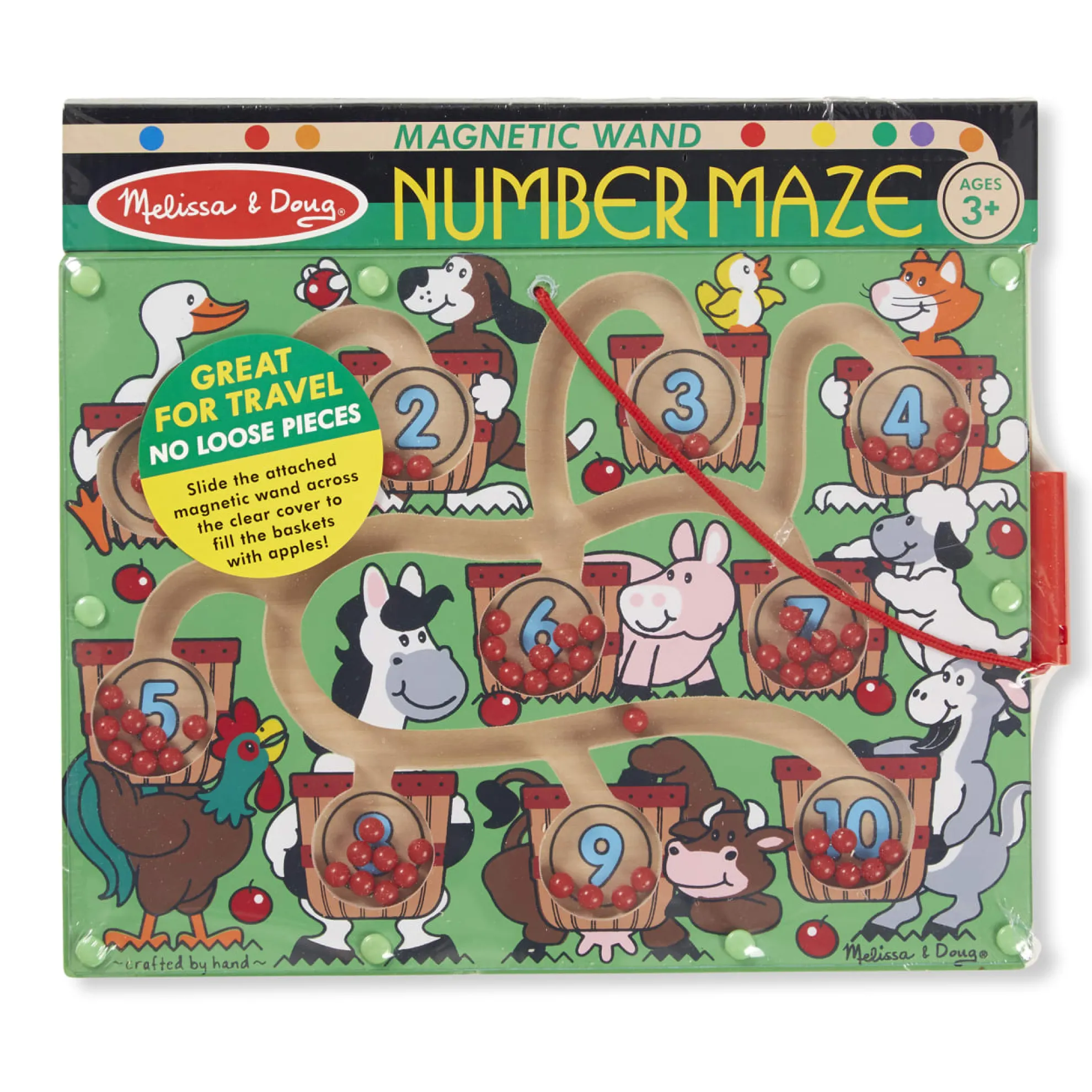 One for the goose and ten for the goat…in the Magnetic Wand Number Maze, the animals are counting on you! Fill each basket with the correct number of red “apples” by sliding the attached magnetic wand over the acrylic cover. Then move the apples to different areas of the maze game to add, subtract, and make child’s play out of math! The magnetic wand is attached so it won’t get lost; all other pieces are enclosed inside the maze, beneath the sturdy cover. Great for travel!