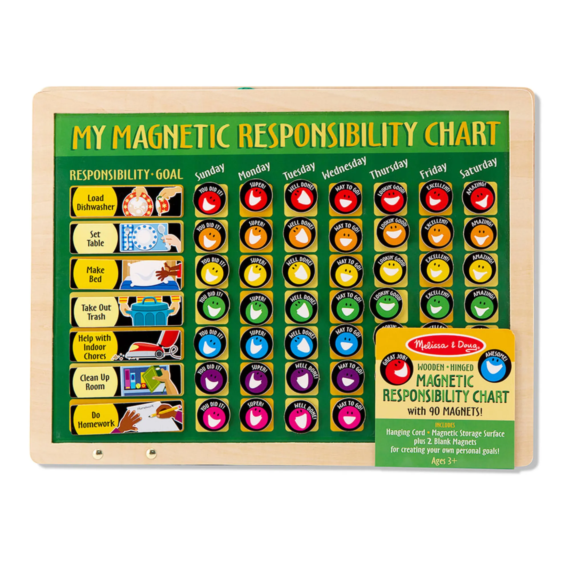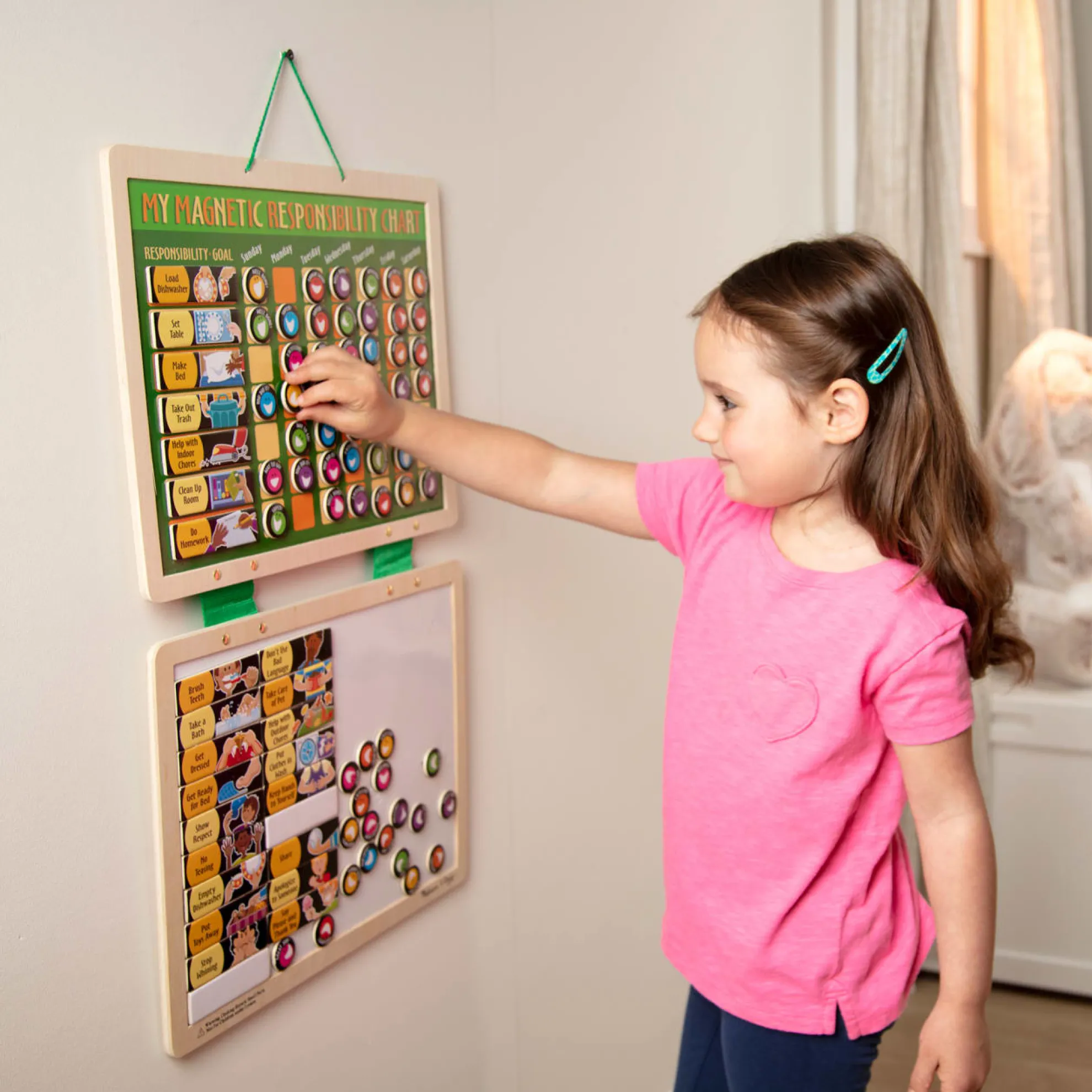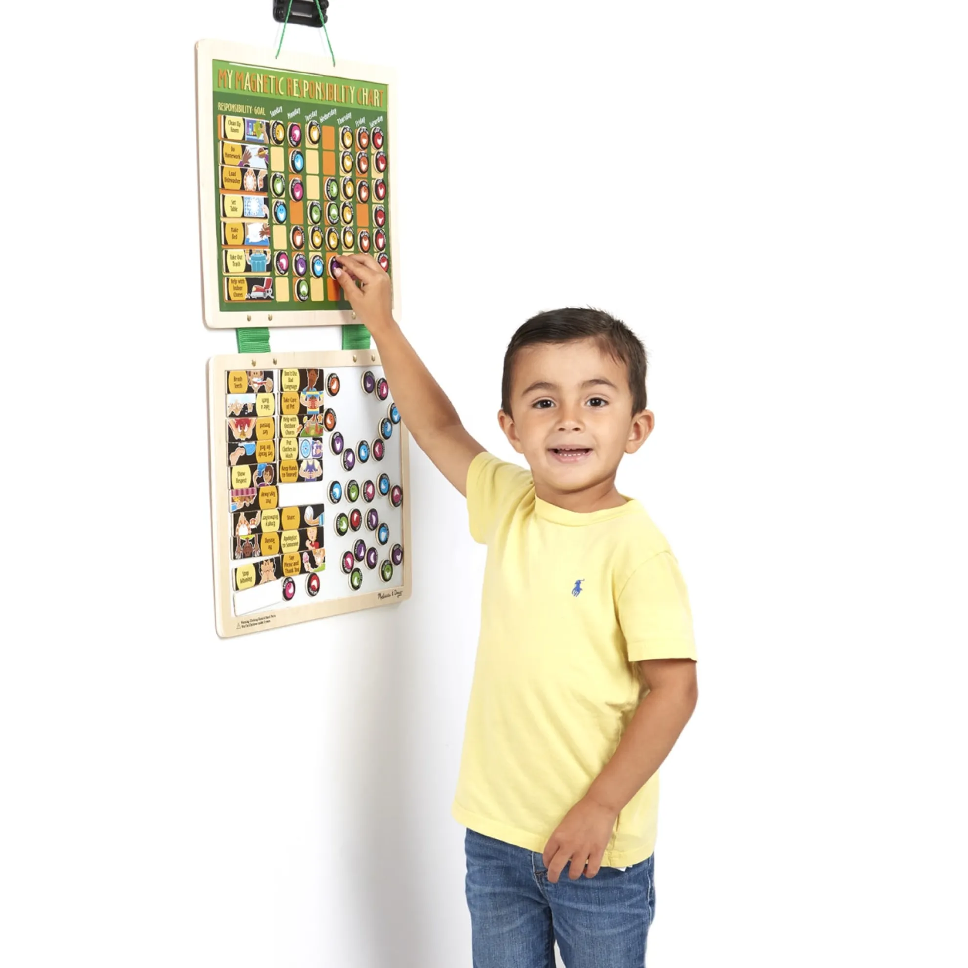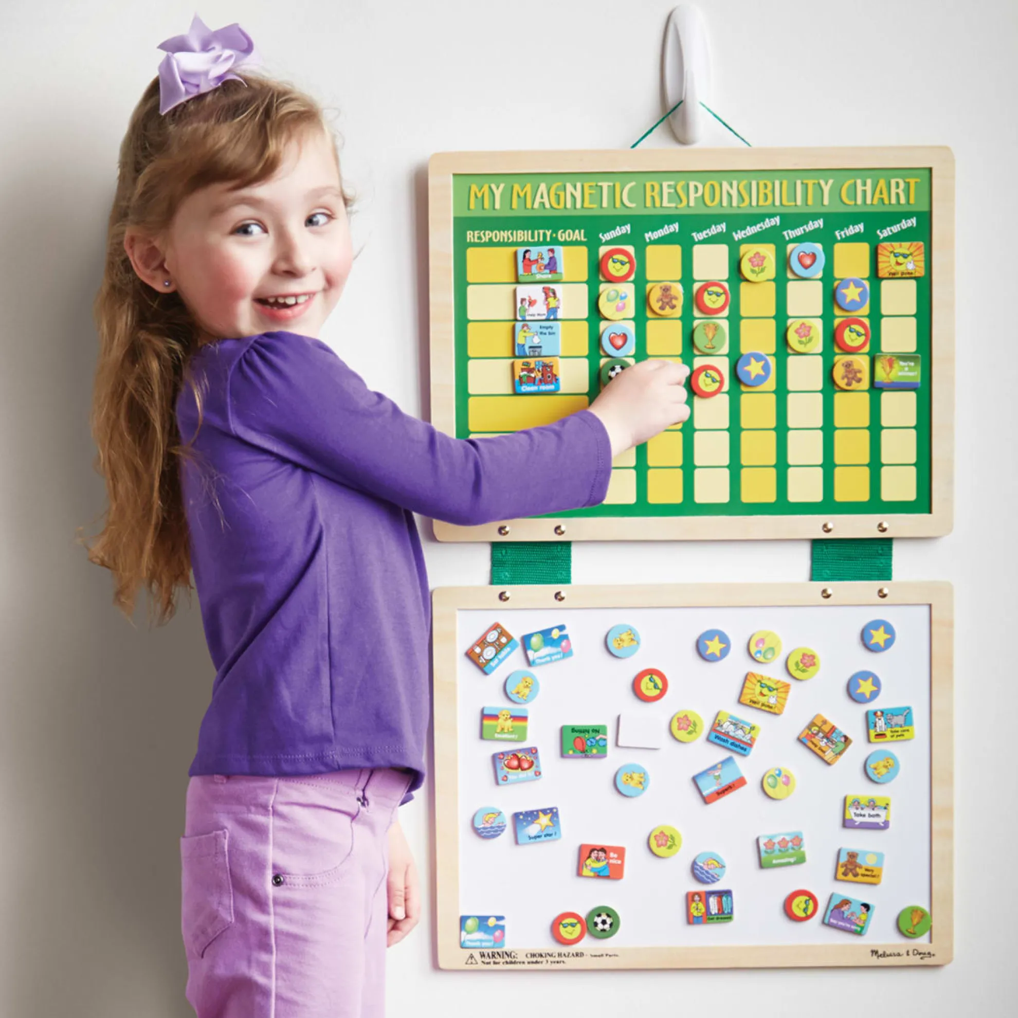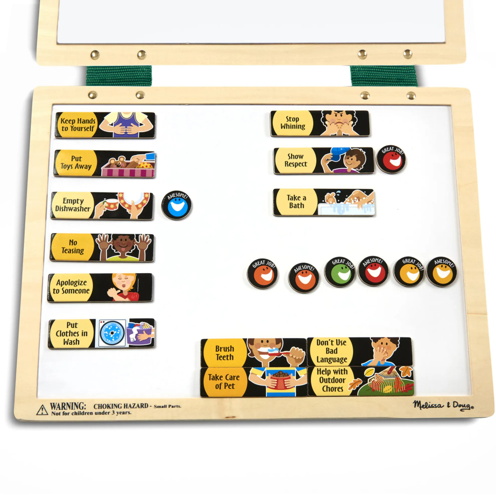 Catch children in the act of behaving well and reward them with a magnet on their hanging chore chart . . . then watch those good habits multiply! Open the fabric-hinged boards to reveal a behavior chart on one board, while the other board keeps all the magnets close at hand. A sturdy cord is attached for hanging. Includes dry-erase board and 90 magnets, including responsibilities, positive behaviors, and rewards.