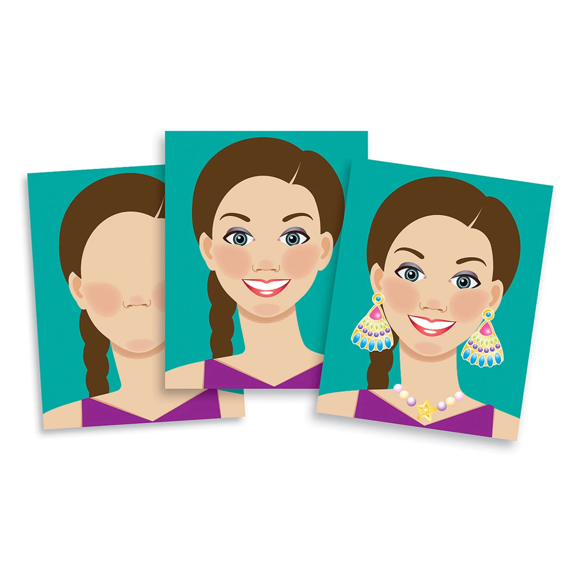 - Stickers include eyes, eyebrows, lips, necklaces, earrings, headbands, barrettes and glasses