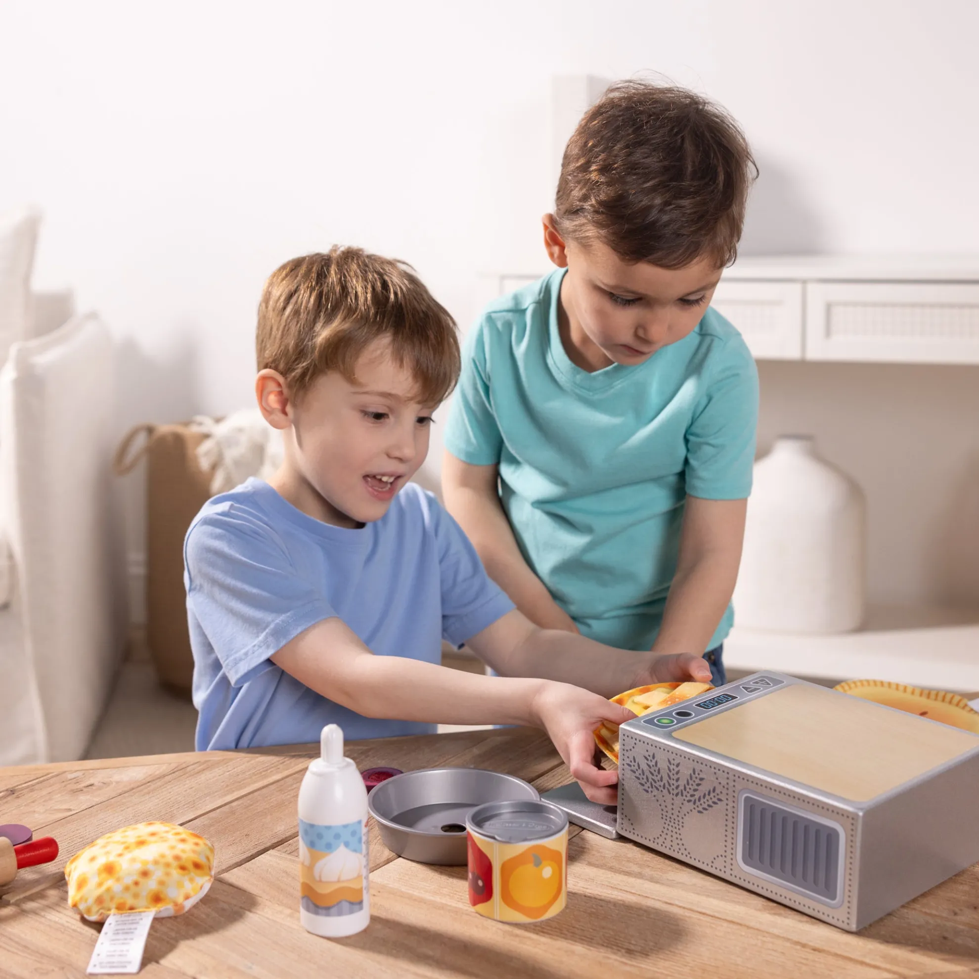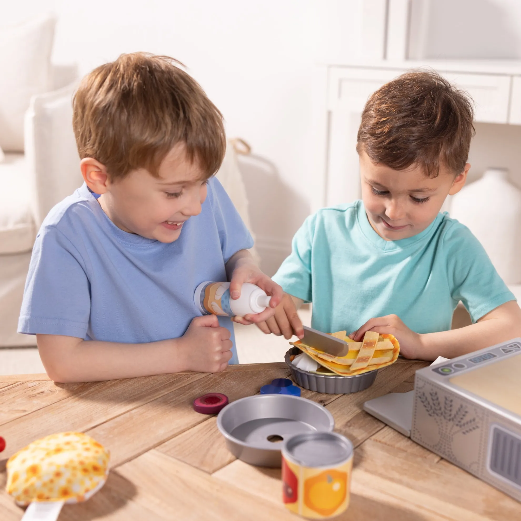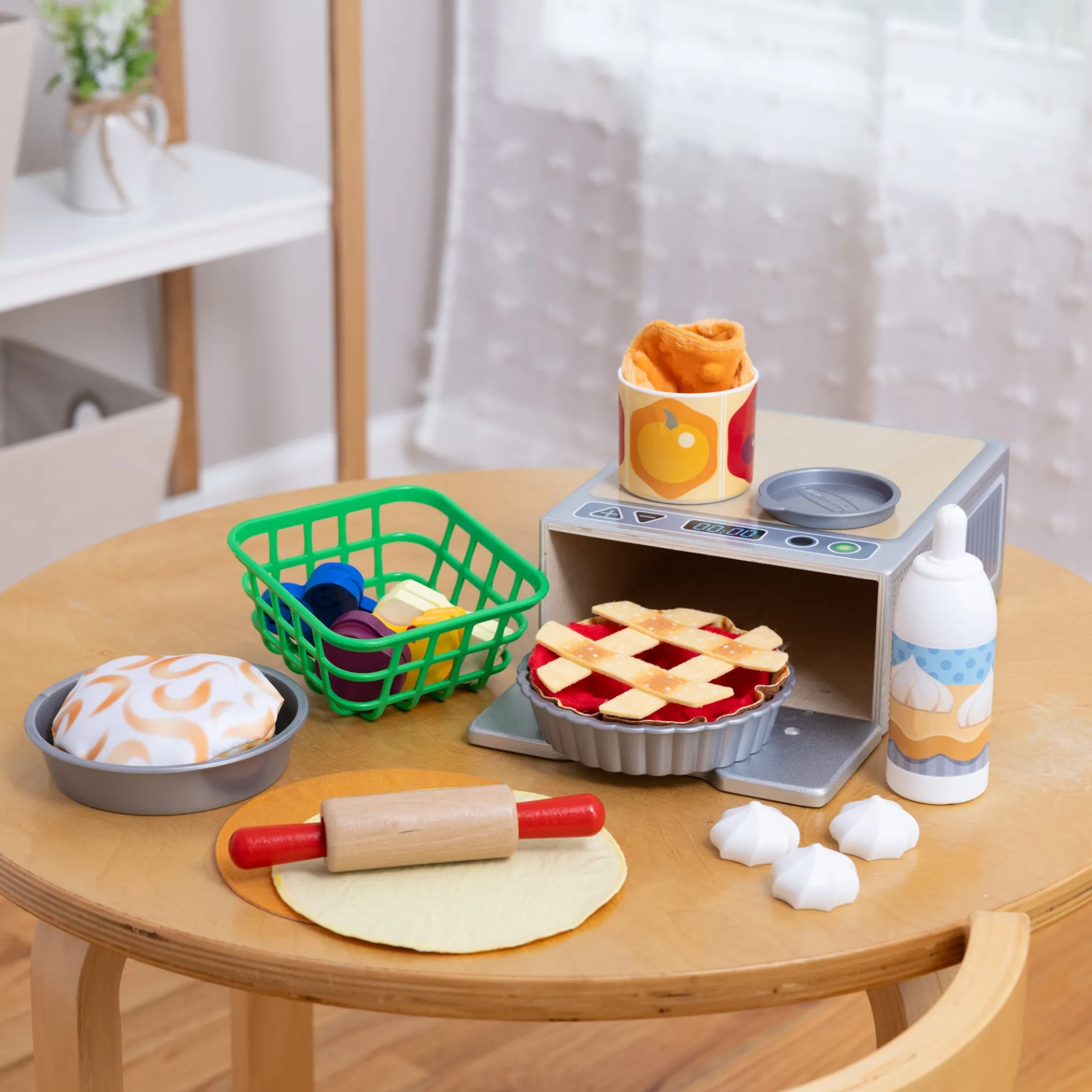 Feed hungry imaginations! The Melissa & Doug 27-piece pretend play pie-making set has everything kids need to prep, put together, and “bake” deliciously imaginative play pies. Roll a squishable, moldable fabric pie crust dough flat with the wooden rolling pin, then press it to form-fit into pie tins. Fill with double-sided puffy fabric filling for meringue or crumble-topped pie; with sliceable wooden fruit for blueberry, cherry, peach, or apple pies; or with double-side textured filling from a play can for pumpkin or cherry pies! Top with a lattice crust and pop a pie into the sturdy wooden play oven with built-in cutting board to “bake”! Top creations with shaped whipped cream dollops for scrumptious-looking play pies! This product is certified by the Forest Stewardship Council. FSC certification ensures that products come from responsibly managed forests that provide environmental, social, and economic benefits, and that forests are protected for future generations. Please note that FSC certification applies to new inventory only (FSC C156584)
