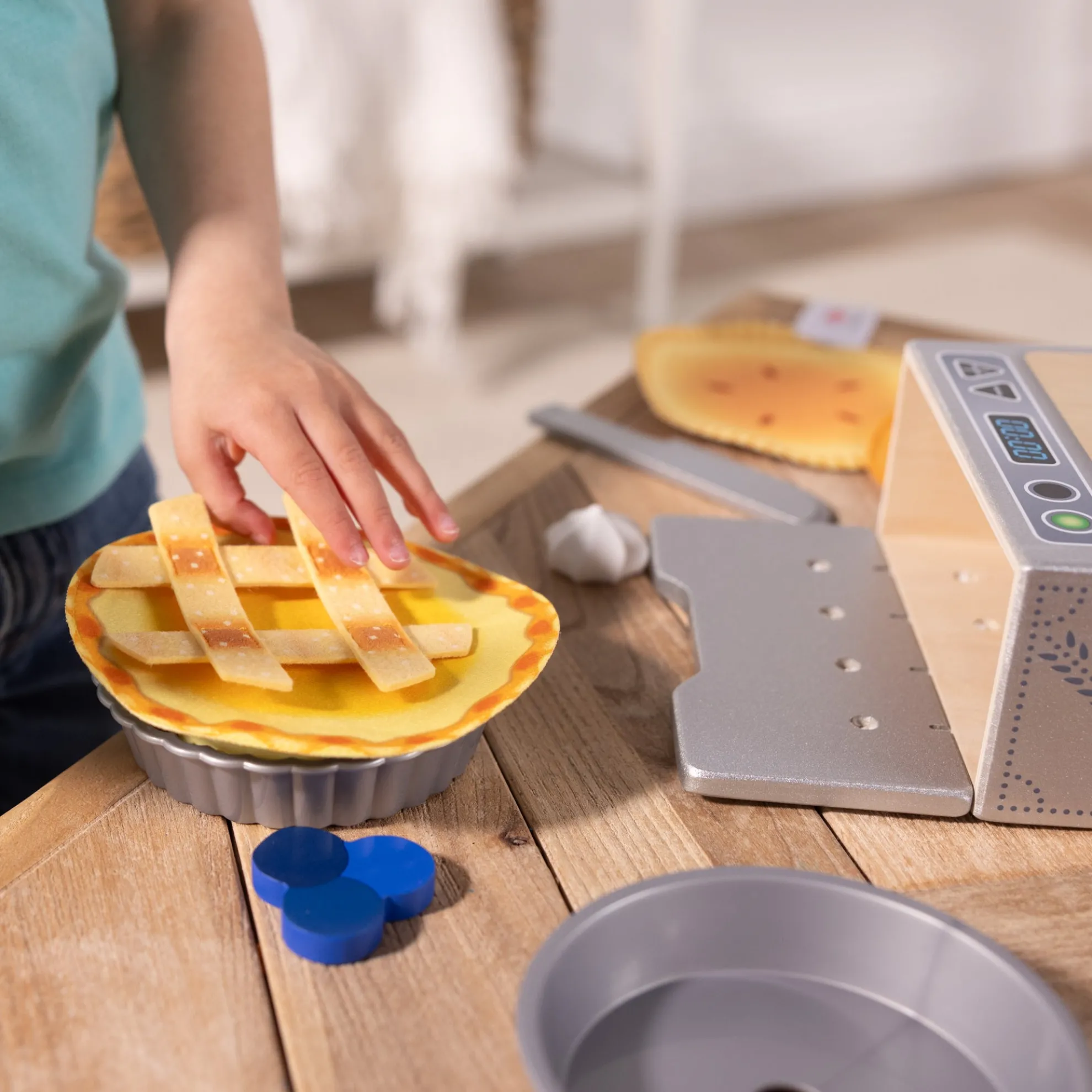 - Includes sturdy wooden oven with working door and built-in cutting board, wooden knife and rolling pin, 2 pie tins, fruit basket, pie filling can with removable lid, whipped cream can, reusable activity card with illustrated instructions