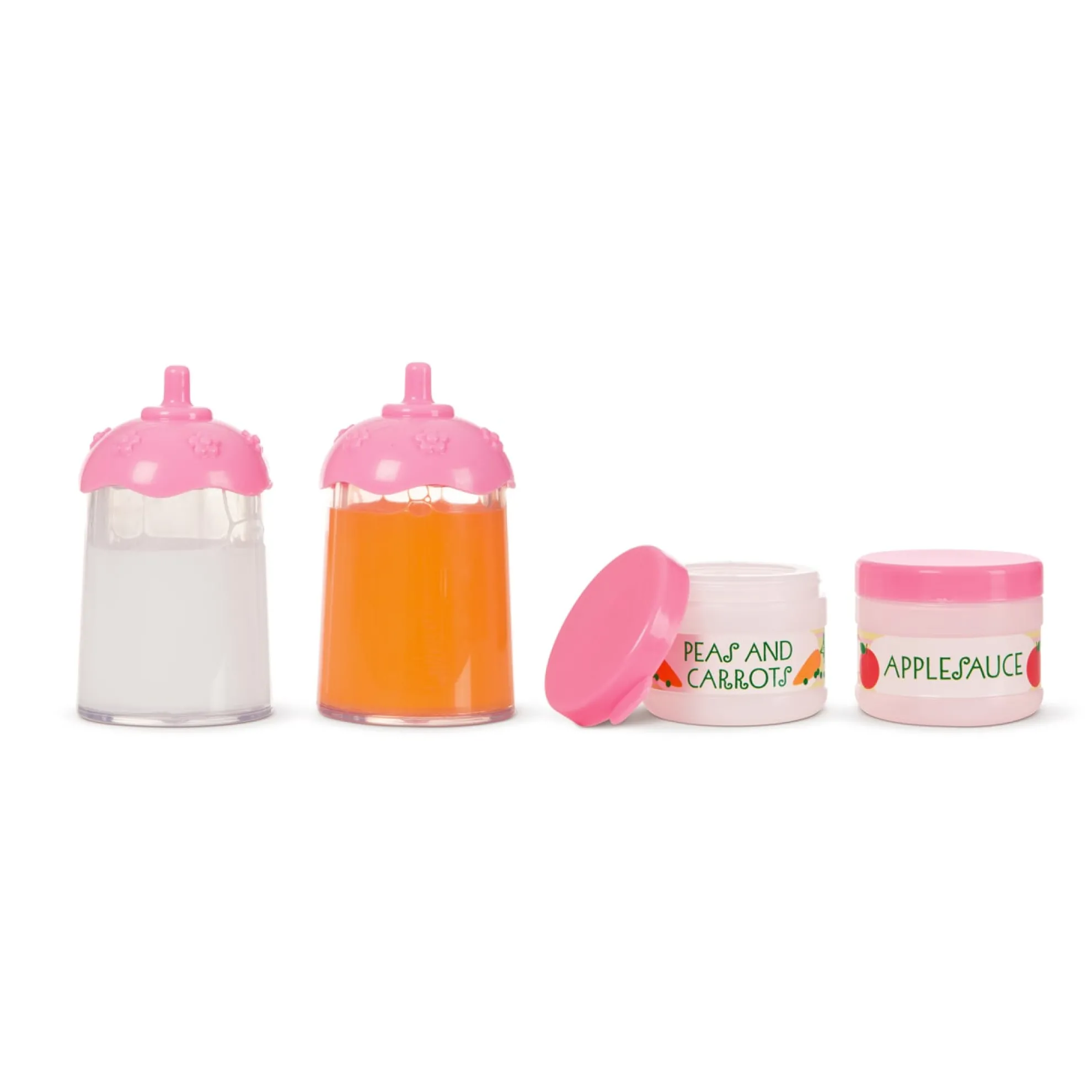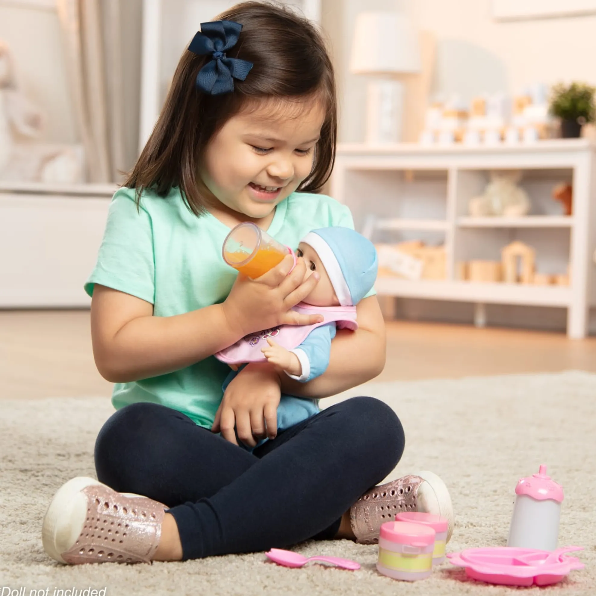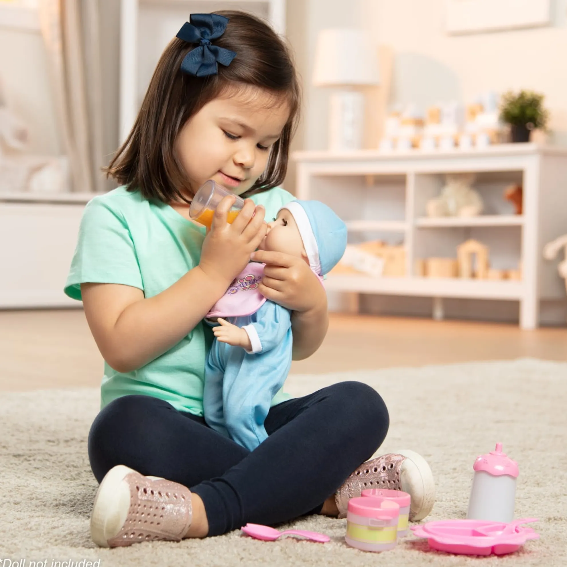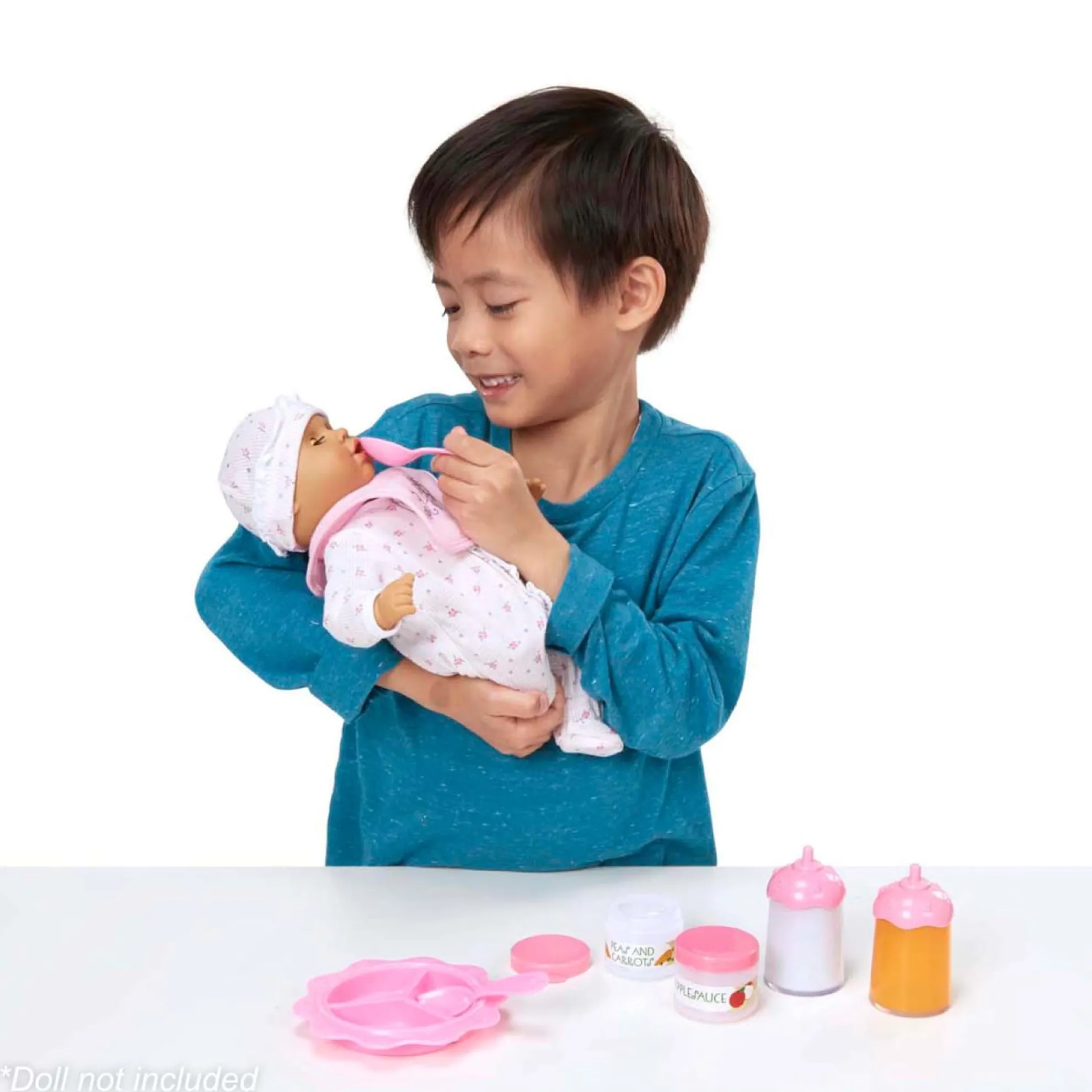 Little caregivers can take care of their baby dolls with this adorable 8-piece set. An easy-close, embroidered bib, keeps baby clean during mealtime which is organized with a divided dish, fork, spoon and yummy “applesauce” and “peas and carrots” for the baby. Disappearing “orange juice” and “milk” bottles add nutrition and fun!