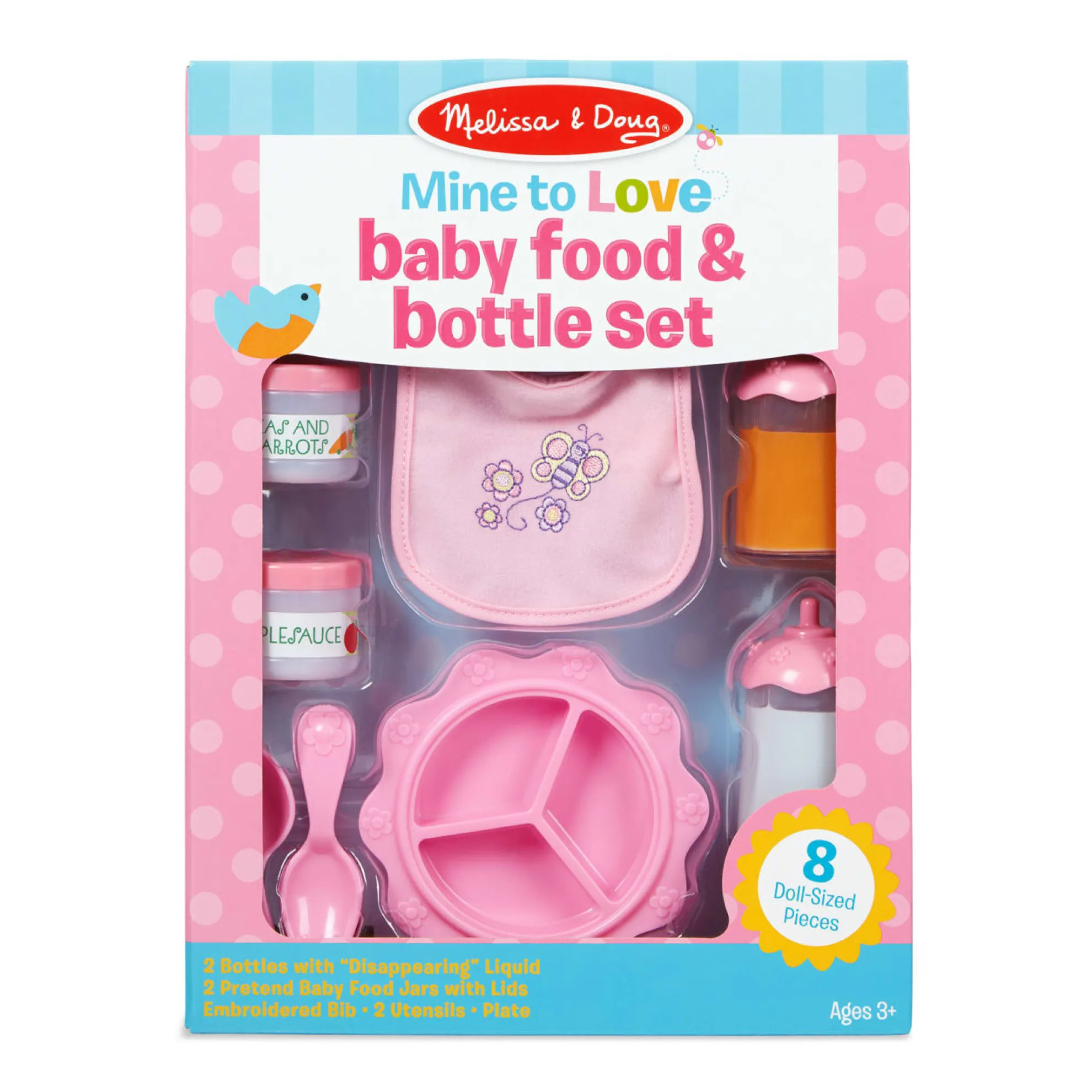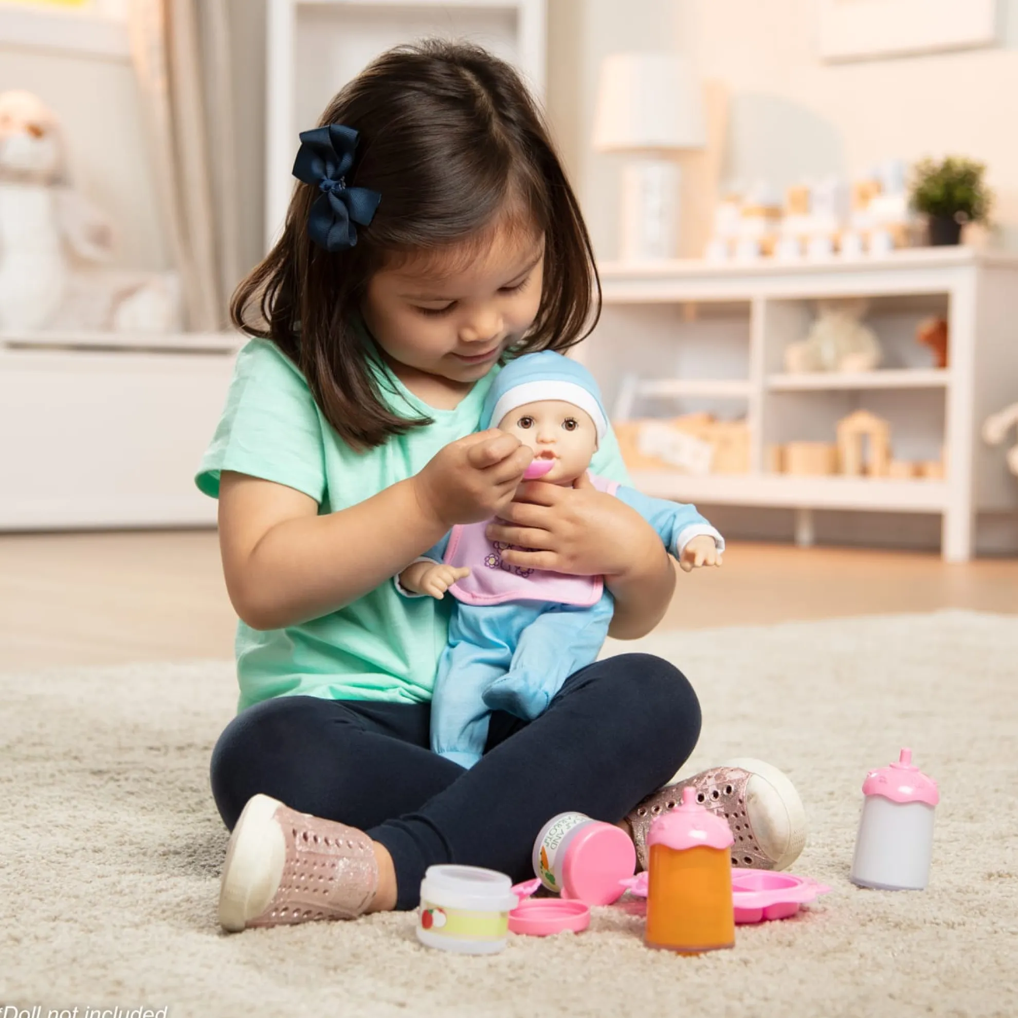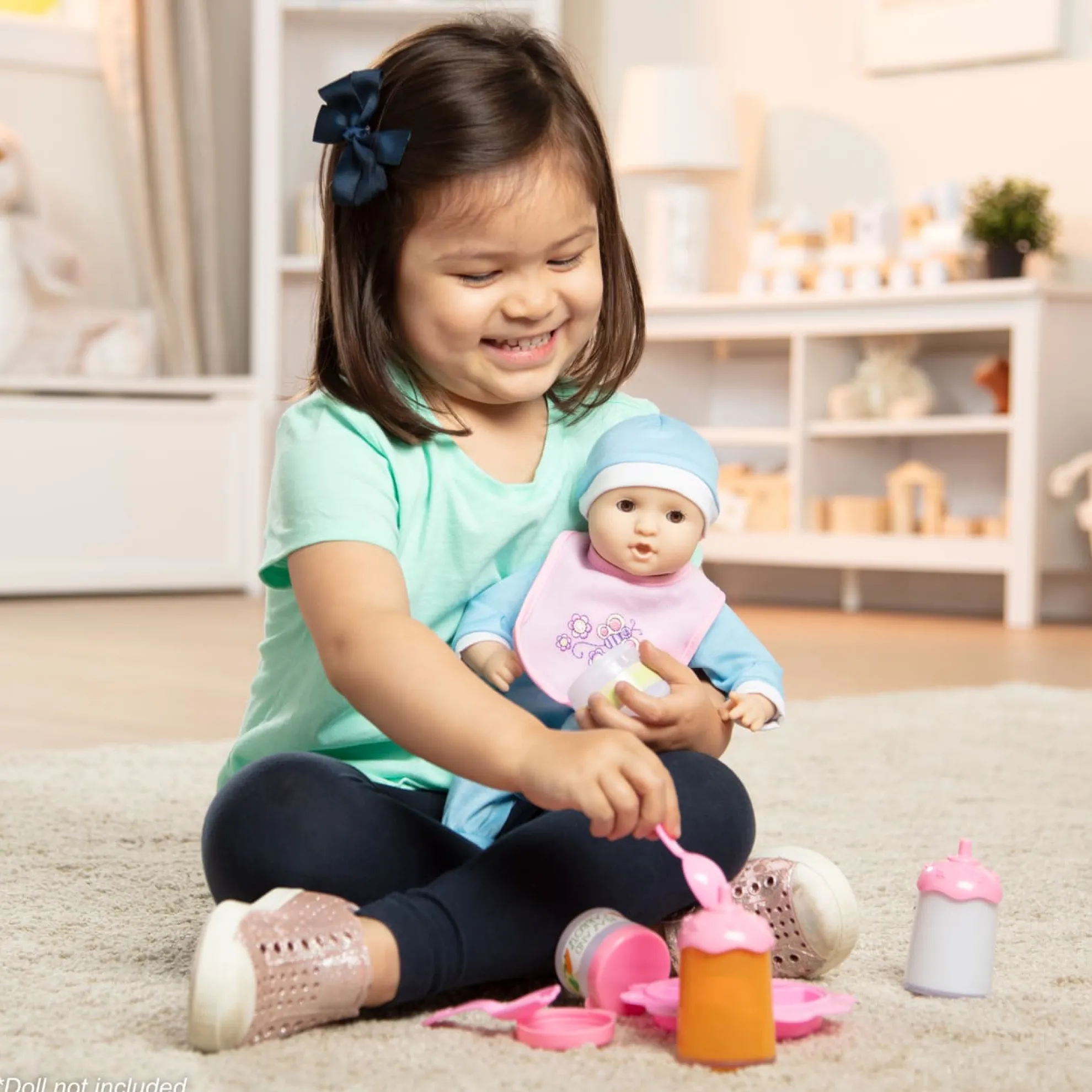 - Take care of baby dolls with this adorable 8-piece feeding set