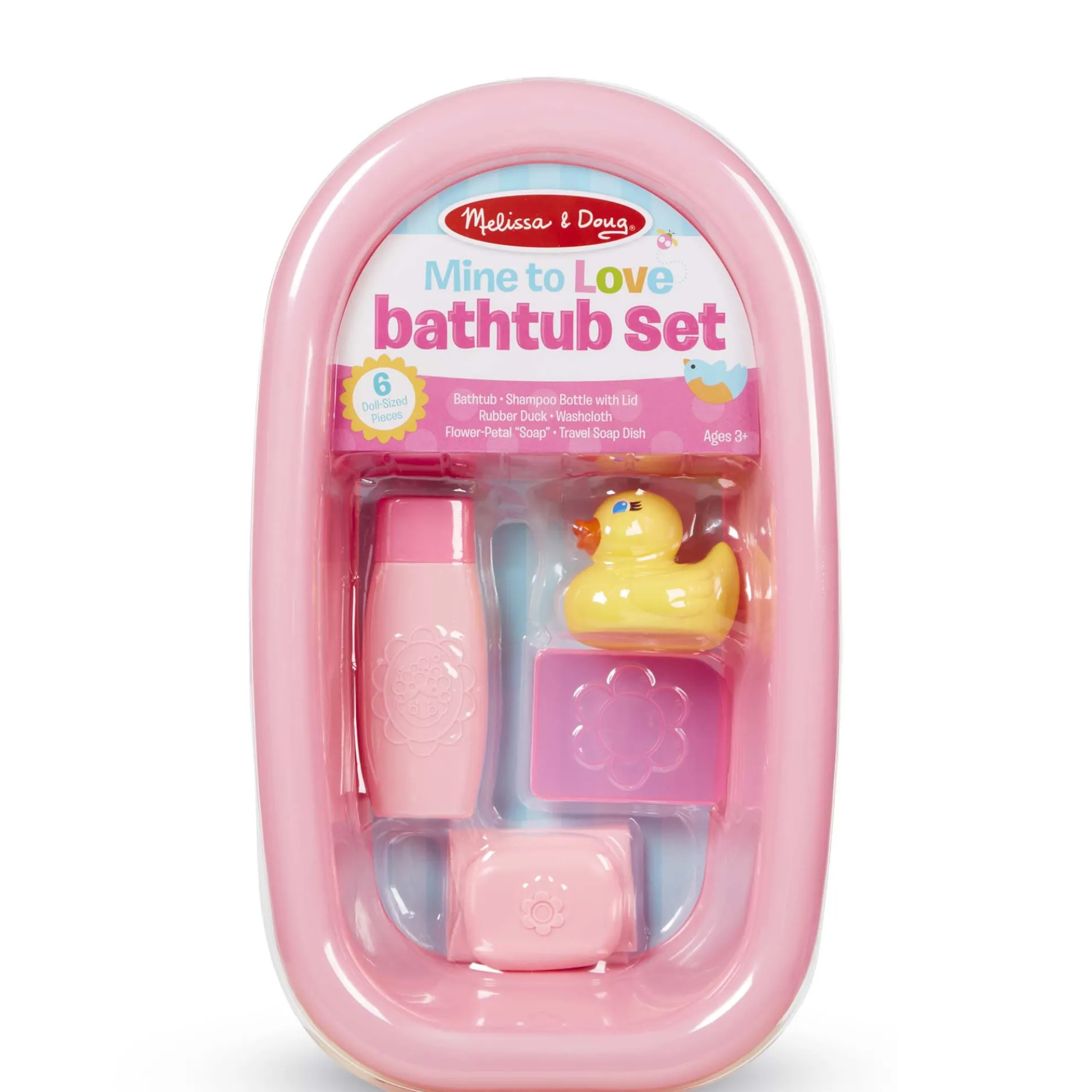 - Includes 6 doll-size pieces: bathtub, shampoo bottle with lid, washcloth, pretend-play soap, soap dish, and rubber duck