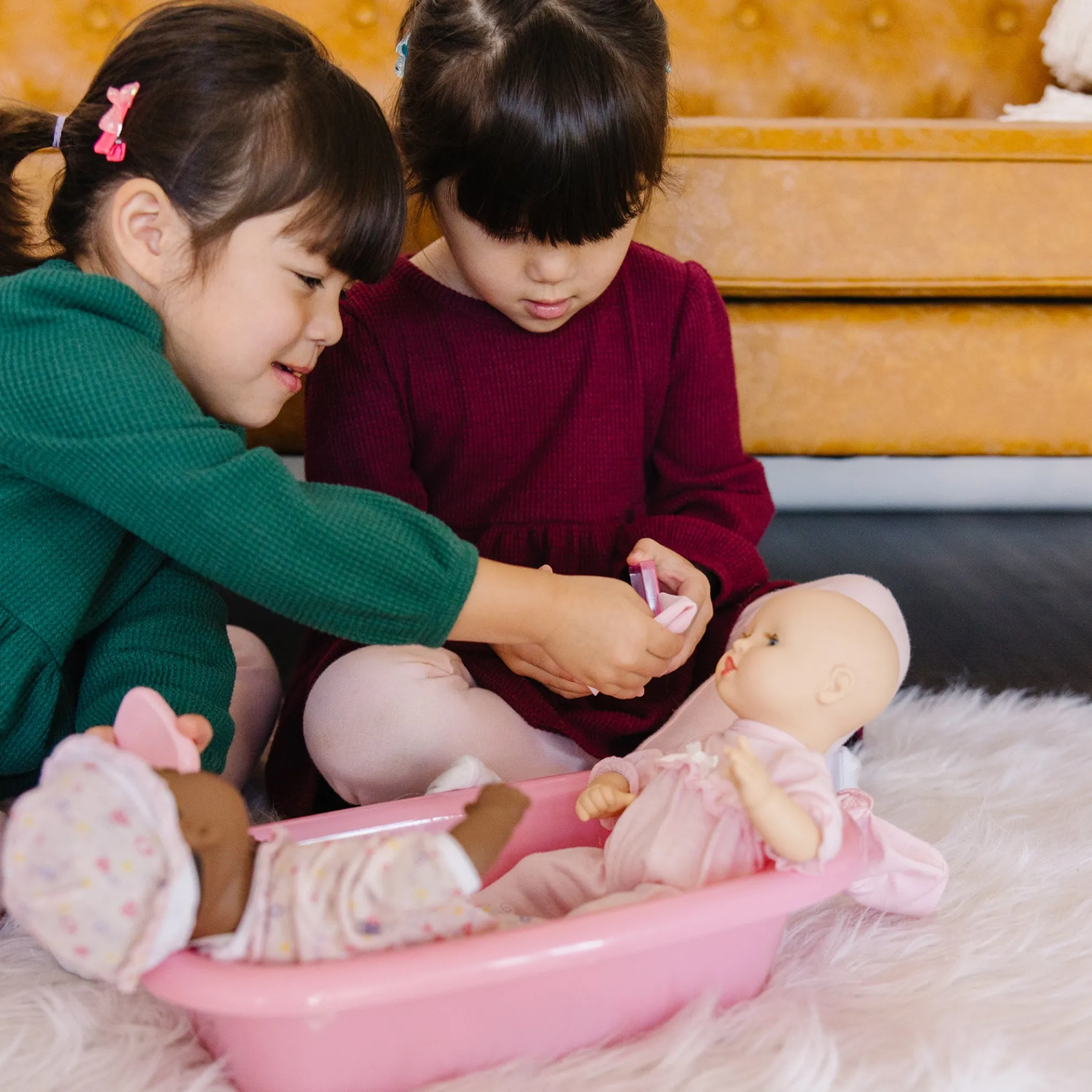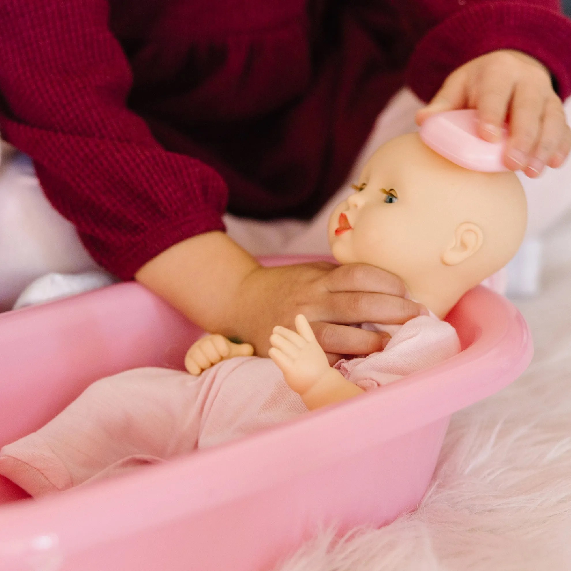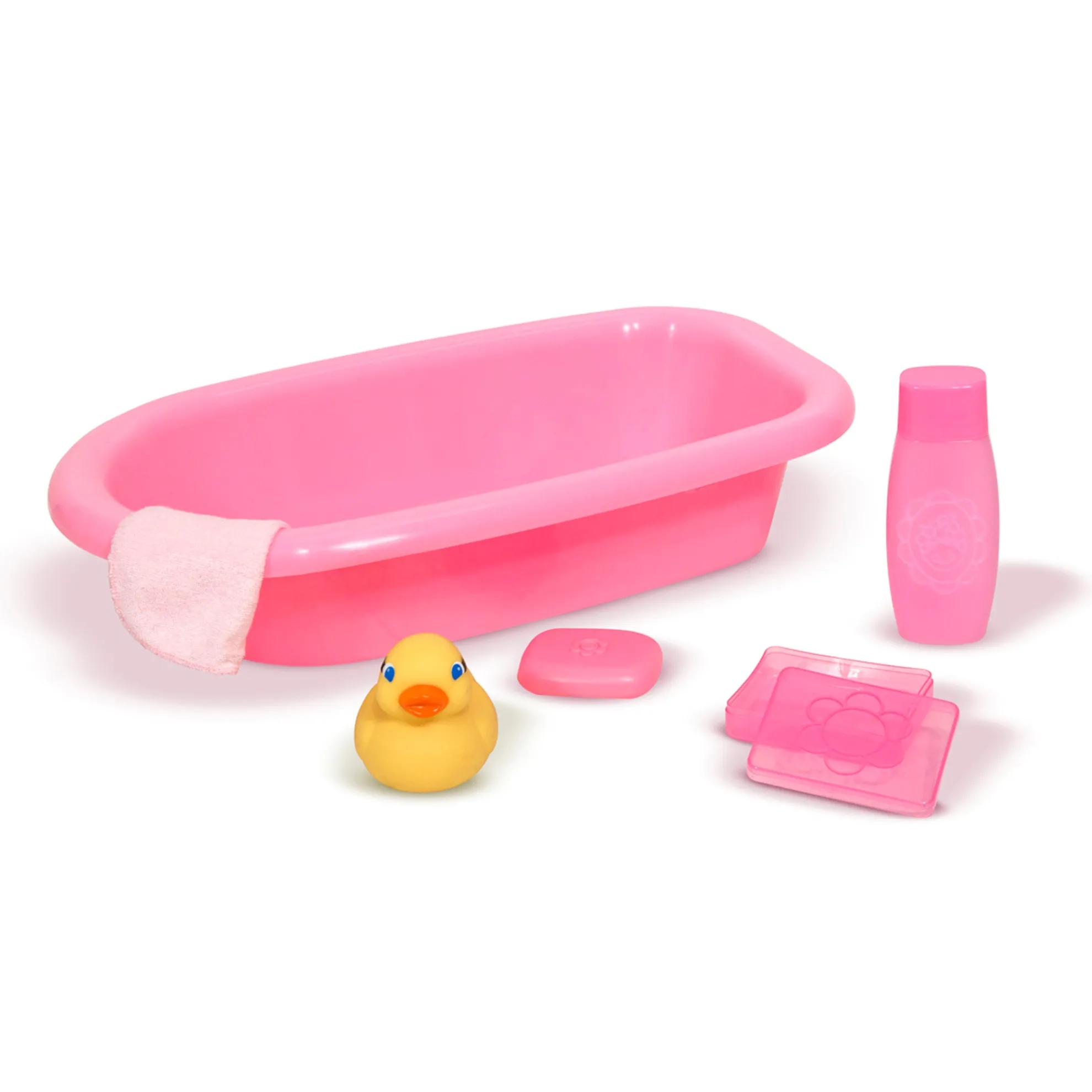 Fill up the tub and in goes dolly! This durable play set is the perfect place for pretend-play “moms” and “dads” to keep their little ones nice and clean. With six doll-size pieces, this water-safe play set has everything kids need to bathe their baby dolls–including a washcloth, pretend-play soap and soap dish, a shampoo bottle that squirts when filled, and even a rubber duck. It all fits into the pretty pink tub for exciting baby-doll playtime–just add water!