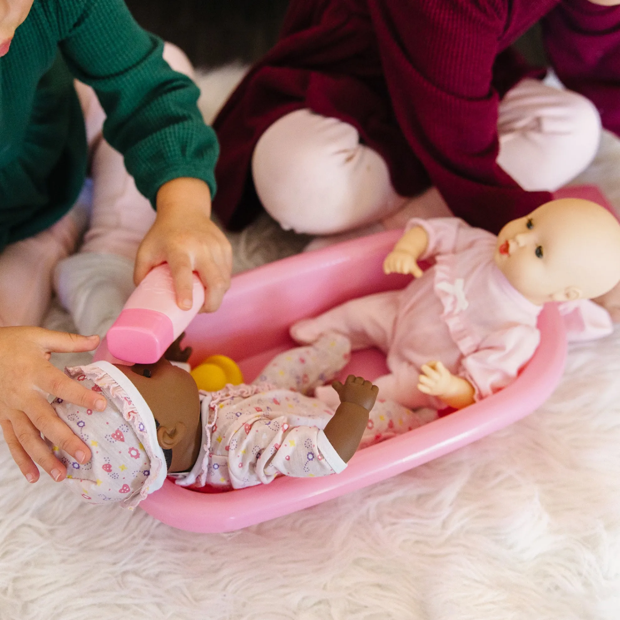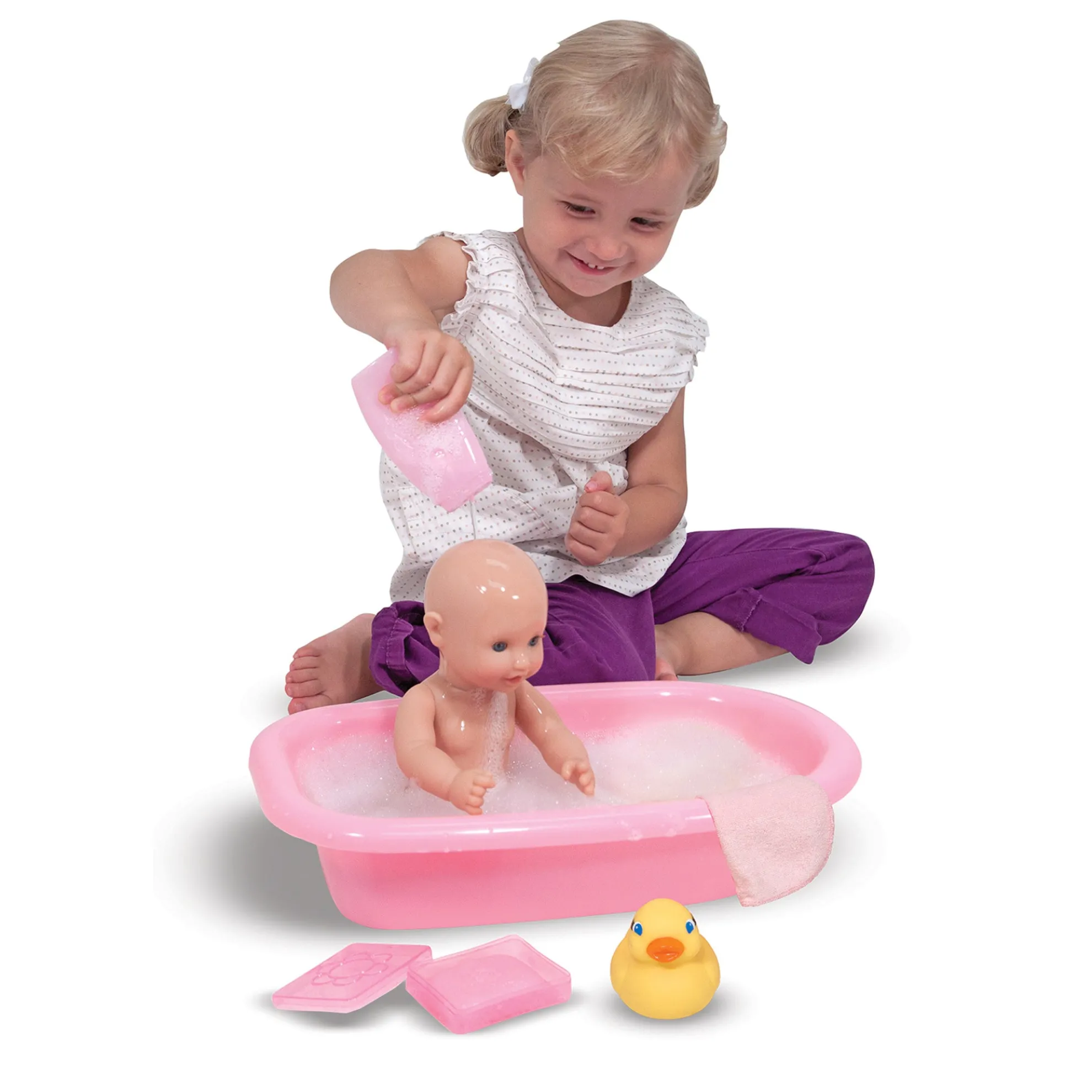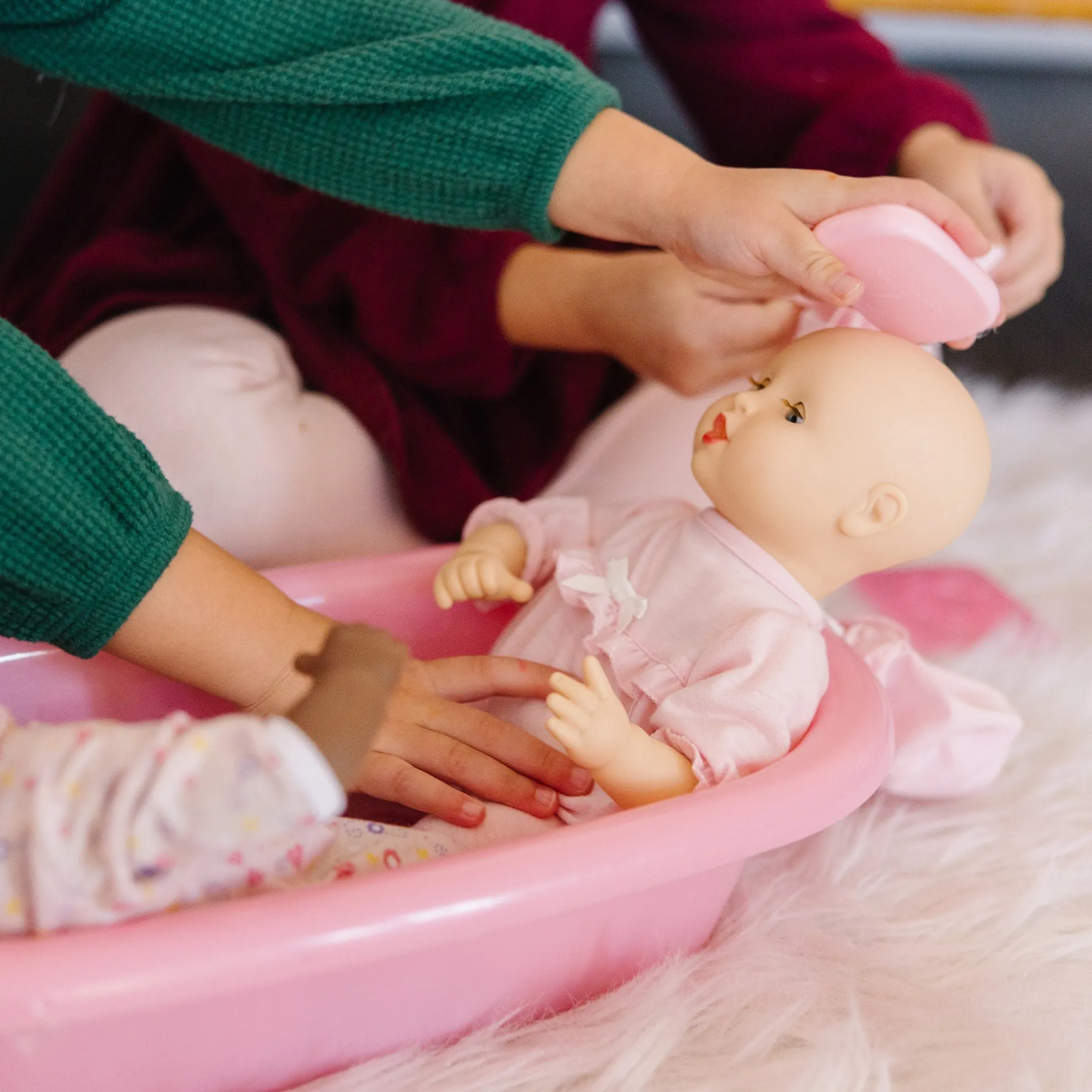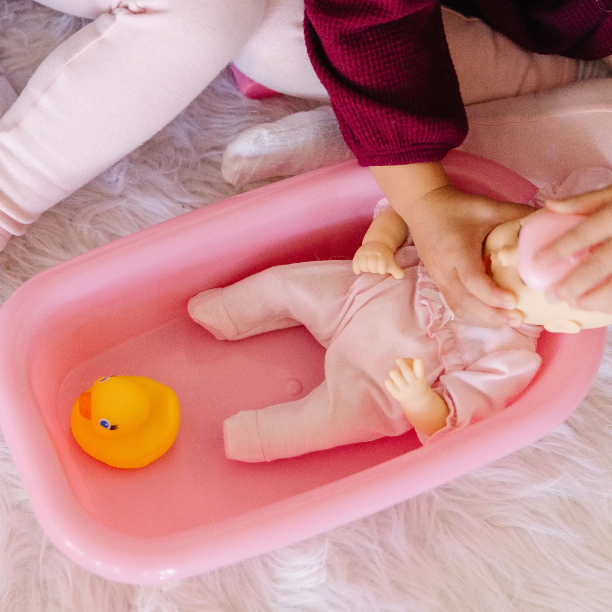 Fill up the tub and in goes dolly! This durable play set is the perfect place for pretend-play “moms” and “dads” to keep their little ones nice and clean. With six doll-size pieces, this water-safe play set has everything kids need to bathe their baby dolls–including a washcloth, pretend-play soap and soap dish, a shampoo bottle that squirts when filled, and even a rubber duck. It all fits into the pretty pink tub for exciting baby-doll playtime–just add water!